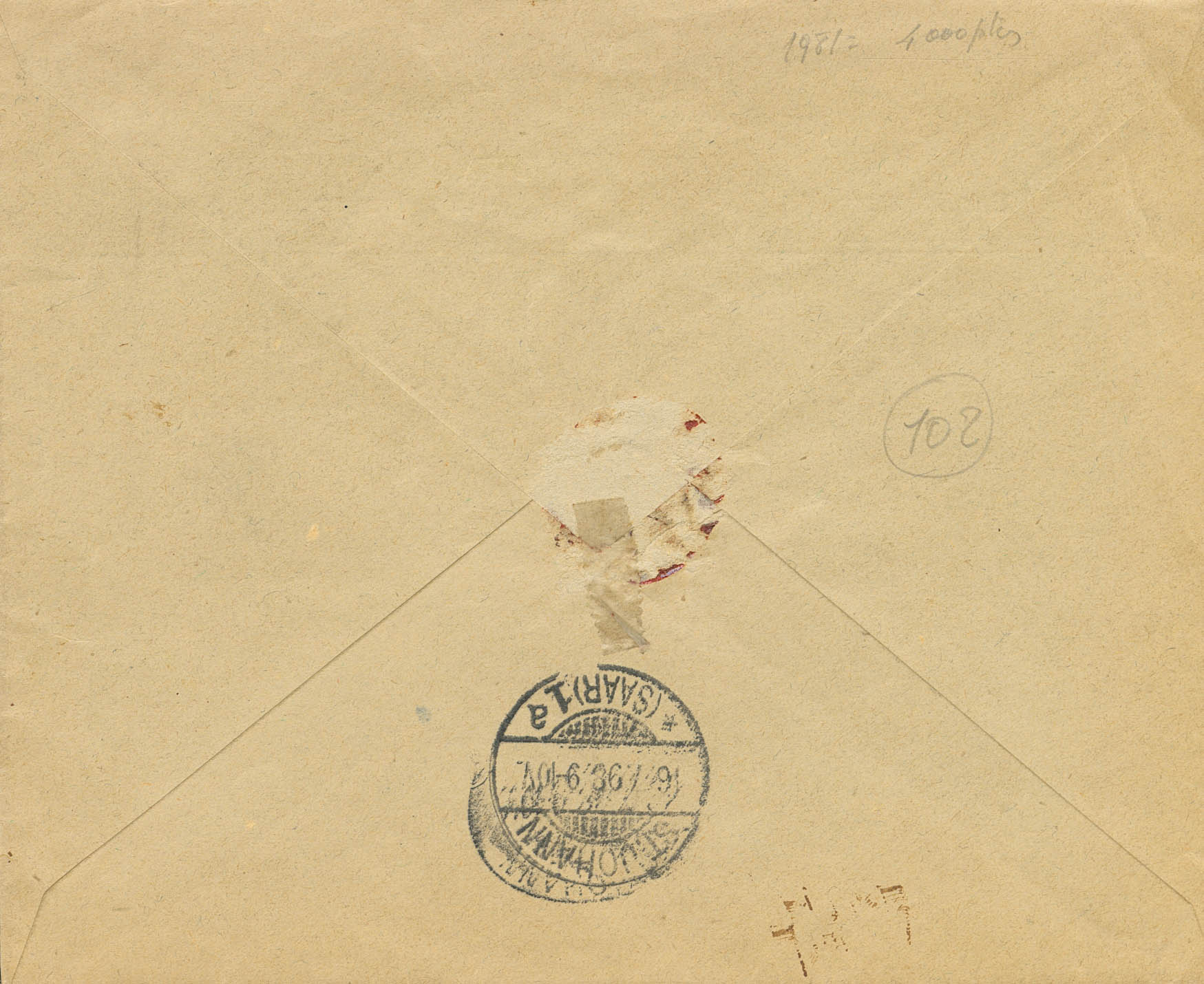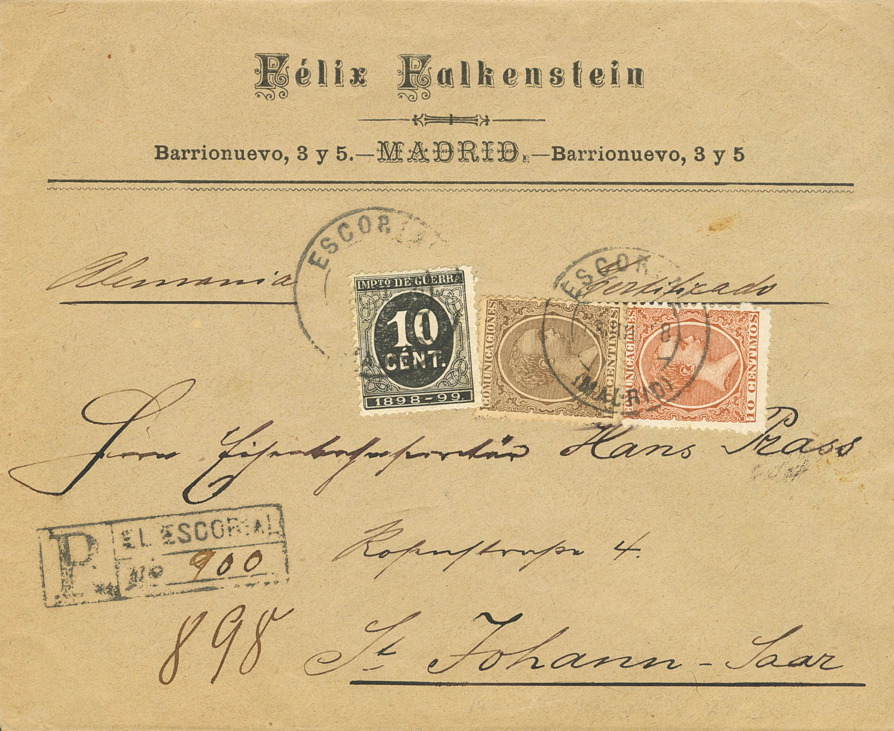 217, 223, 237. 1898. 10 cts castaño amarillo, 40 cts castaño y 10 cts negro de Impuesto de Guerra. Certificado de EL ESCORIAL a SAINT JOHANN (SARRE). Matasello ESCORIAL / (MADRID) y al dorso llegada, la misiva fue correctamente franqueada con 50 cts (25 cts + 25 cts de derecho de certificado) según tarifa de Abril de 1888, por lo que la administración ignoró el sello de Impuesto de Guerra (no válido para extranjero) y la cursó. MAGNIFICA Y RARISIMA, ESPECIALMENTE DIRIGIDA A SARRE.