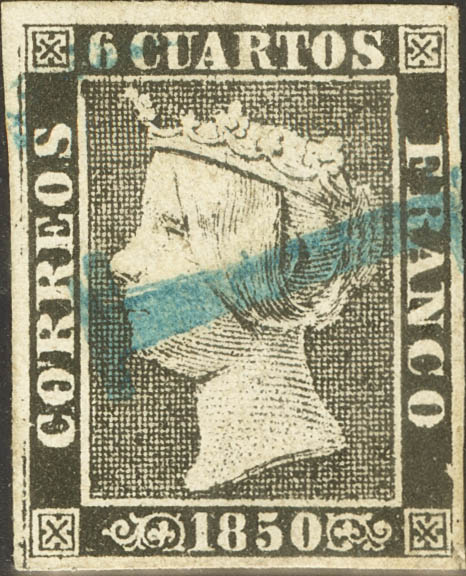 1. 1850. 6 cuartos negro (I-15). Matasello de porteo "11", en azul de Valencia. MAGNIFICO Y RARISIMO. Cert. GRAUS.