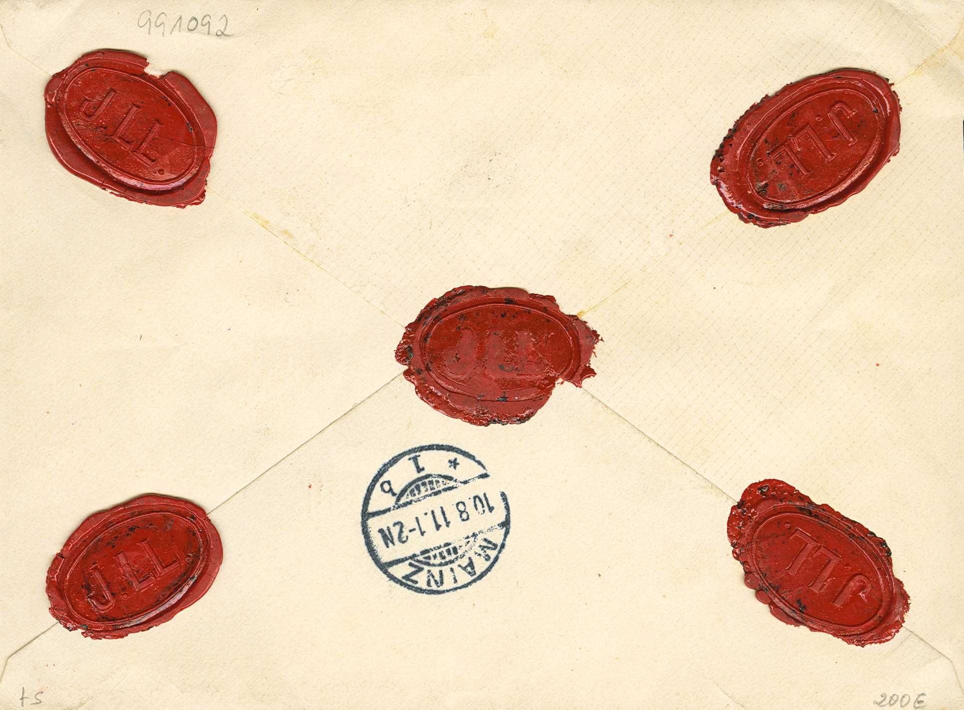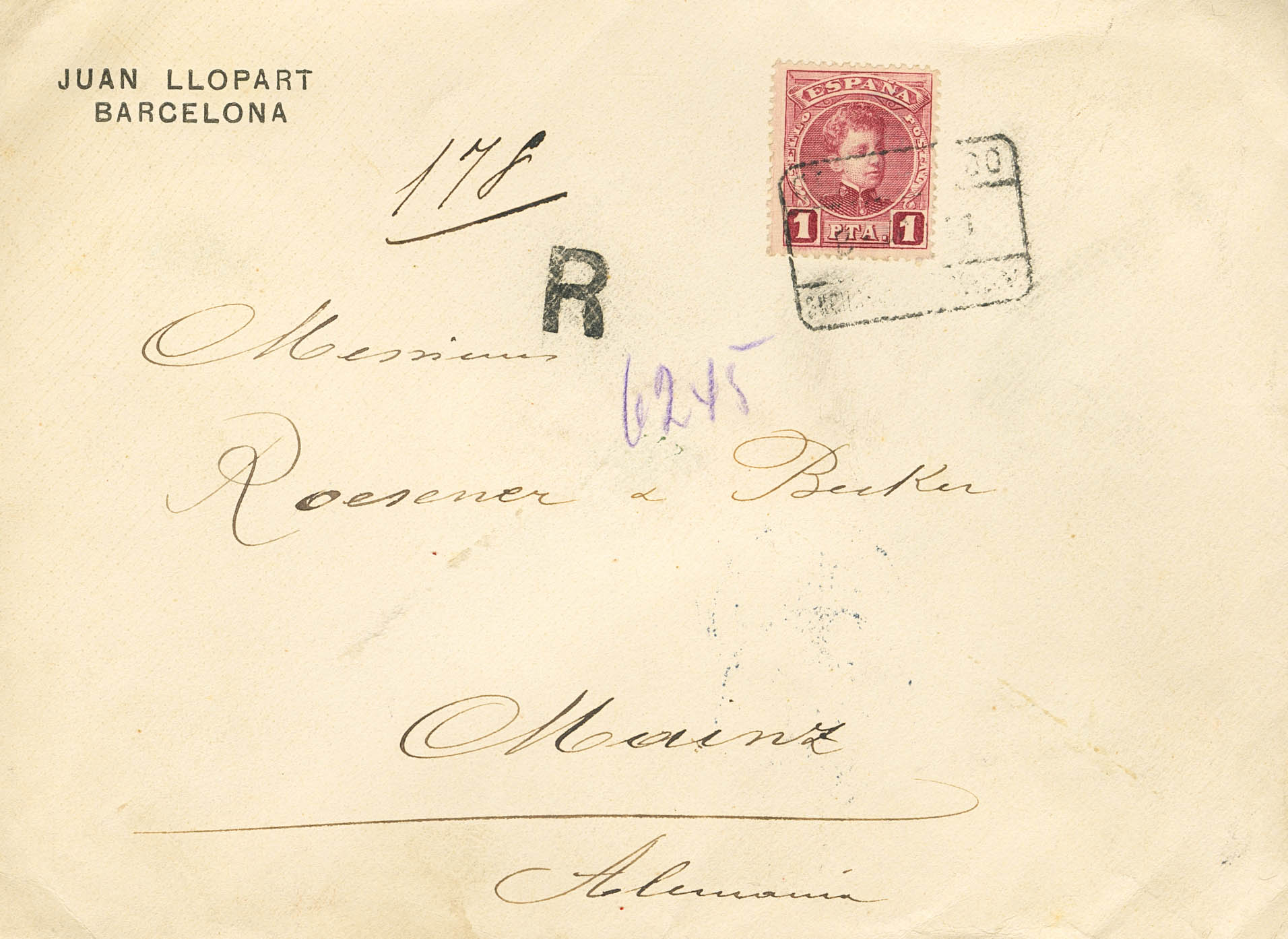 253. 1911. 1 pts carmín. Certificado de BARCELONA a MAINZ (ALEMANIA). Al dorso llegada. MAGNIFICA.
