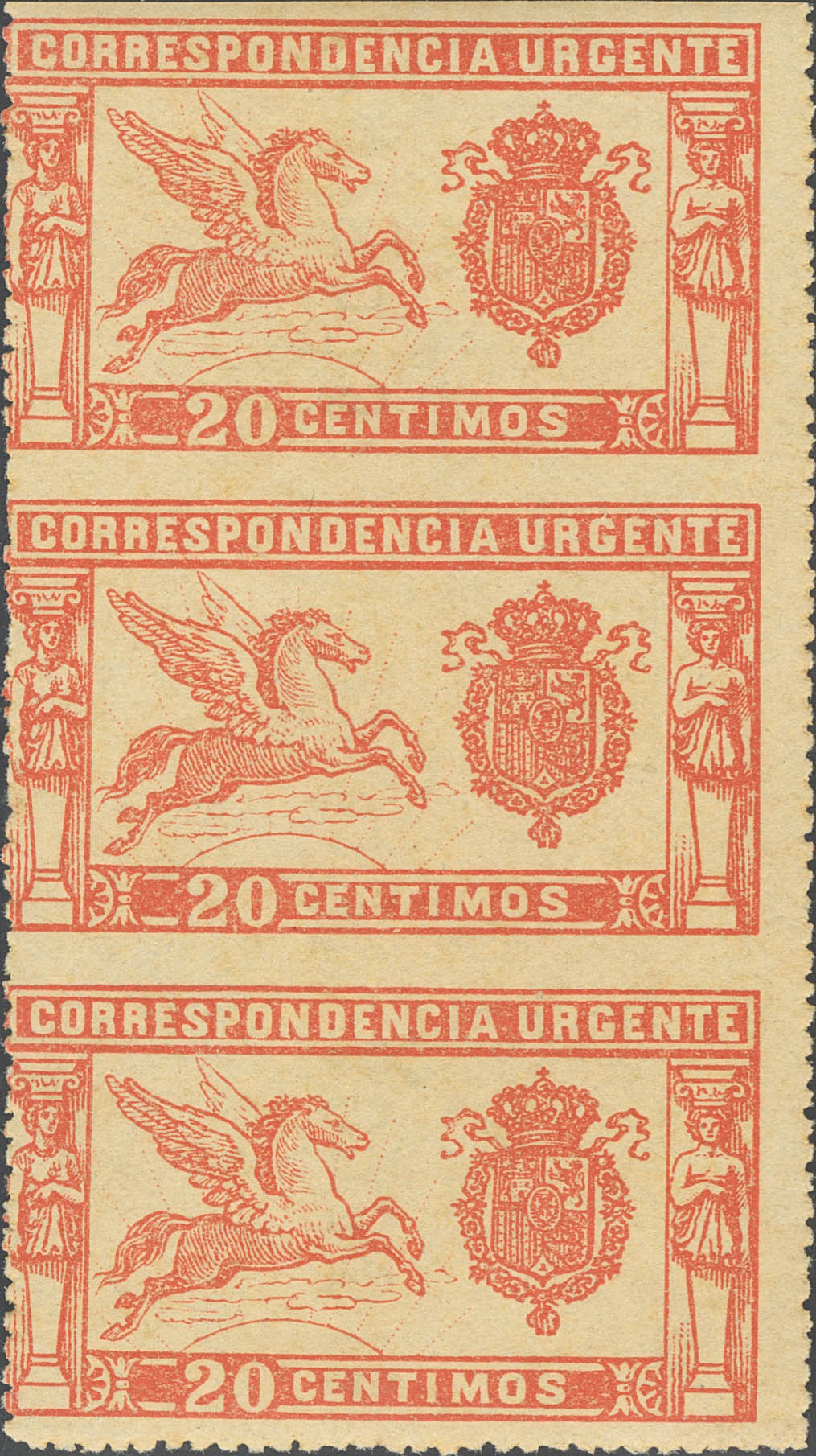 ★★/★ 256(3). 1905. 20 cts rojo, tira vertical de tres. Dos sellos SIN DENTADO HORIZONTALMENTE y uno de ellos además SIN DENTAR EL MARGEN SUPERIOR. MAGNIFICA Y MUY RARA.
