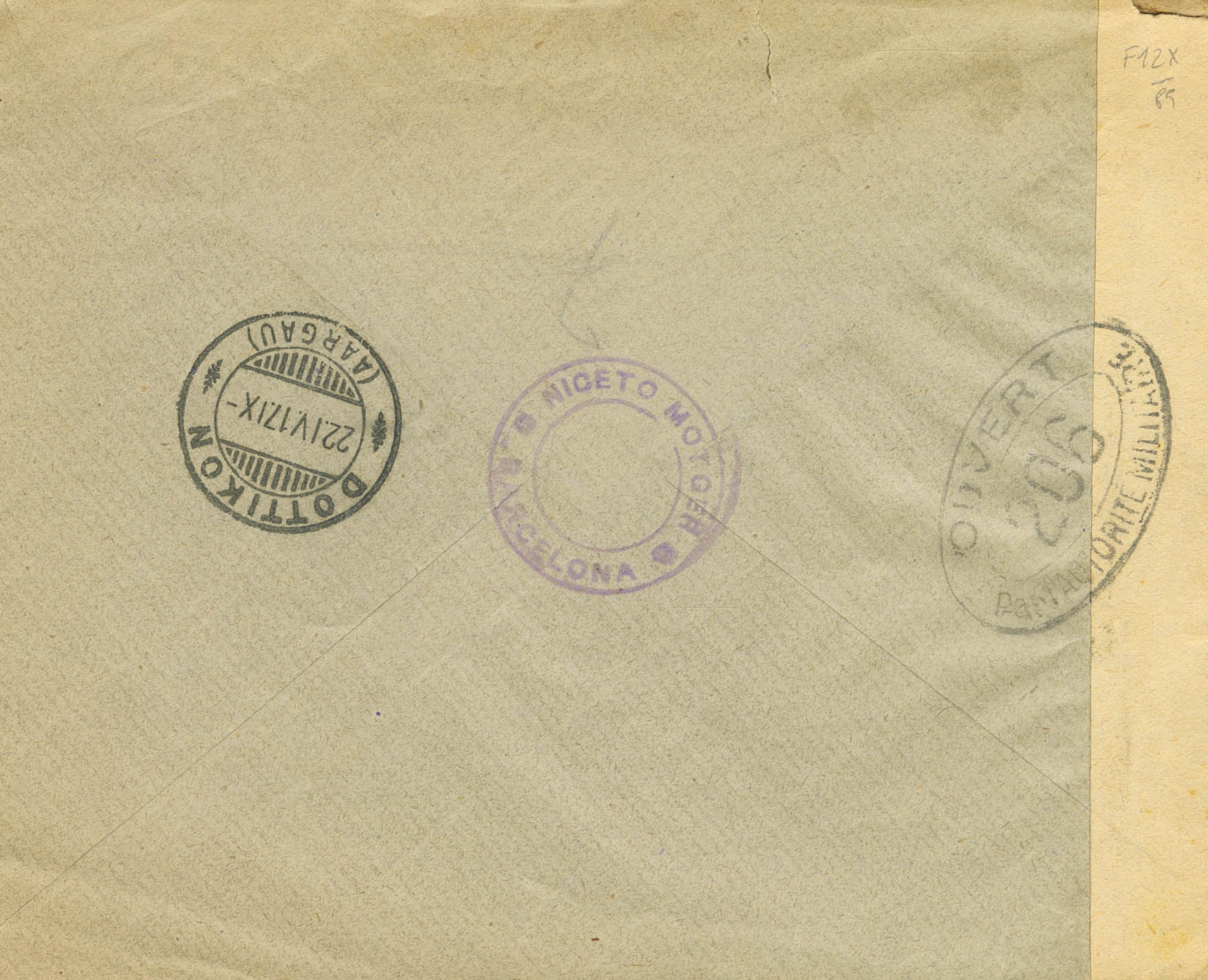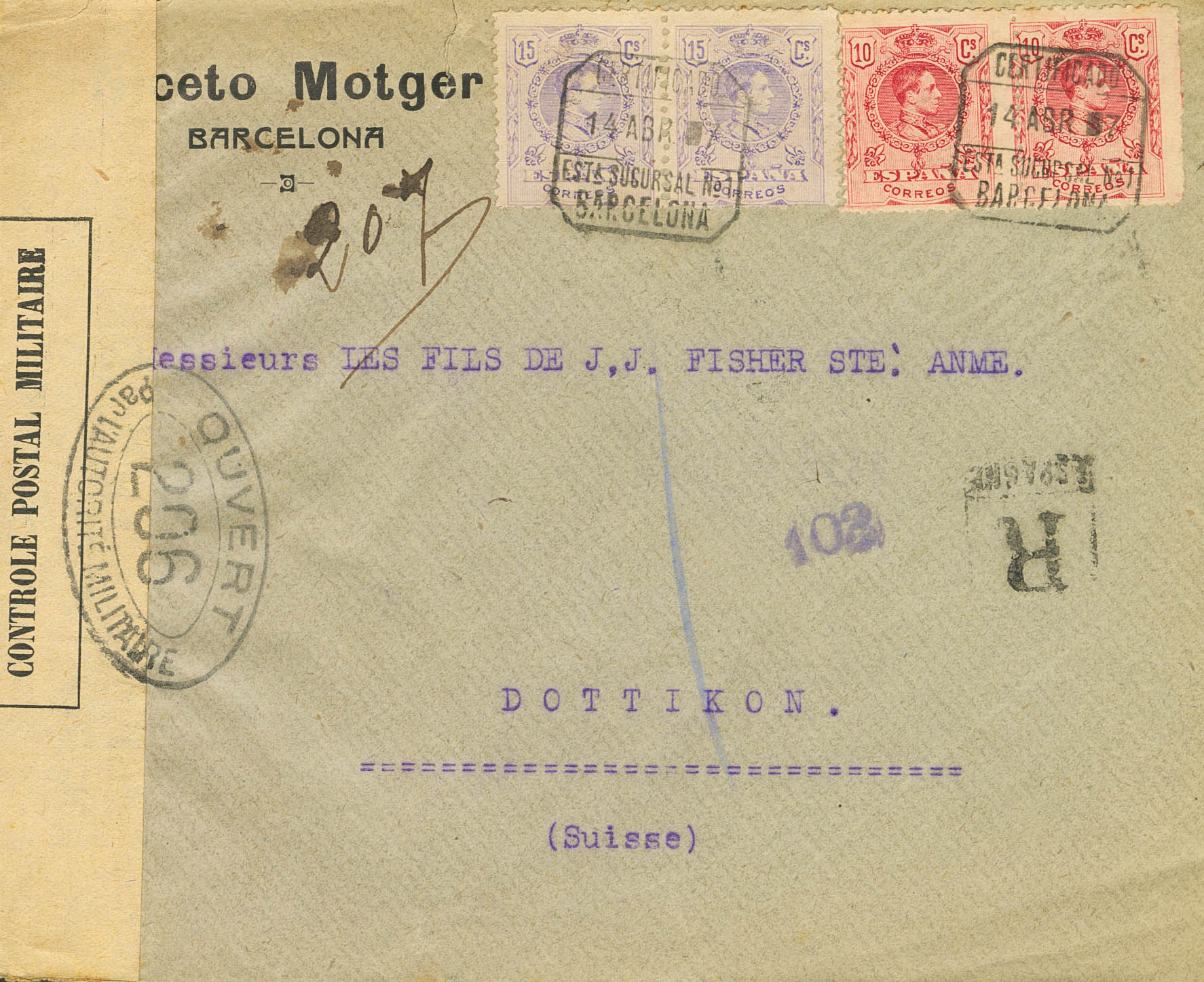 269(2), 270(2). 1917. 10 cts rojo, pareja y 15 cts violeta, pareja. Certificado de BARCELONA a DOTTIKON (SUIZA). Al dorso llegada. MAGNIFICA.