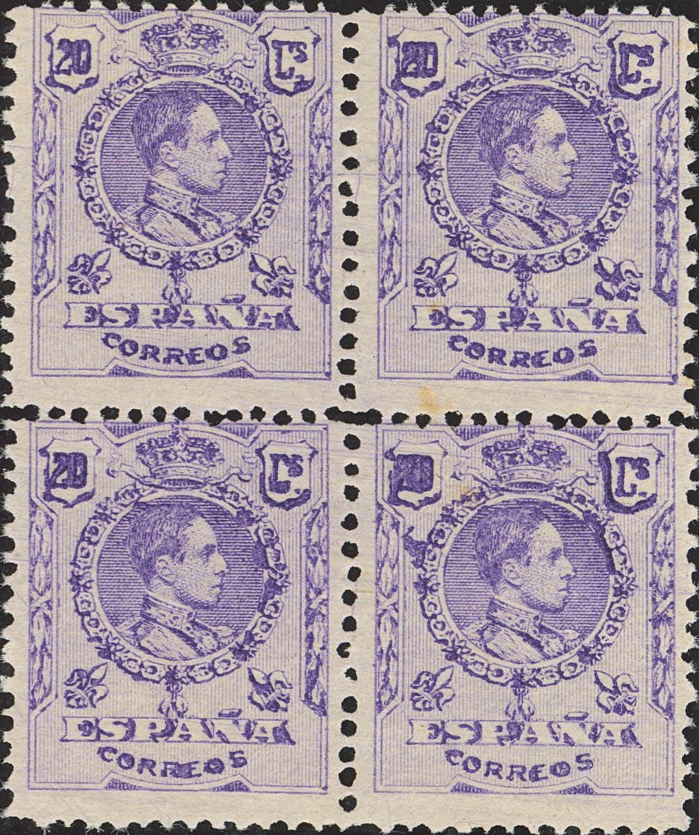 ★★ 273. 1909. 20 cts violeta, bloque de cuatro. Variedad "20" BORROSO. MAGNIFICO Y MUY RARO, NO CATALOGADO. Edifil 2026: +++380 Euros