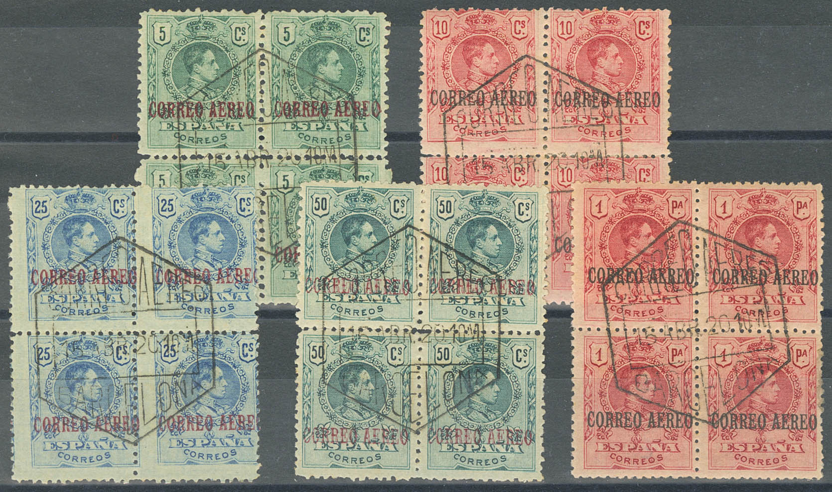 292/96(4). 1920. Serie completa, bloque de cuatro. Matasello CORREO AEREO / BARCELONA. MAGNIFICA. Edifil 2020: 280 Euros