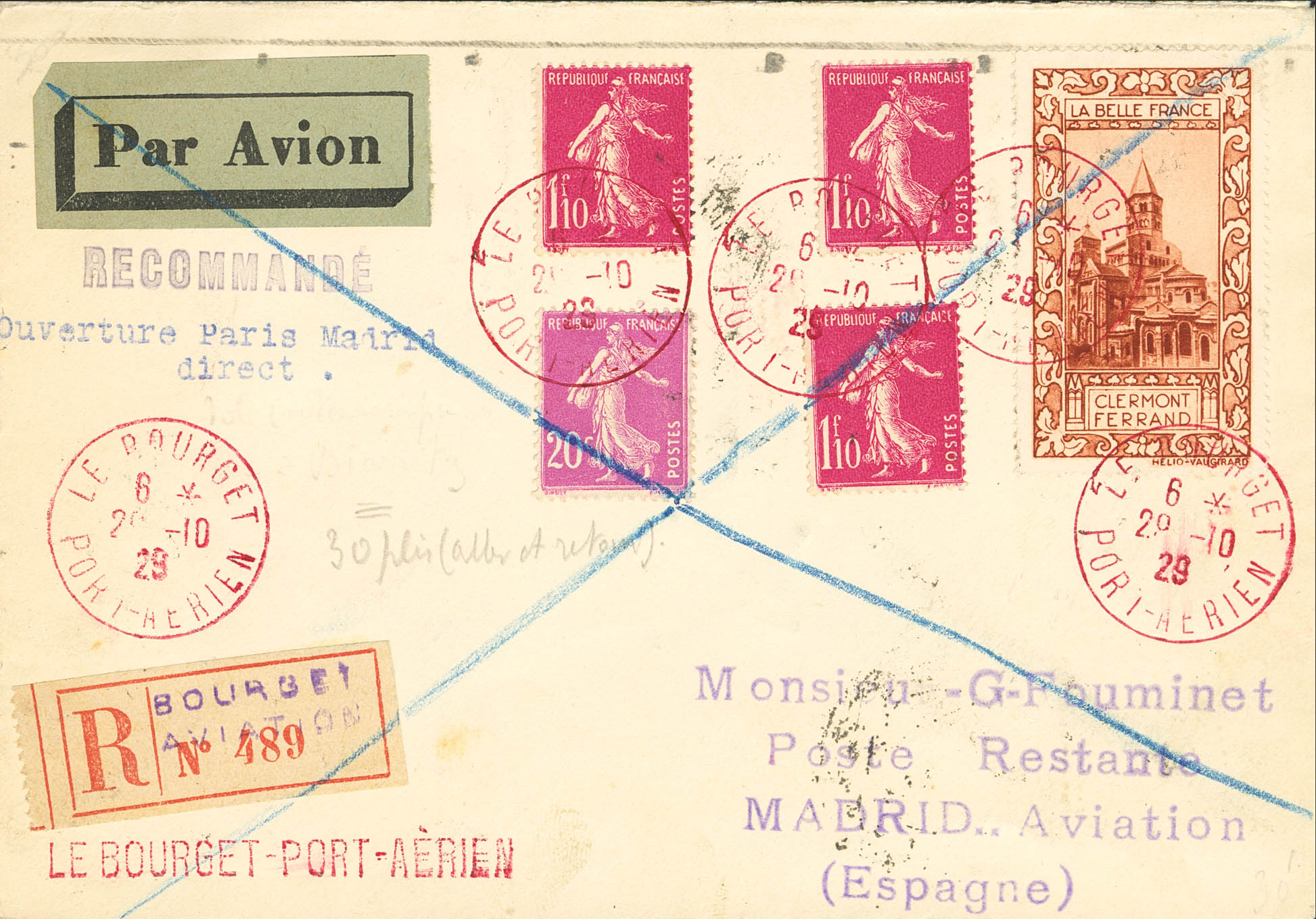 319, 293. 1929. Sellos de Francia de 20 cts lila, 1´10 f carmín rosa, tres sellos y viñeta de Clermont Ferrand. Certificado de LE BOURGET (FRANCIA) a MADRID. Matasello LE BOURGET / PORT AERIEN, en rojo, al dorso se aplican cinco sellos de España de 10 cts y uno de 40 cts, para cubrir el trayecto de vuelta, que resulta insuficiente y es tasada por el correo francés en 35 cts, aplicando tres sellos de tasa de 5 cts y uno de 20 cts. MAGNIFICA Y ESPECTACULAR FRANQUEO DEL VUELO DE APERTURA DE PARIS A MADRID, SOLO S E CONOCEN TREINTA CARTAS.