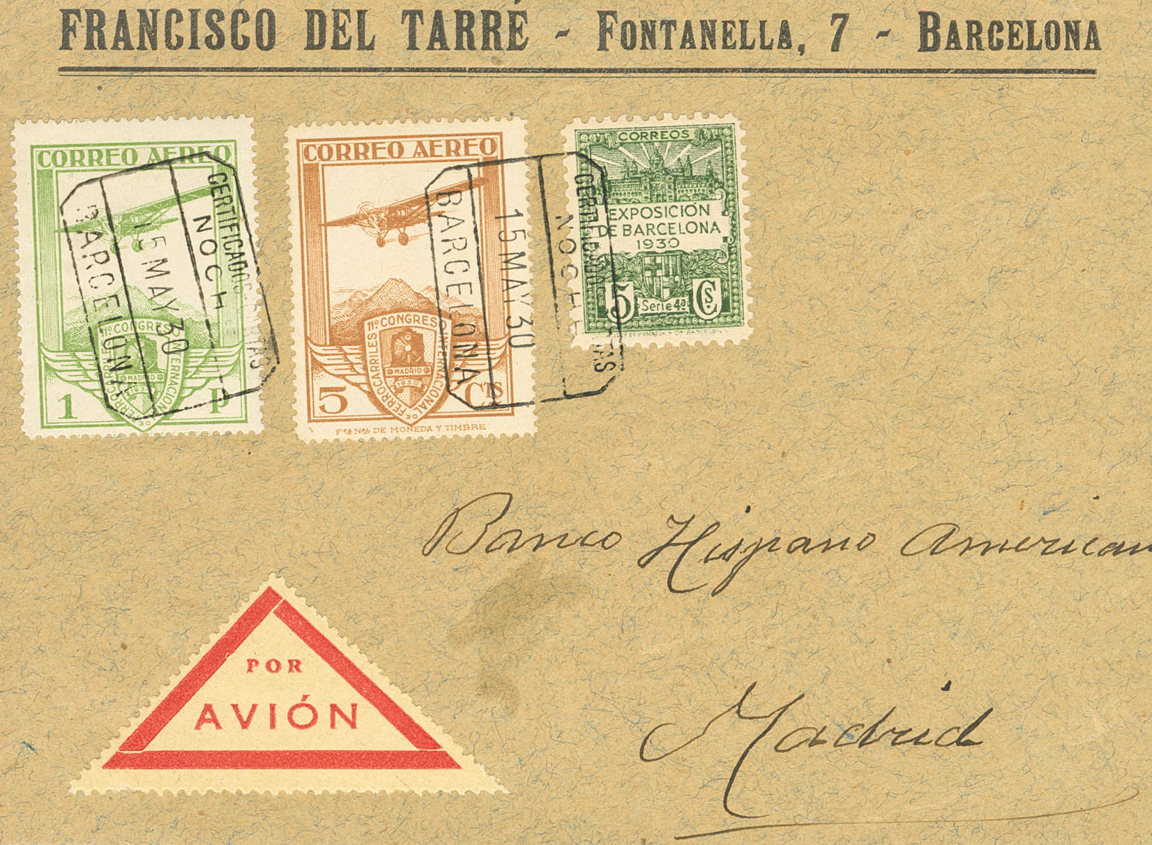 483, 487. 1930. 5 cts castaño amarillo, 1 pts verde amarillo y 5 cts verde de Ayuntamiento de Barcelona. Frontal (con solapa al dorso) Certificado de BARCELONA a MADRID. Al dorso fechador CORRESPONDENCIA PARA CURSAR / POR / AVION / CORREO CENTRAL, en violeta. MAGNIFICO Y RARO.