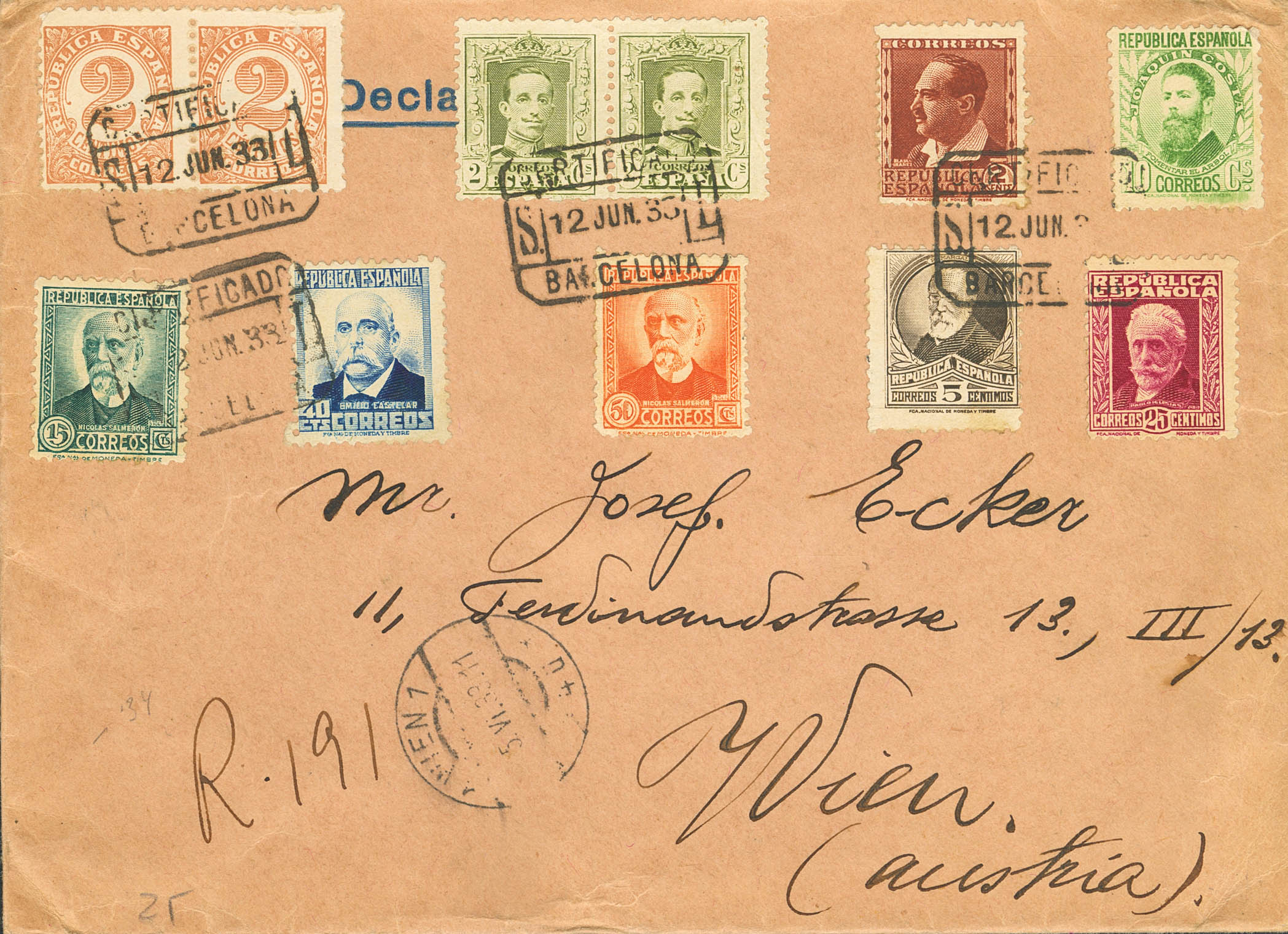 662/65, 667, 670/71, 678(2). 1933. Diversos valores. Certificado de BARCELONA a VIENA (AUSTRIA). En el frente llegada. MAGNIFICA.
