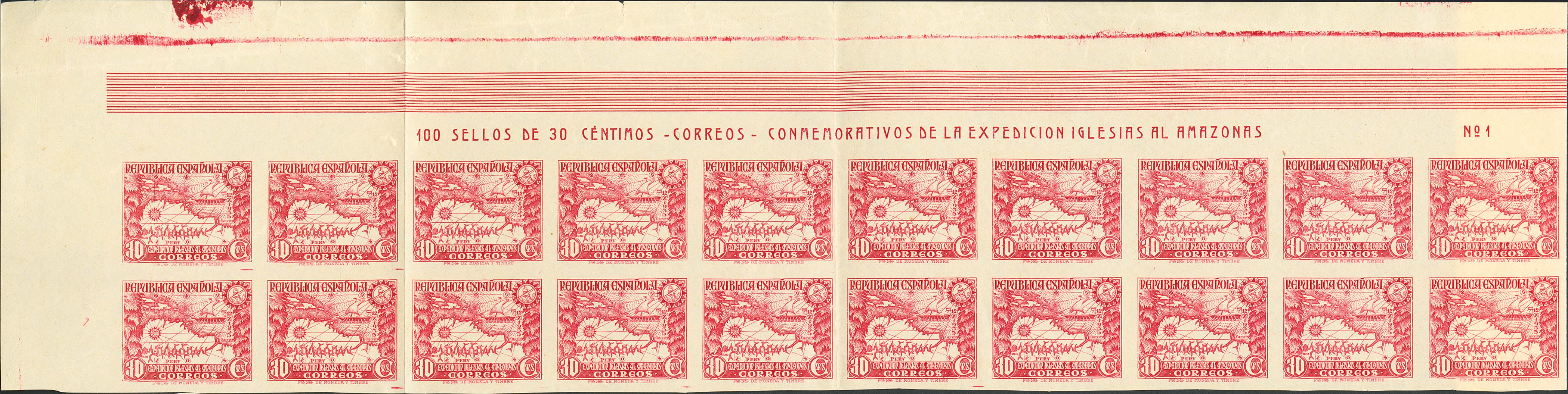 (★) 694s(20). 1935. 30 cts carmín, bloque de veinte, cabecera de pliego. SIN DENTAR. MAGNIFICO Y RARO. Edifil 2026: 1.940 Euros