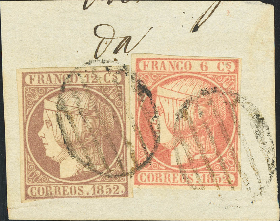 △ 12, 13. 1853. 6 cuartos rosa y 12 cuartos lila, sobre fragmento. Matasello PARRILLA (muy limpia). MAGNIFICO.