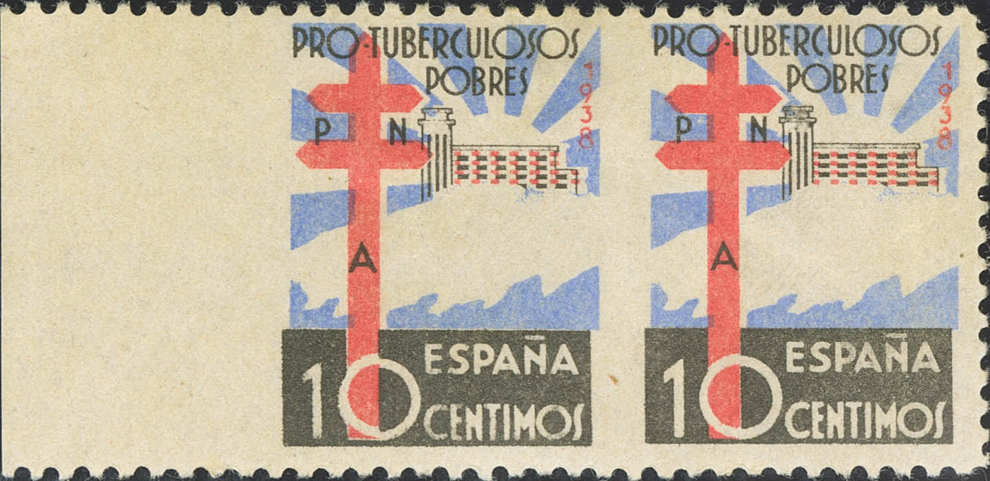 ★ 866(2). 1938. 10 cts negro, azul y rojo, pareja, borde de hoja. Variedad SIN DENTADO VERTICAL. MAGNIFICO Y MUY RARA.