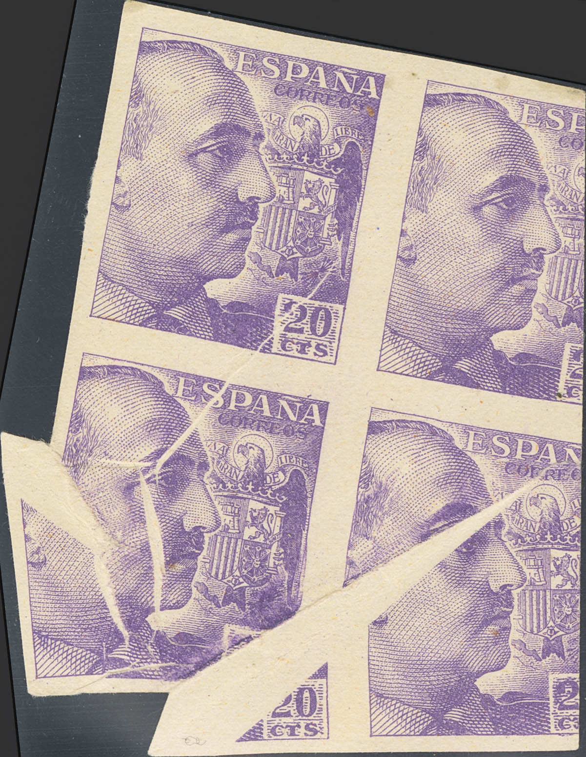 ★★/★ 922s(4). 1949. 20 cts violeta, bloque de cuatro. Variedad PLIEGUE DE PAPEL (sin dentar). MAGNIFICO Y ESPECTACULAR.