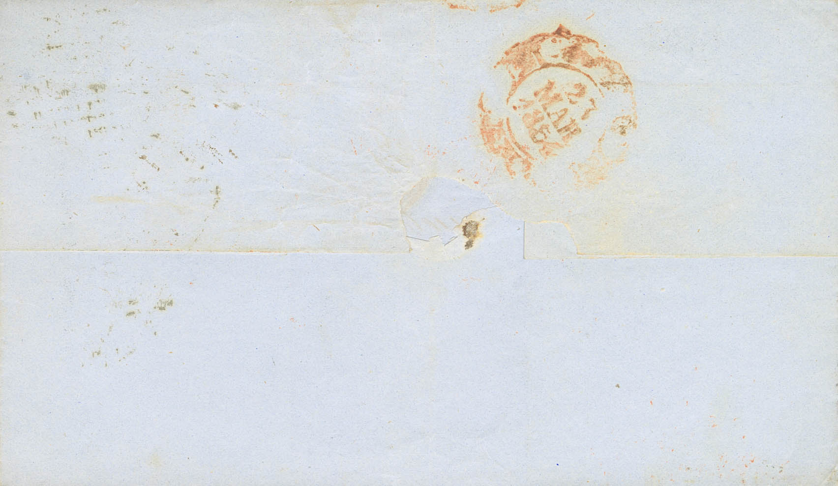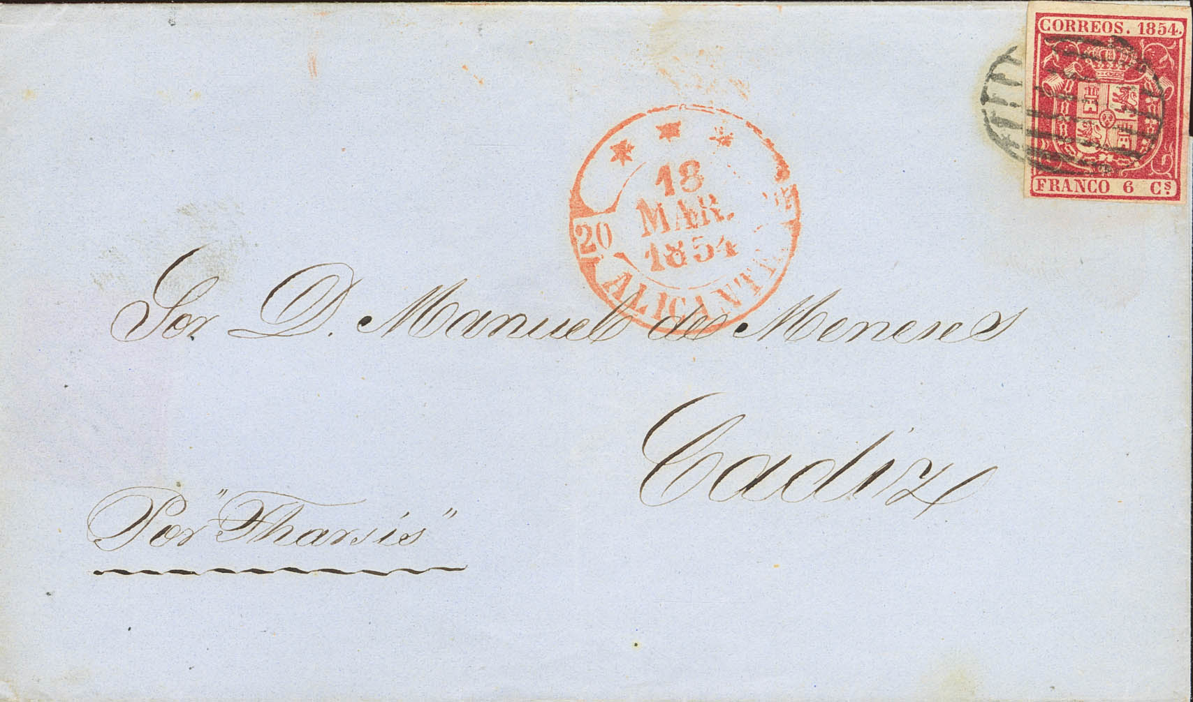 24. 1854. 6 cuartos carmín. ALICANTE a CADIZ. En el frente anotación manuscrita "Por Tharsis". MAGNIFICA.