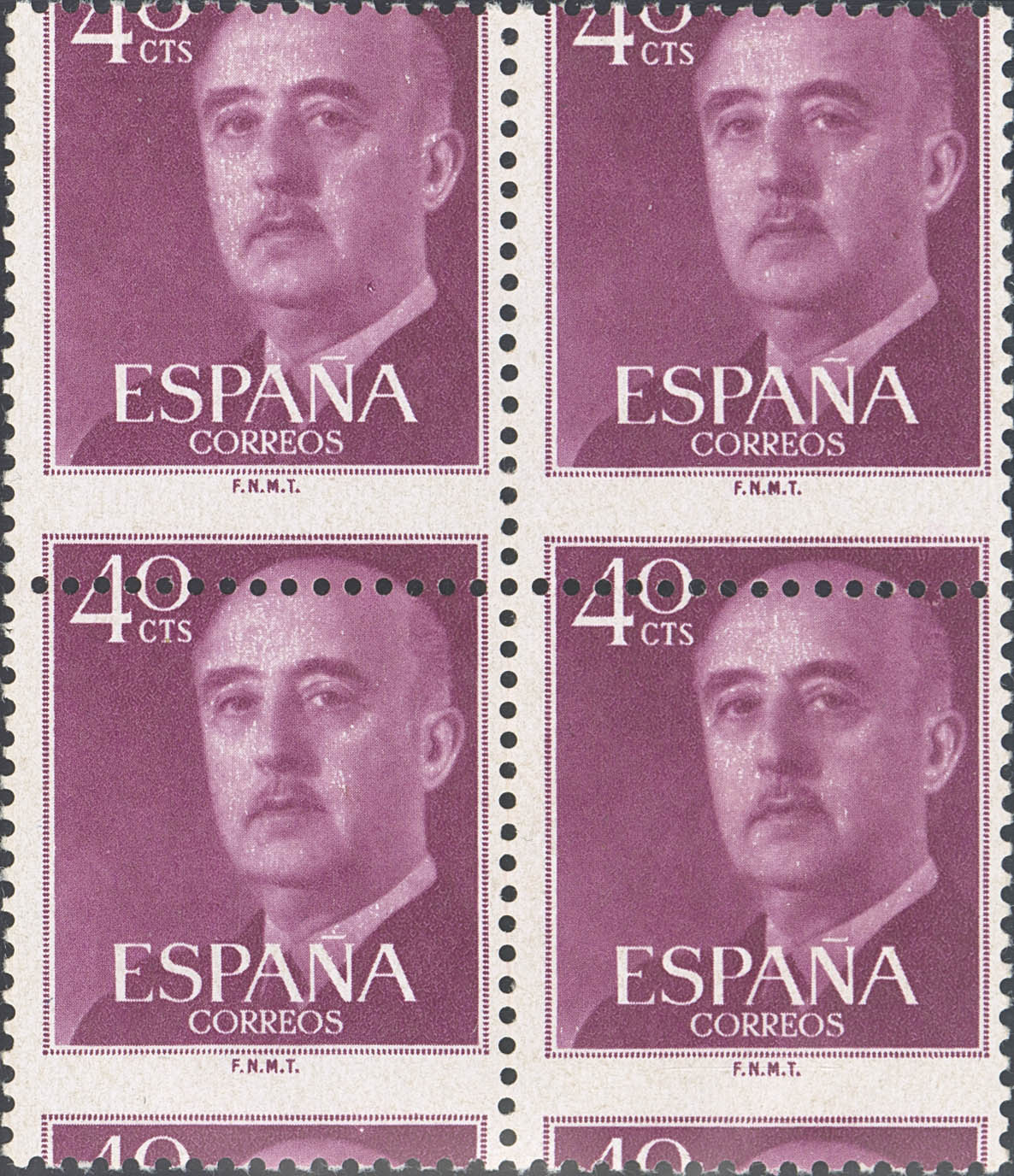 ★★ 1148dv(4). 1955. 40 cts lila oscuro, bloque de cuatro. Variedad DENTADO HORIZONTAL DESPLAZADO. MAGNIFICO Y RARO. Edifil 2021: +120 Euros