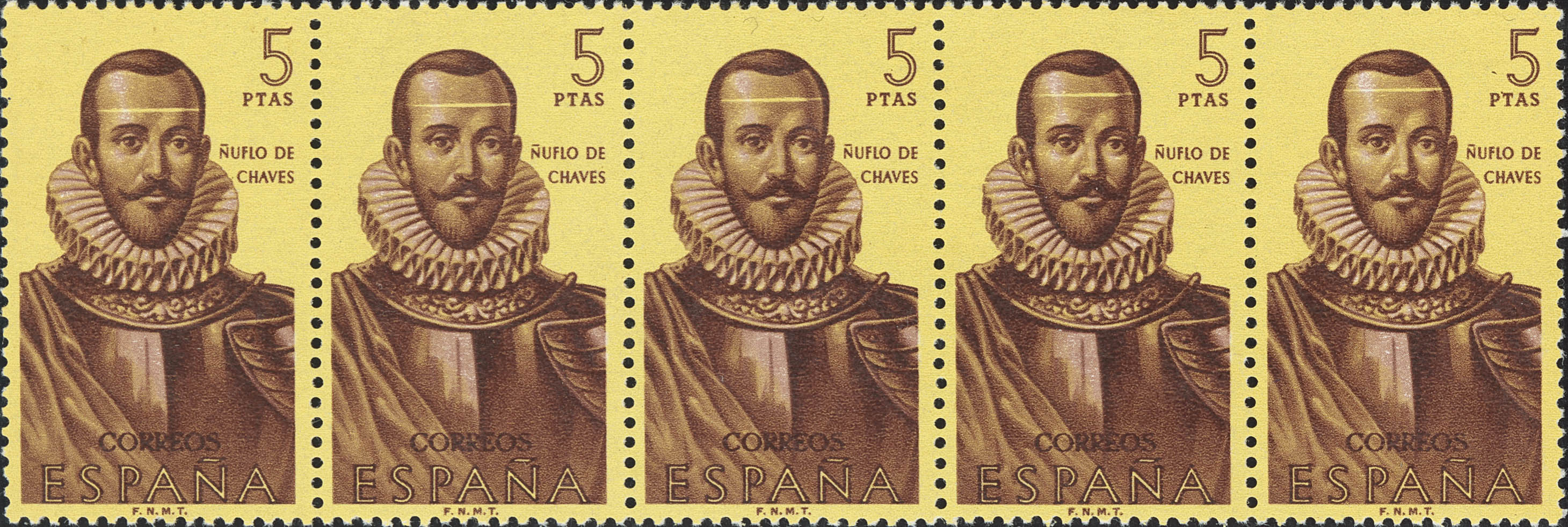 ★★ 1381it(5). 1961. 5 pts castaño y amarillo, tira de cinco. Variedad LINEA BLANCA EN LA CABEZA. MAGNIFICA. Edifil 2021: +75 Euros
