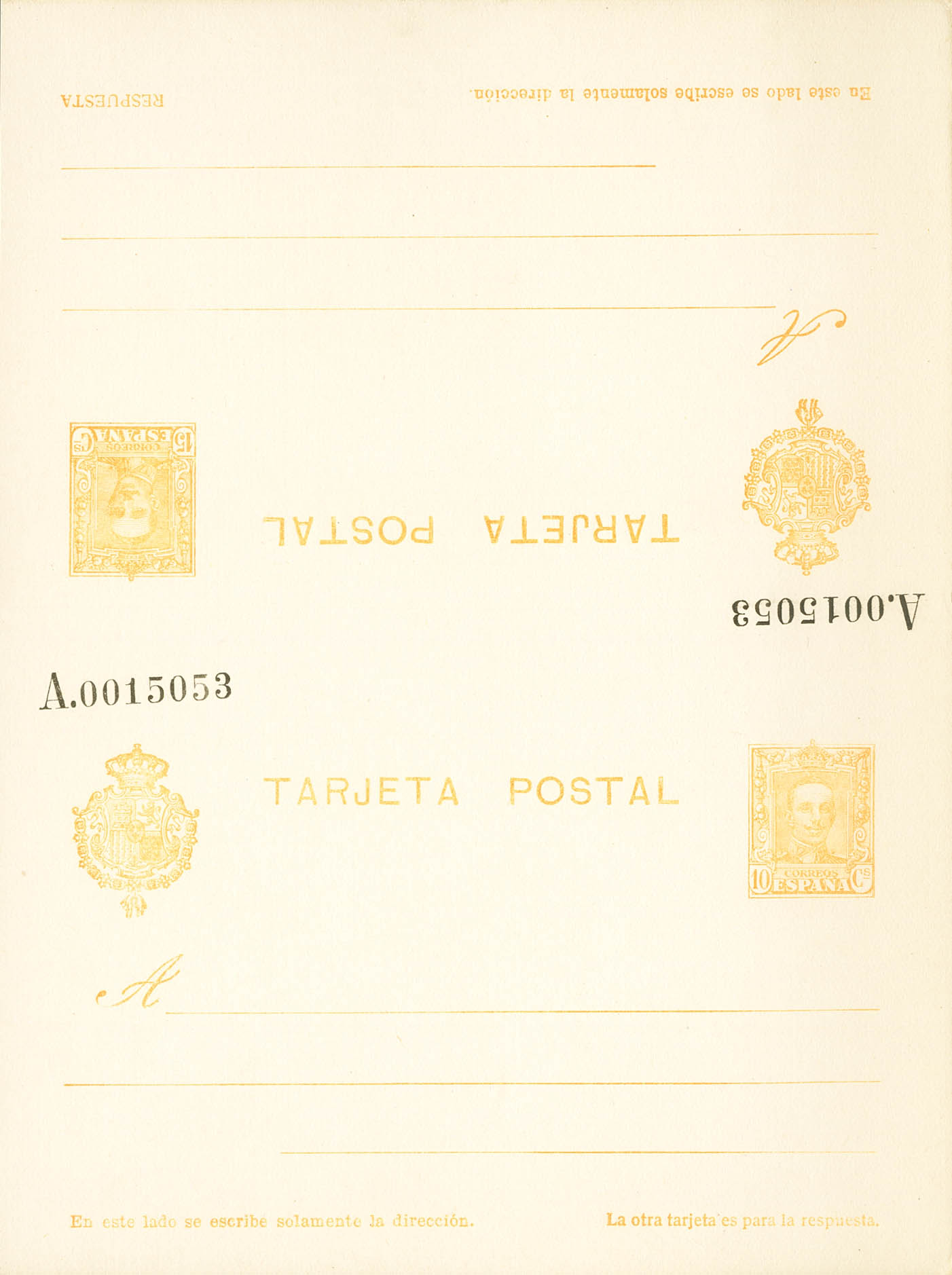 (★) EP58. 1925. 10 cts + 15 cts amarillo sobre Tarjeta Entero Postal, de ida y vuelta (sin doblar). MAGNIFICA Y RARA. Edifil 2026: +265 Euros