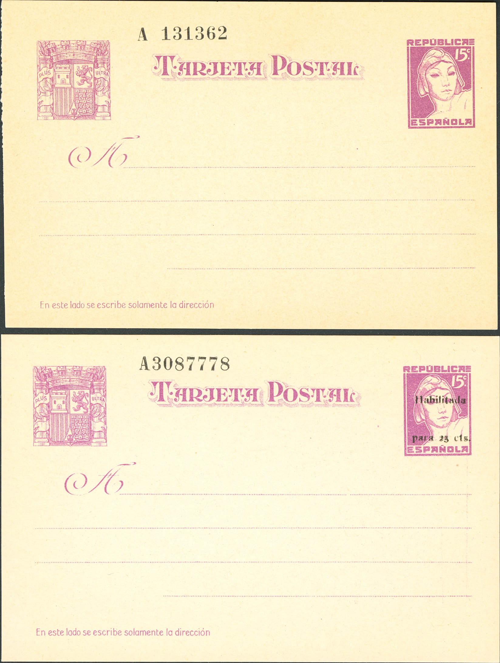 (★) EP75/76. 1937. 15 cts violeta y 25 cts sobre 15 cts violeta, sobre Tarjetas Entero Postales. MAGNIFICAS. Edifil 2026: 134 Euros