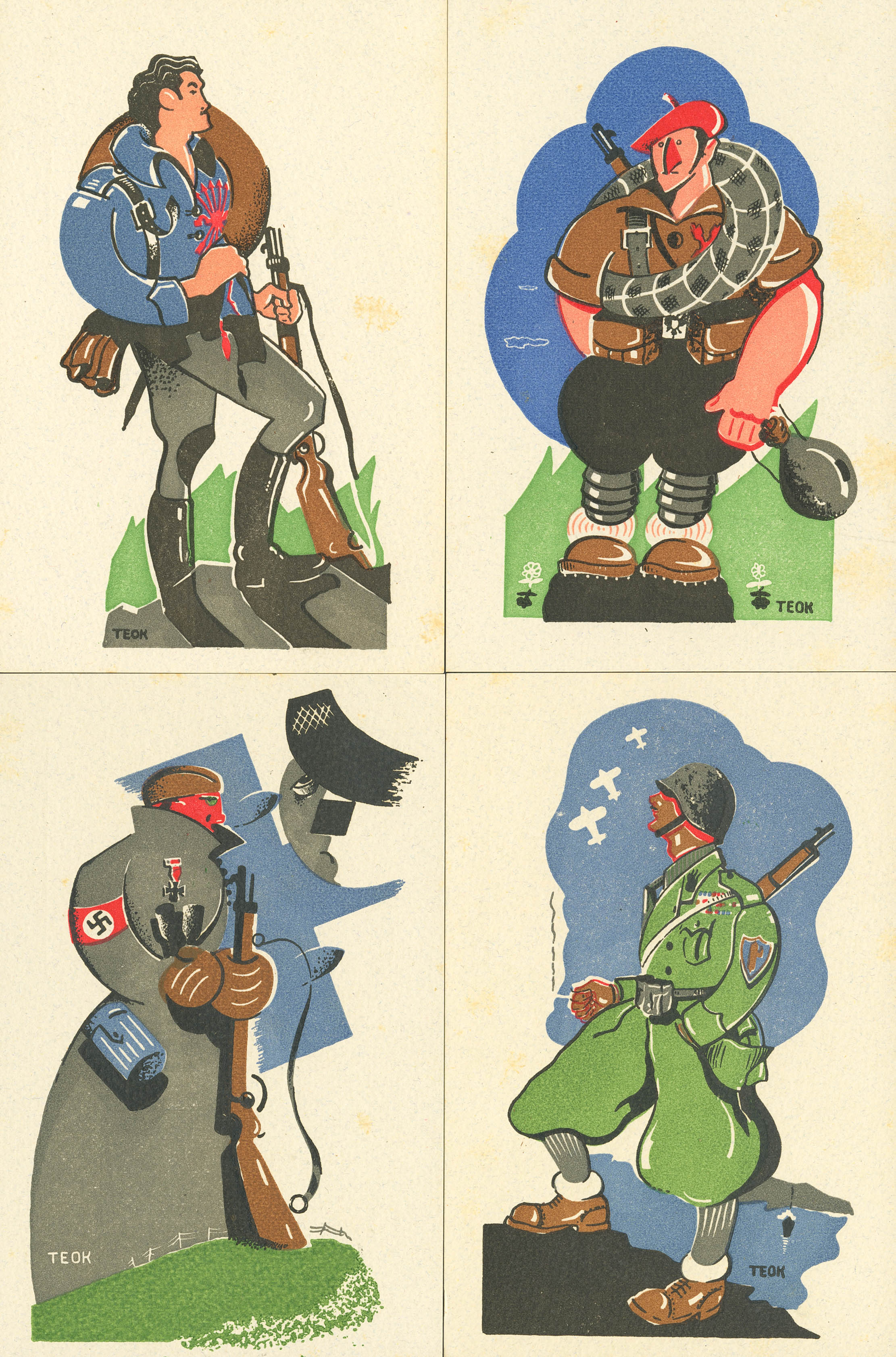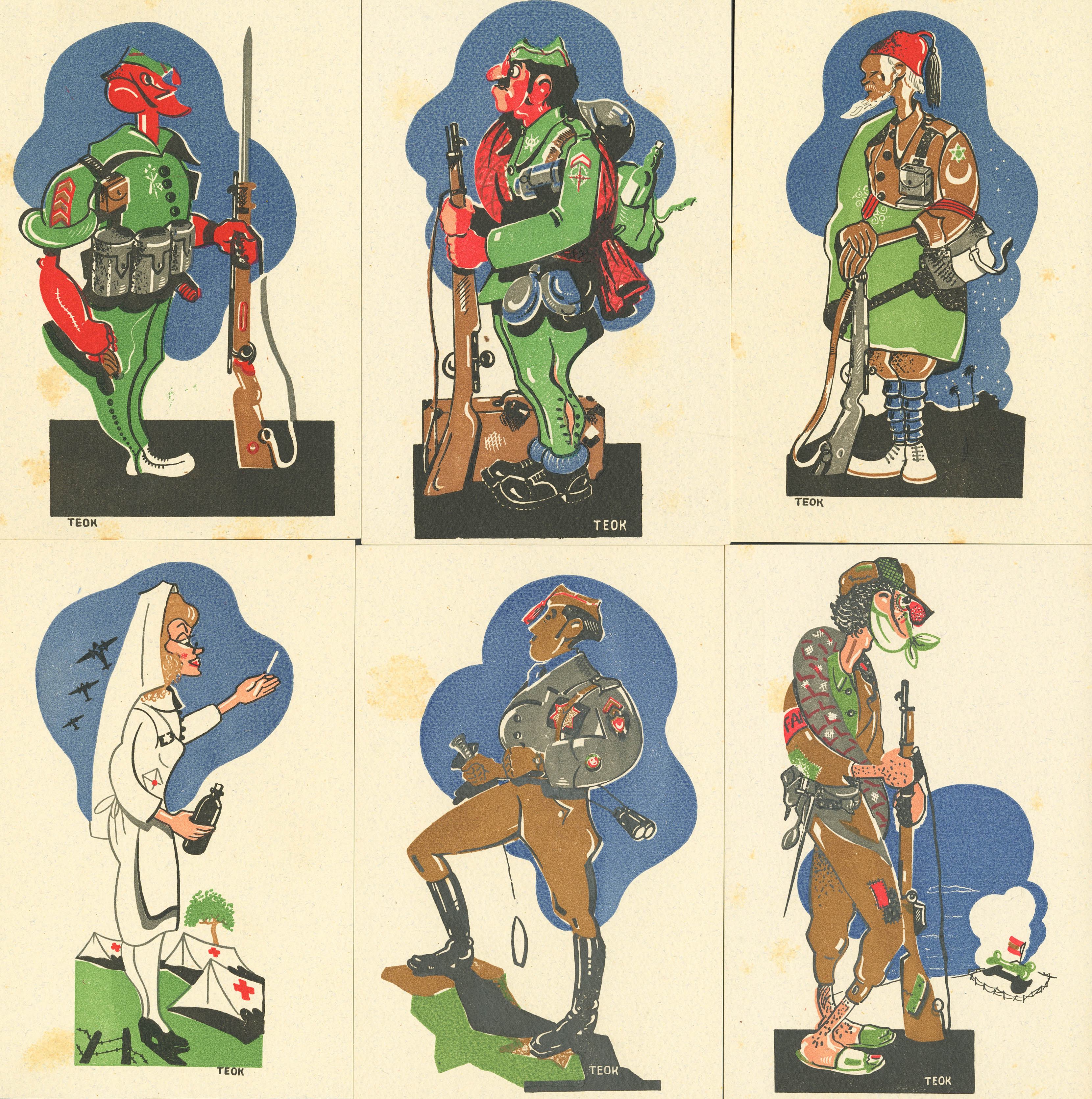 (★)(1937ca). Juego completo de diez Tarjetas Postales realizadas por TEOK con caricaturas de soldados y enfermera del Bando Nacional (manchitas del tiempo). BONITAS. (Allepuz 518/27)