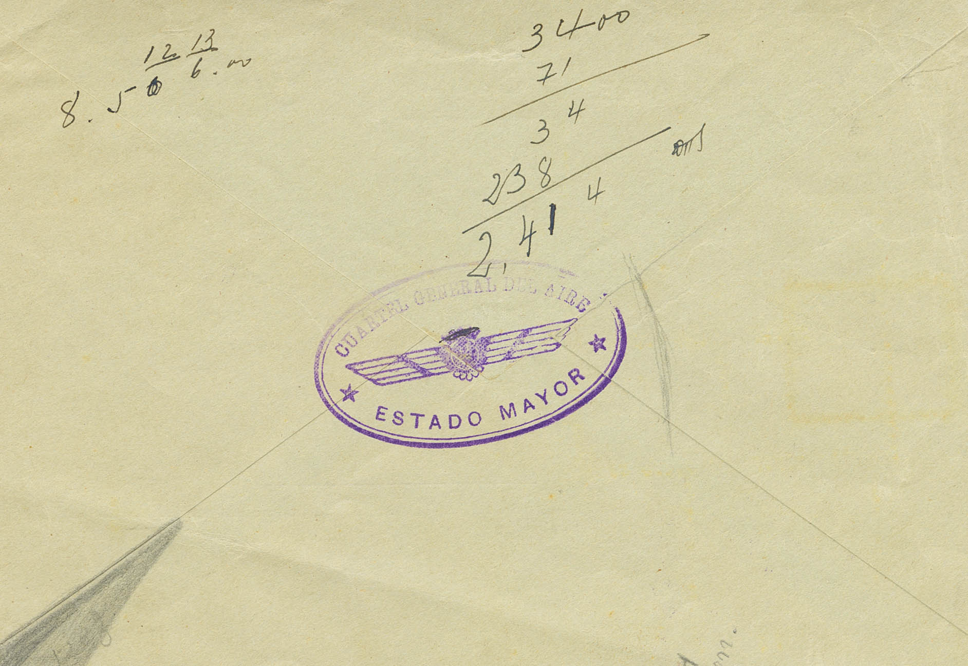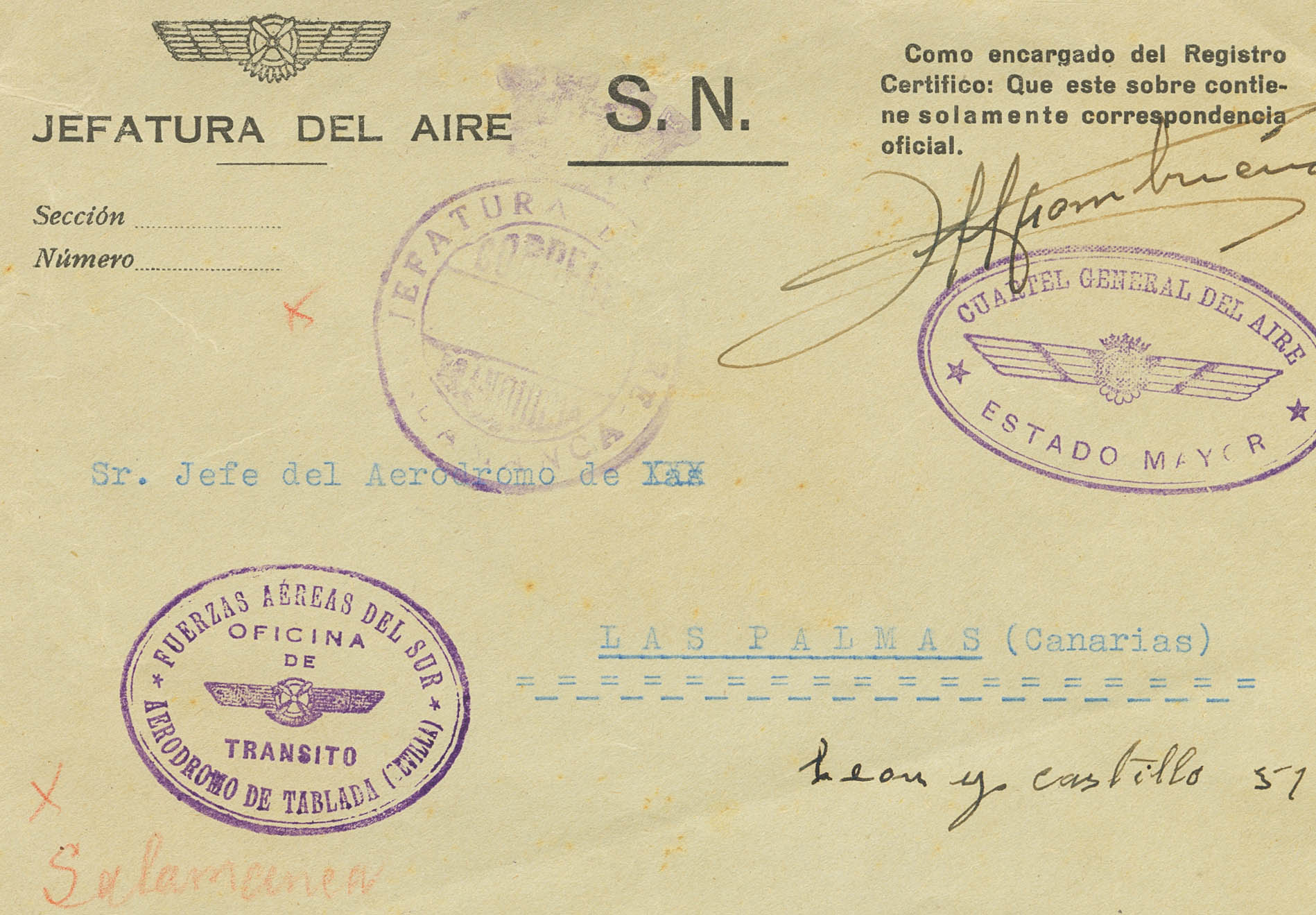 (1939ca). SALAMANCA a LAS PALMAS. Marca de franquicia JEFATURA DEL AIRE / SALAMANCA y marcas ovales CUARTEL GENERAL DEL AIRE / ESTADO MAYOR y FUERZAS AEREAS DEL SUR / AERODROMO DE TABLADA (SEVILLA), en violeta, esta última aplicada en tránsito. MAGNIFICA Y MUY RARA.
