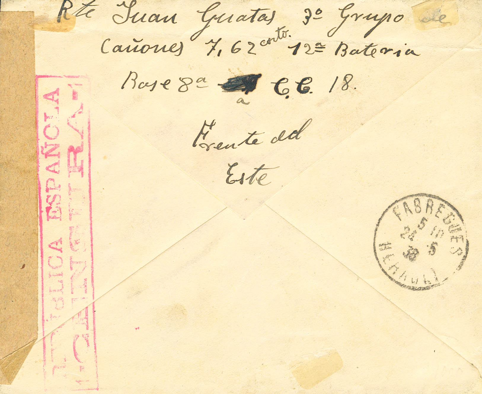 687(3). 1938. 30 cts carmín, tira de tres. Dirigida a FABREGUES (FRANCIA). Matasello EJERCITO DEL ESTE / 12 BATERIA DE CAÑONES DE 75 / COMISARIO, en violeta y al dorso llegada. MAGNIFICA Y RARISIMA.