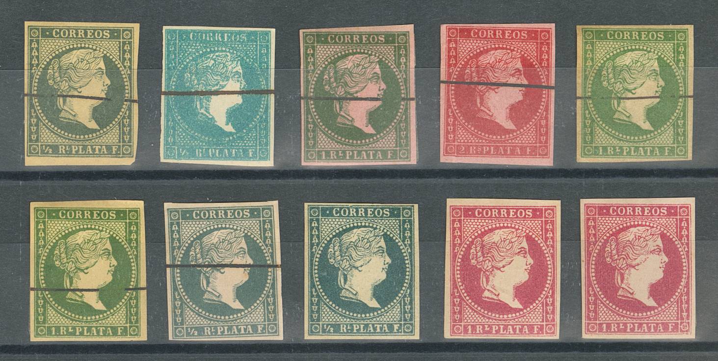 (★) 7P, 8P. 1857. Conjunto de diez ENSAYOS DE COLOR de ½ real y 1 real de 1857, la mayoría con trazo de tinta. MAGNIFICOS.