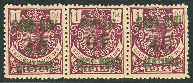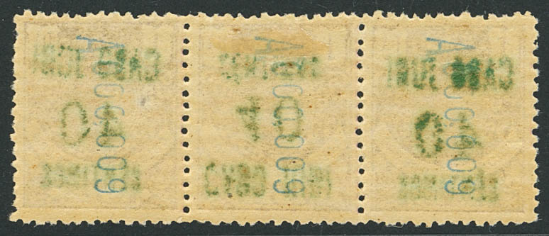 ★★/★ 4A(2), 4Ahi. 1916. 40 cts sobre 1 pts violeta, tira de tres. Sello central SOBRECARGA INVERTIDA. MAGNIFICA Y RARA. Edifil 2018: +372 Euros
