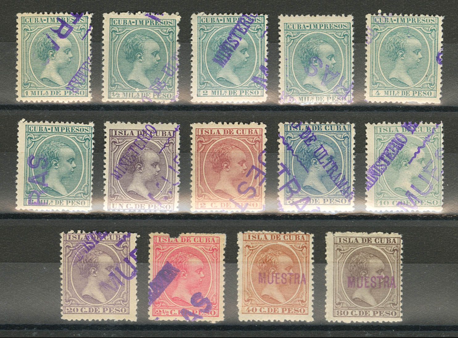 ★★/★ 140/53M. 1896. Serie completa (2½ ctvos defecto). Sobrecarga MINISTERIO DE ULTRAMAR / MUESTRAS (sólo MUESTRA en 40 cts y 80 cts). BONITA Y RARA.