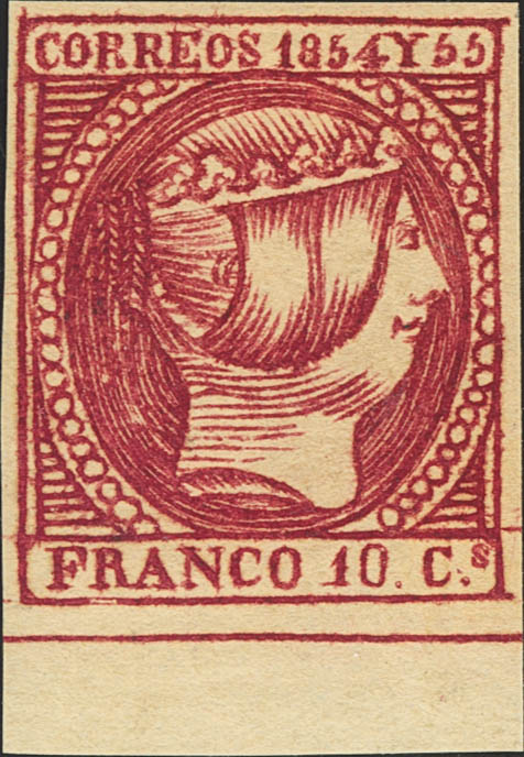 ★ 2. 1854. 10 cuartos carmín, borde de hoja. Color excepcional. MAGNIFICO. Cert. CEM.