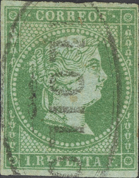 6a. 1855. 1 real verde de Antillas. Matasello oval ILOILO. MAGNIFICO Y MUY RARO.
