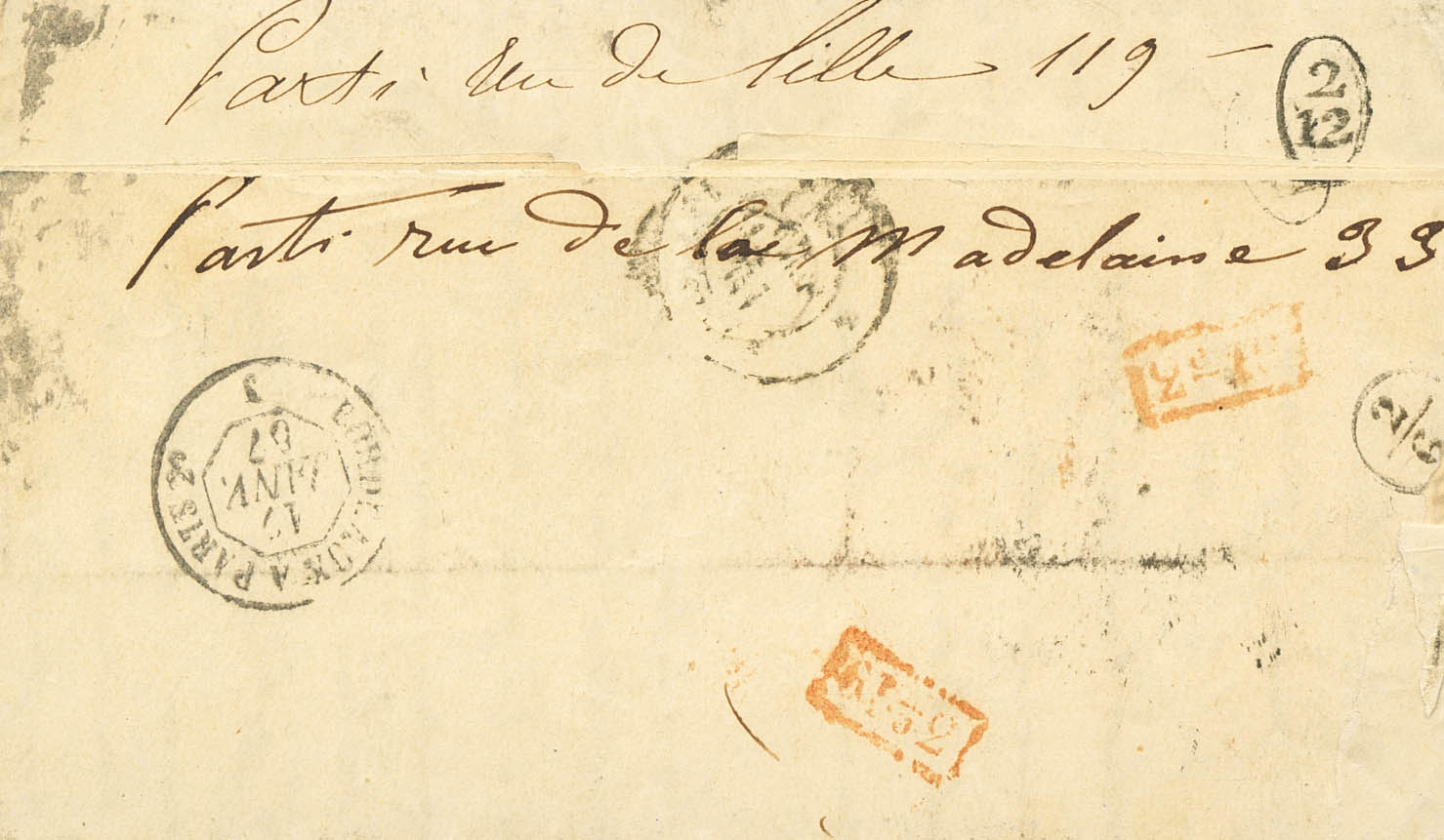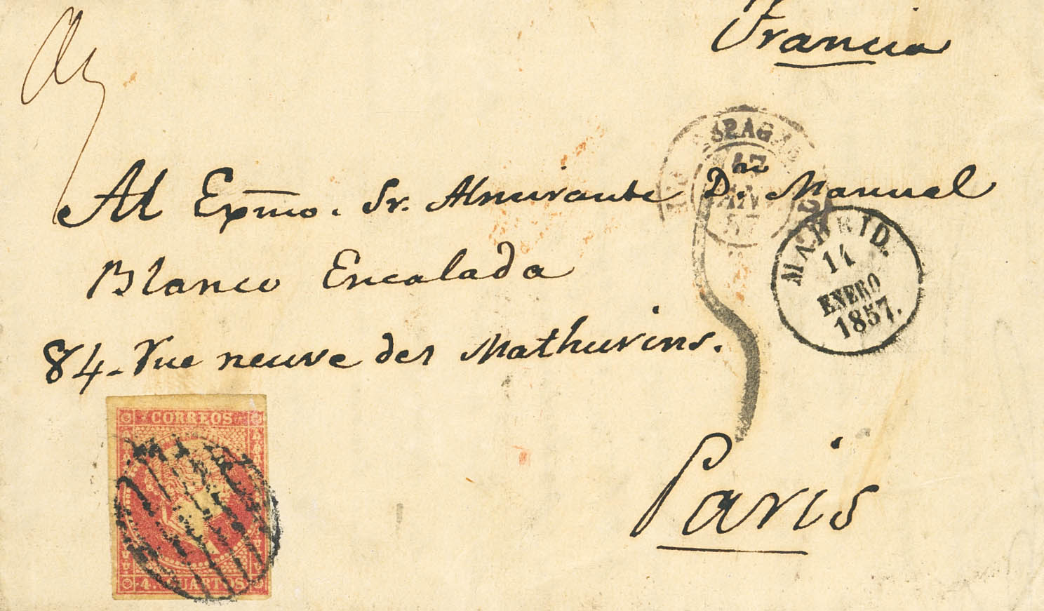44. 1857. 4 cuartos rojo. MADRID a PARIS (FRANCIA). En el frente tasa manuscrita "5" (décimas) según el Convenio con Francia del 1 de Abril de 1849, no era necesario el franqueo con sellos hasta Agosto de 1859 y hasta entonces, en caso de estar franqueada la misiva, se consideraba que pagaba el tránsito únicamente hasta la frontera, además el fechador pequeño de correo interior de MADRID. MAGNIFICA Y MUY RARA.