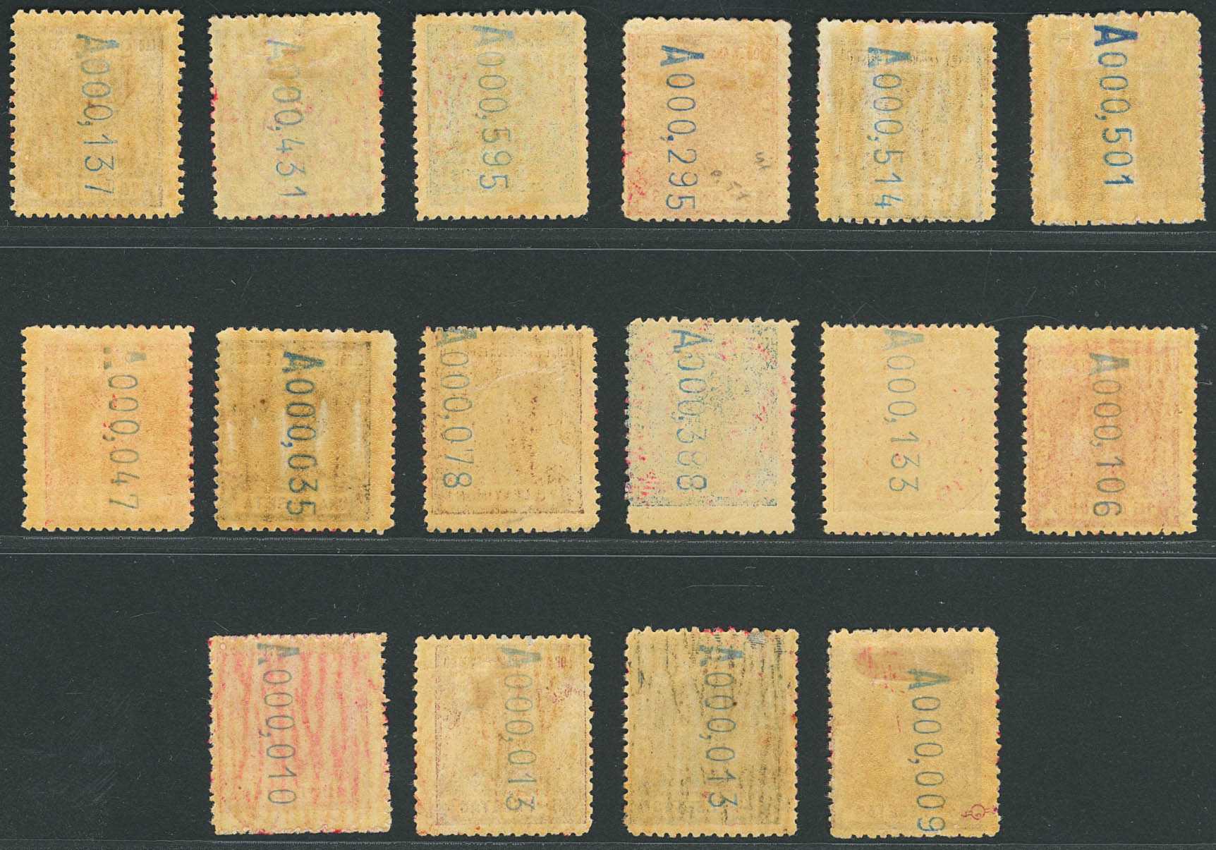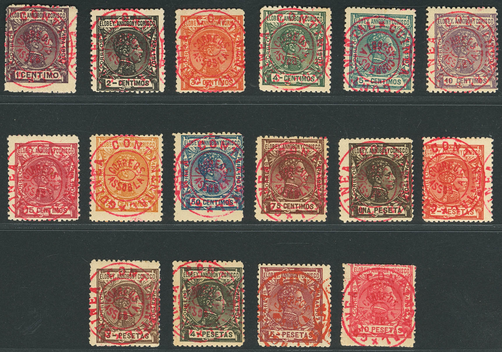 ★ 58Ac/Rc. 1909. Serie completa. Sobrecarga GUINEA CONTINENTAL / CORREOS / ASSOBLA, en rojo. MAGNIFICA Y RARISIMA. Cert. COMEX. Edifil 2018: 2.500 Euros