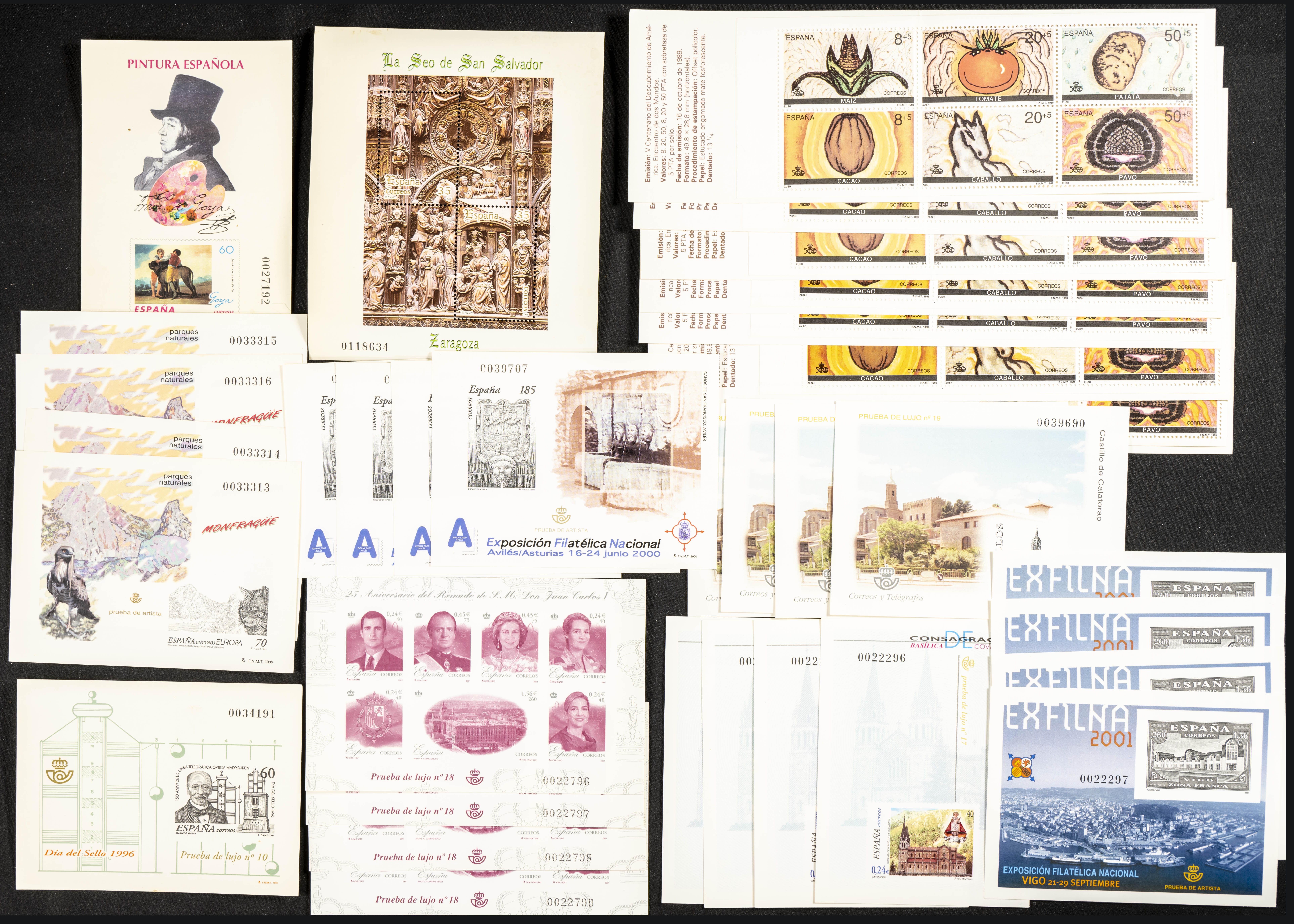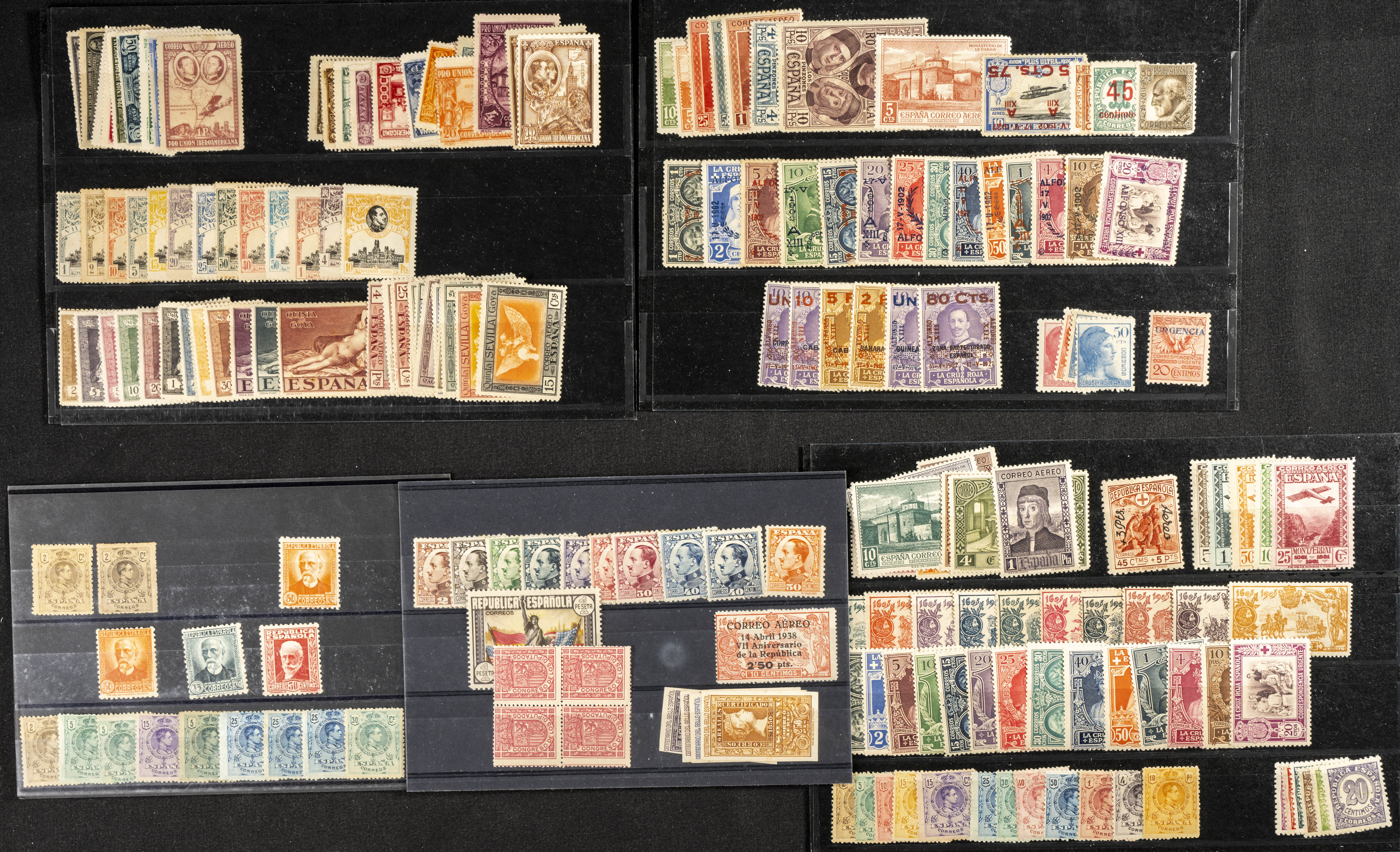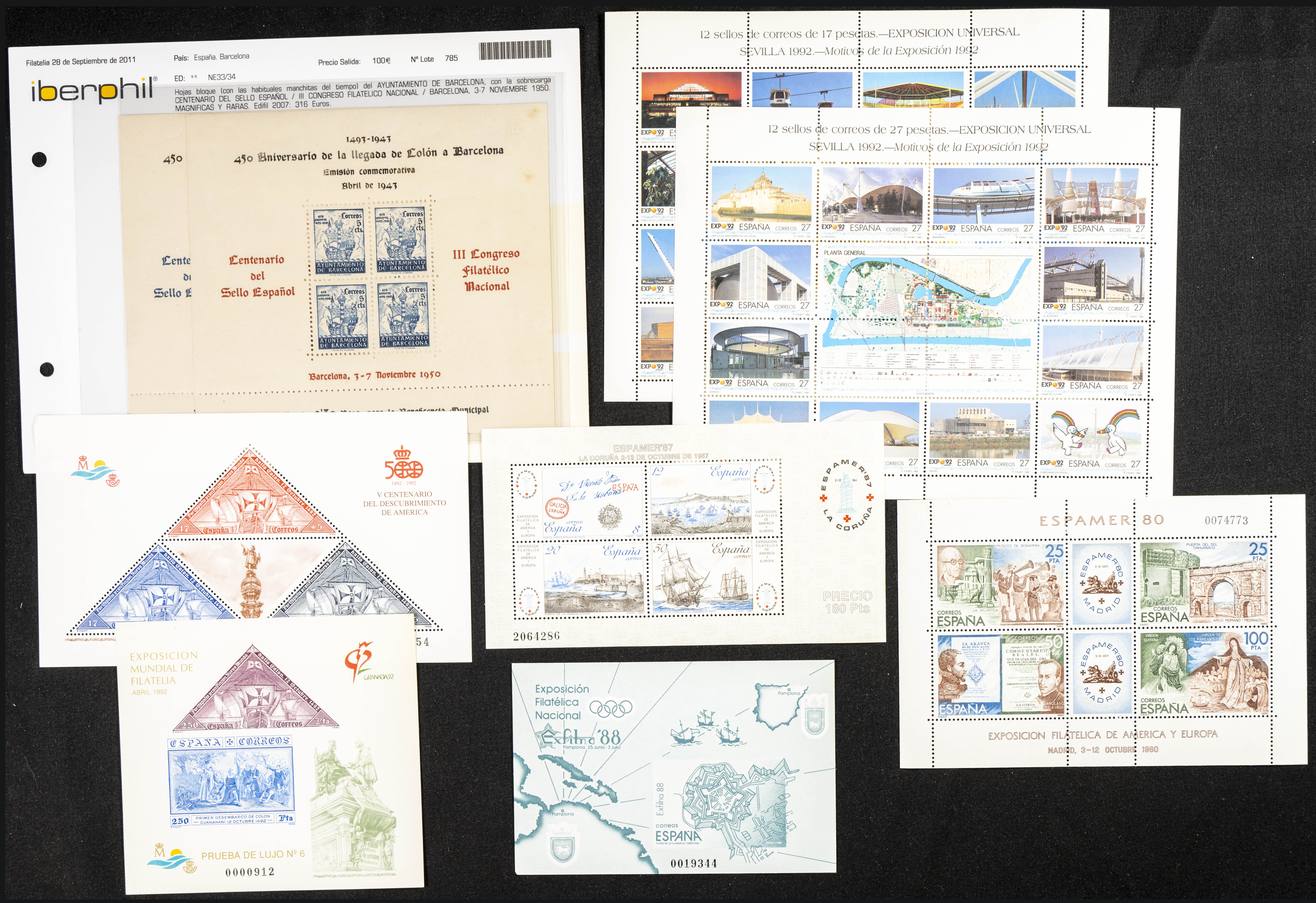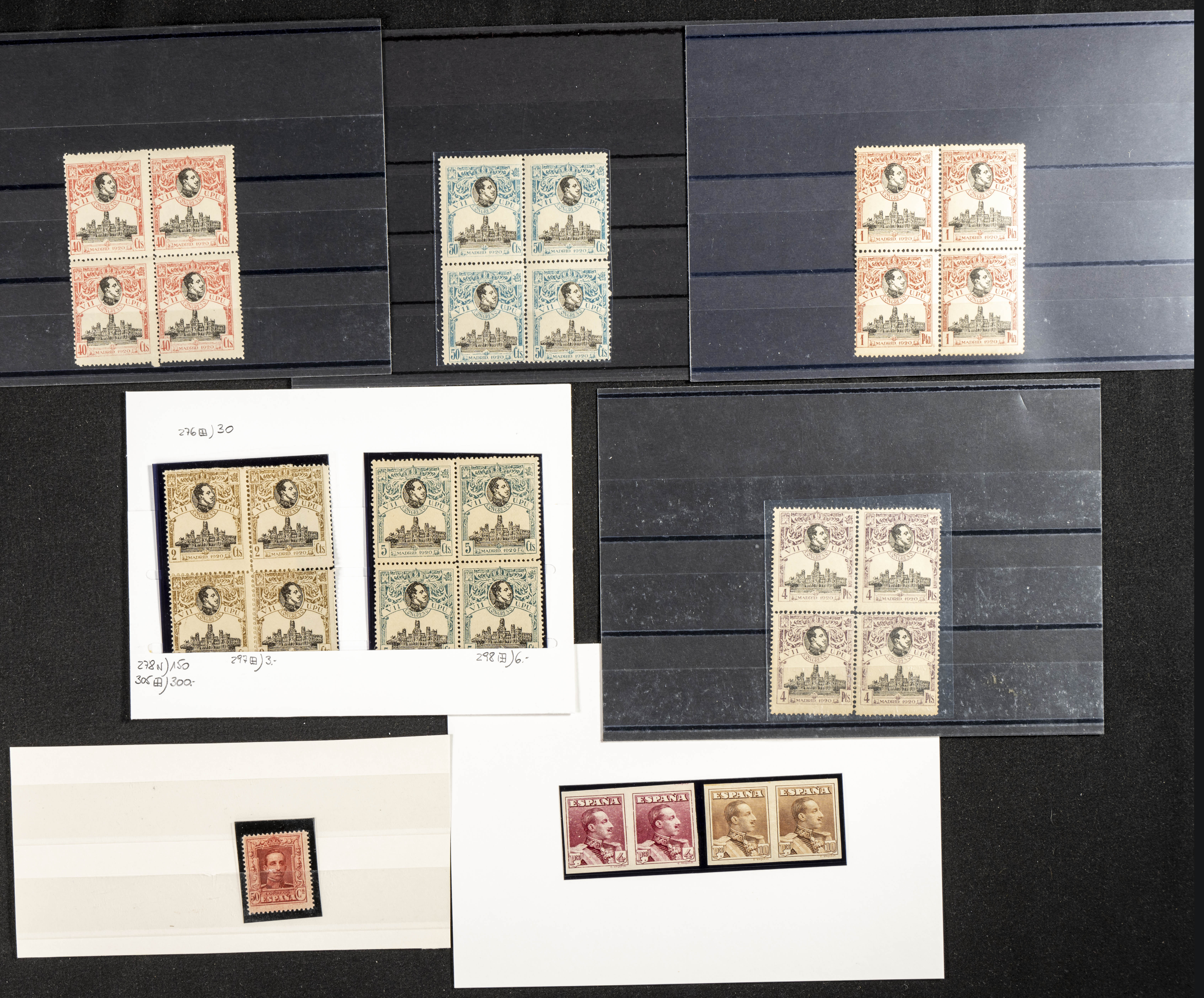 ★(1905ca). Interesante conjunto de series completas y sellos sueltos del 1º Centenario, nuevos y montados en fichas, destacando series completas de Quijote, Cruz Roja (varias), UPU, varios bloques de cuatro de la serie UPU en nuevo (incluyendo 40 cts, 50 cts, 1 pts y 4 pts), variedades de Vaquer, etc. ALTISIMO VALOR DE CATALOGO. IMPRESCINCIBLE EXAMINAR.