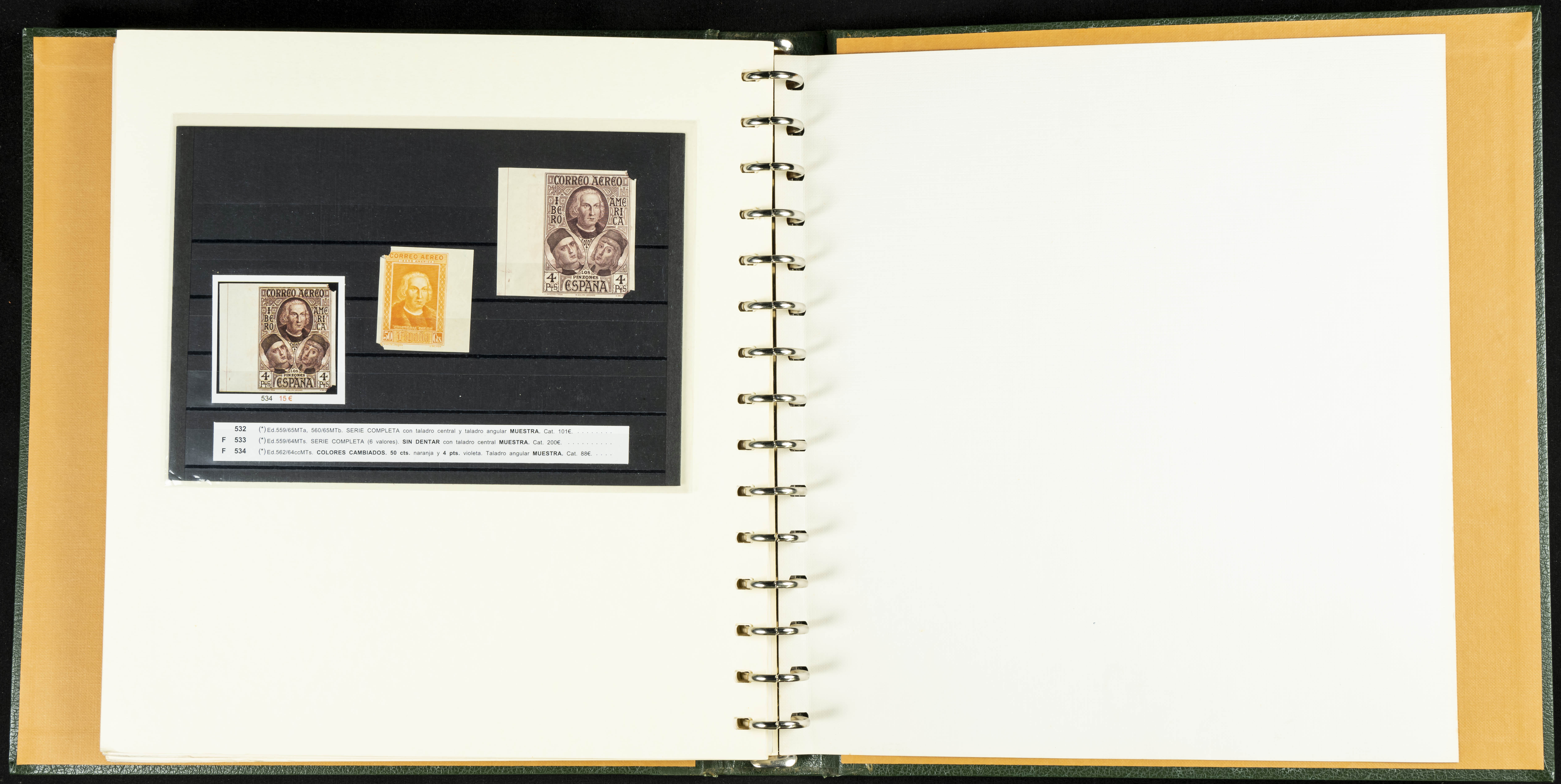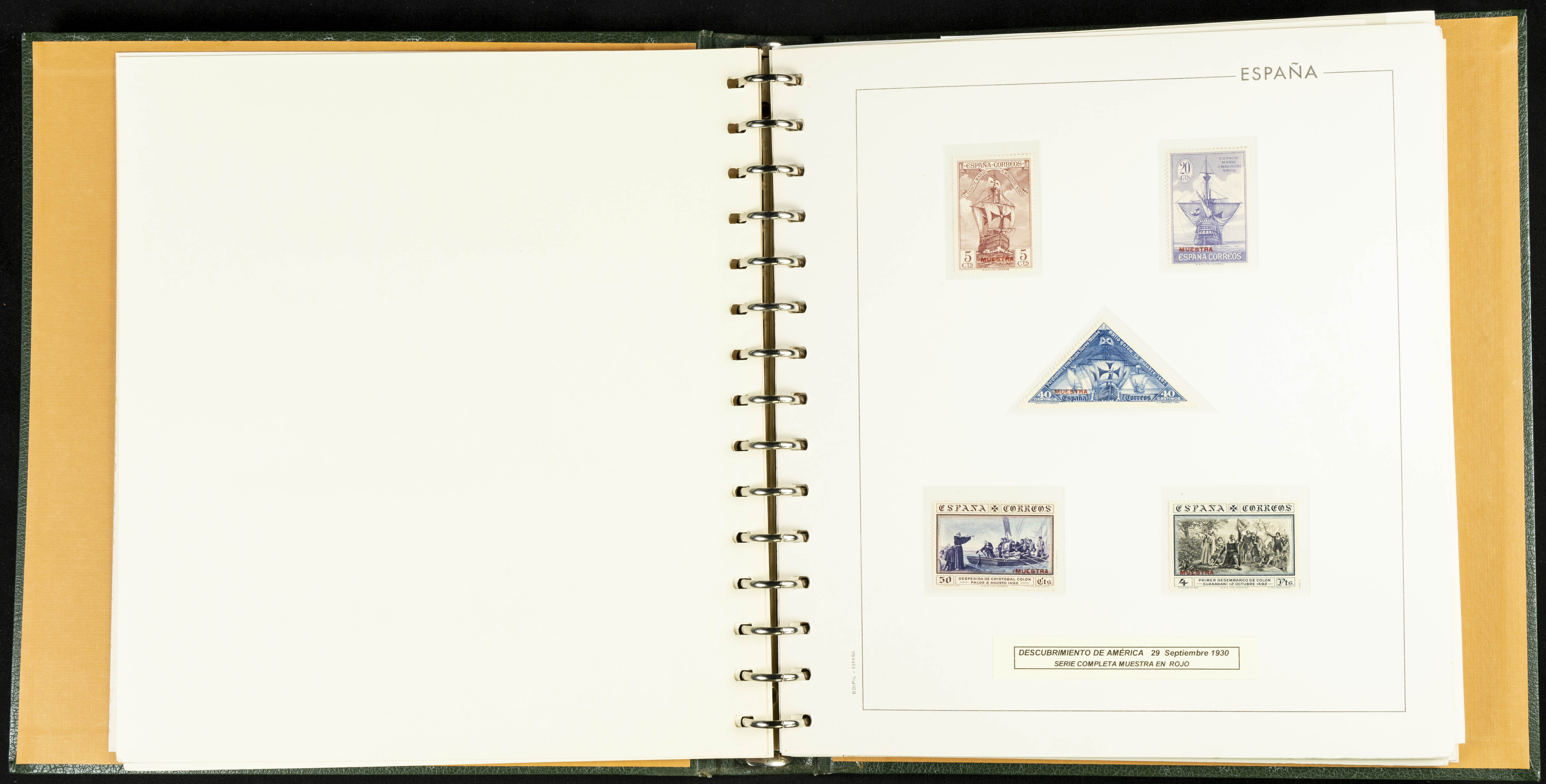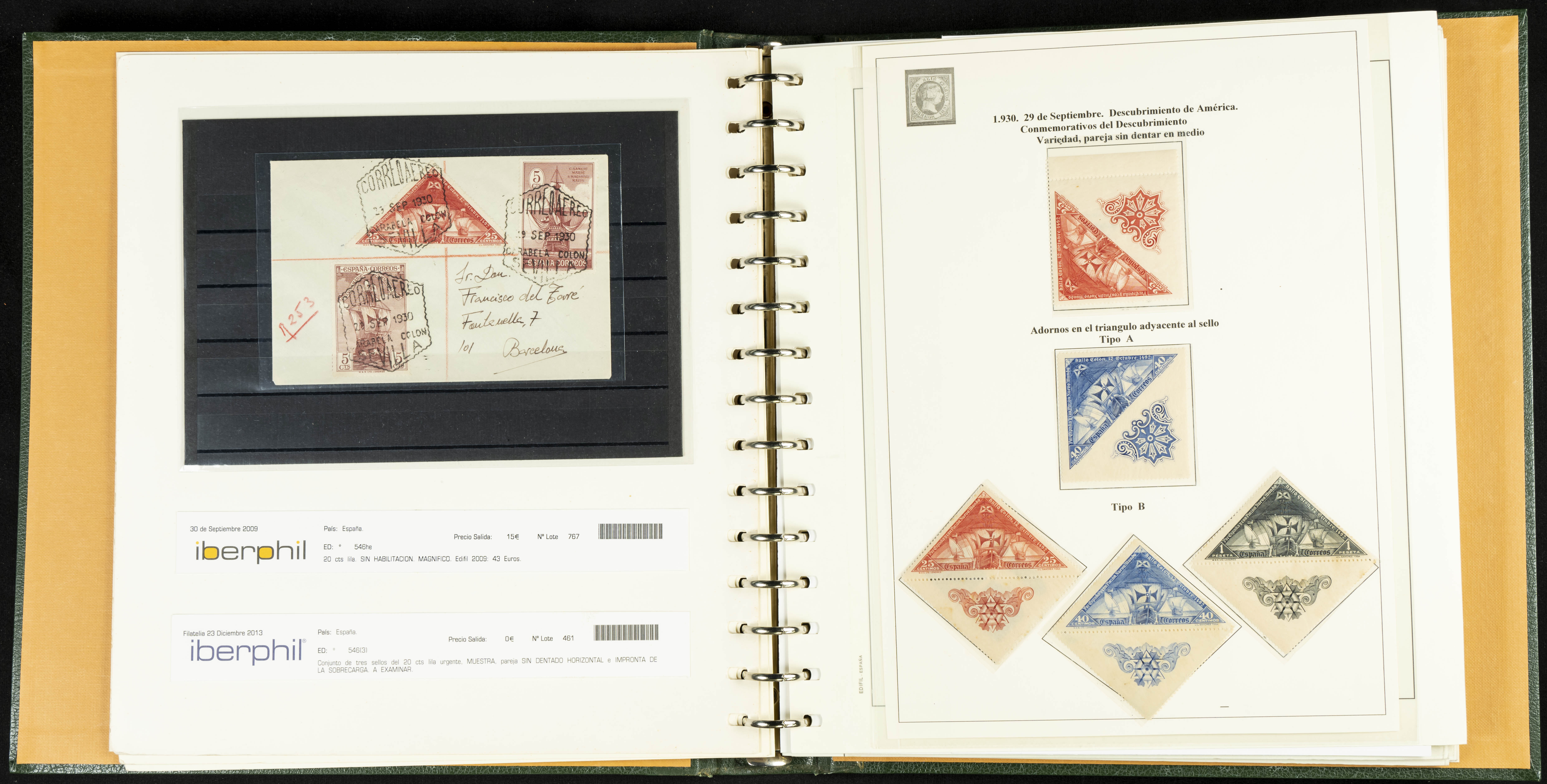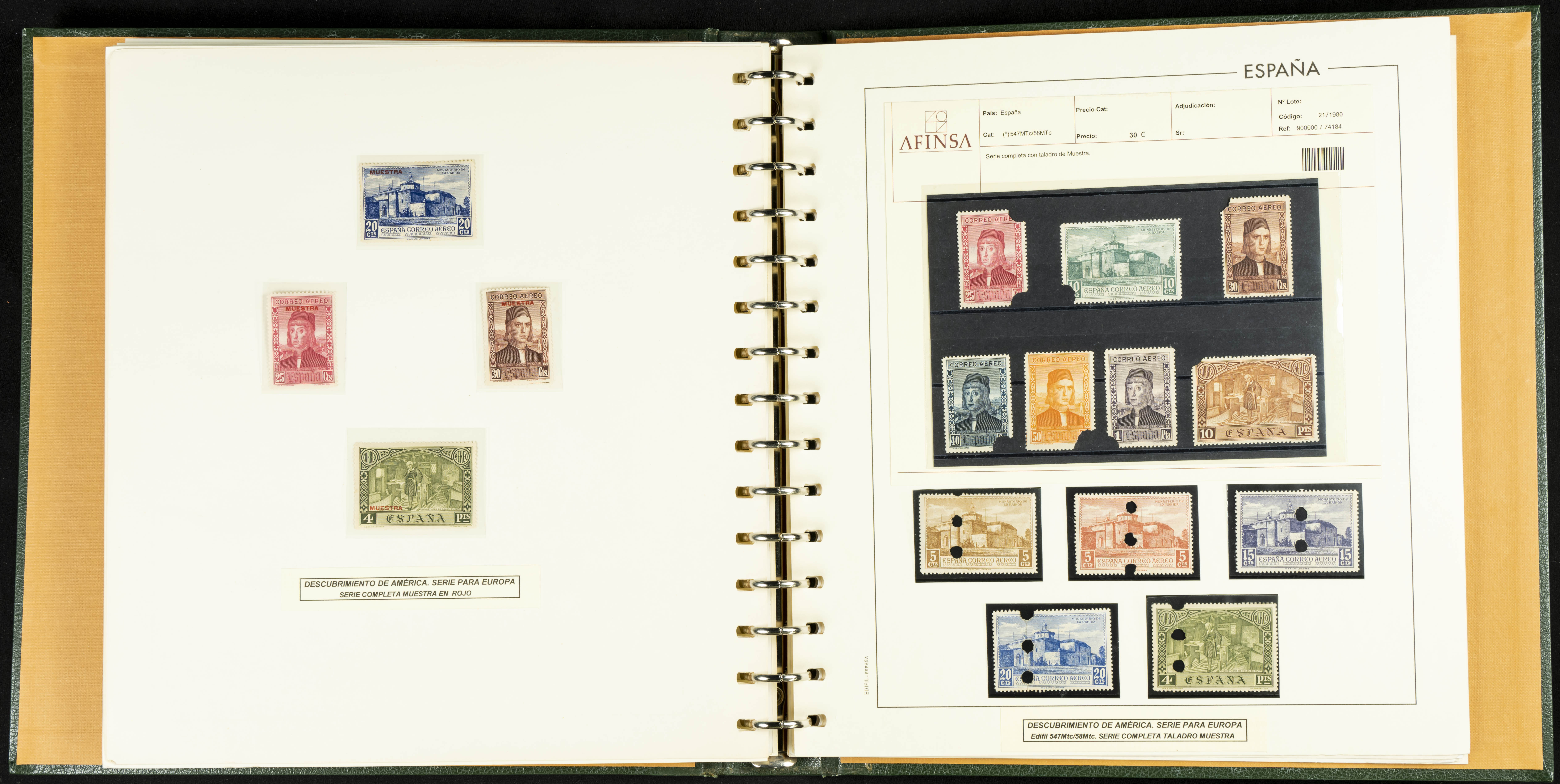 ★★/★(1930ca). Interesante conjunto-colección de la emisión del Descubrimiento de América, en nuevo e incluyendo sobrecargas y taladros Muestra, una serie sin dentar (Europa), varias cartas y Cambios de Color. ALTO VALOR DE CATALOGO. A EXAMINAR.