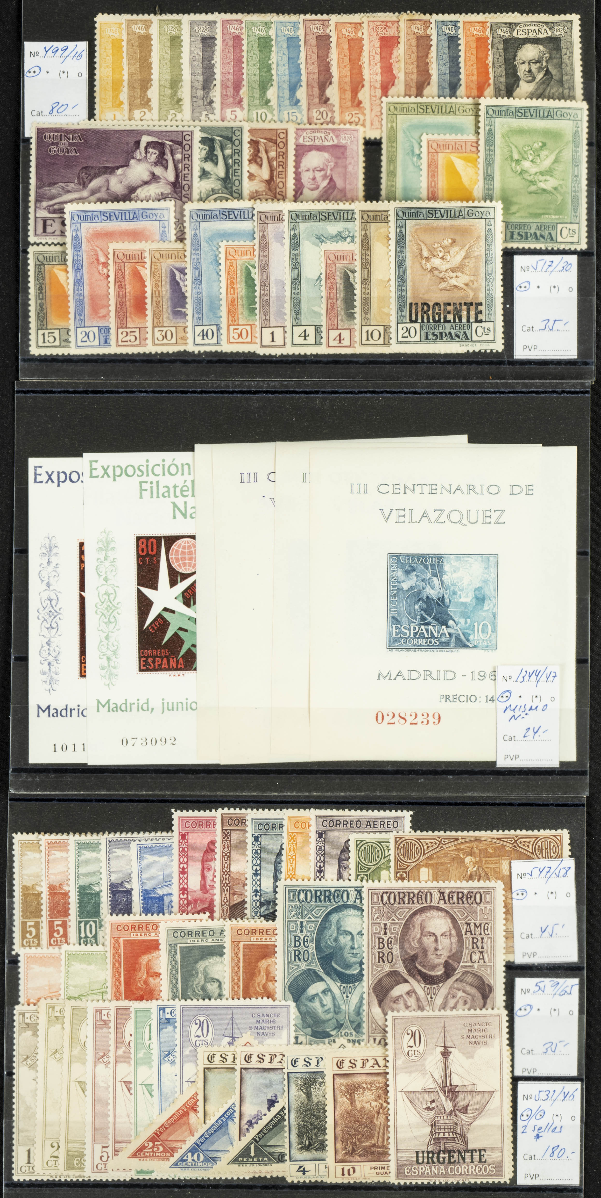★★/★(1930ca). Conjunto de siete series completas entre 1926 y 1930, incluye hojas bloque de Bruselas (1958) y Vélazquez (1961). A EXAMINAR. Edifil 2026: 459 Euros