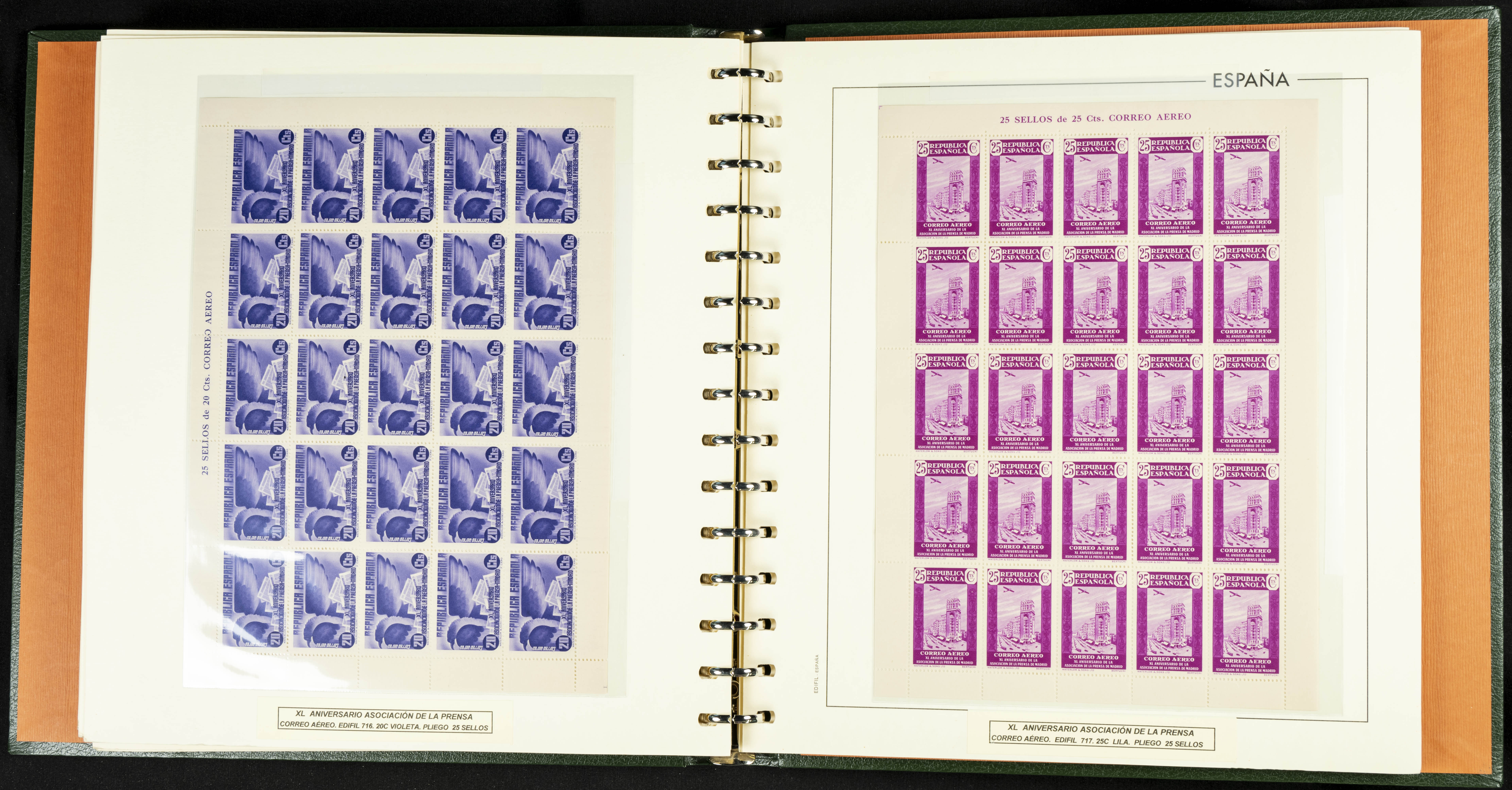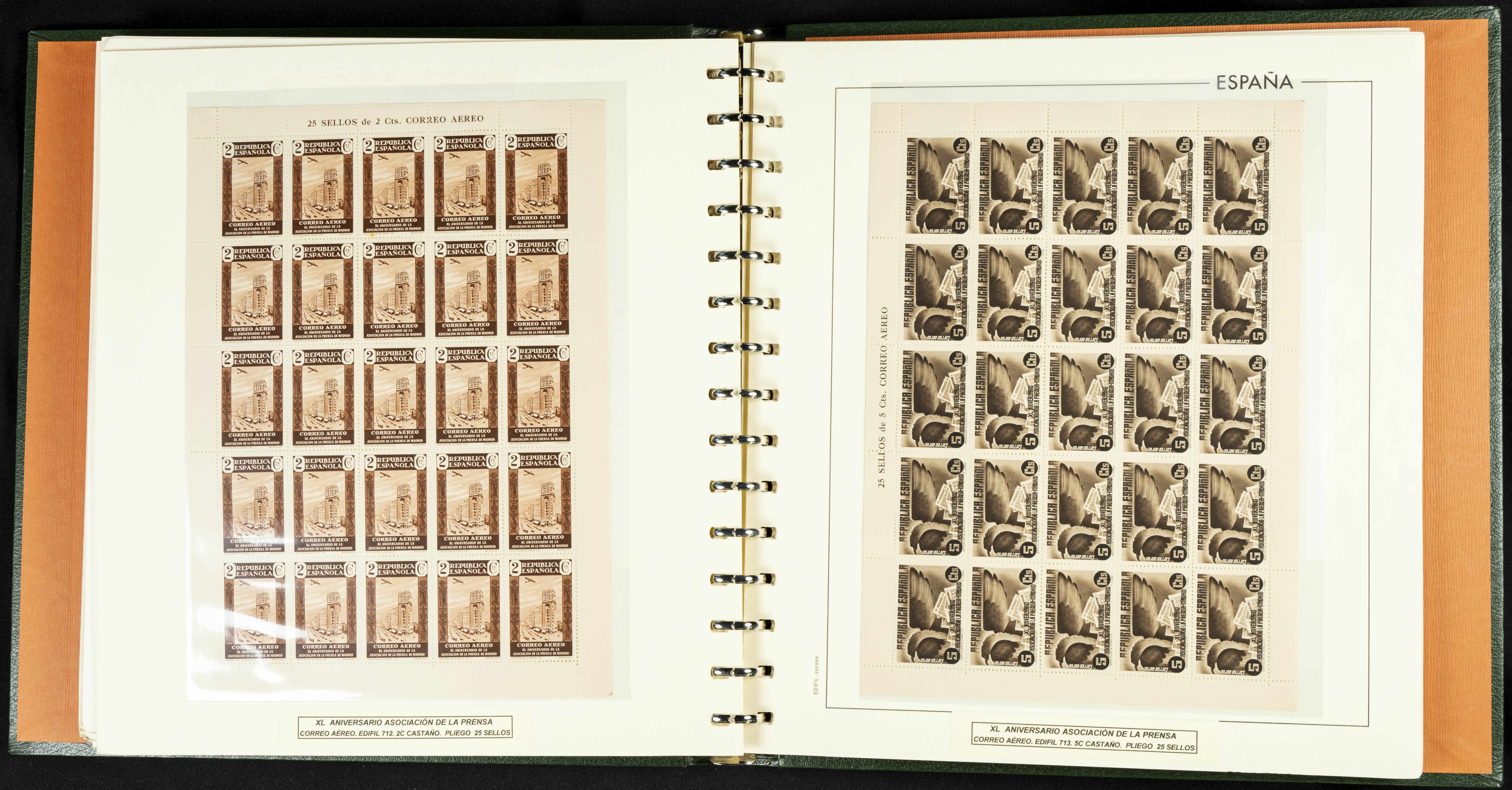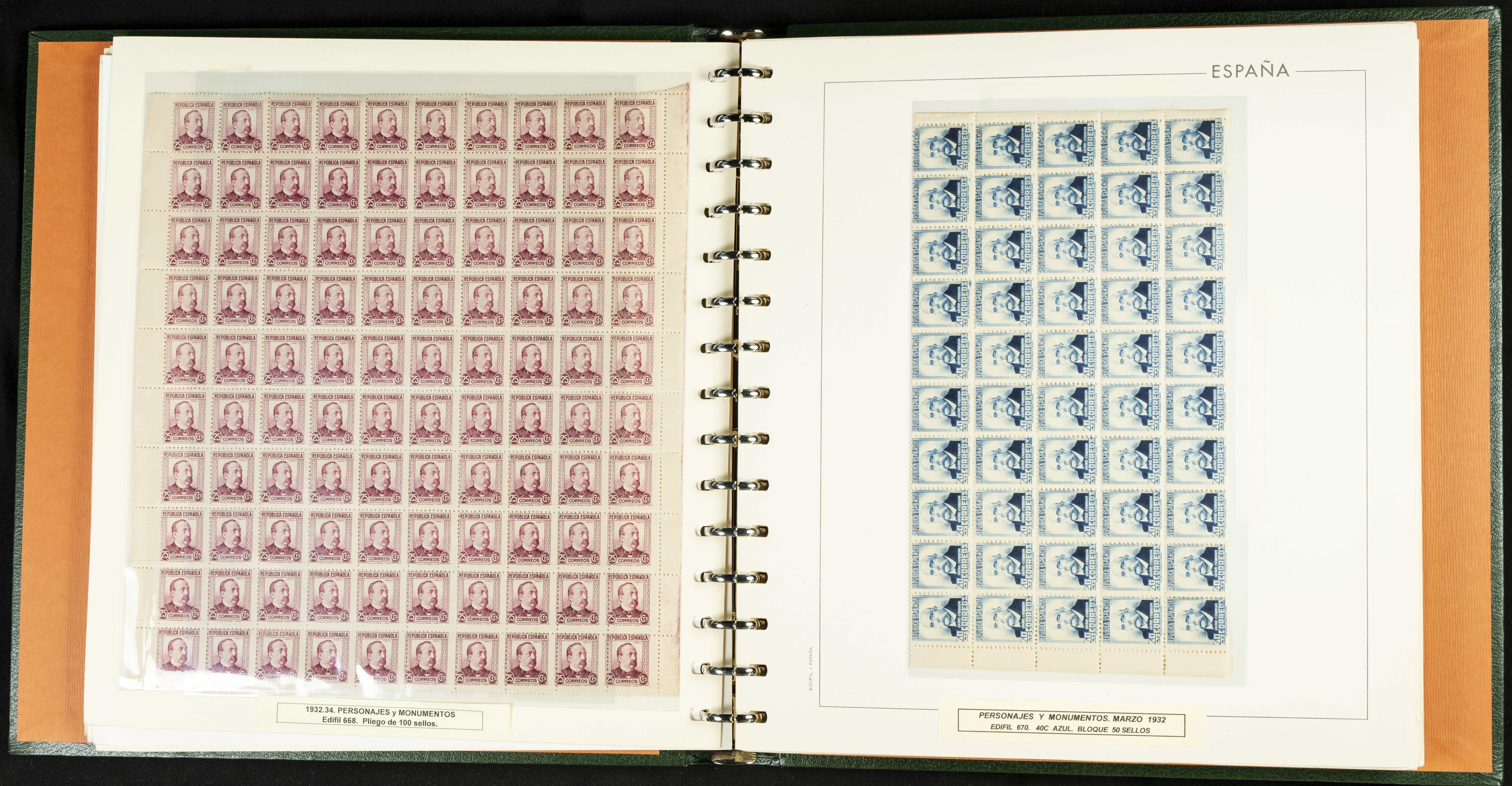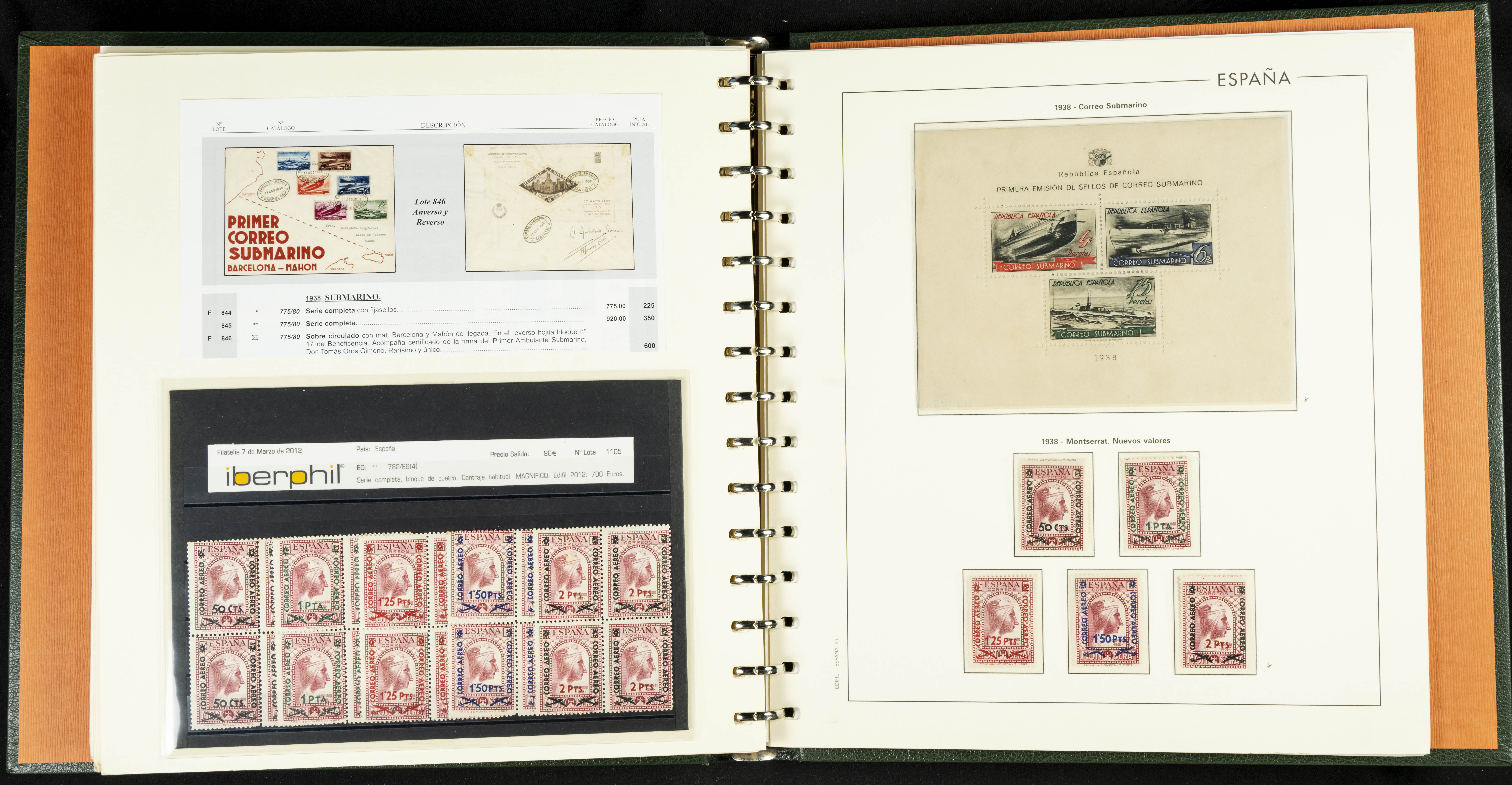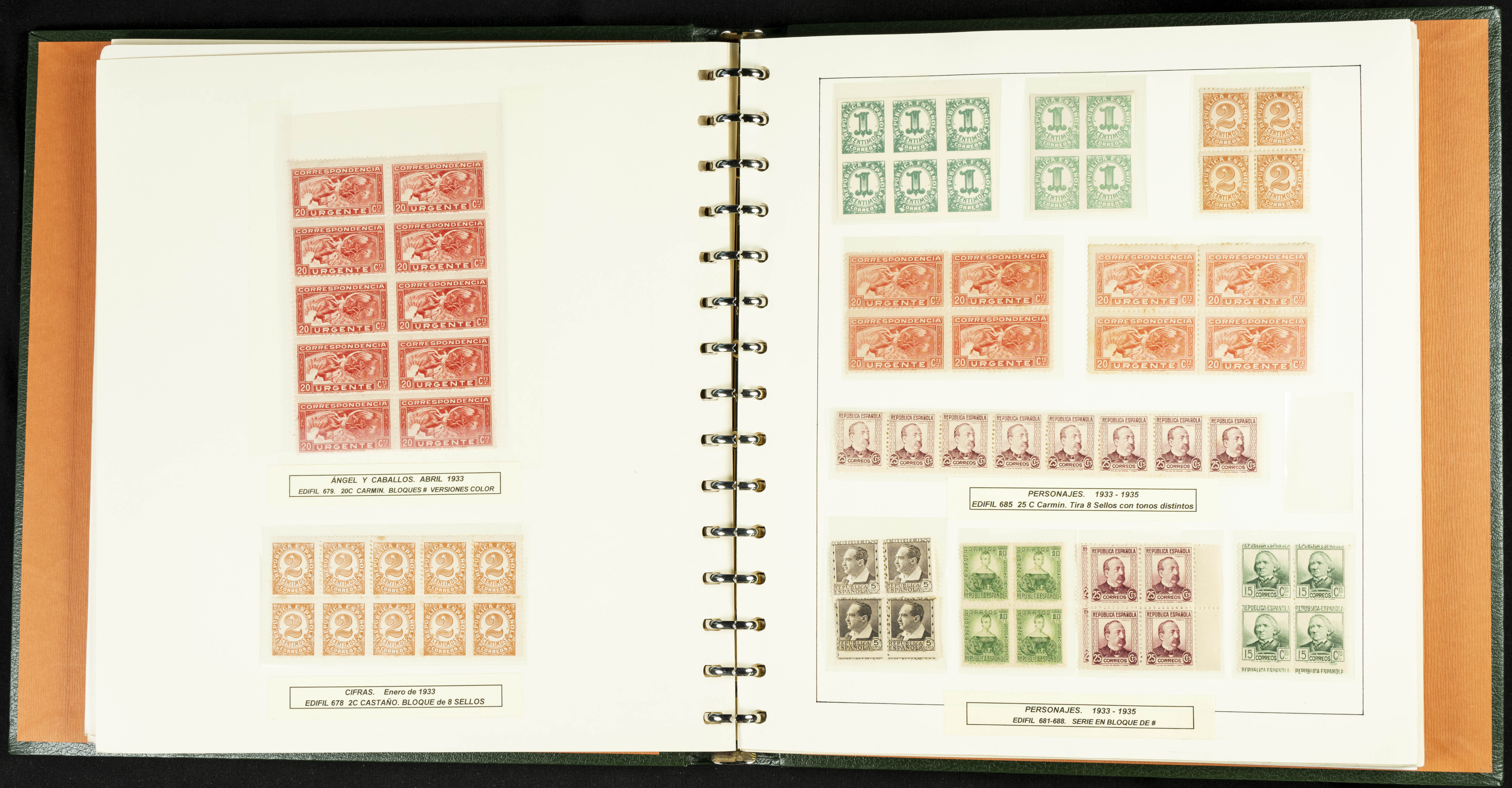 ★(1931ca). Interesante colección de República Española entre 1931 y 1939, en nuevo e incluyendo numerosos pliegos completos y grandes bloques, variedades sin dentar o dentado desplazado, cartas y algunos sellos no emitidos, destacando Montserrat, ExpoMadrid, hoja bloque Constitución USA Aéreo+5 pts, Submarino (aéreo y hoja bloque), Milicias, etc. ALTISIMO VALOR DE CATALOGO. IMPRESCINDIBLE EXAMINAR.