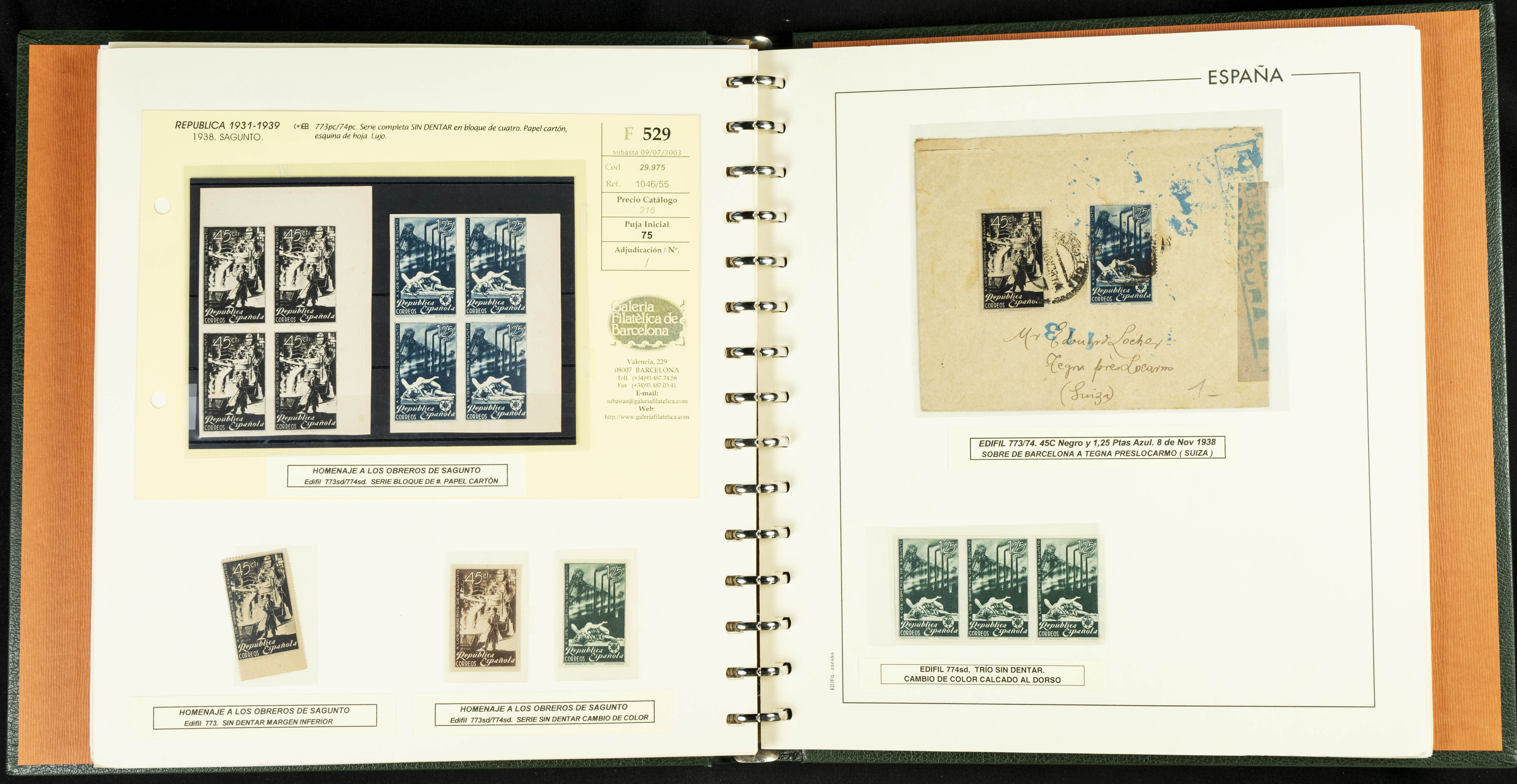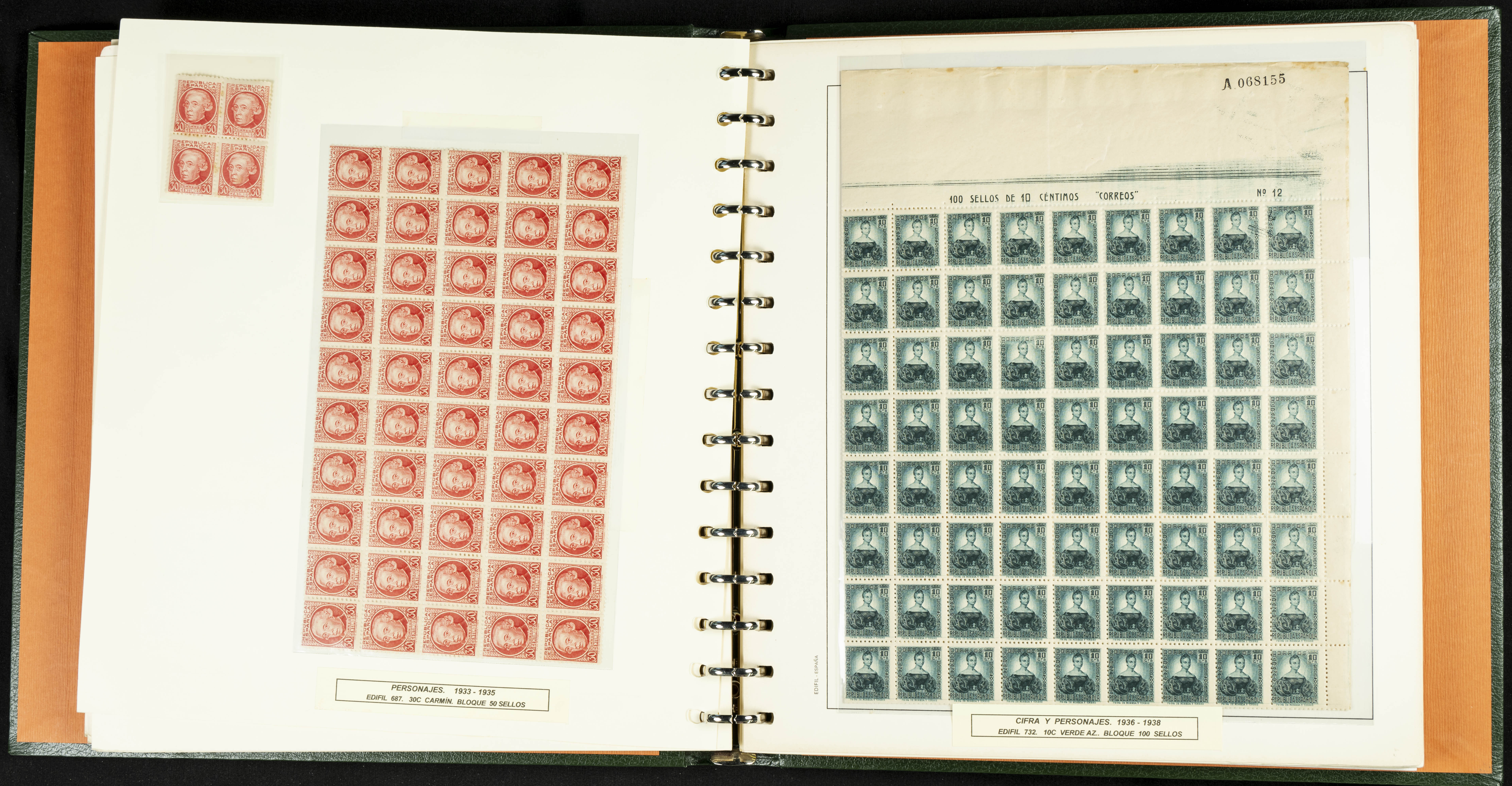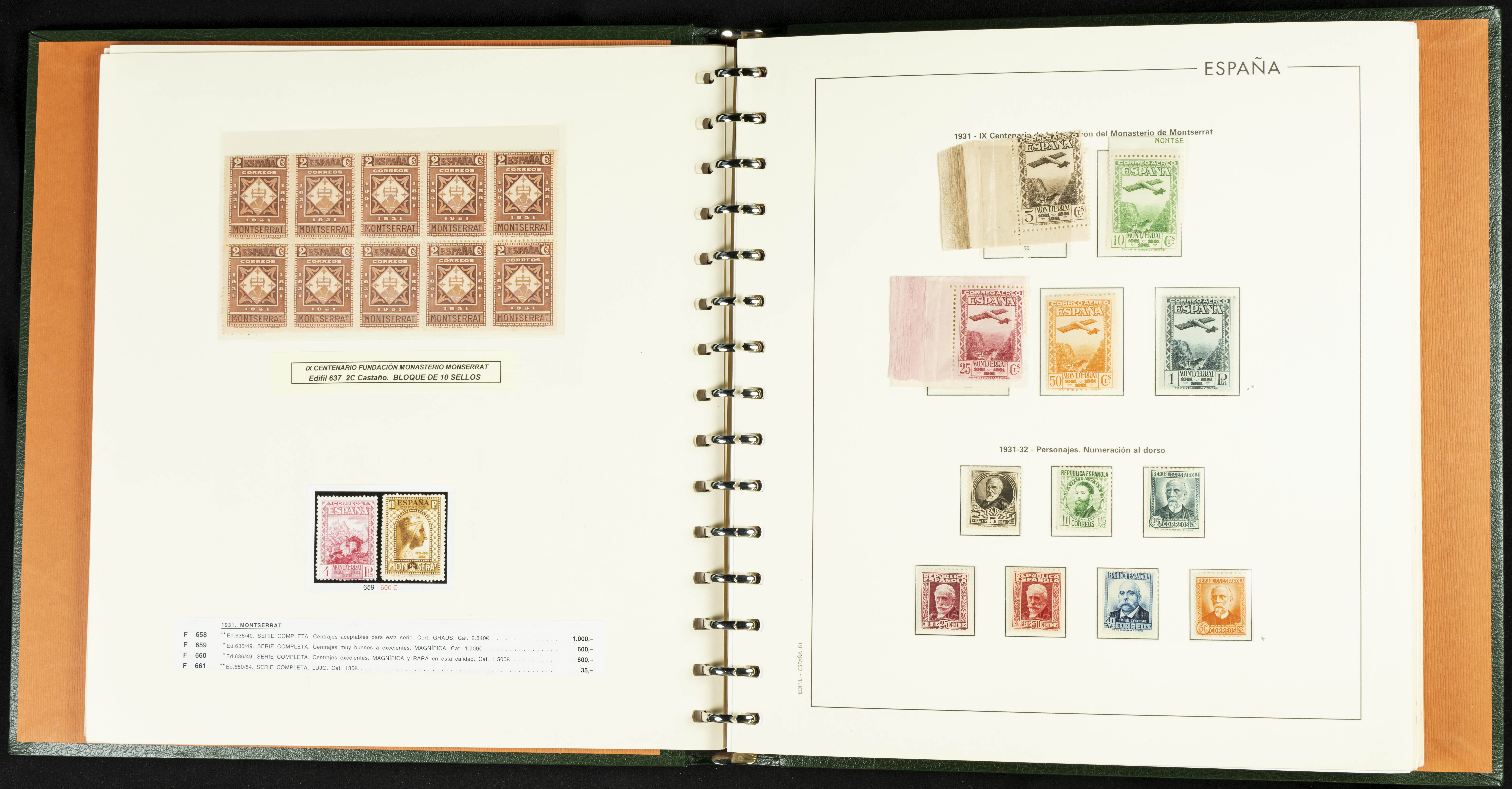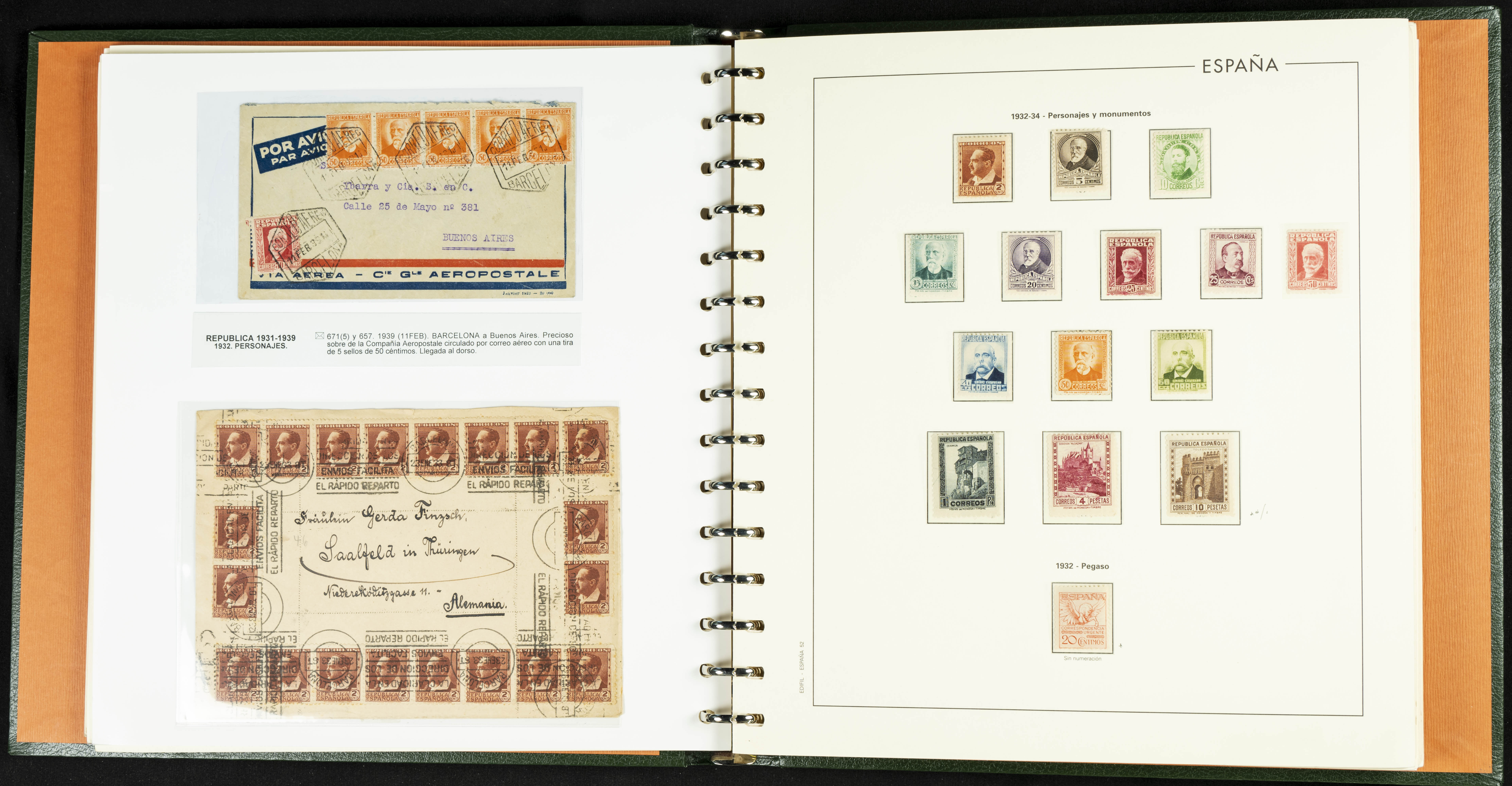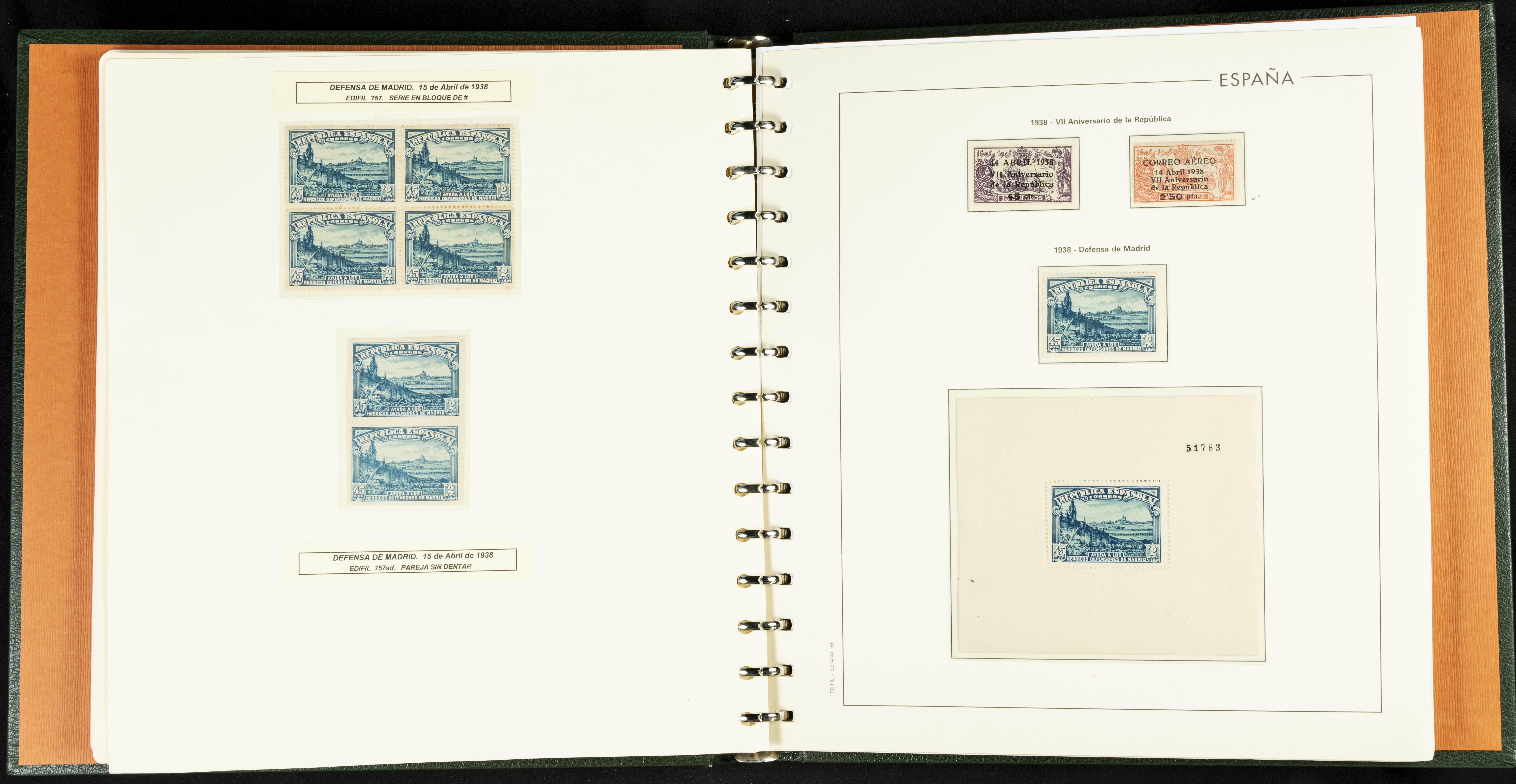 ★(1931ca). Interesante colección de República Española entre 1931 y 1939, en nuevo e incluyendo numerosos pliegos completos y grandes bloques, variedades sin dentar o dentado desplazado, cartas y algunos sellos no emitidos, destacando Montserrat, ExpoMadrid, hoja bloque Constitución USA Aéreo+5 pts, Submarino (aéreo y hoja bloque), Milicias, etc. ALTISIMO VALOR DE CATALOGO. IMPRESCINDIBLE EXAMINAR.