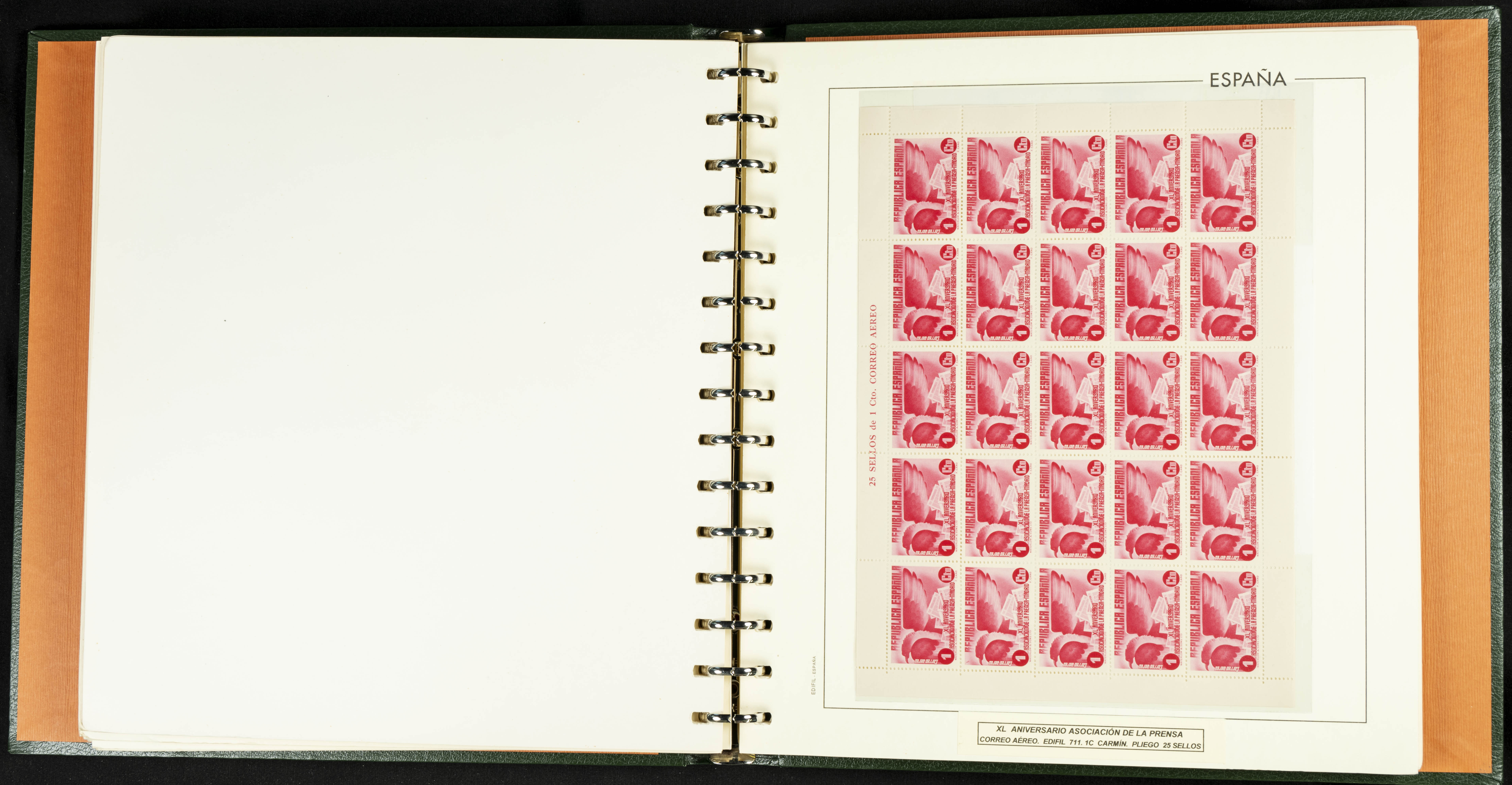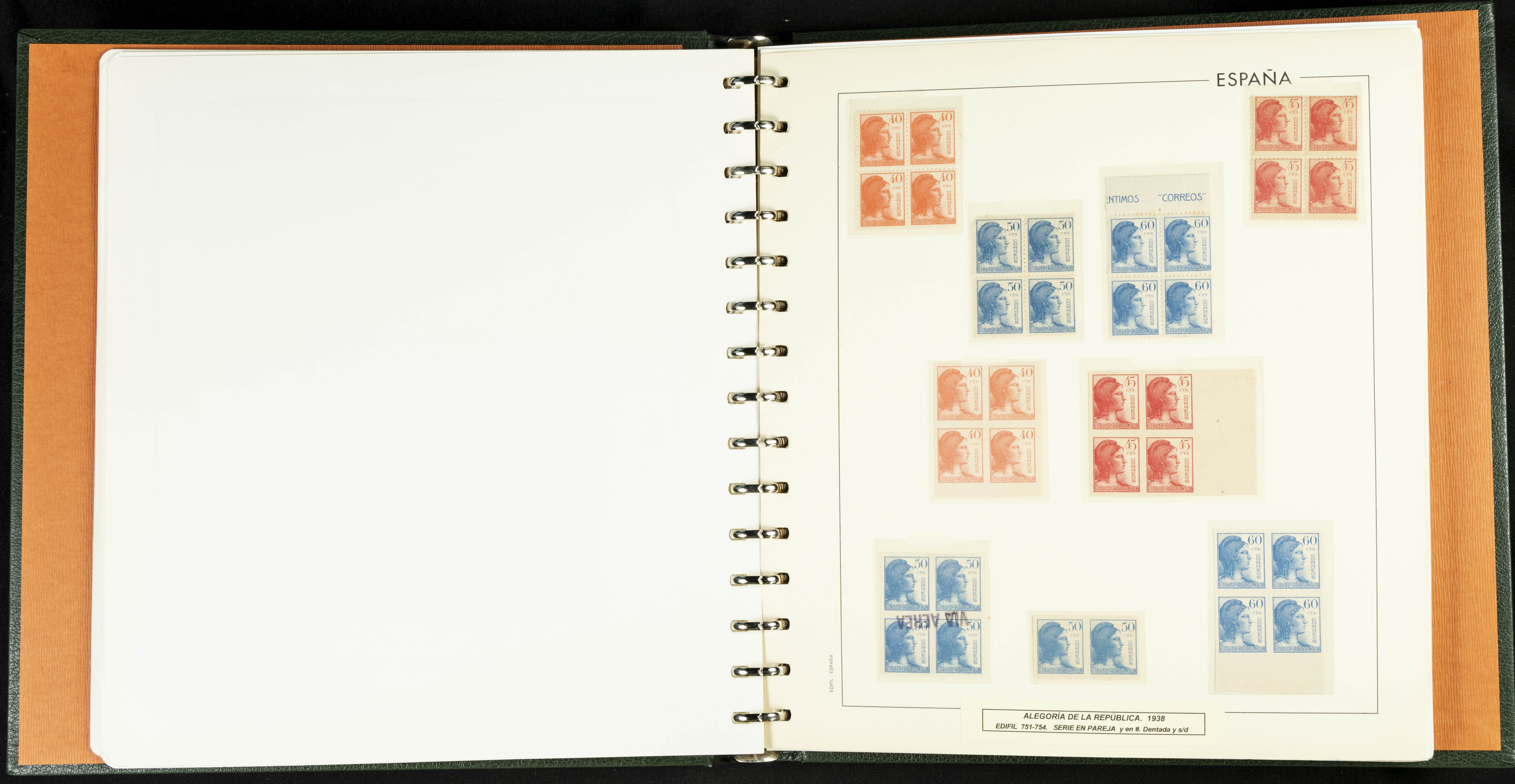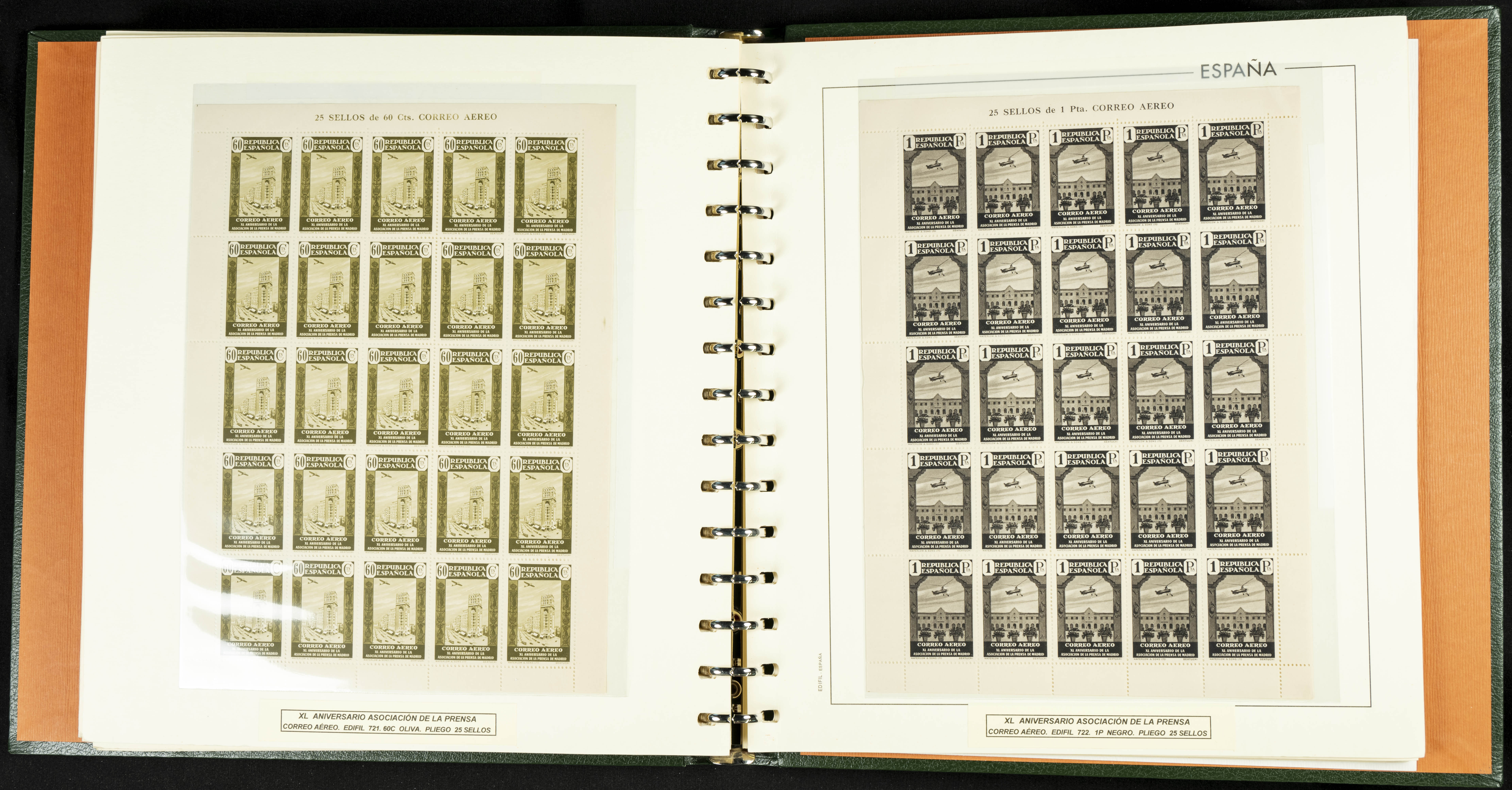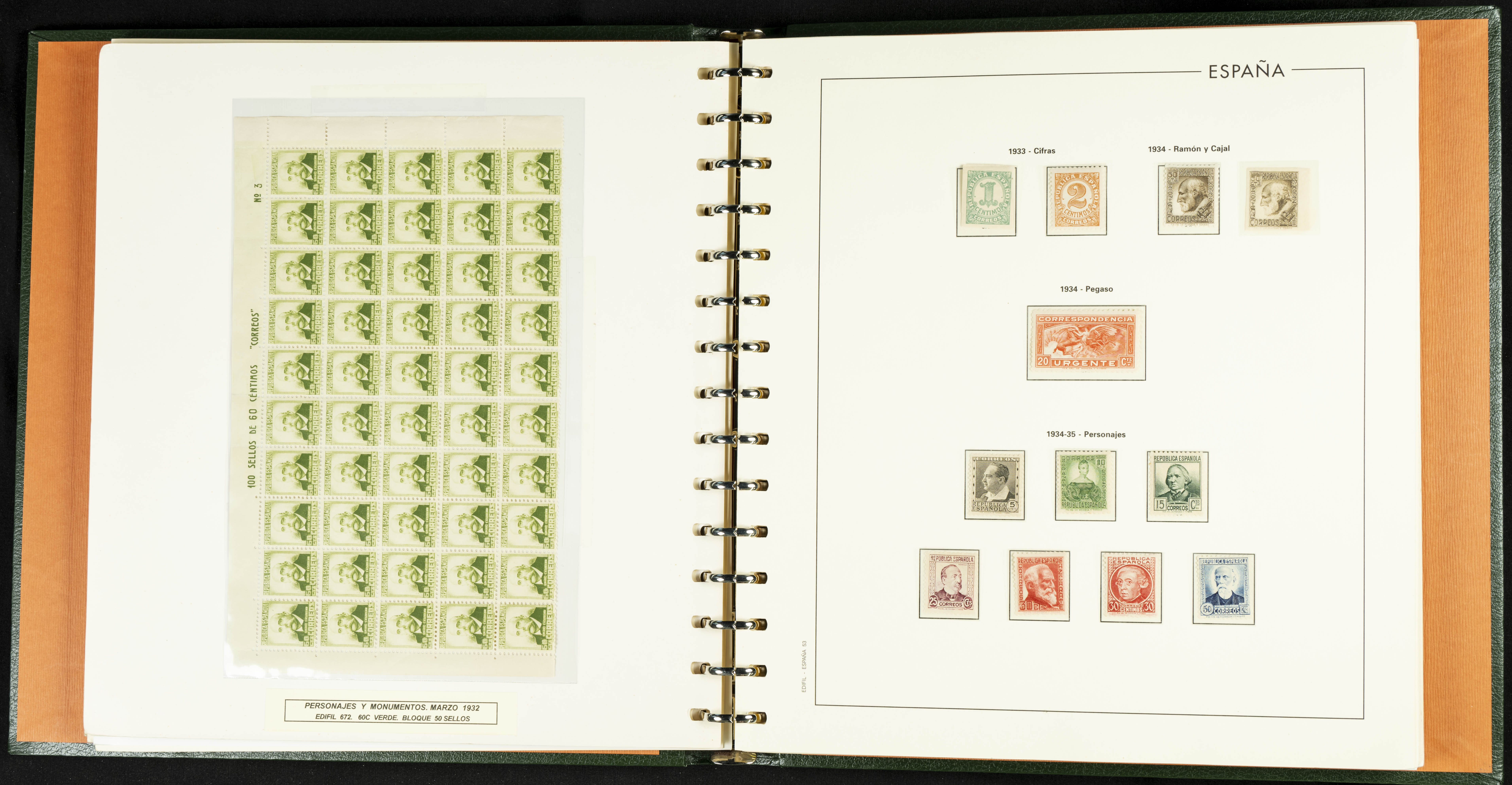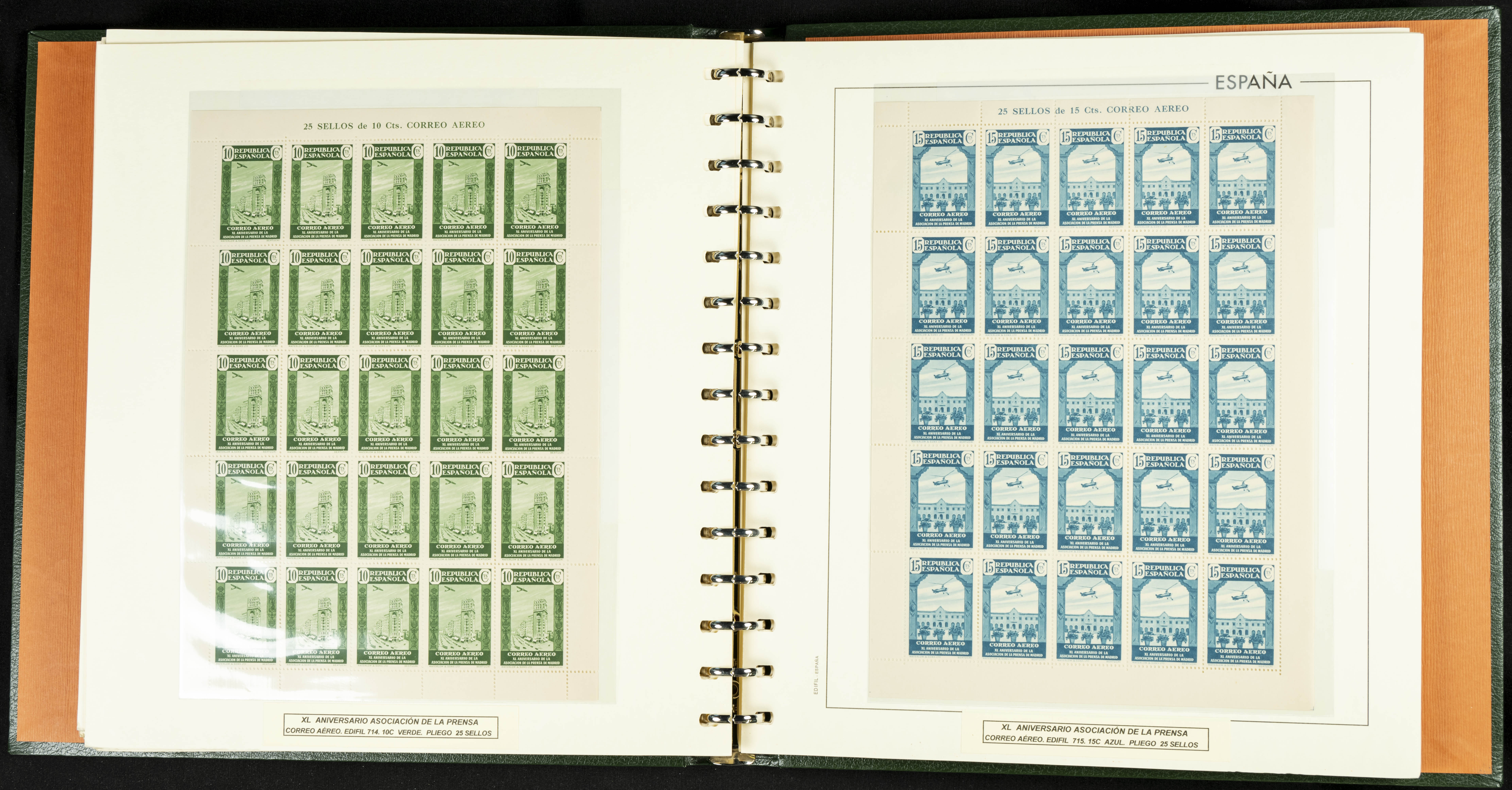 ★(1931ca). Interesante colección de República Española entre 1931 y 1939, en nuevo e incluyendo numerosos pliegos completos y grandes bloques, variedades sin dentar o dentado desplazado, cartas y algunos sellos no emitidos, destacando Montserrat, ExpoMadrid, hoja bloque Constitución USA Aéreo+5 pts, Submarino (aéreo y hoja bloque), Milicias, etc. ALTISIMO VALOR DE CATALOGO. IMPRESCINDIBLE EXAMINAR.