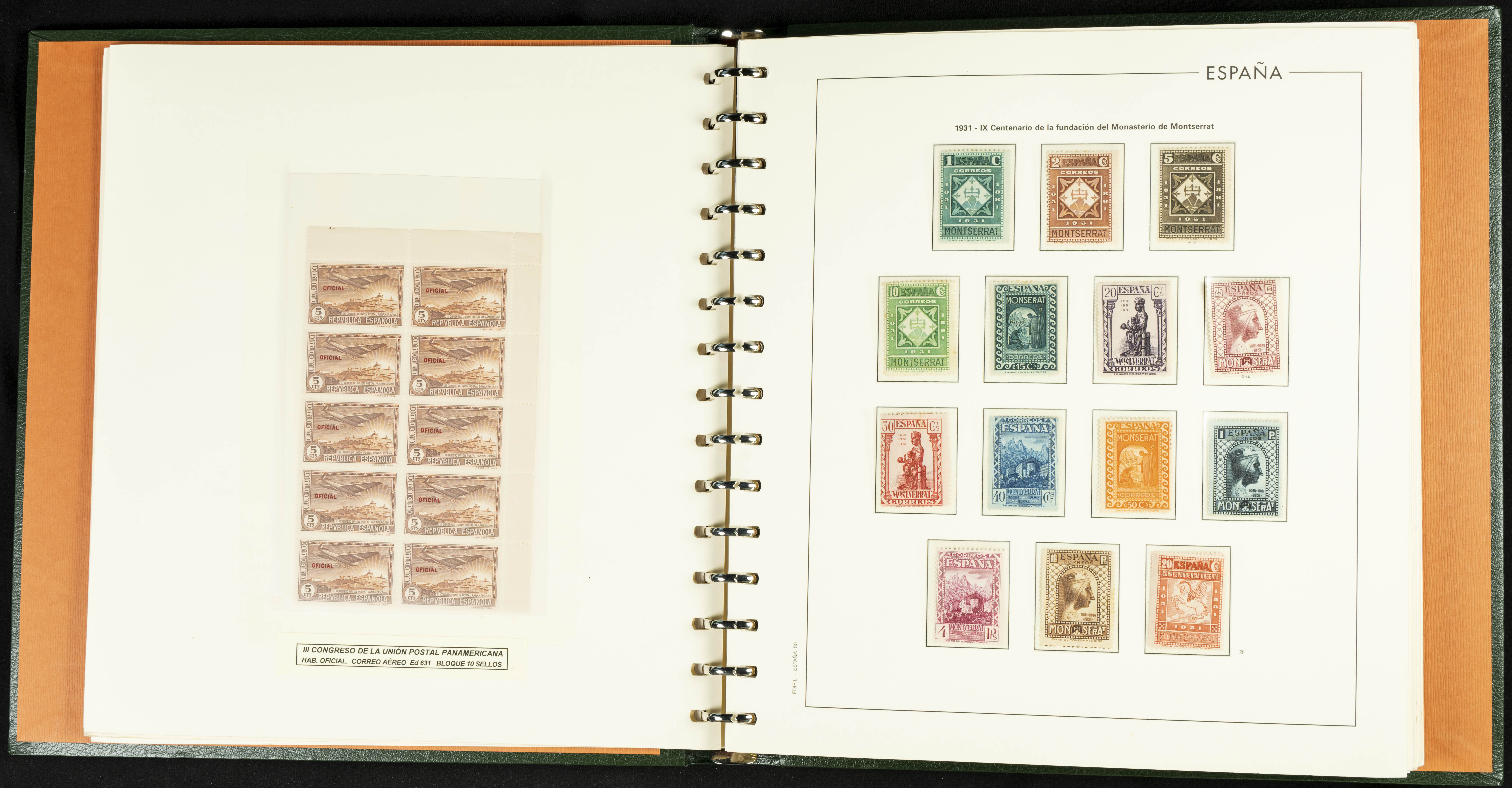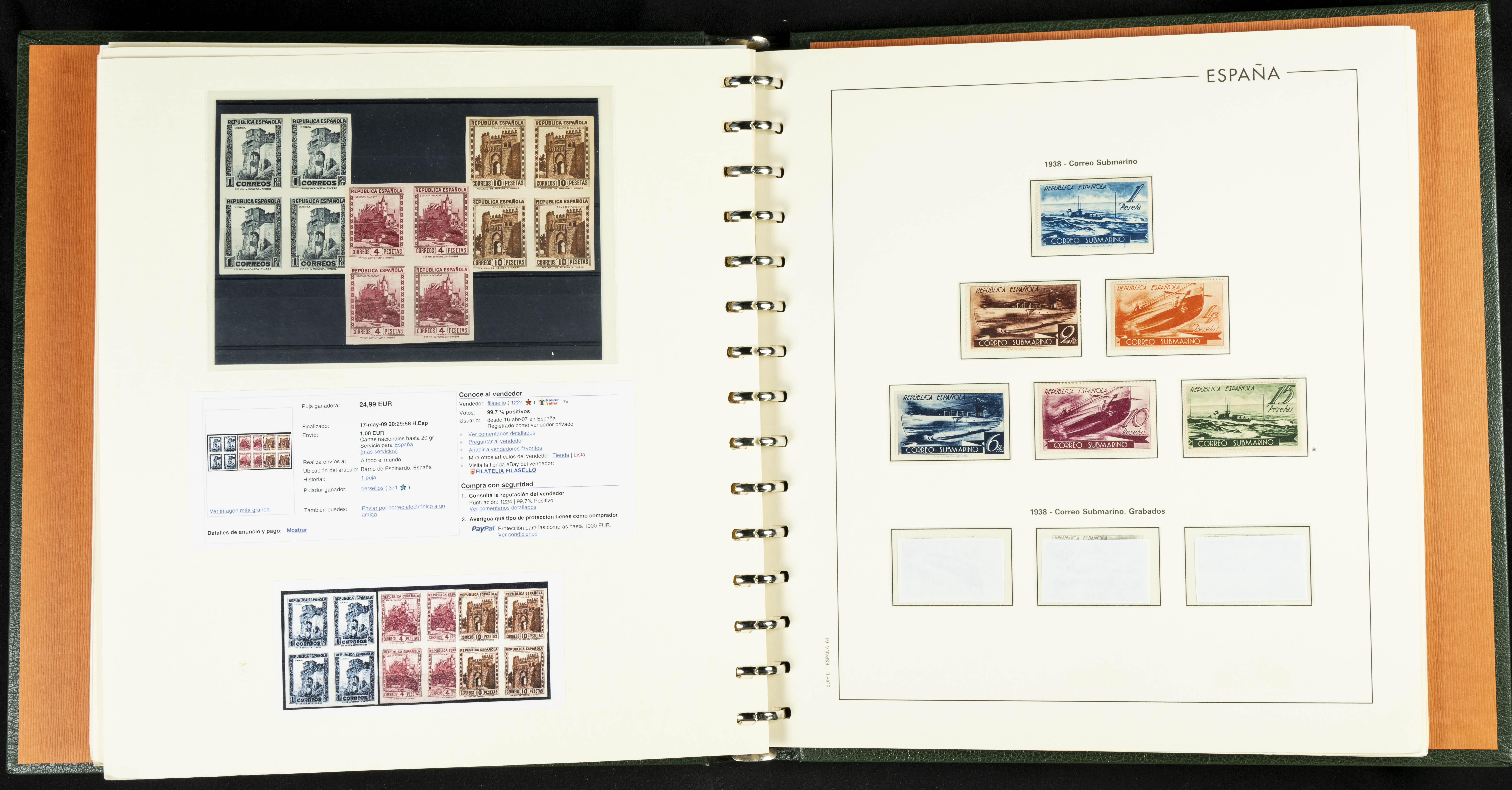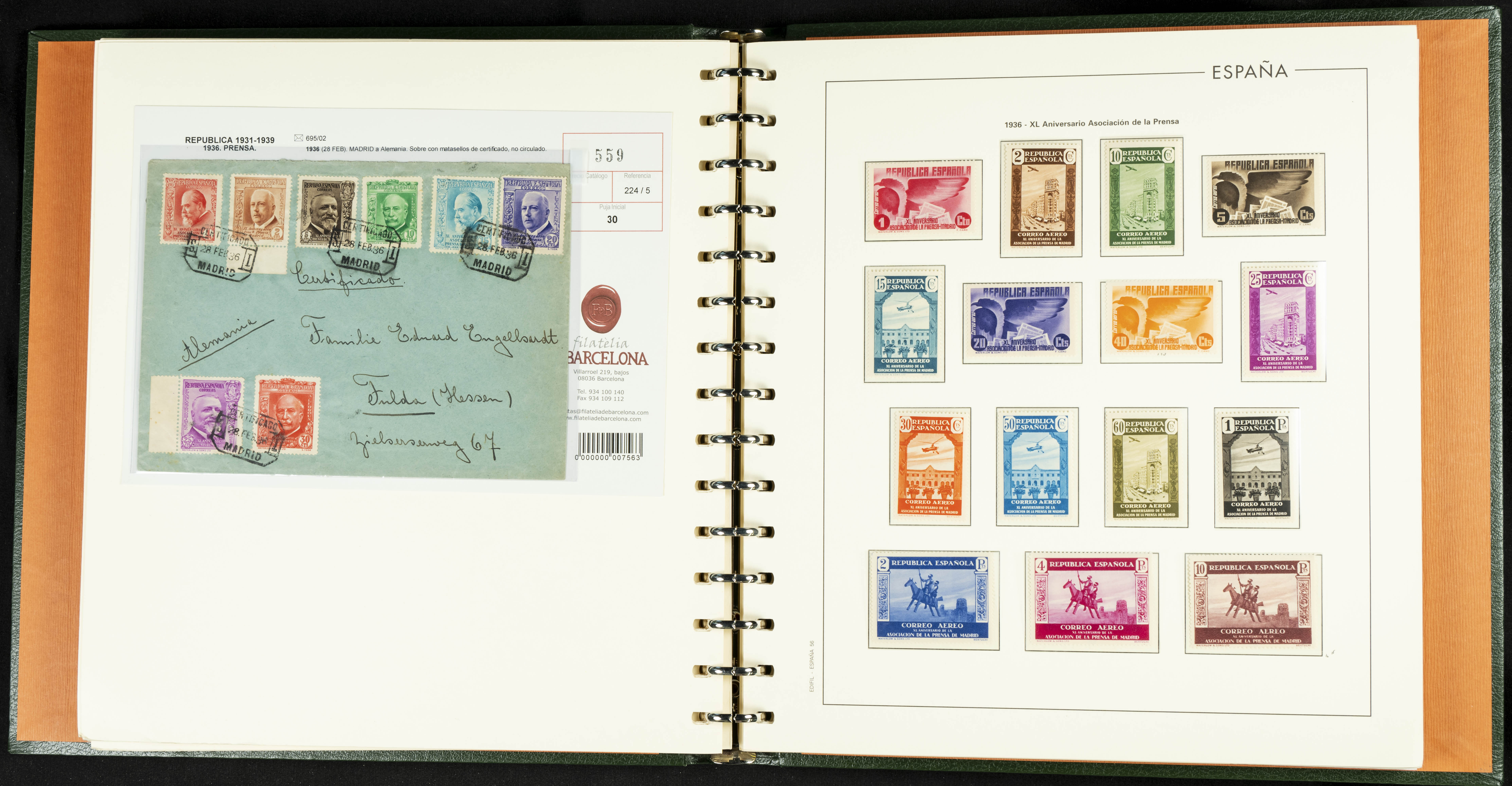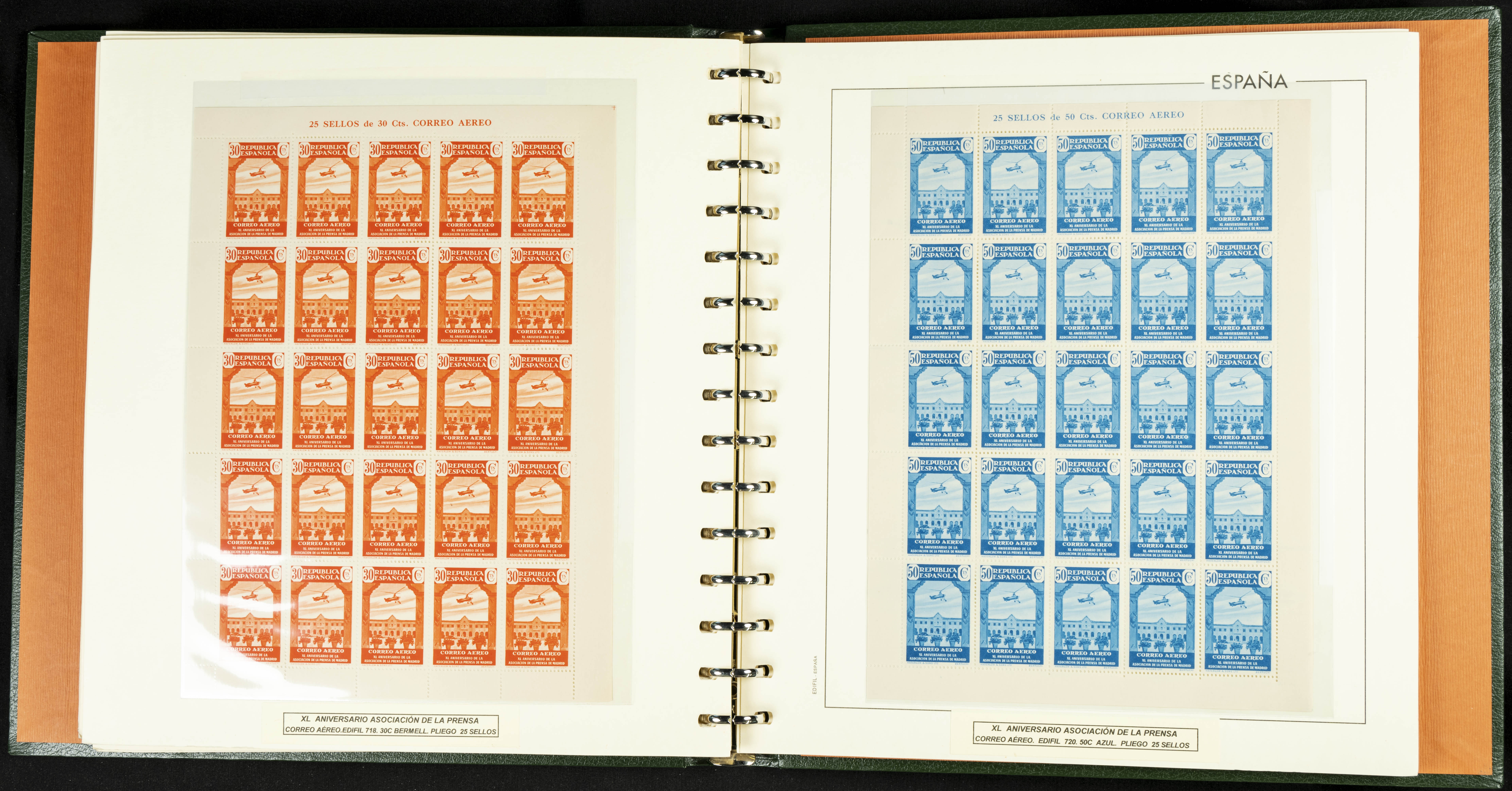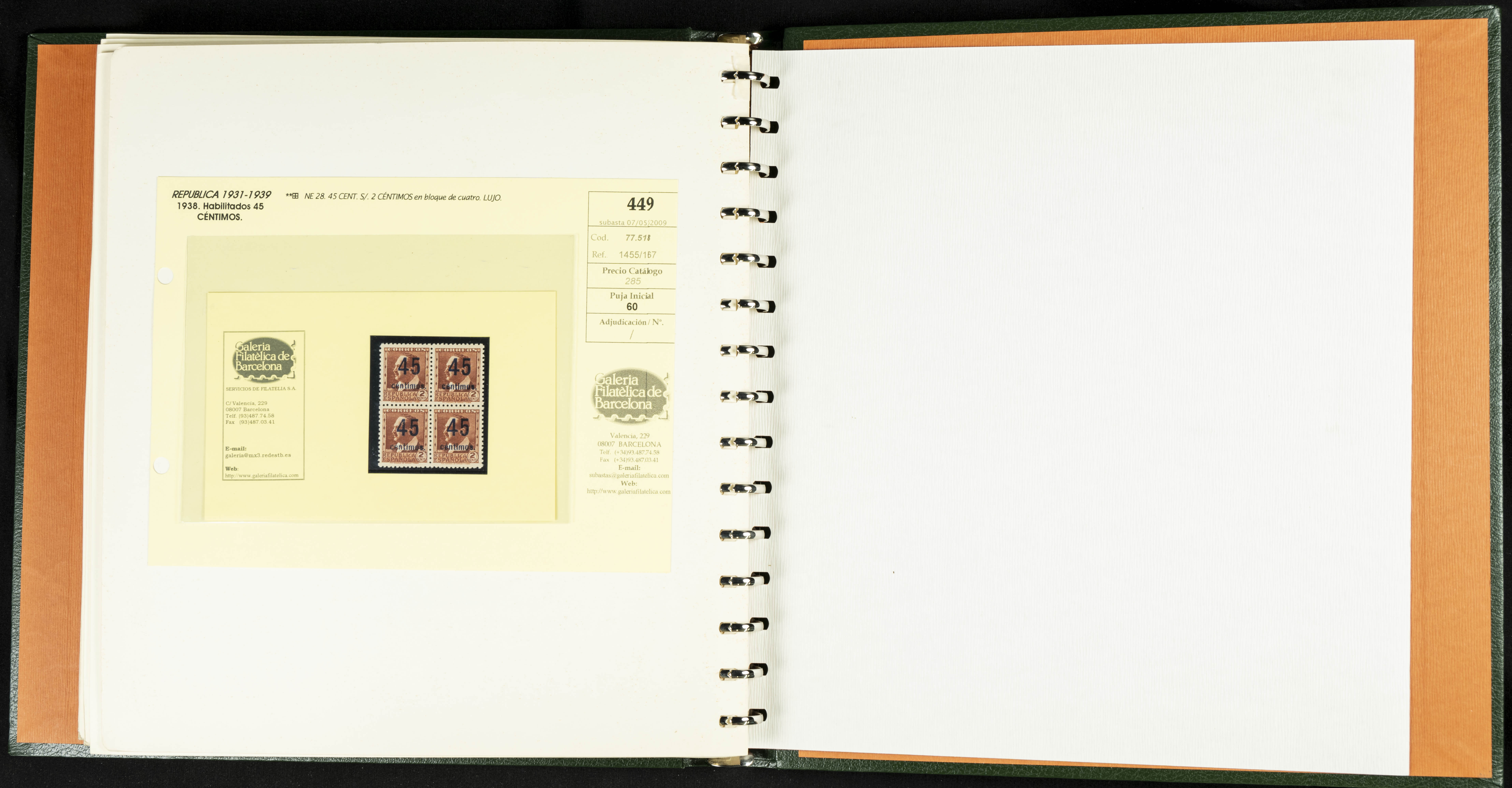 ★(1931ca). Interesante colección de República Española entre 1931 y 1939, en nuevo e incluyendo numerosos pliegos completos y grandes bloques, variedades sin dentar o dentado desplazado, cartas y algunos sellos no emitidos, destacando Montserrat, ExpoMadrid, hoja bloque Constitución USA Aéreo+5 pts, Submarino (aéreo y hoja bloque), Milicias, etc. ALTISIMO VALOR DE CATALOGO. IMPRESCINDIBLE EXAMINAR.