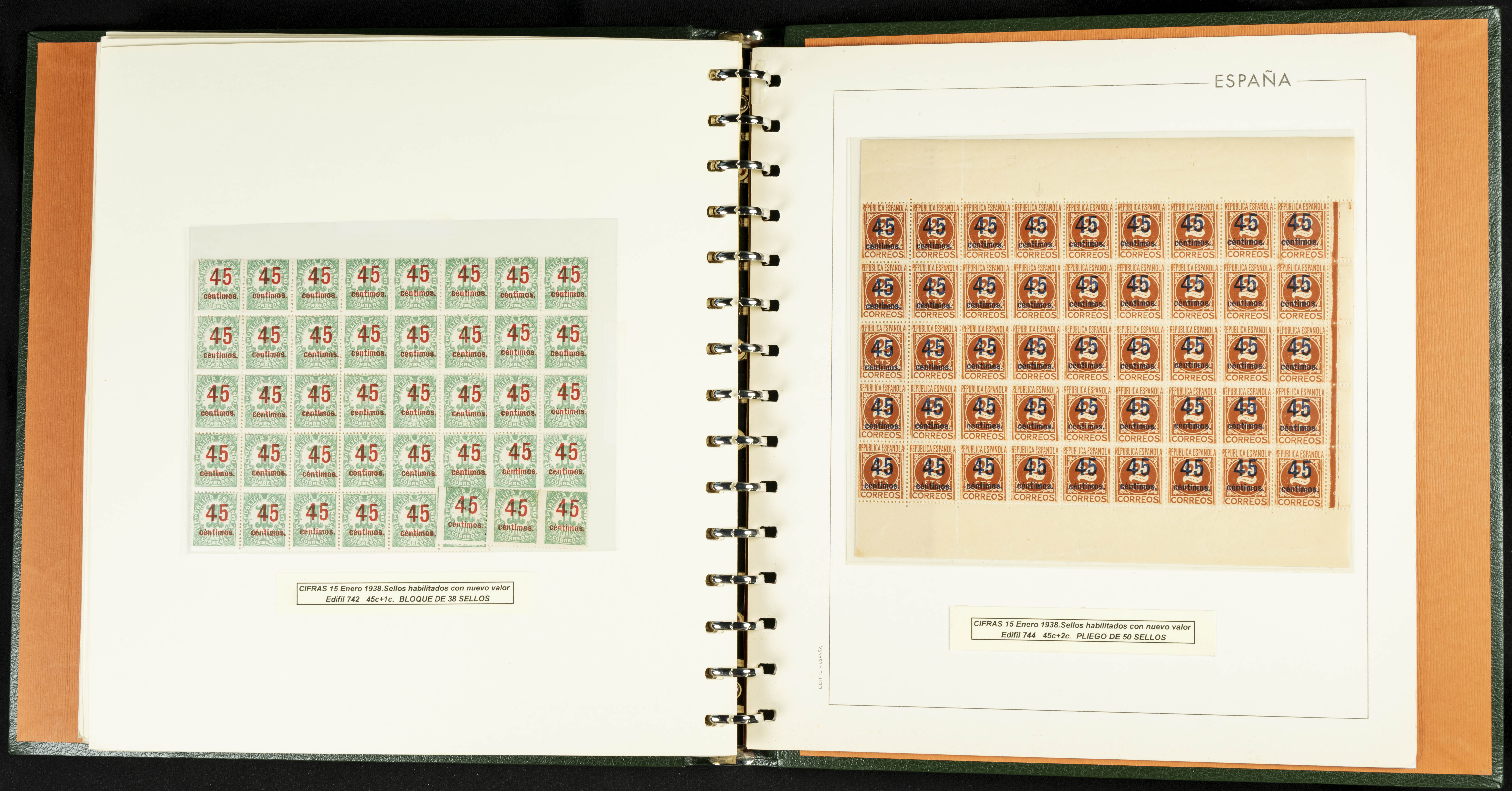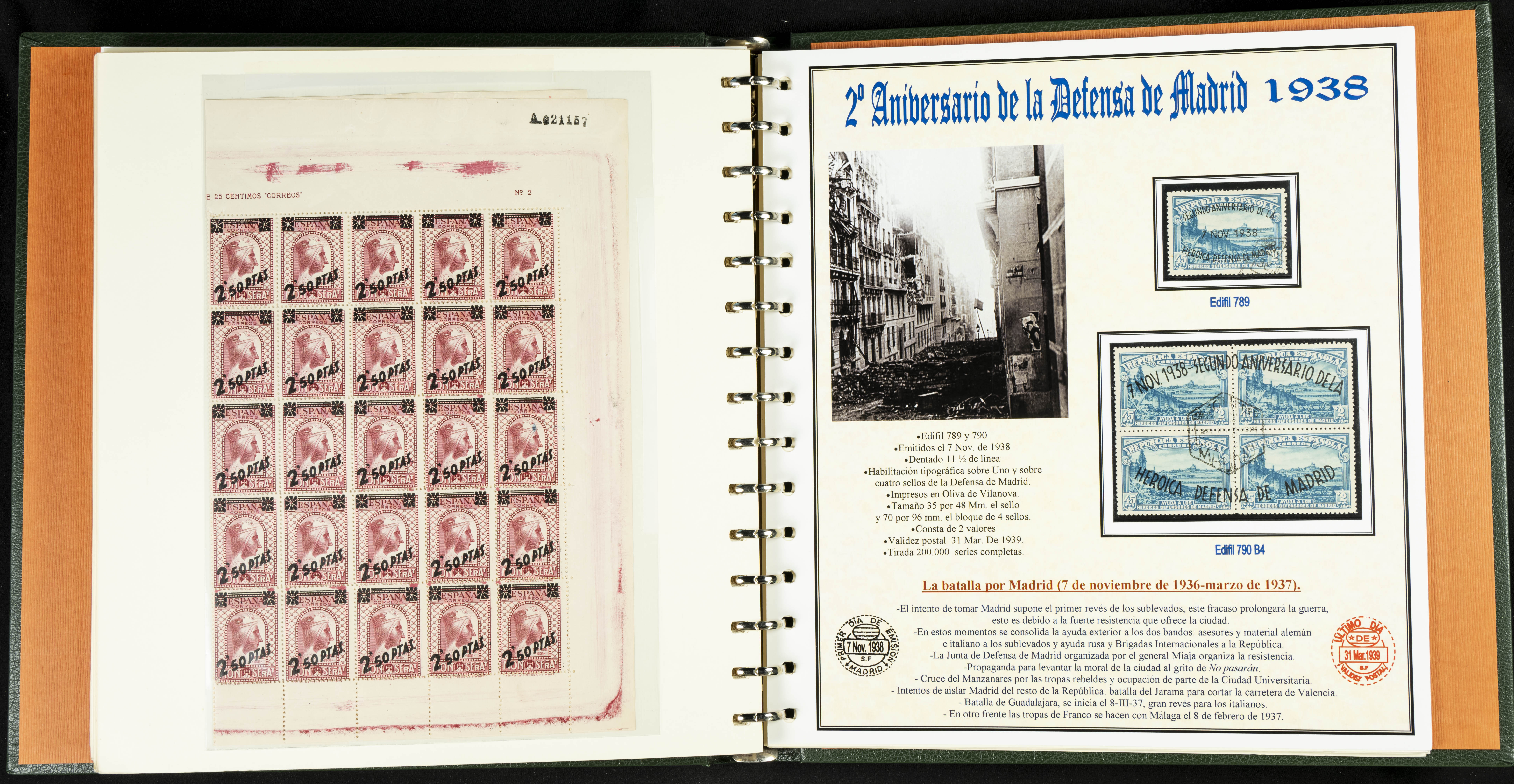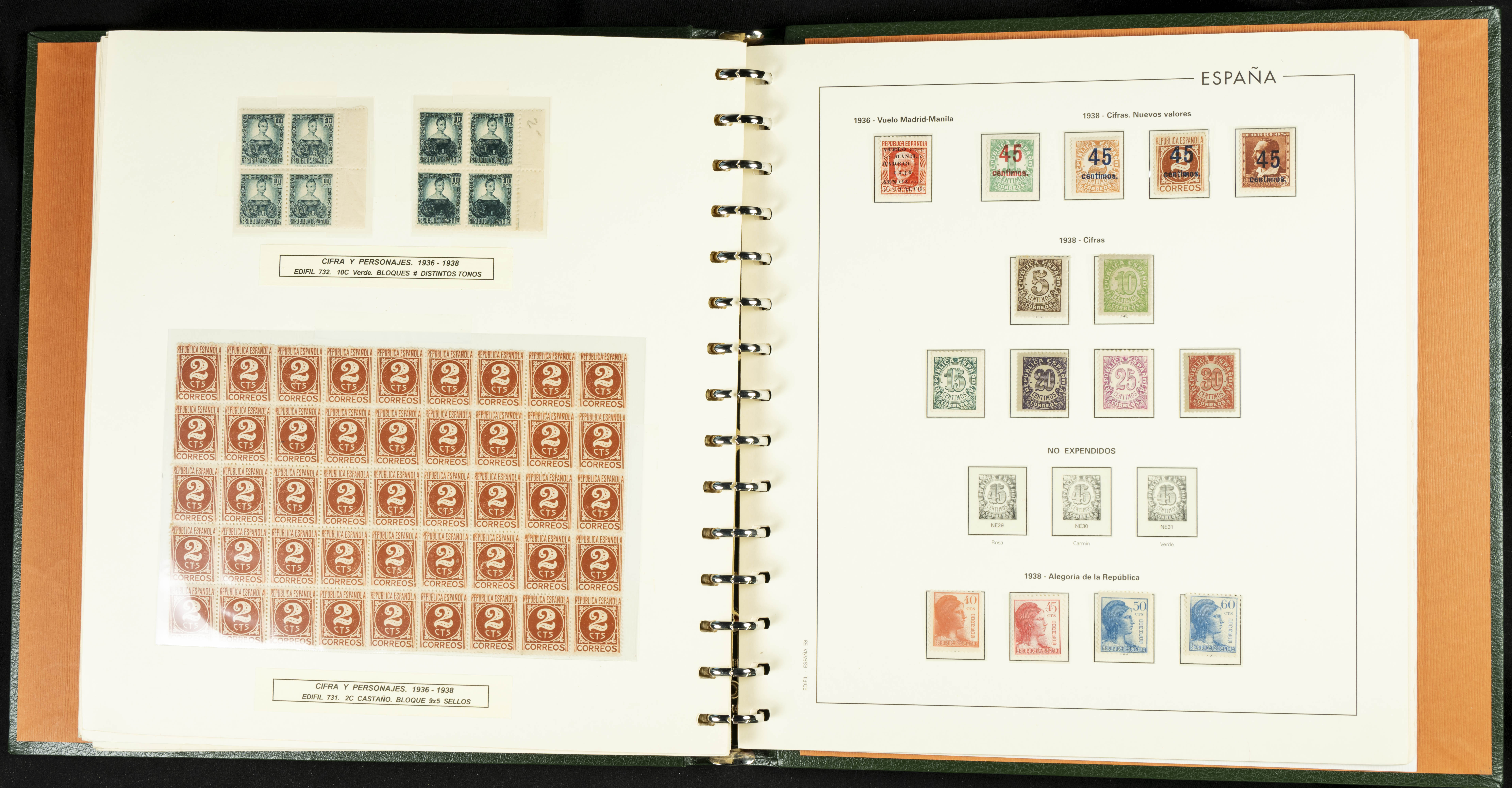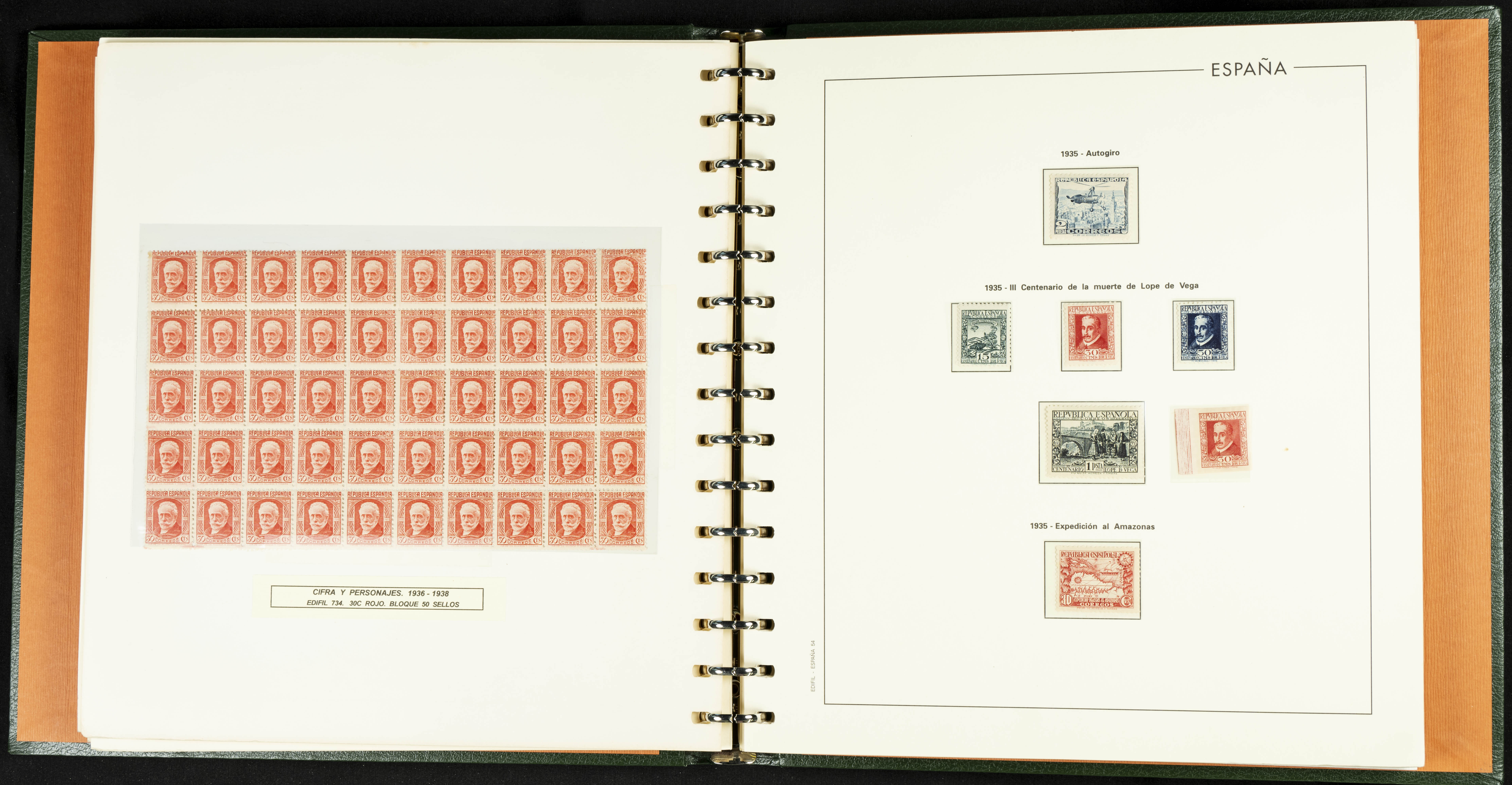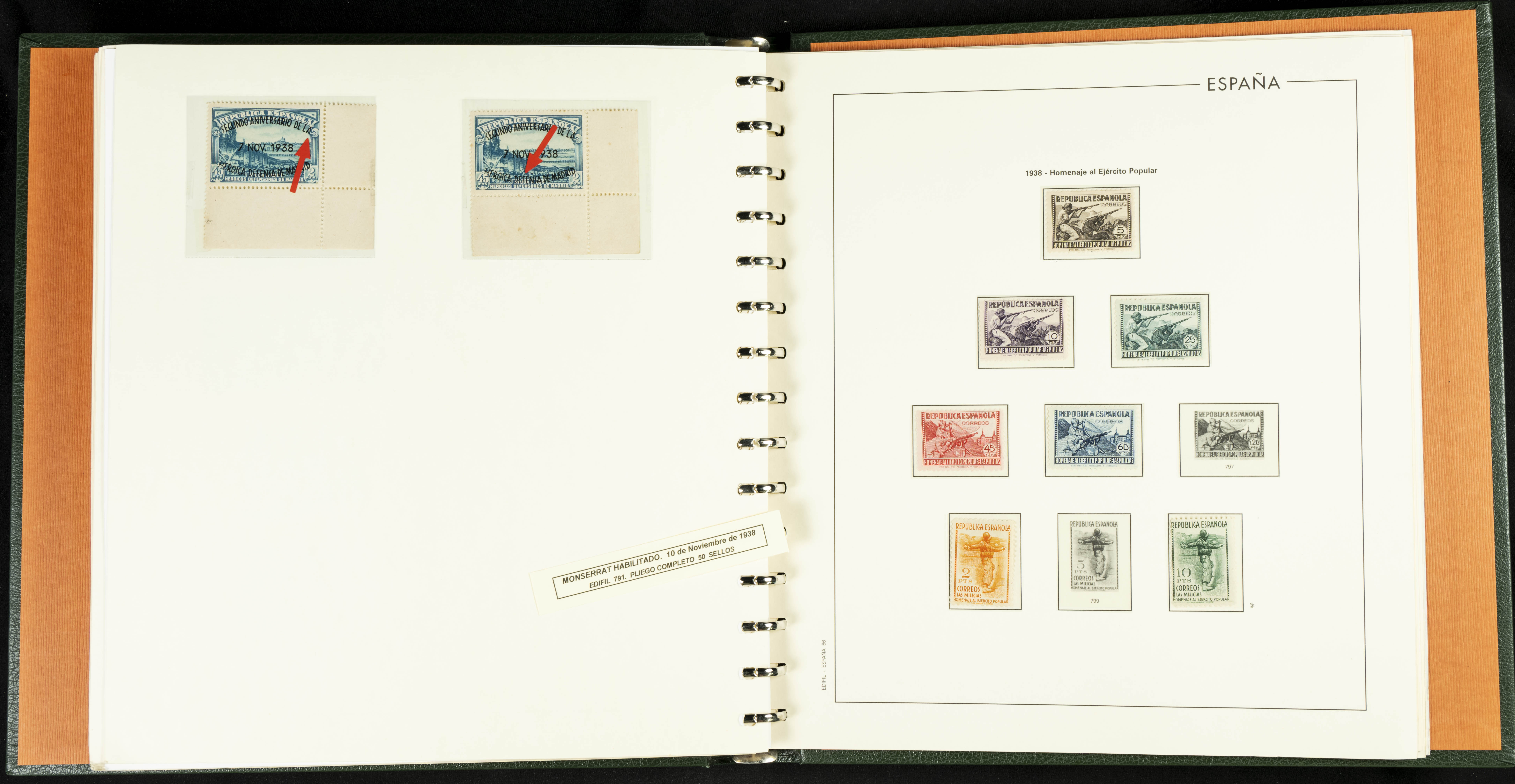 ★(1931ca). Interesante colección de República Española entre 1931 y 1939, en nuevo e incluyendo numerosos pliegos completos y grandes bloques, variedades sin dentar o dentado desplazado, cartas y algunos sellos no emitidos, destacando Montserrat, ExpoMadrid, hoja bloque Constitución USA Aéreo+5 pts, Submarino (aéreo y hoja bloque), Milicias, etc. ALTISIMO VALOR DE CATALOGO. IMPRESCINDIBLE EXAMINAR.