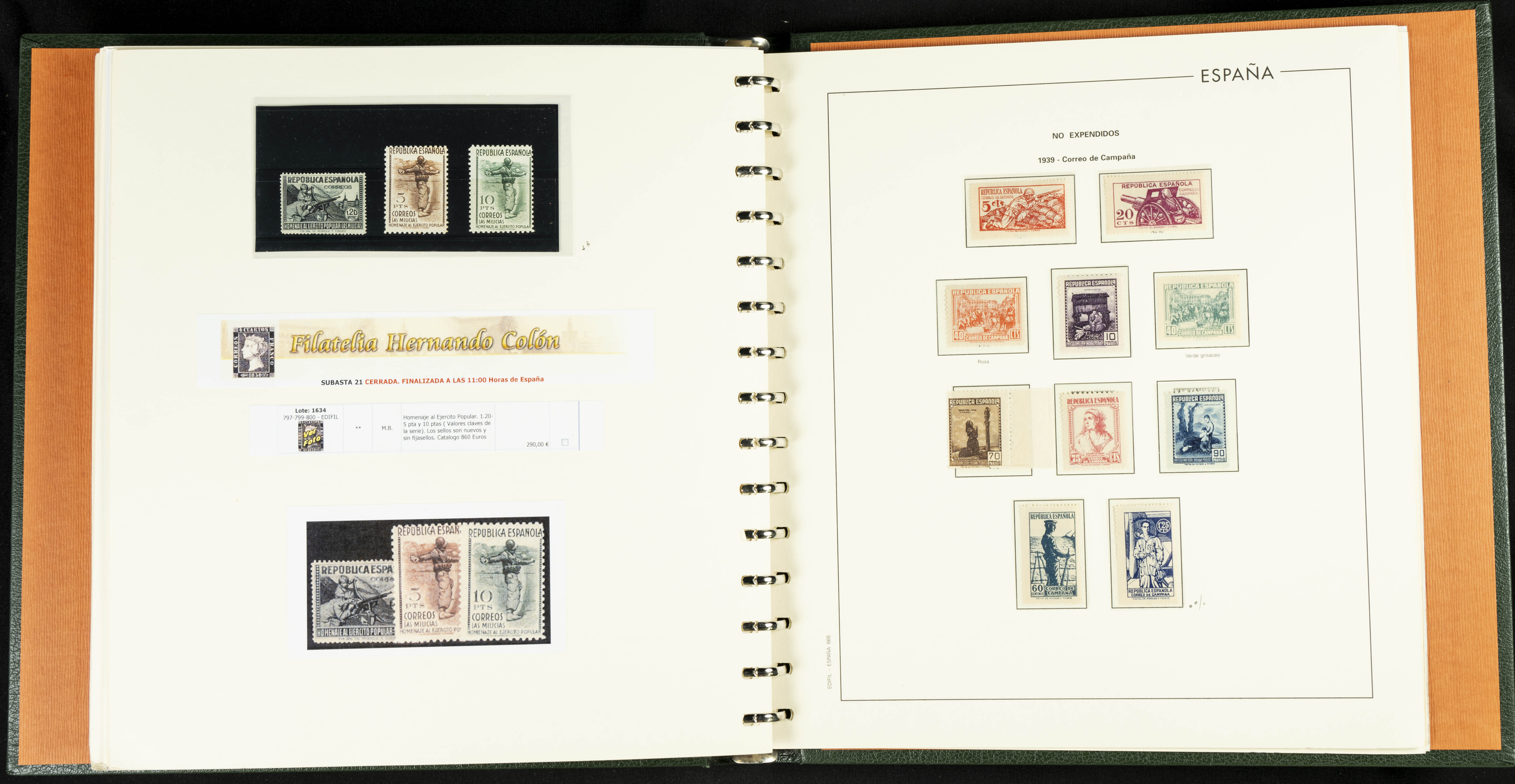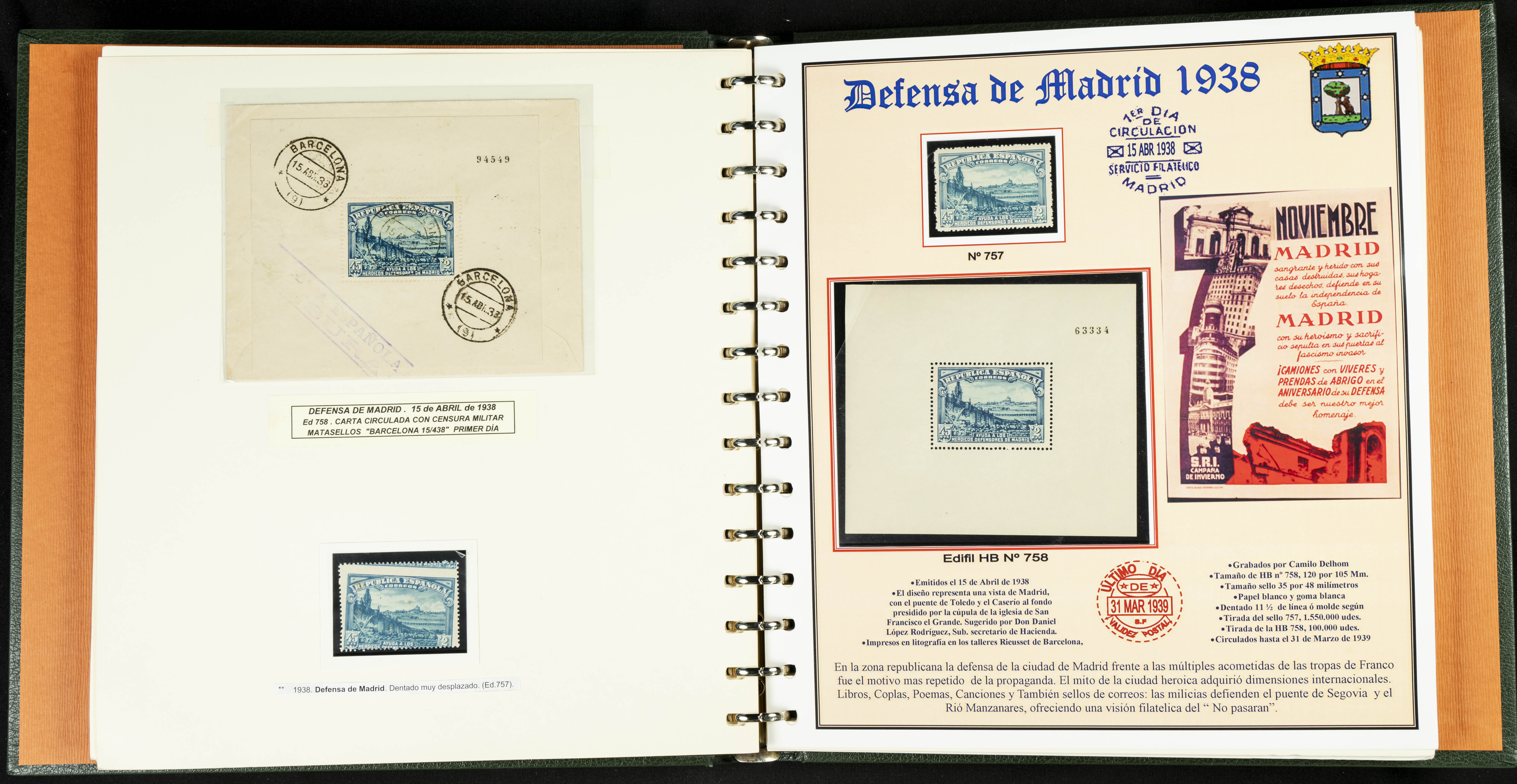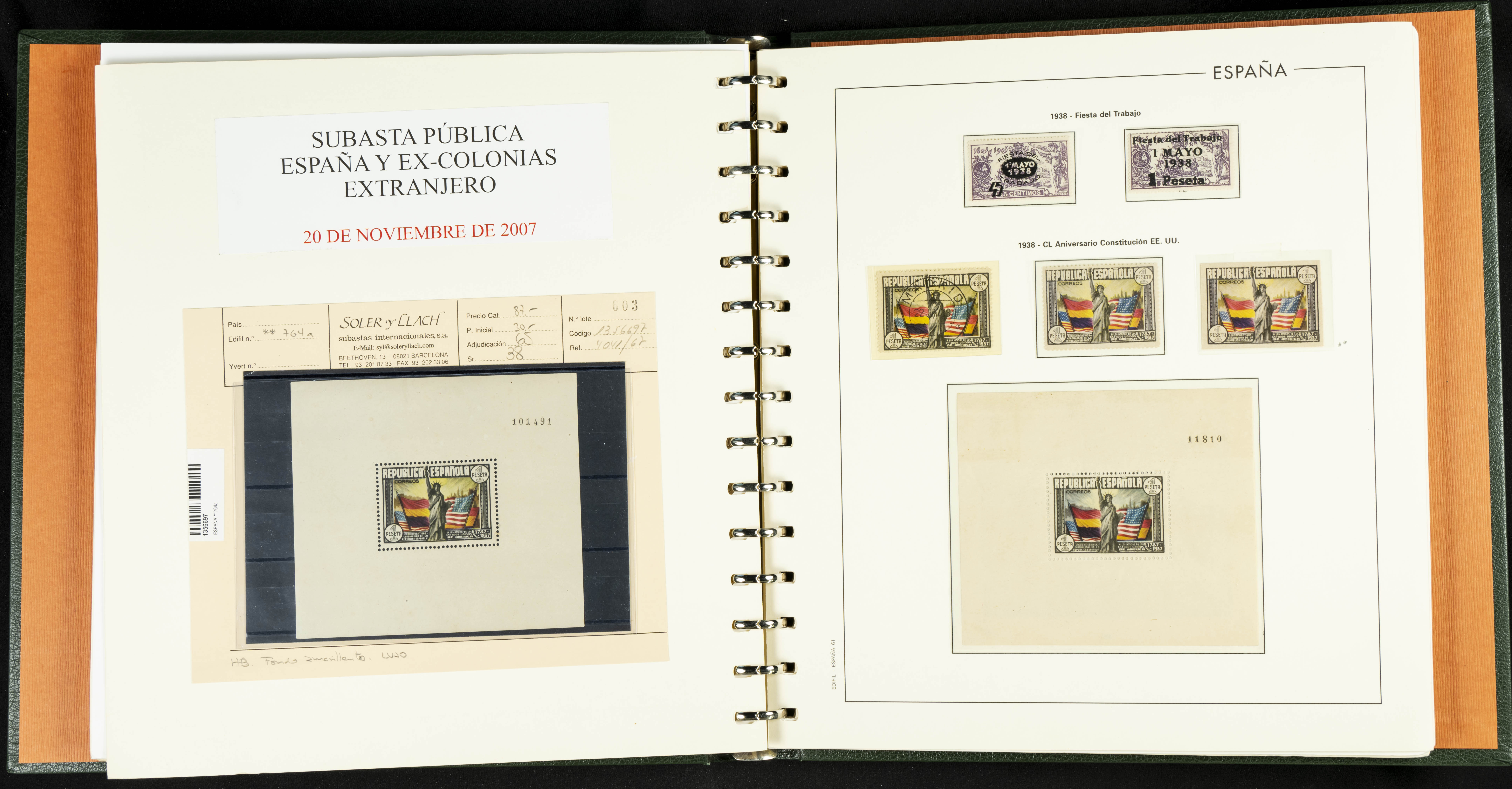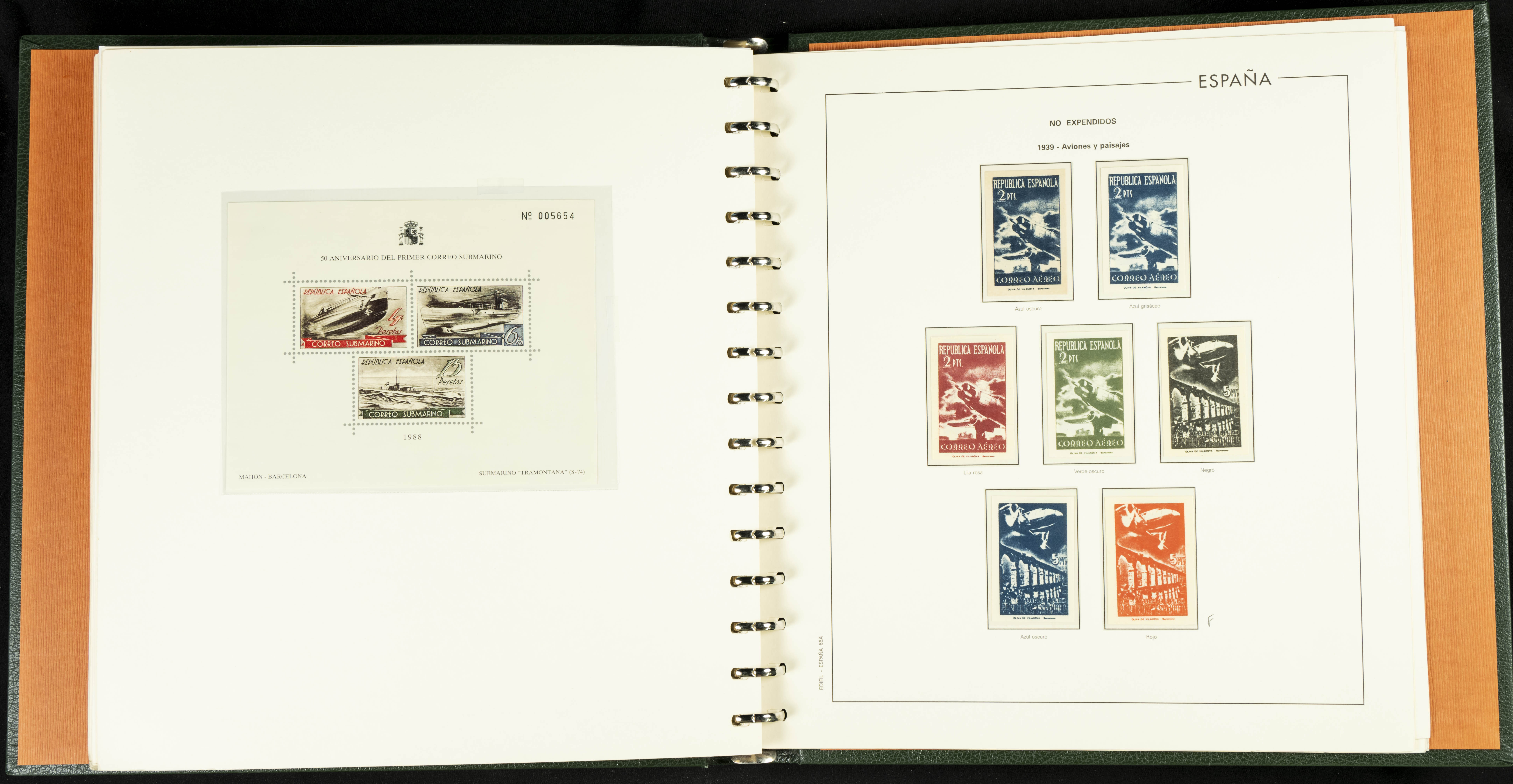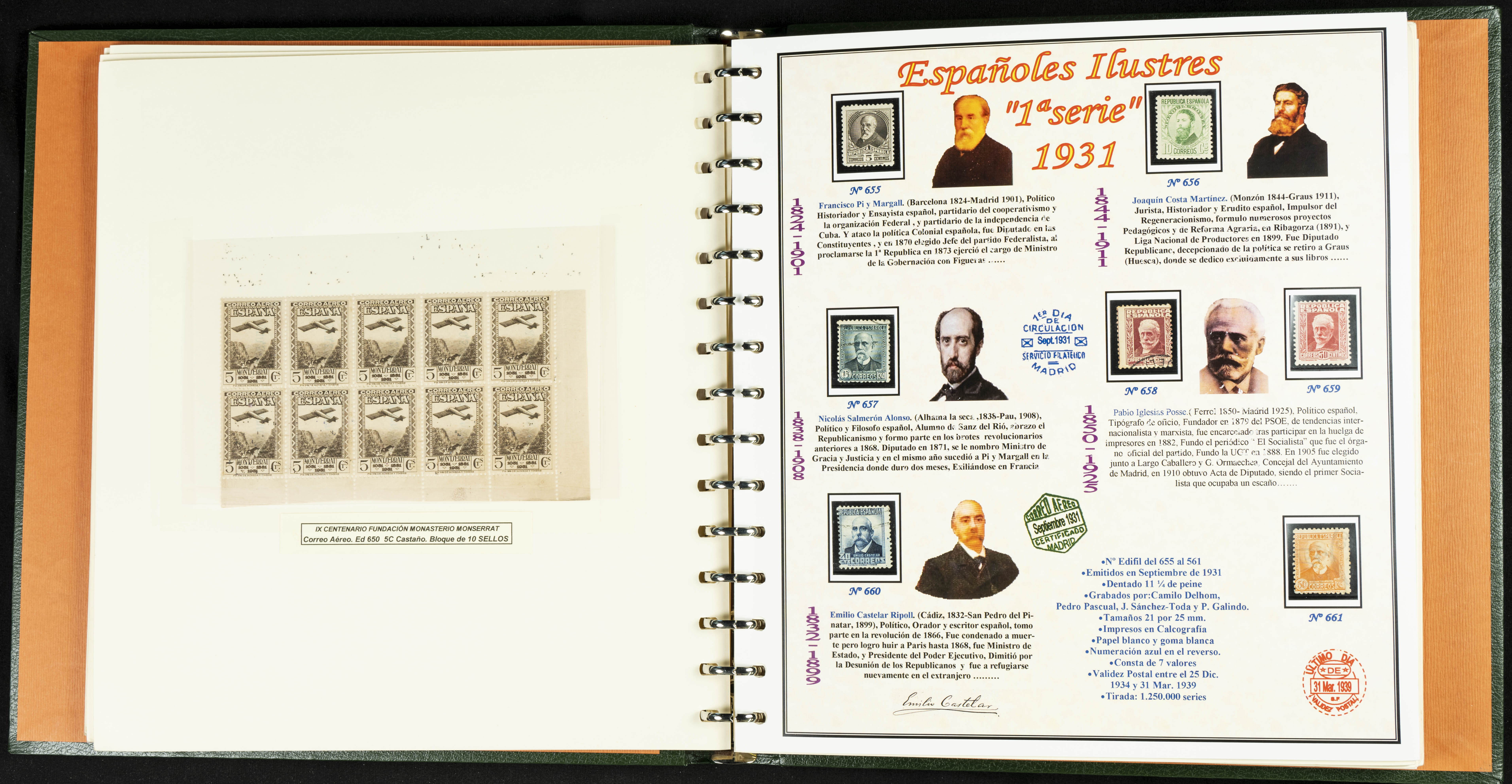 ★(1931ca). Interesante colección de República Española entre 1931 y 1939, en nuevo e incluyendo numerosos pliegos completos y grandes bloques, variedades sin dentar o dentado desplazado, cartas y algunos sellos no emitidos, destacando Montserrat, ExpoMadrid, hoja bloque Constitución USA Aéreo+5 pts, Submarino (aéreo y hoja bloque), Milicias, etc. ALTISIMO VALOR DE CATALOGO. IMPRESCINDIBLE EXAMINAR.