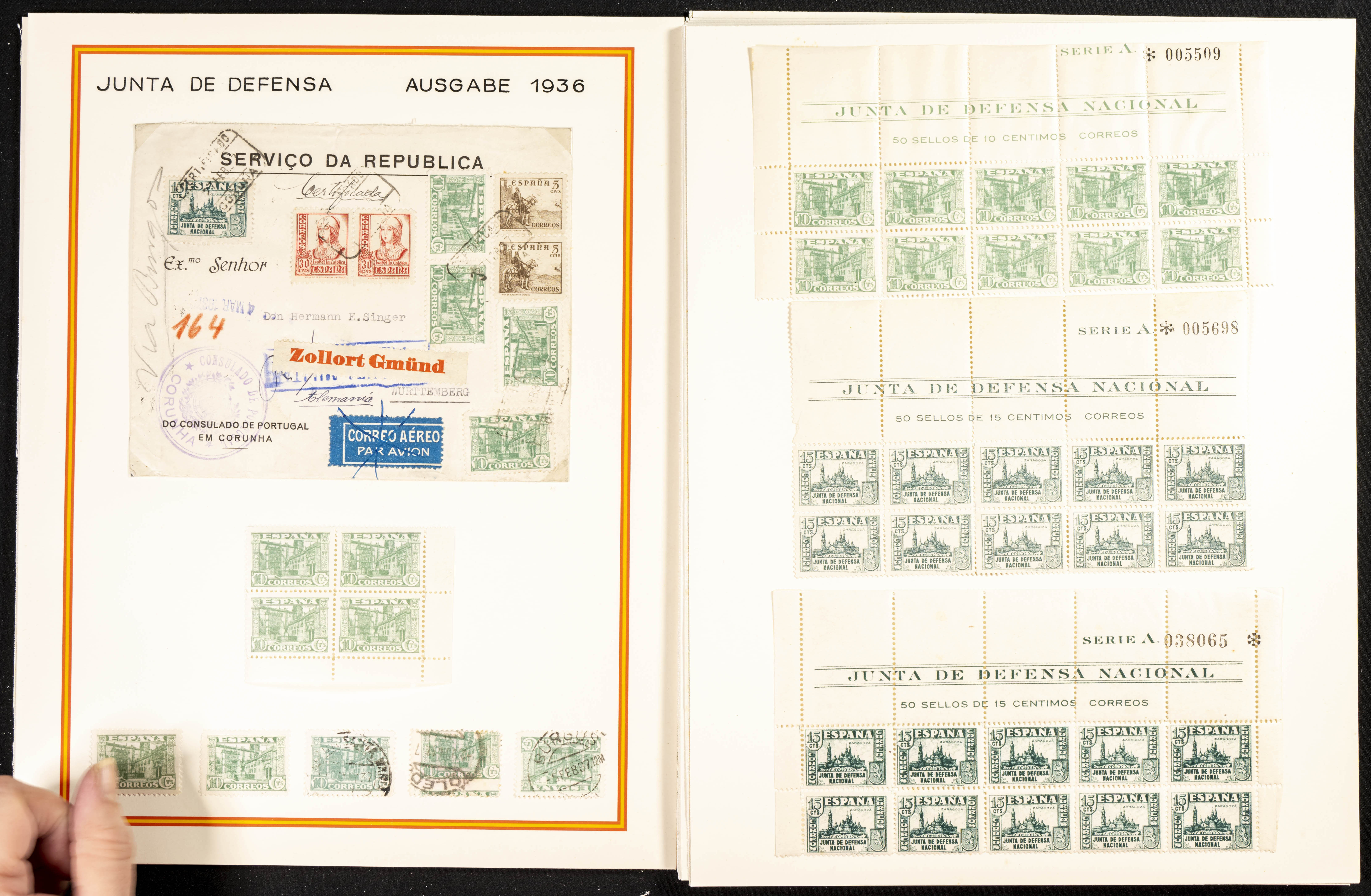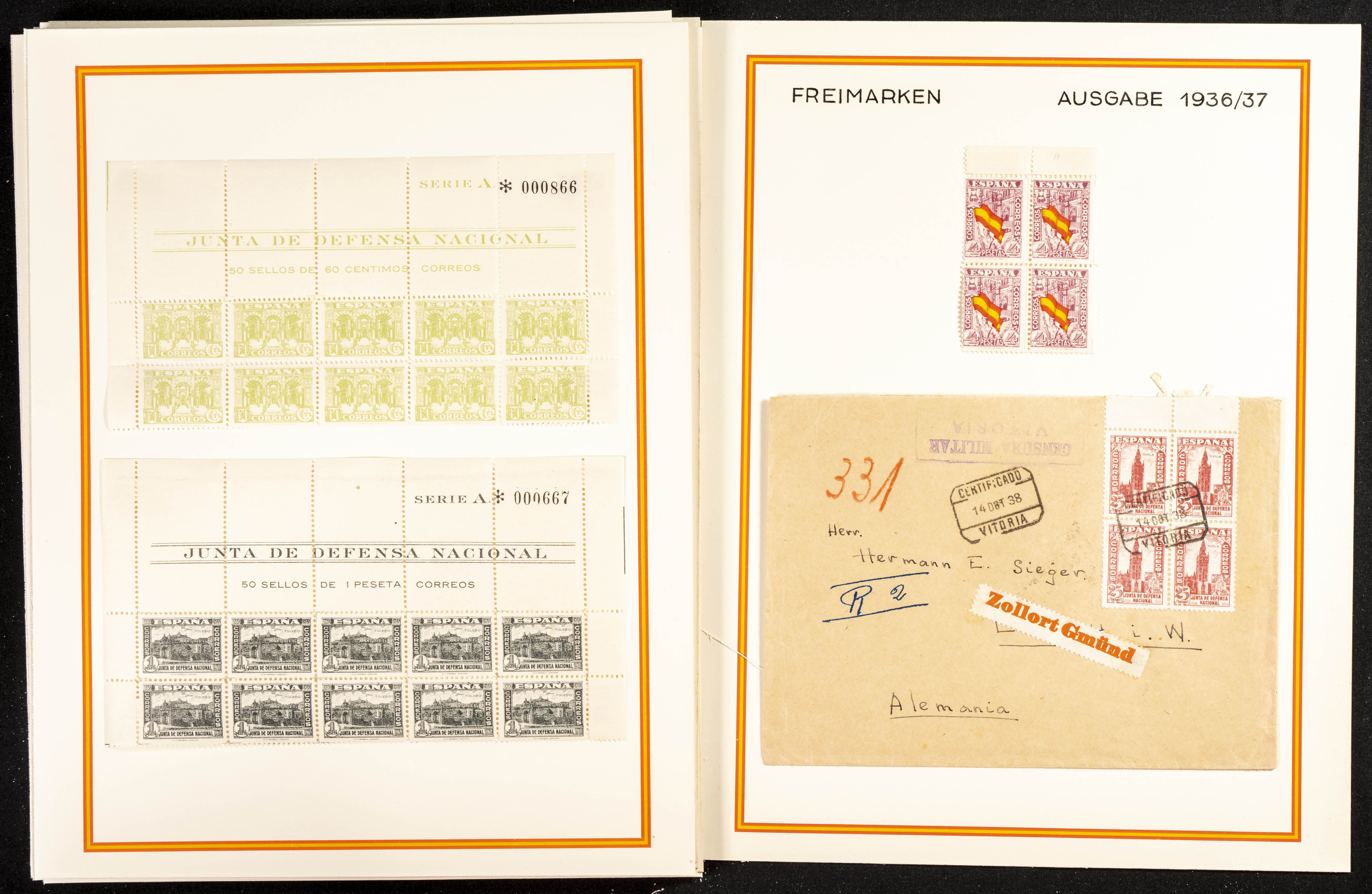 ★★/★1937. Interesante conjunto de la emisión de Junta de Defensa en nuevo (algún sello usado) con bloques de diferentes tamaños, algunos cabecera de pliego, cartas circuladas y variedades, incluye un bloque de cuatro del valor de 4 pts nuevo. A EXAMINAR.