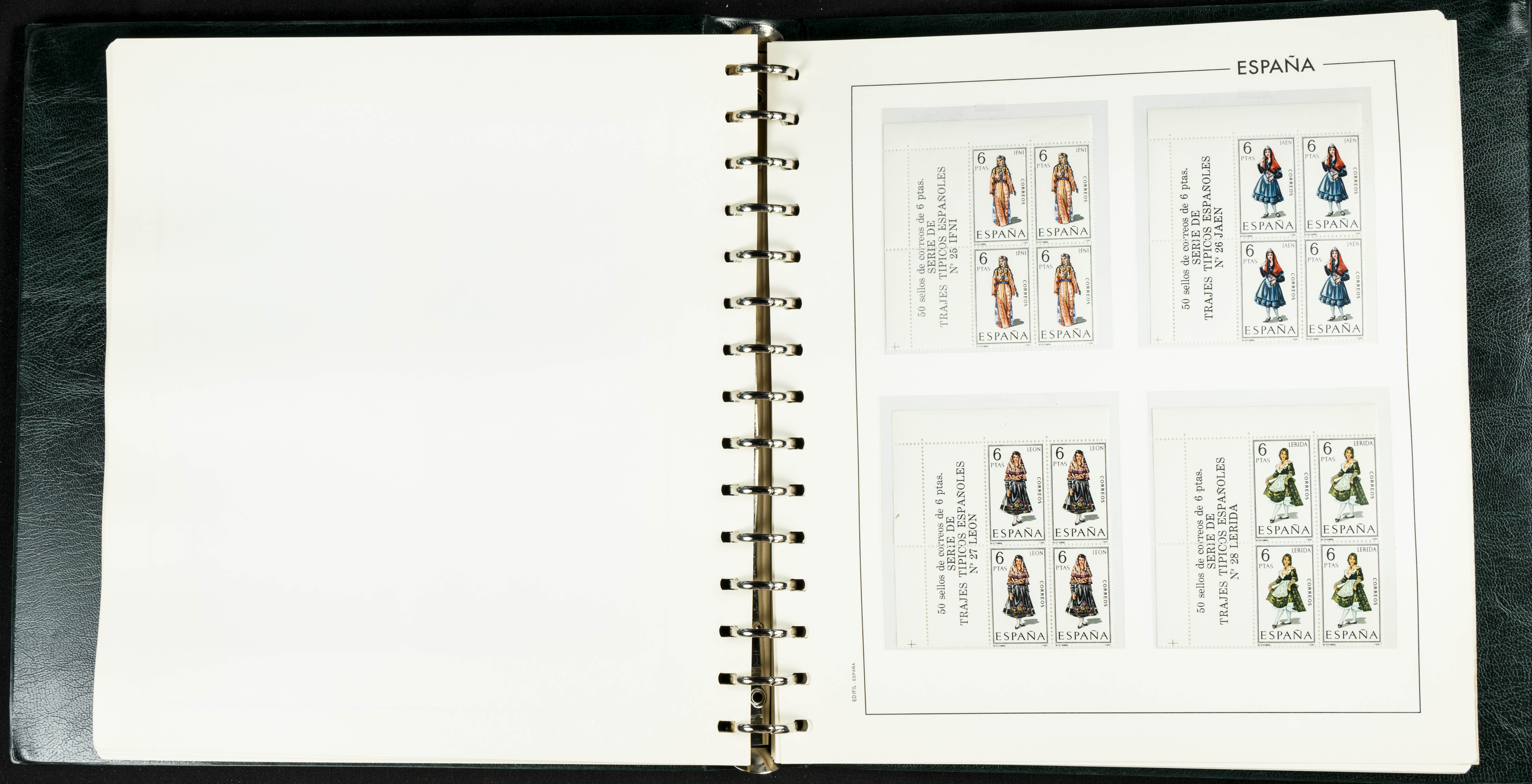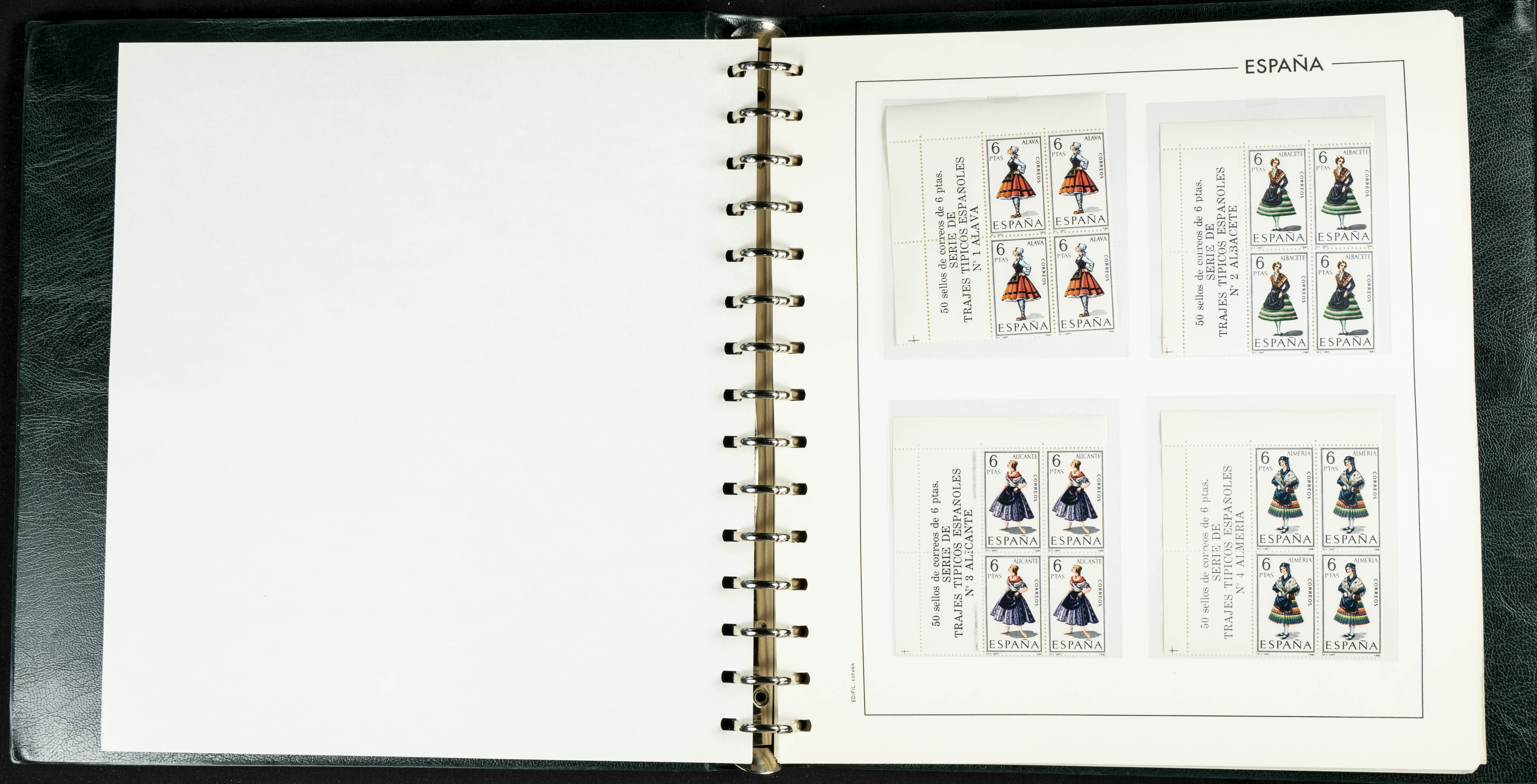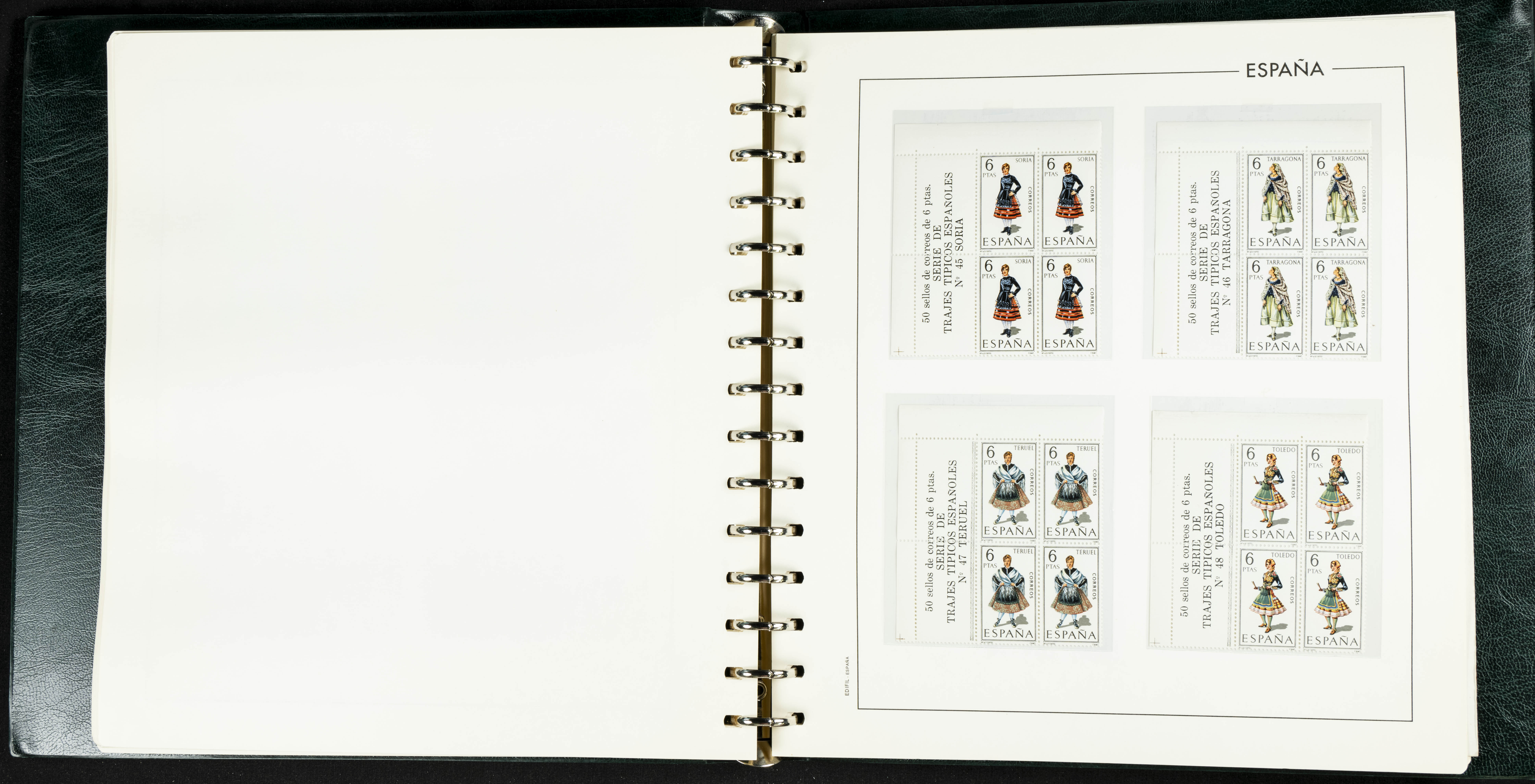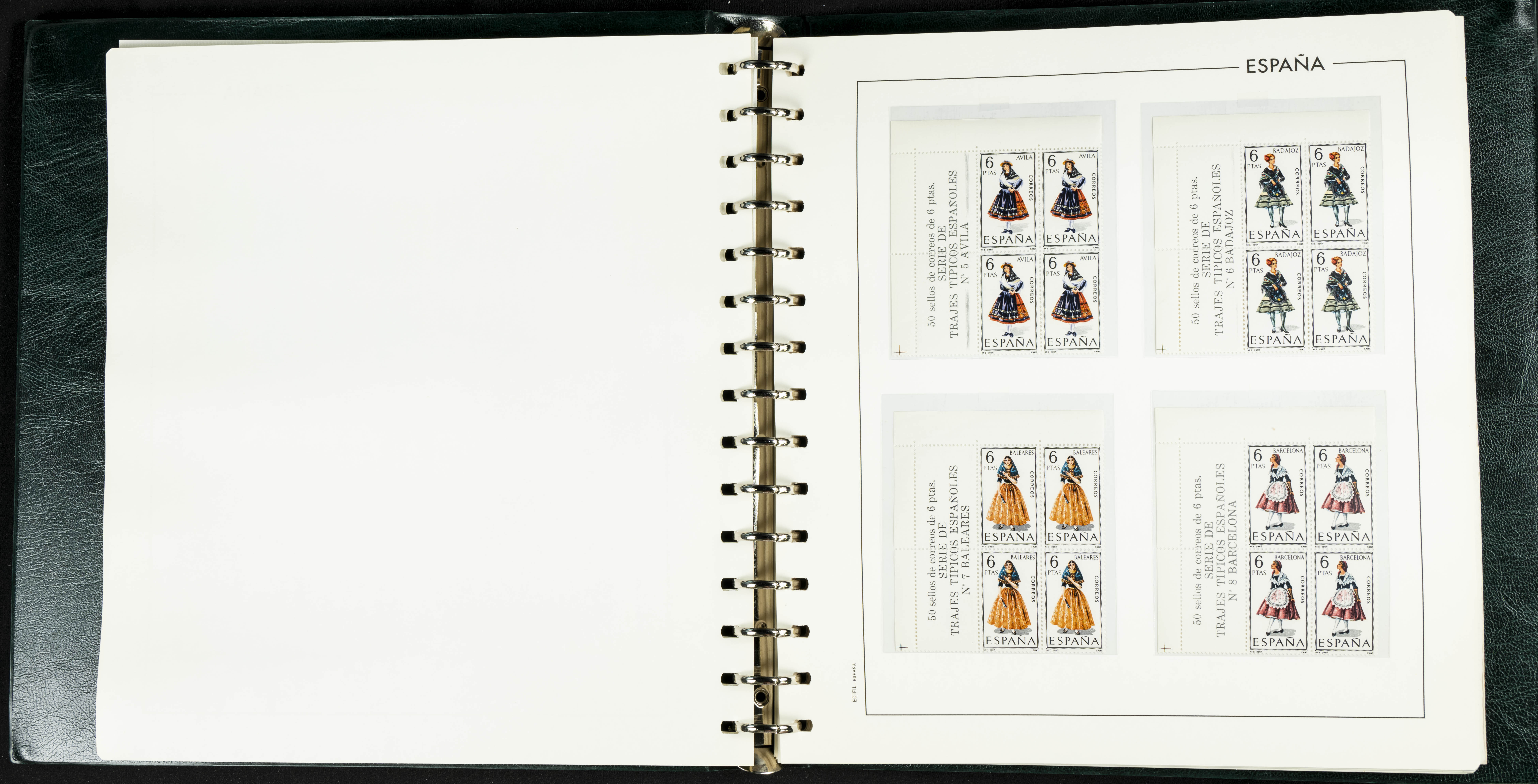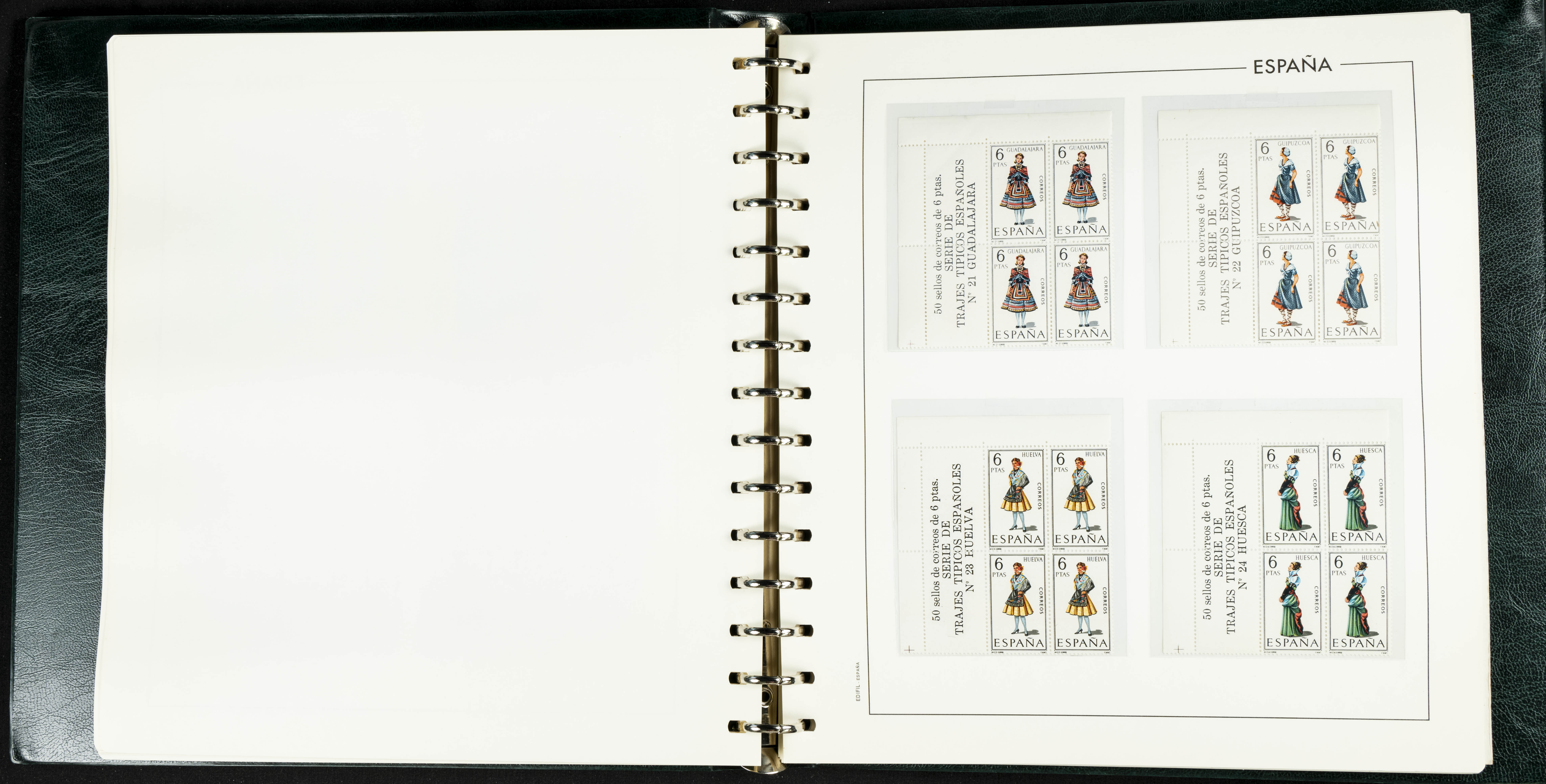 ★★(1950ca). Colección completa entre 1950 y 1975, en nuevo y sin fijasellos a falta de los Caudillos a Canarias con y sin número e incluyendo la 1ª y 2ª Tirada terrestres, Centenario, "Legazpi y Sorolla" (duplicado en usado) y juegos completos de Trajes y Escudos en bloques de cuatro. ALTO VALOR DE CATALOGO. A EXAMINAR.