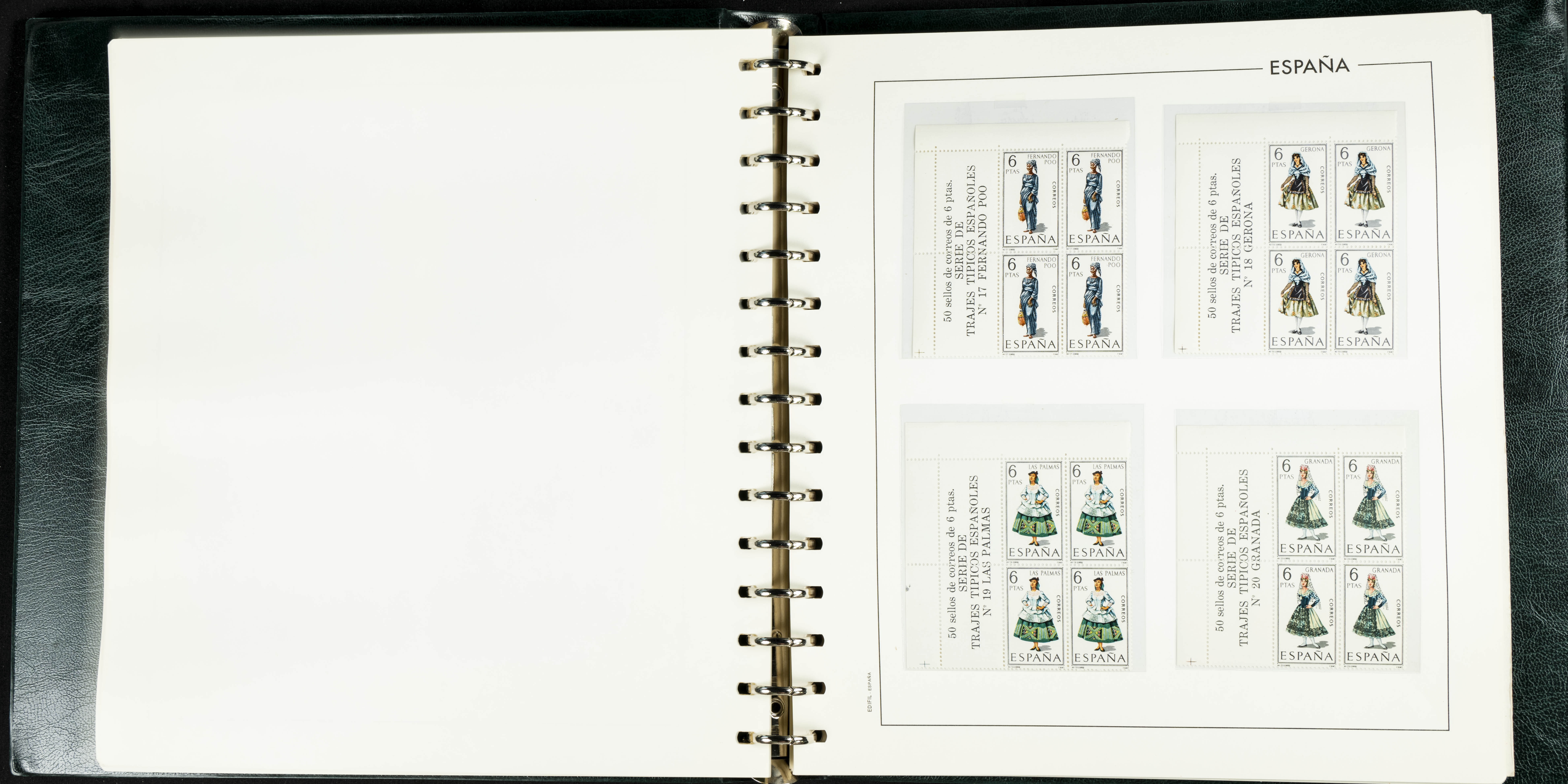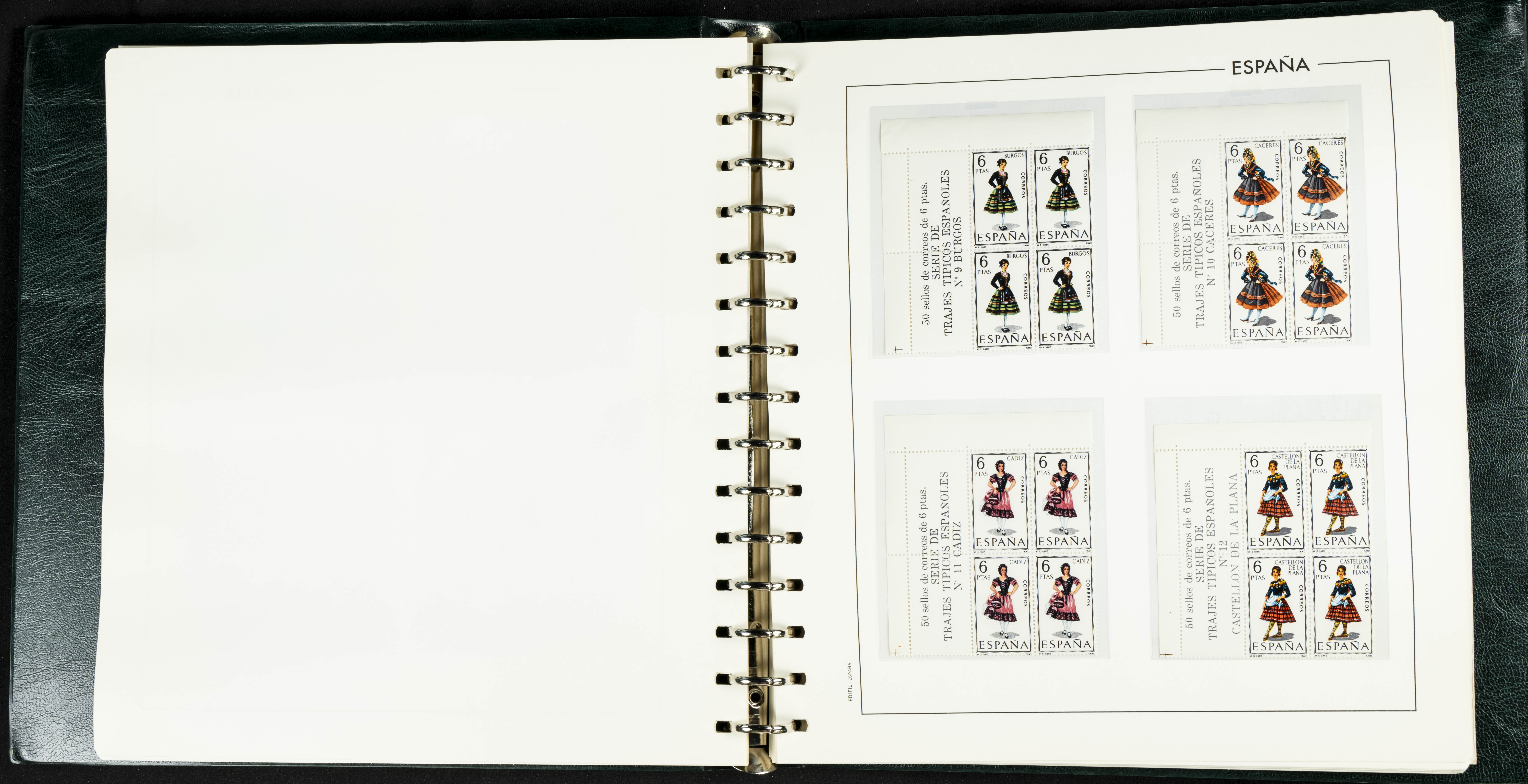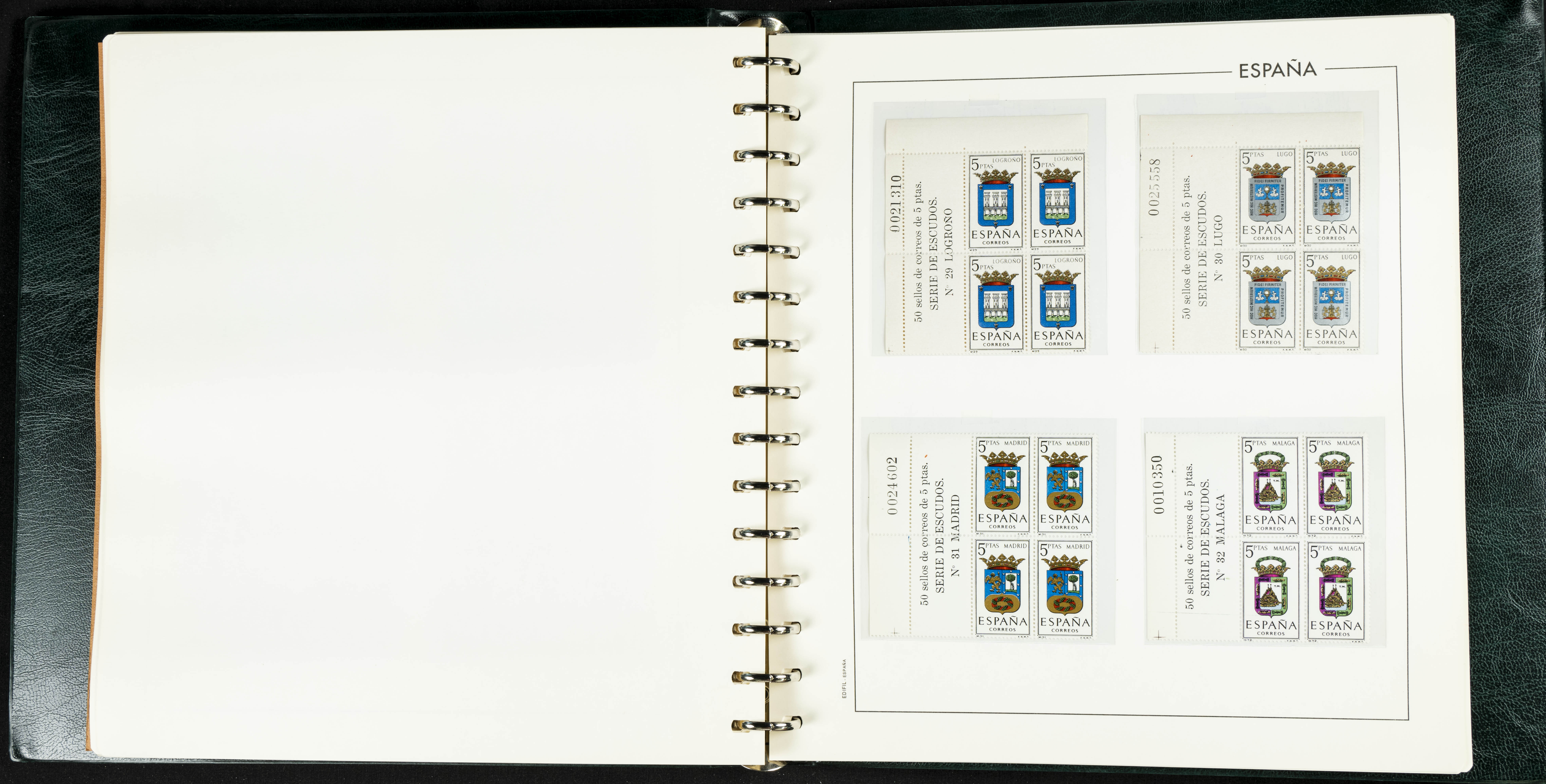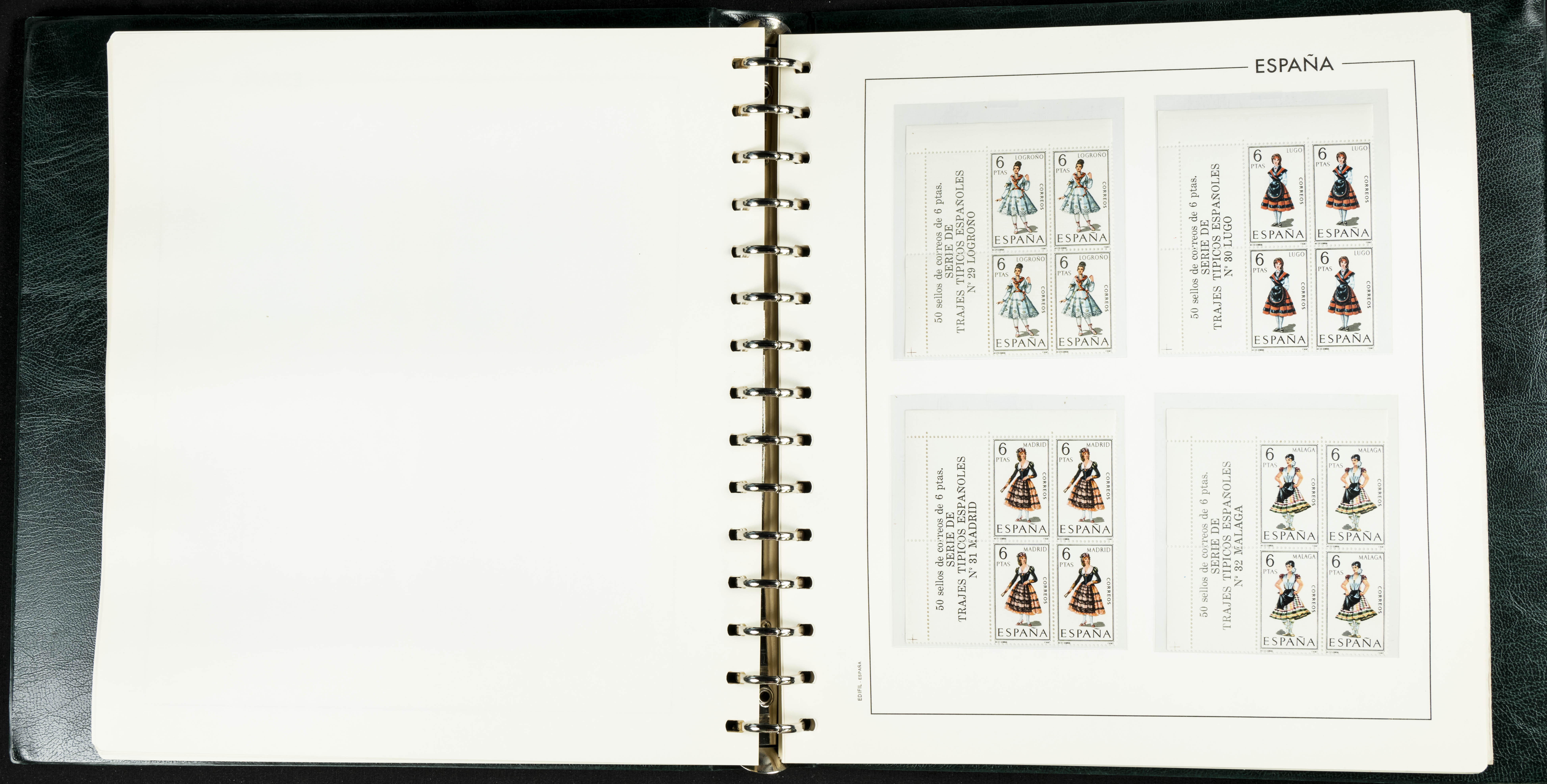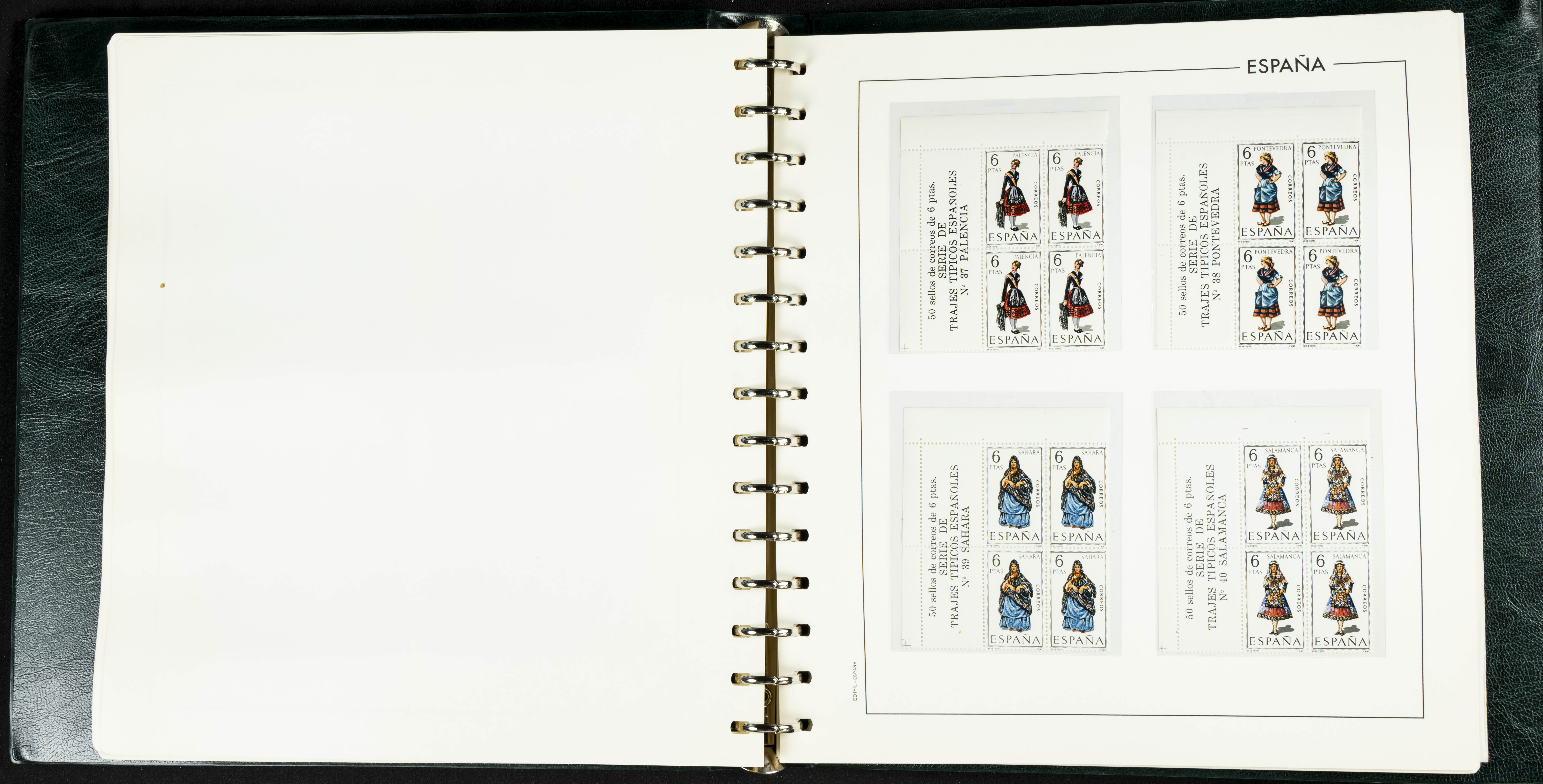 ★★(1950ca). Colección completa entre 1950 y 1975, en nuevo y sin fijasellos a falta de los Caudillos a Canarias con y sin número e incluyendo la 1ª y 2ª Tirada terrestres, Centenario, "Legazpi y Sorolla" (duplicado en usado) y juegos completos de Trajes y Escudos en bloques de cuatro. ALTO VALOR DE CATALOGO. A EXAMINAR.