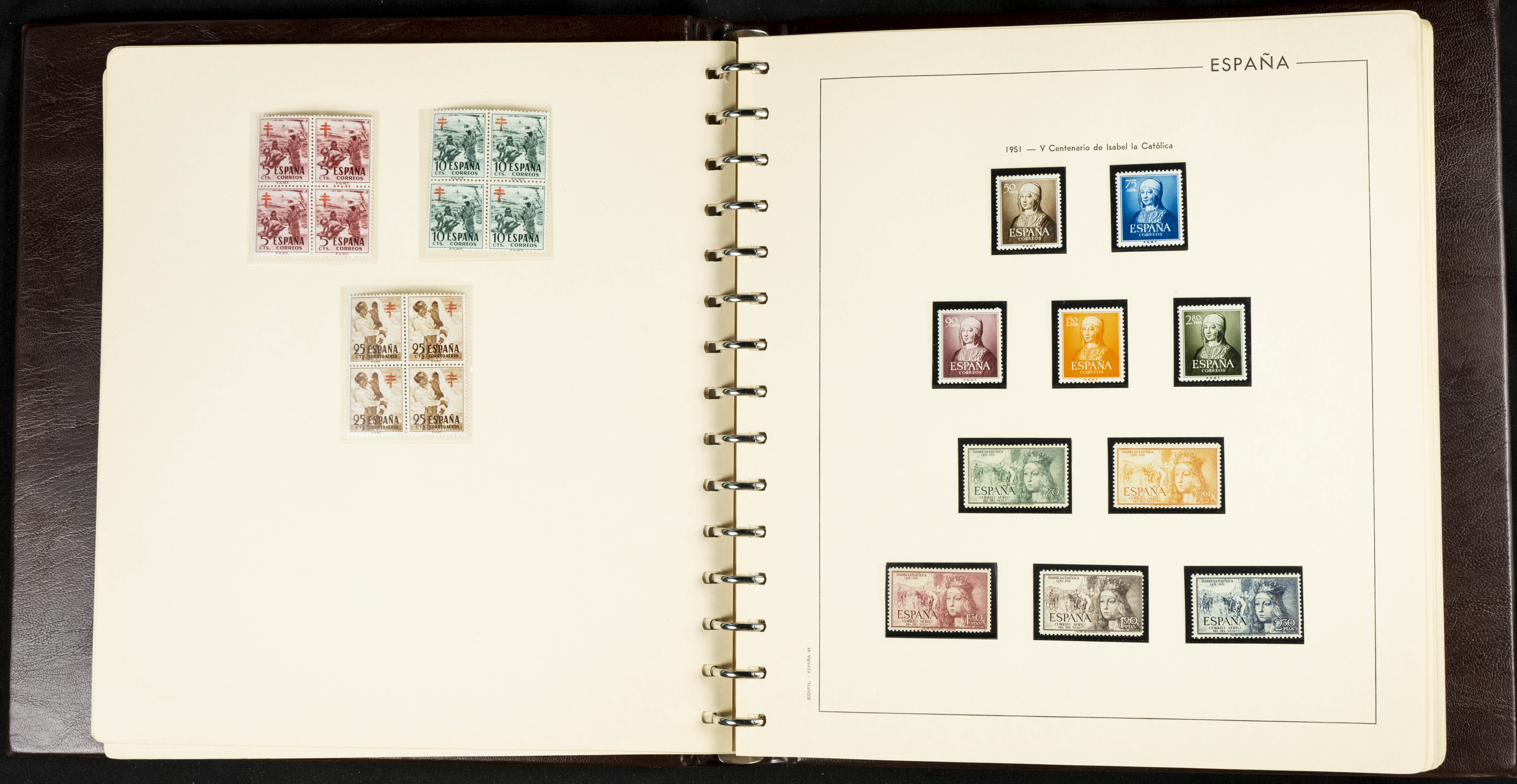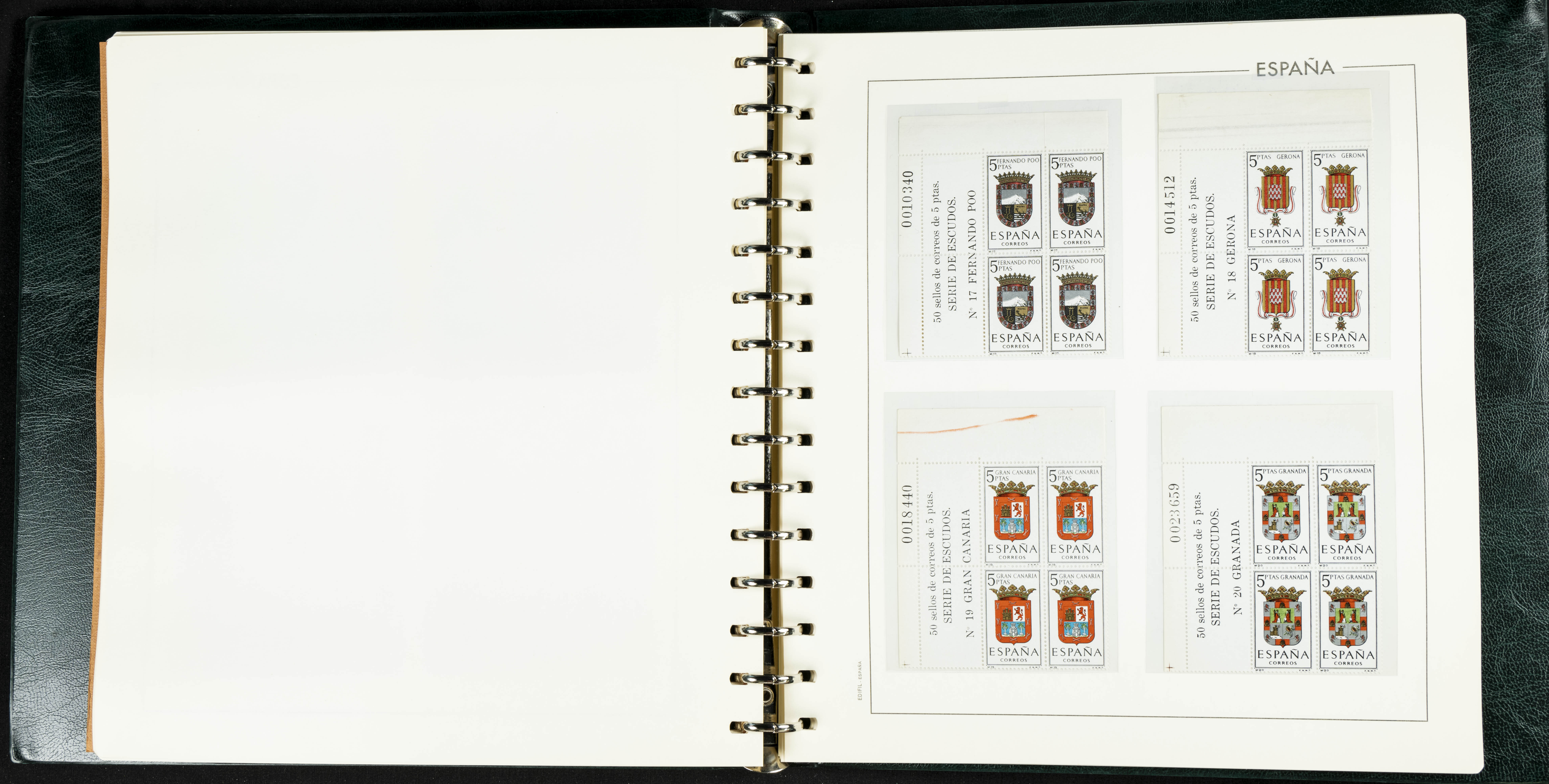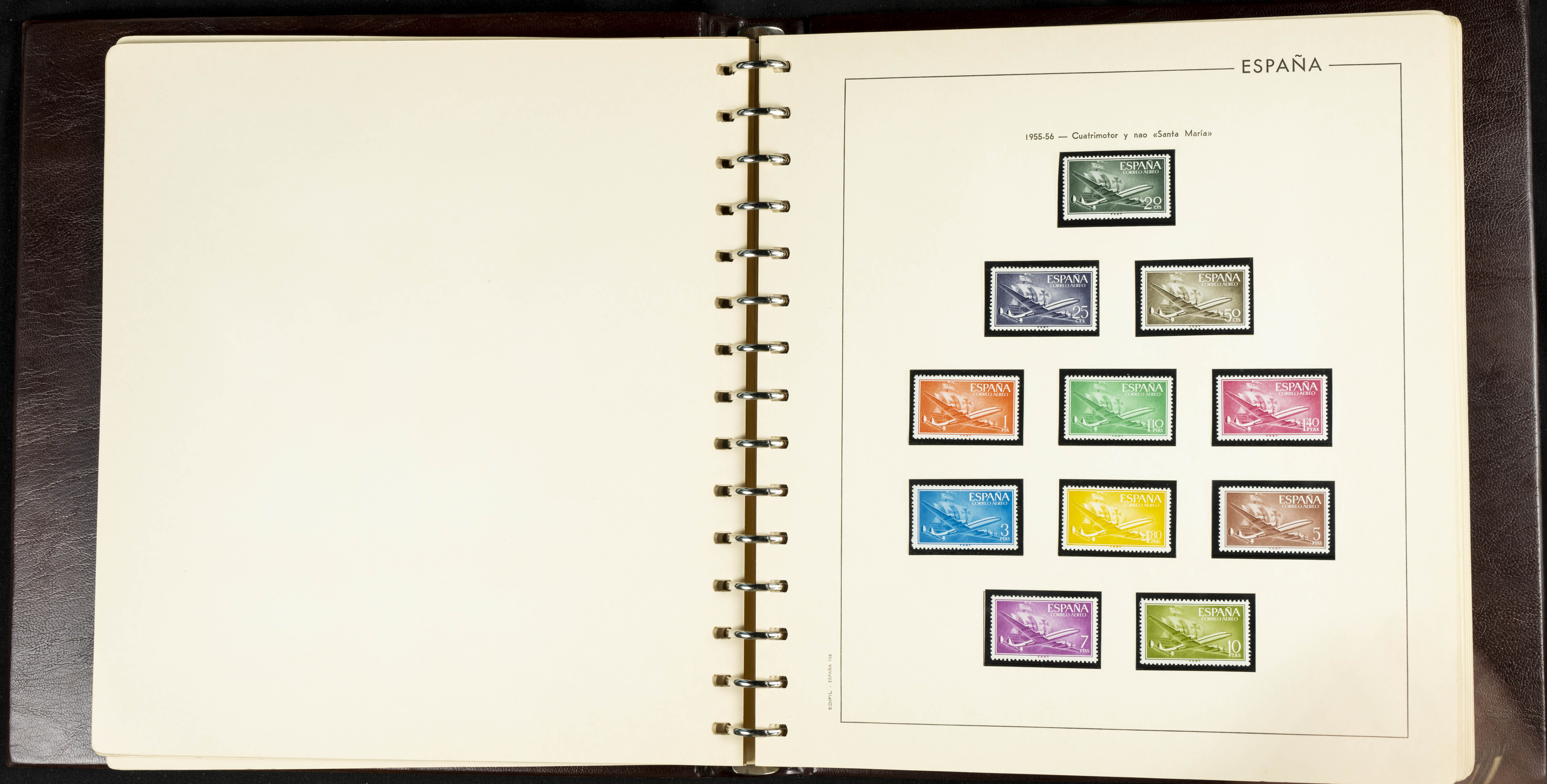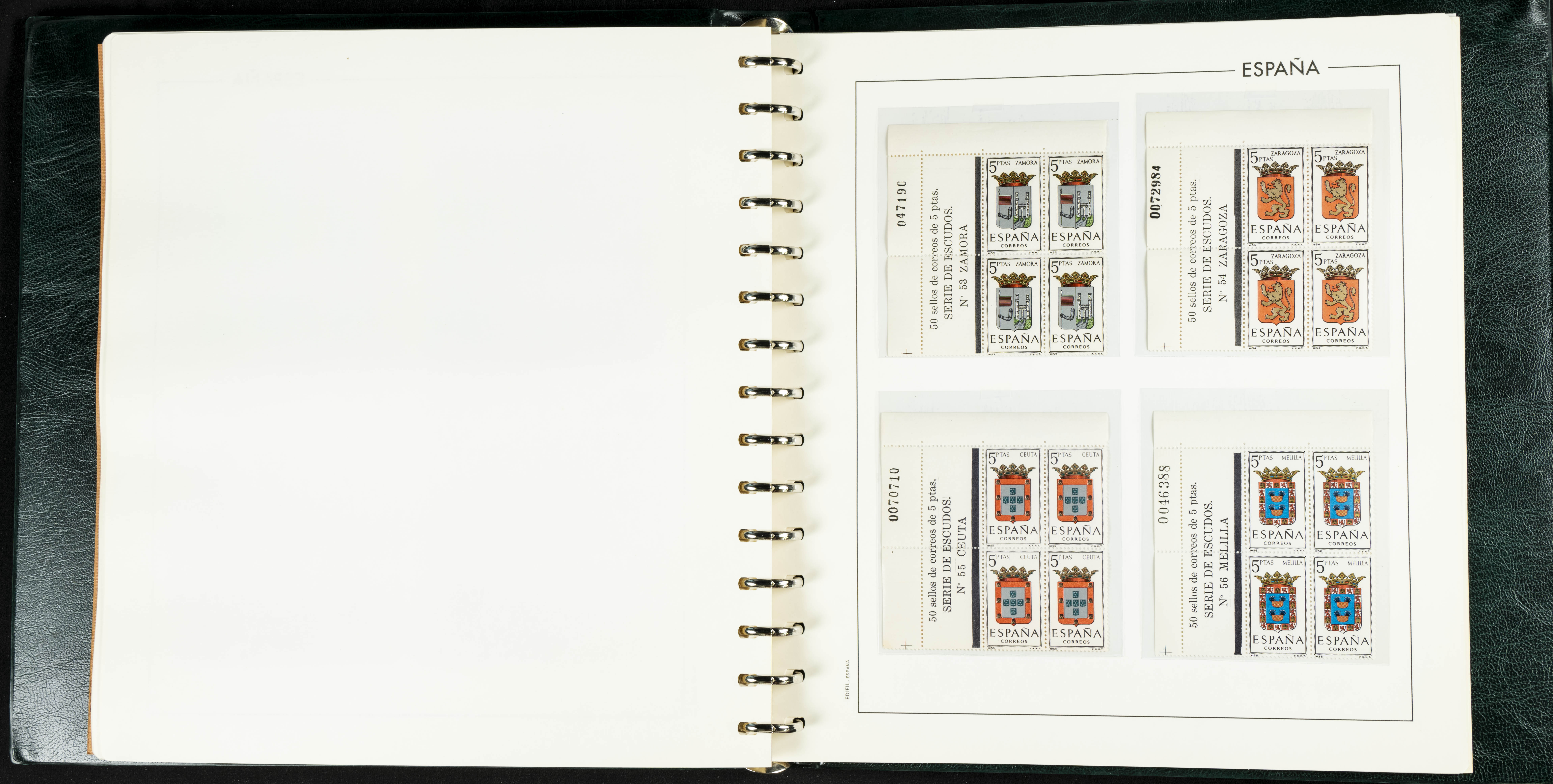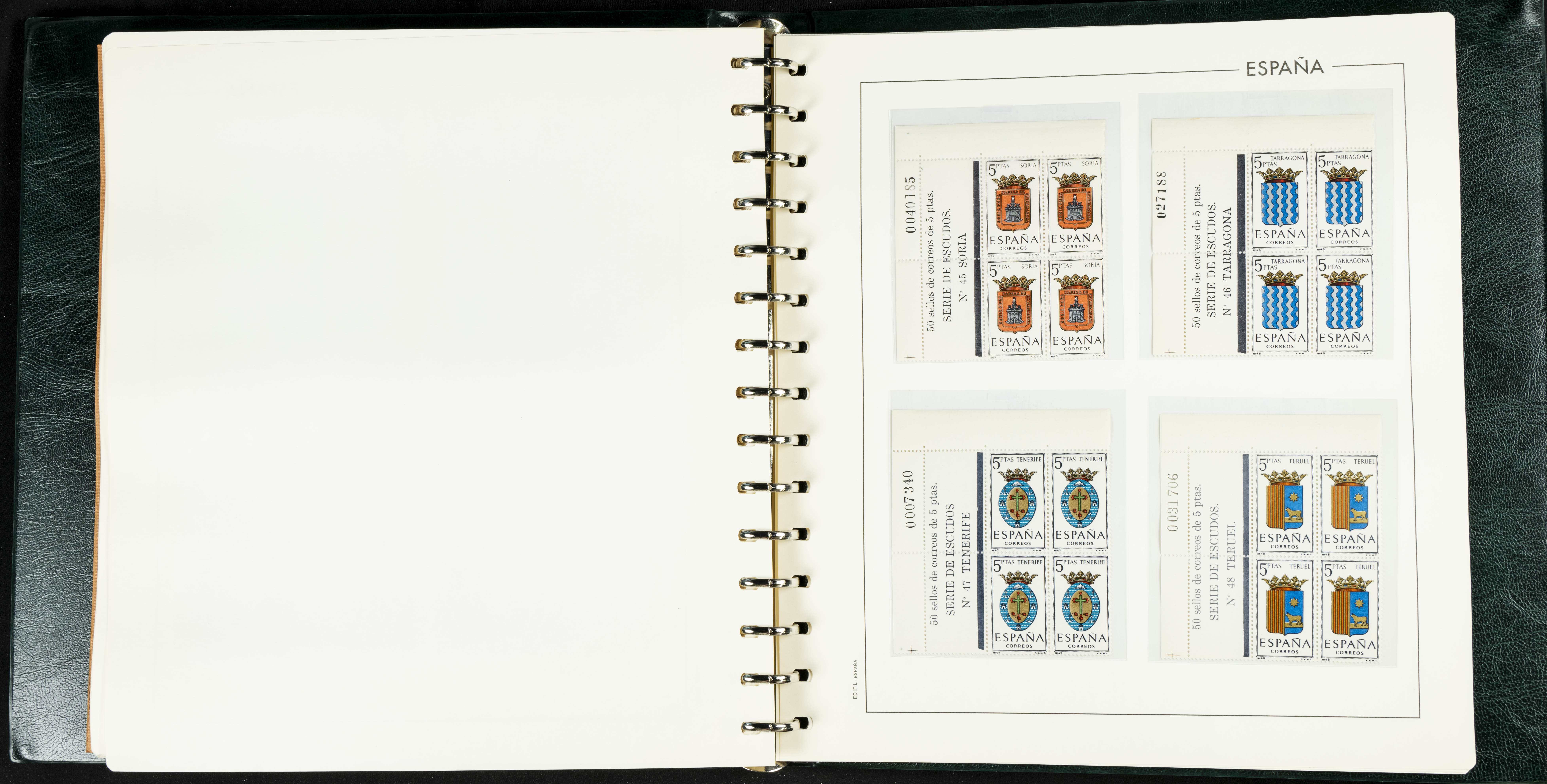 ★★(1950ca). Colección completa entre 1950 y 1975, en nuevo y sin fijasellos a falta de los Caudillos a Canarias con y sin número e incluyendo la 1ª y 2ª Tirada terrestres, Centenario, "Legazpi y Sorolla" (duplicado en usado) y juegos completos de Trajes y Escudos en bloques de cuatro. ALTO VALOR DE CATALOGO. A EXAMINAR.