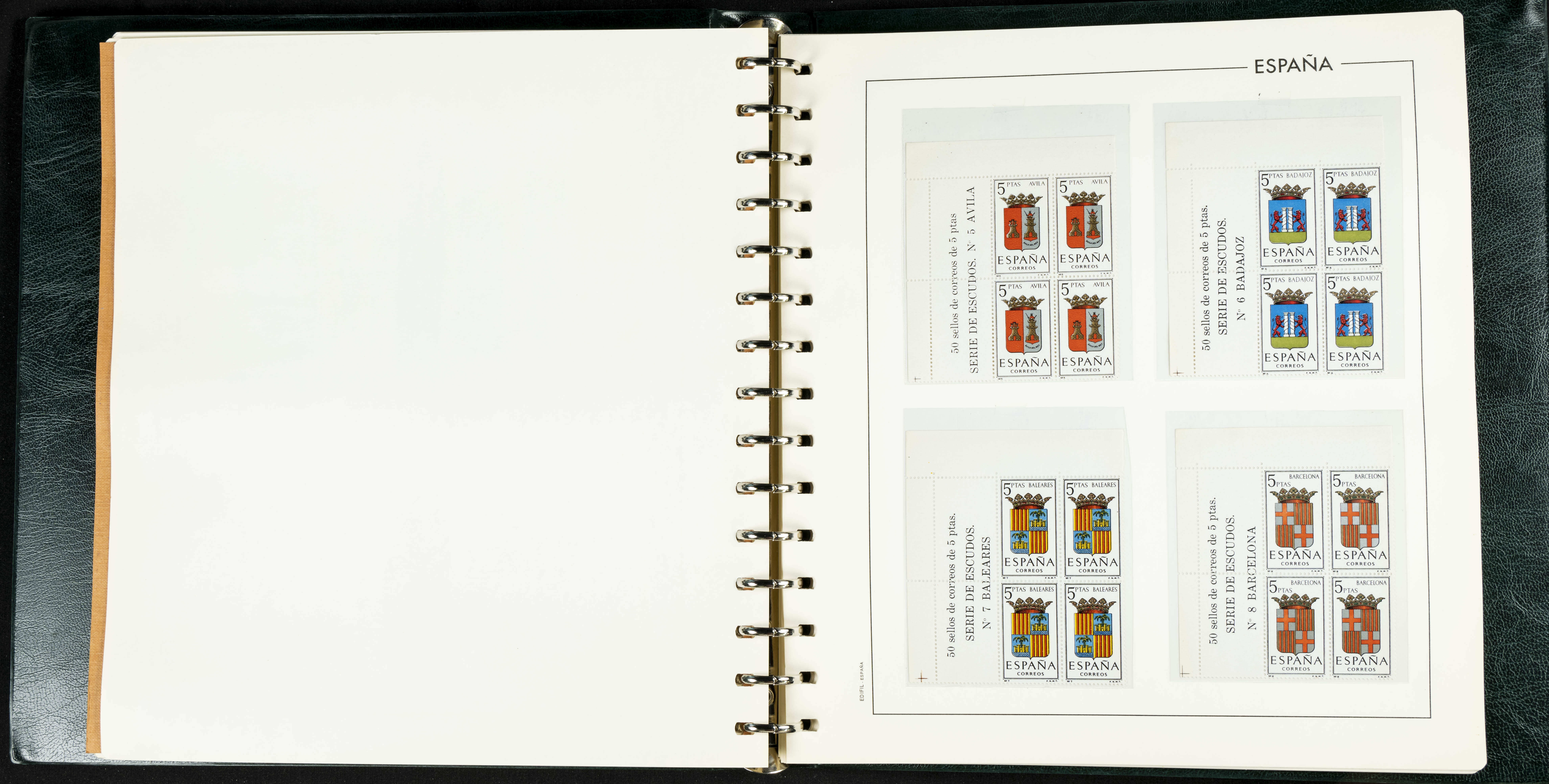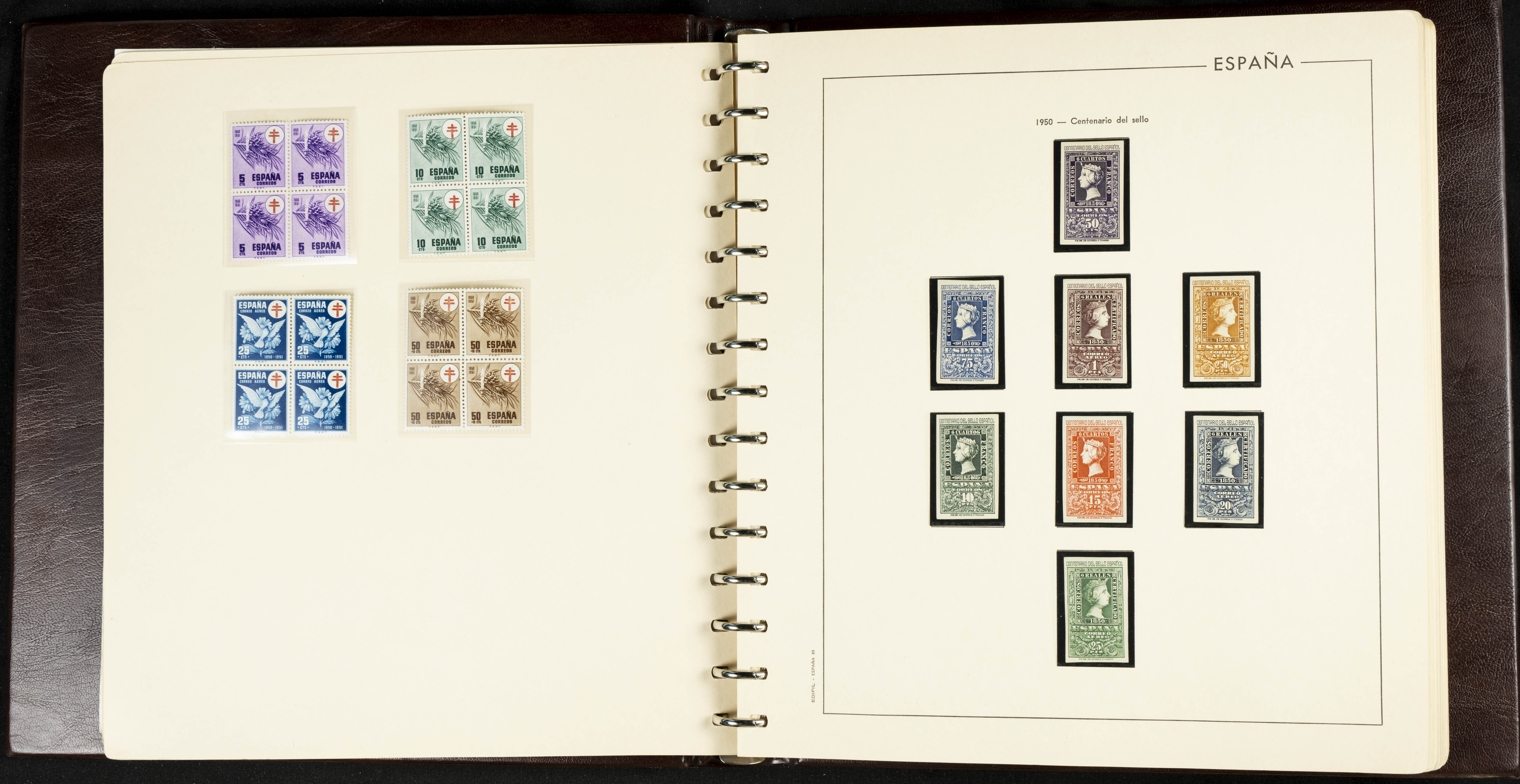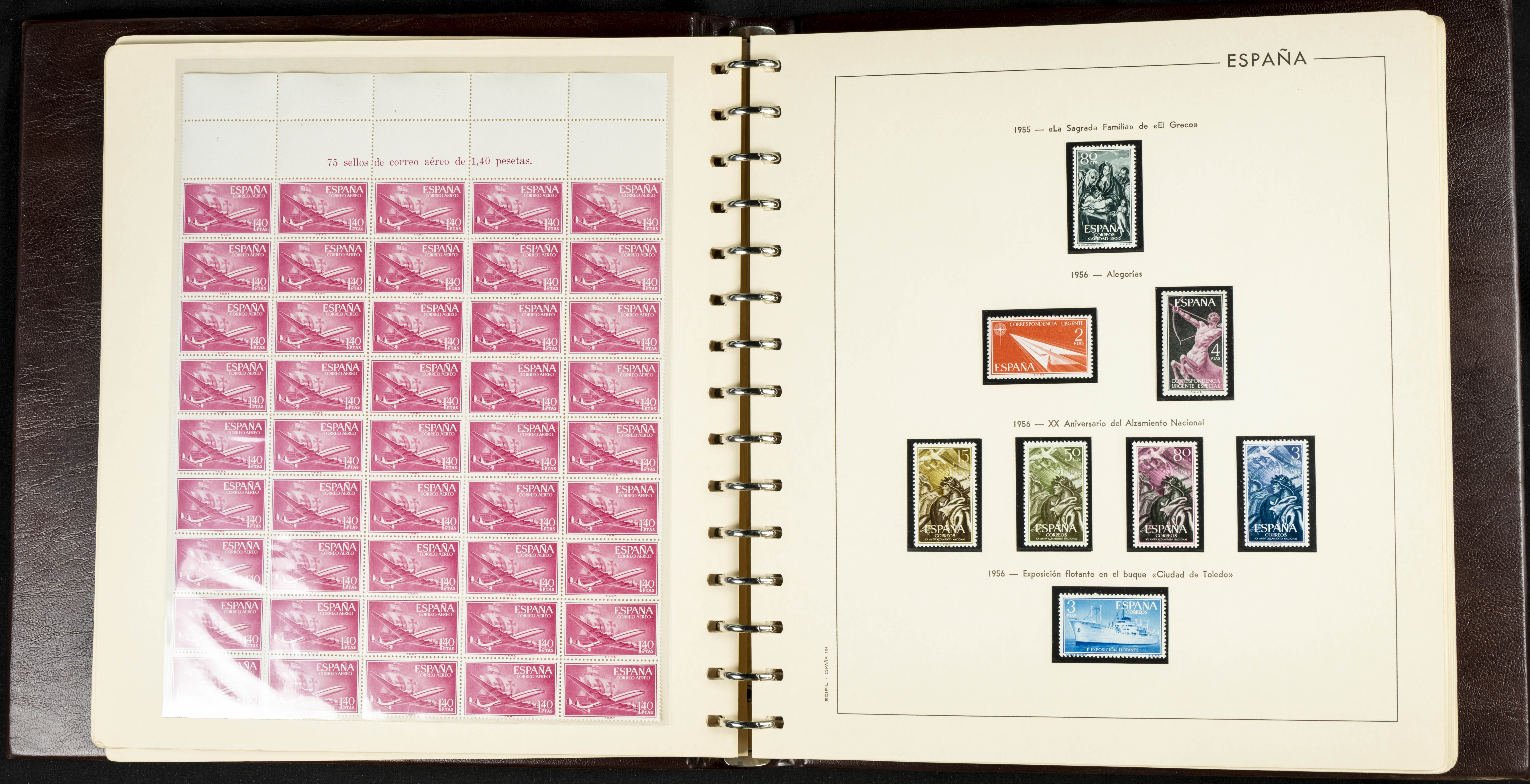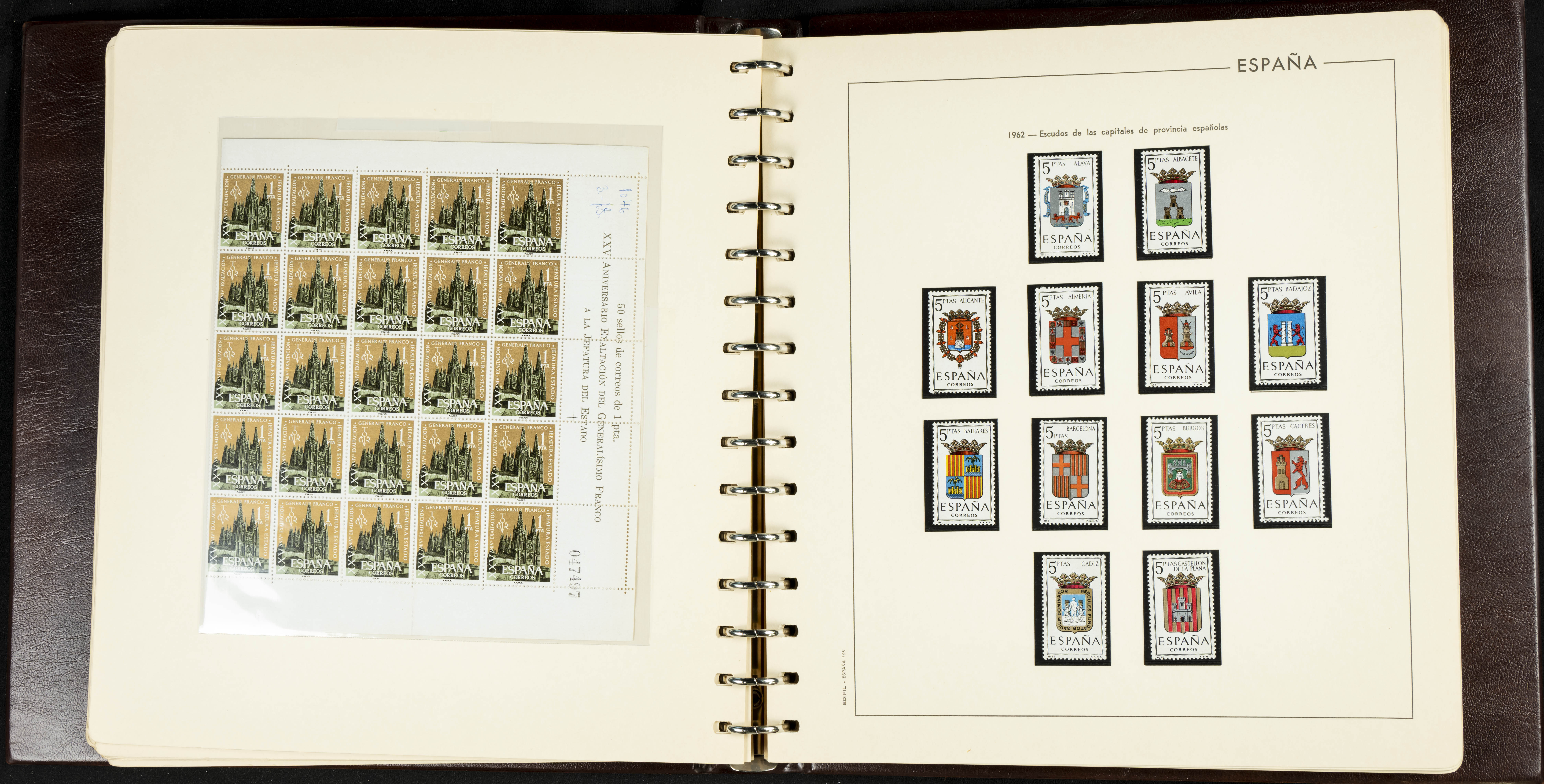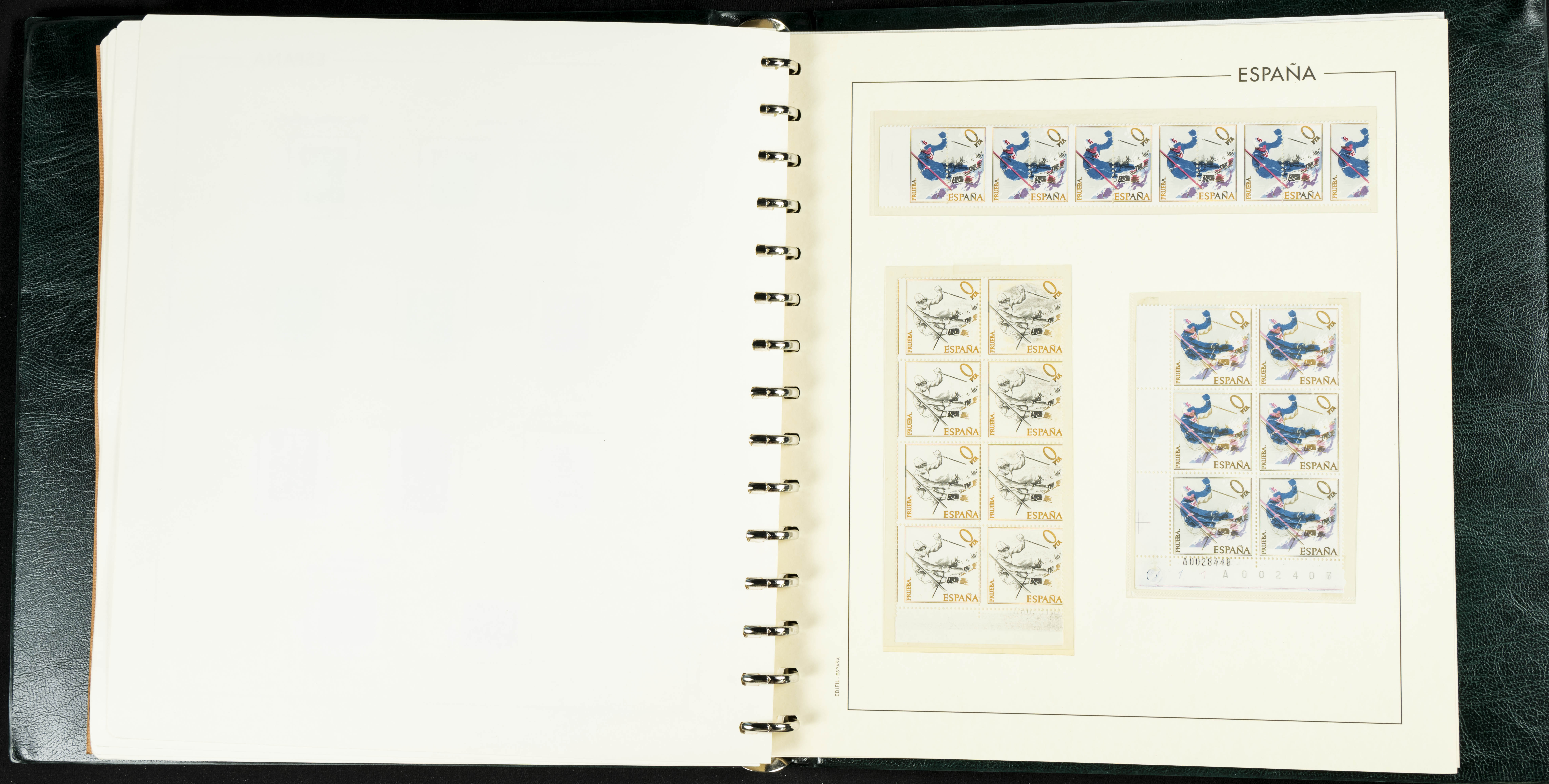 ★★(1950ca). Colección completa entre 1950 y 1975, en nuevo y sin fijasellos a falta de los Caudillos a Canarias con y sin número e incluyendo la 1ª y 2ª Tirada terrestres, Centenario, "Legazpi y Sorolla" (duplicado en usado) y juegos completos de Trajes y Escudos en bloques de cuatro. ALTO VALOR DE CATALOGO. A EXAMINAR.