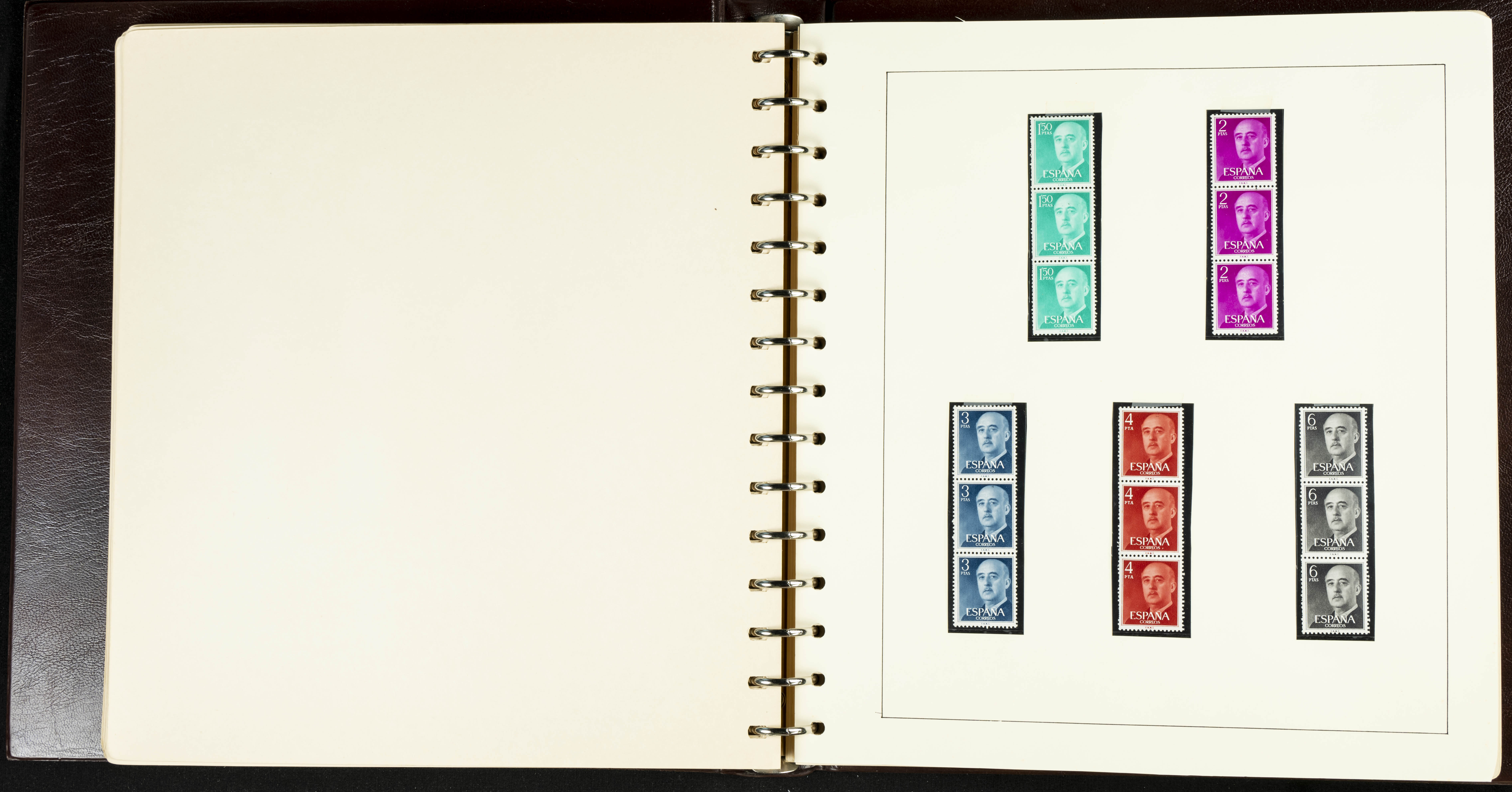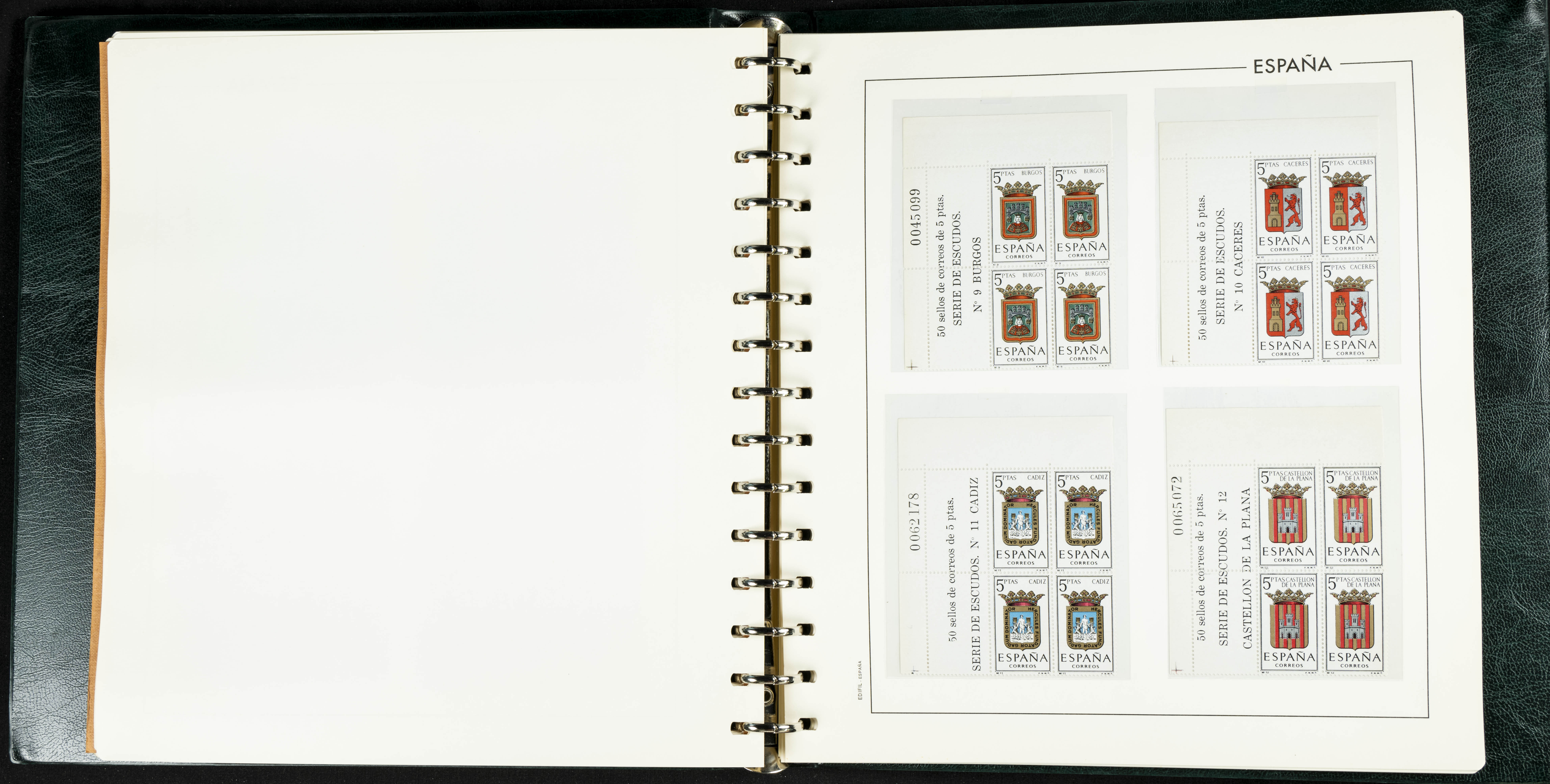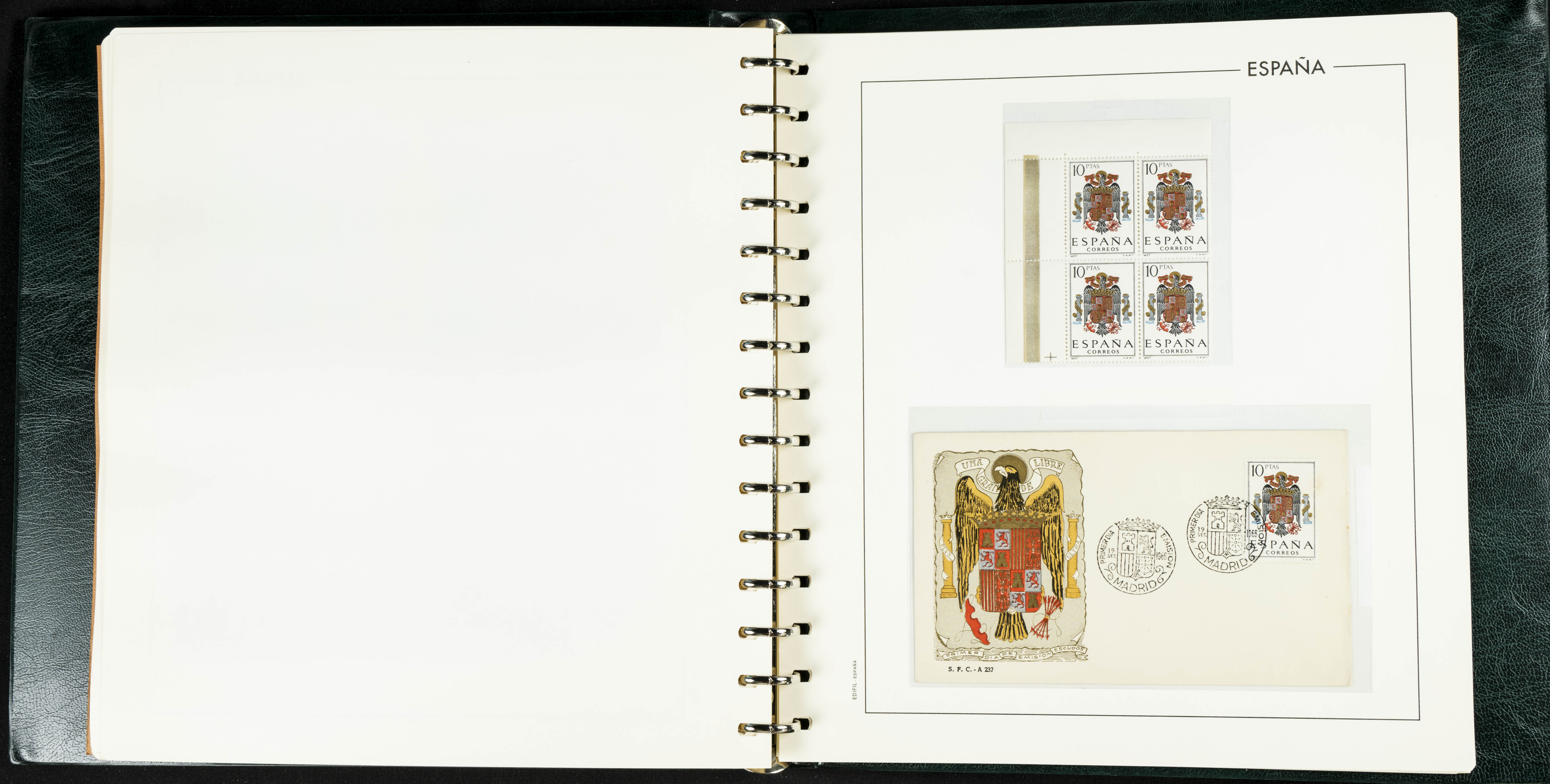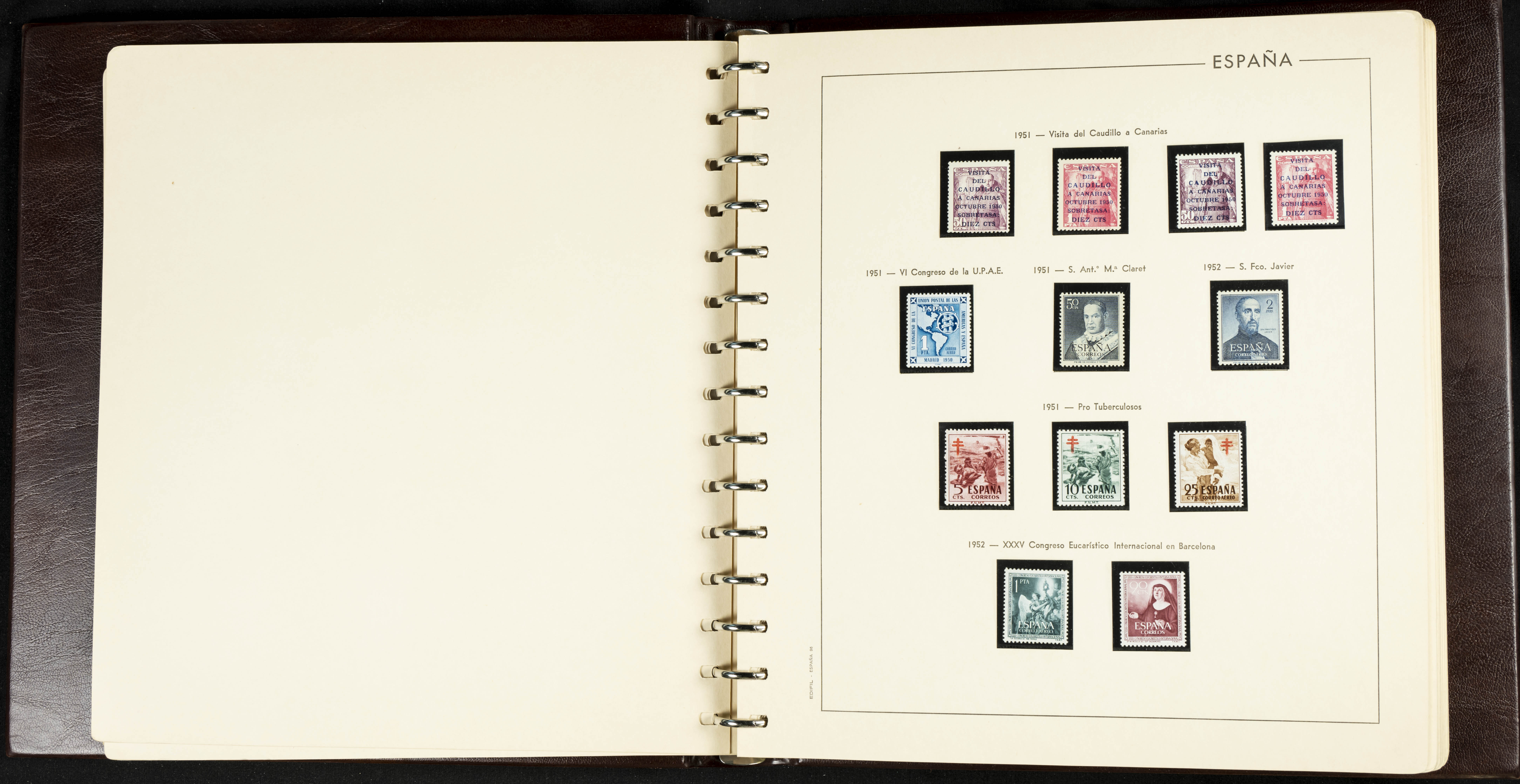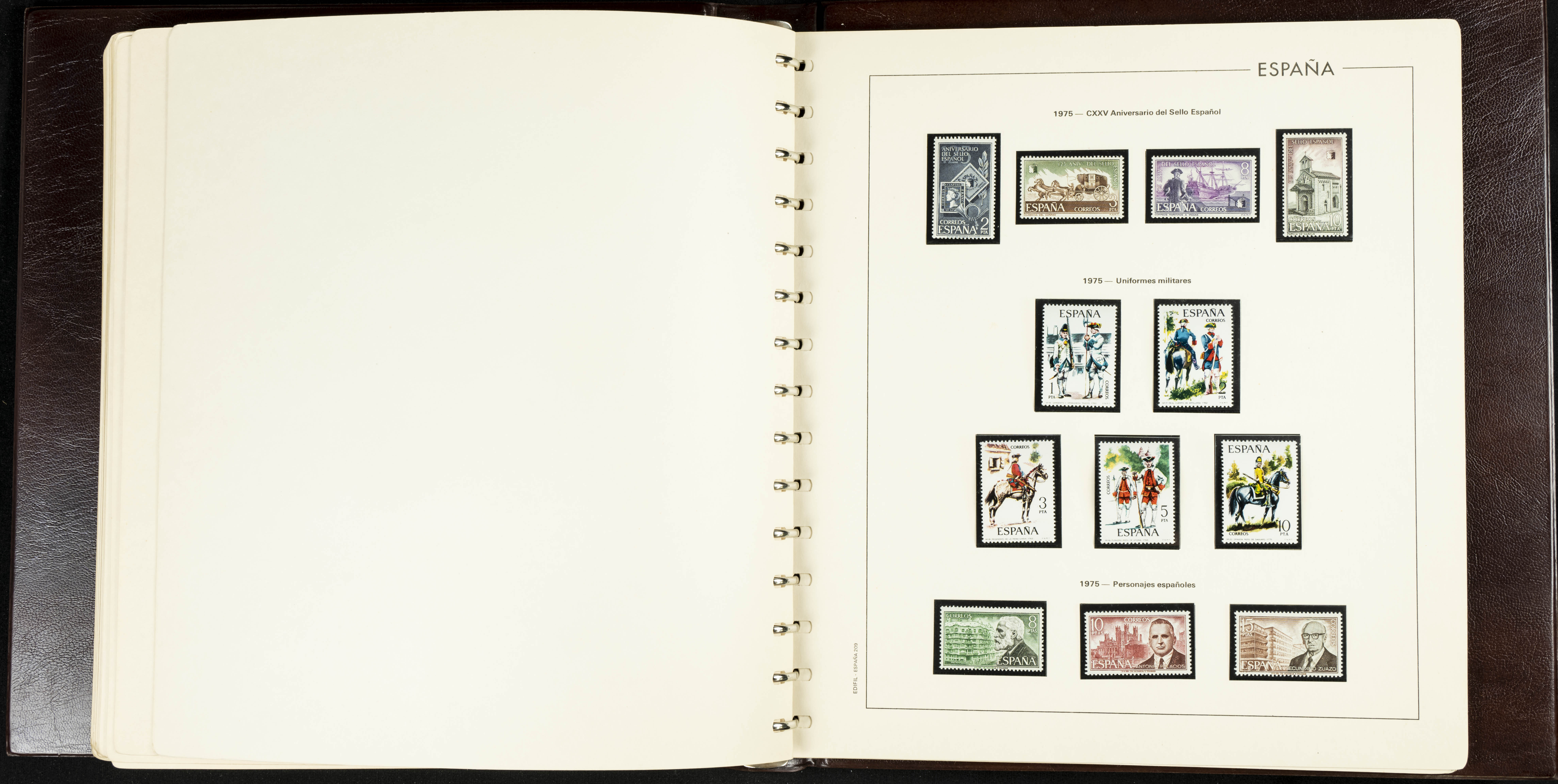 ★★(1950ca). Colección completa entre 1950 y 1975, en nuevo y sin fijasellos a falta de los Caudillos a Canarias con y sin número e incluyendo la 1ª y 2ª Tirada terrestres, Centenario, "Legazpi y Sorolla" (duplicado en usado) y juegos completos de Trajes y Escudos en bloques de cuatro. ALTO VALOR DE CATALOGO. A EXAMINAR.