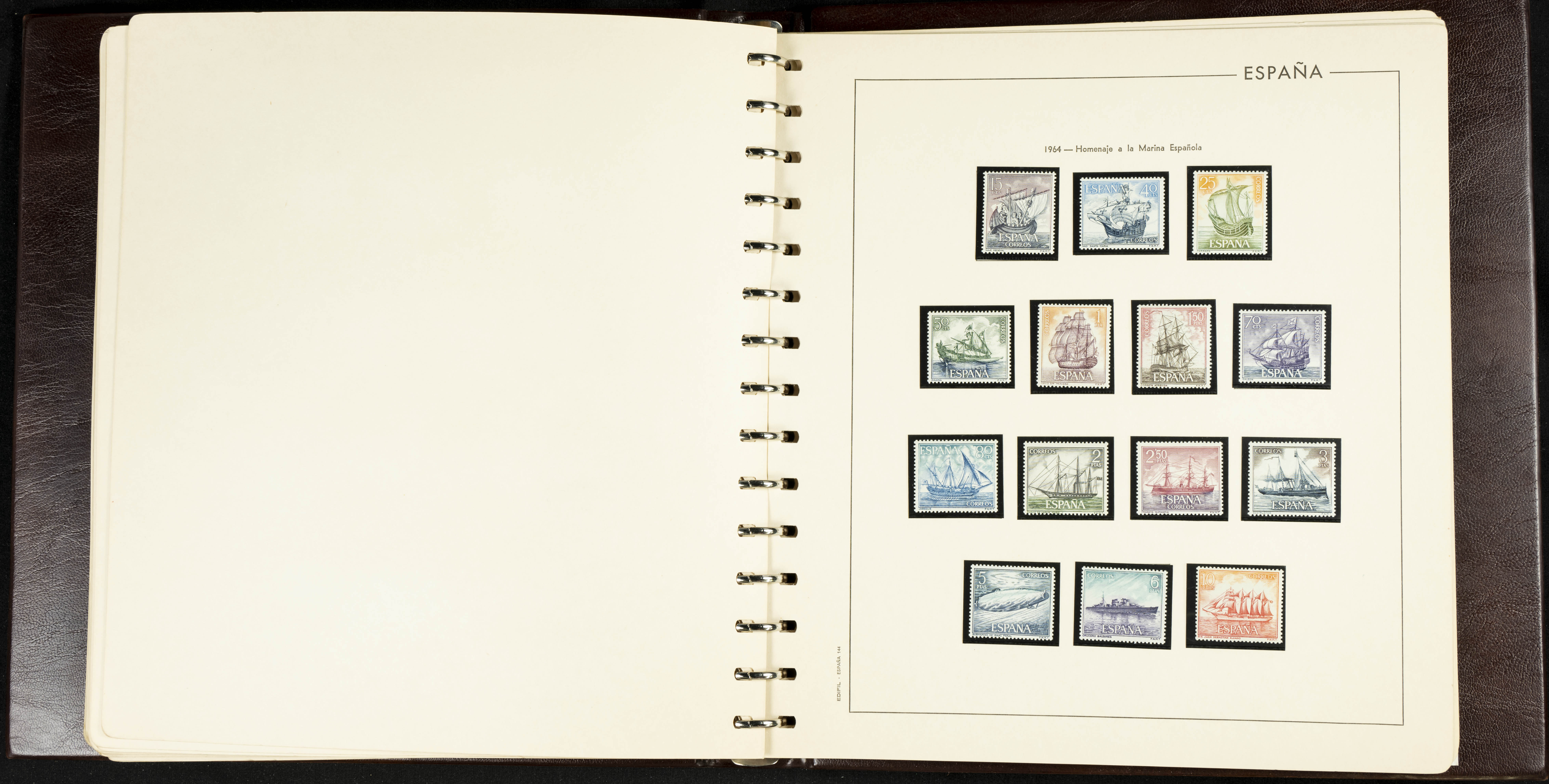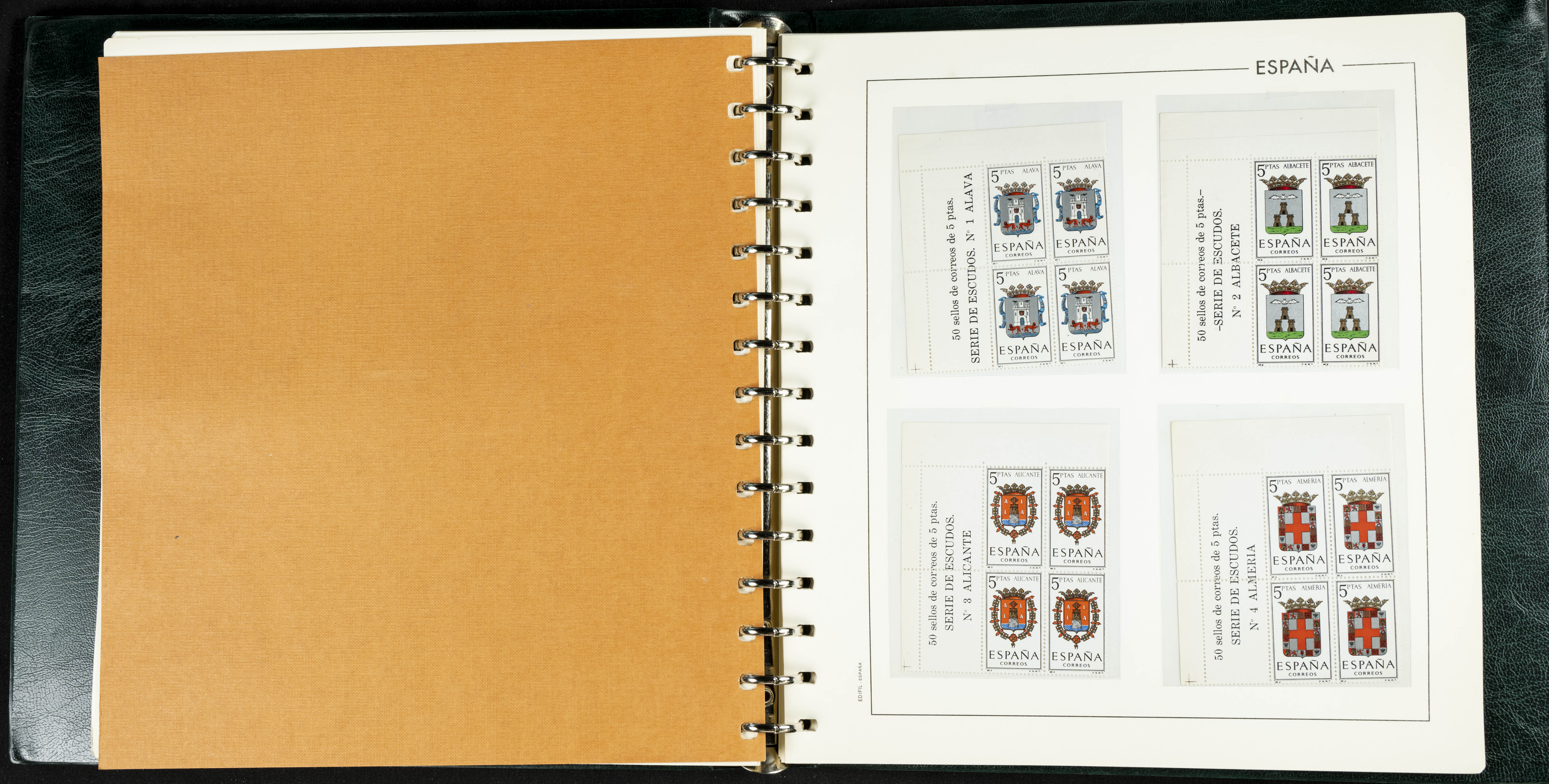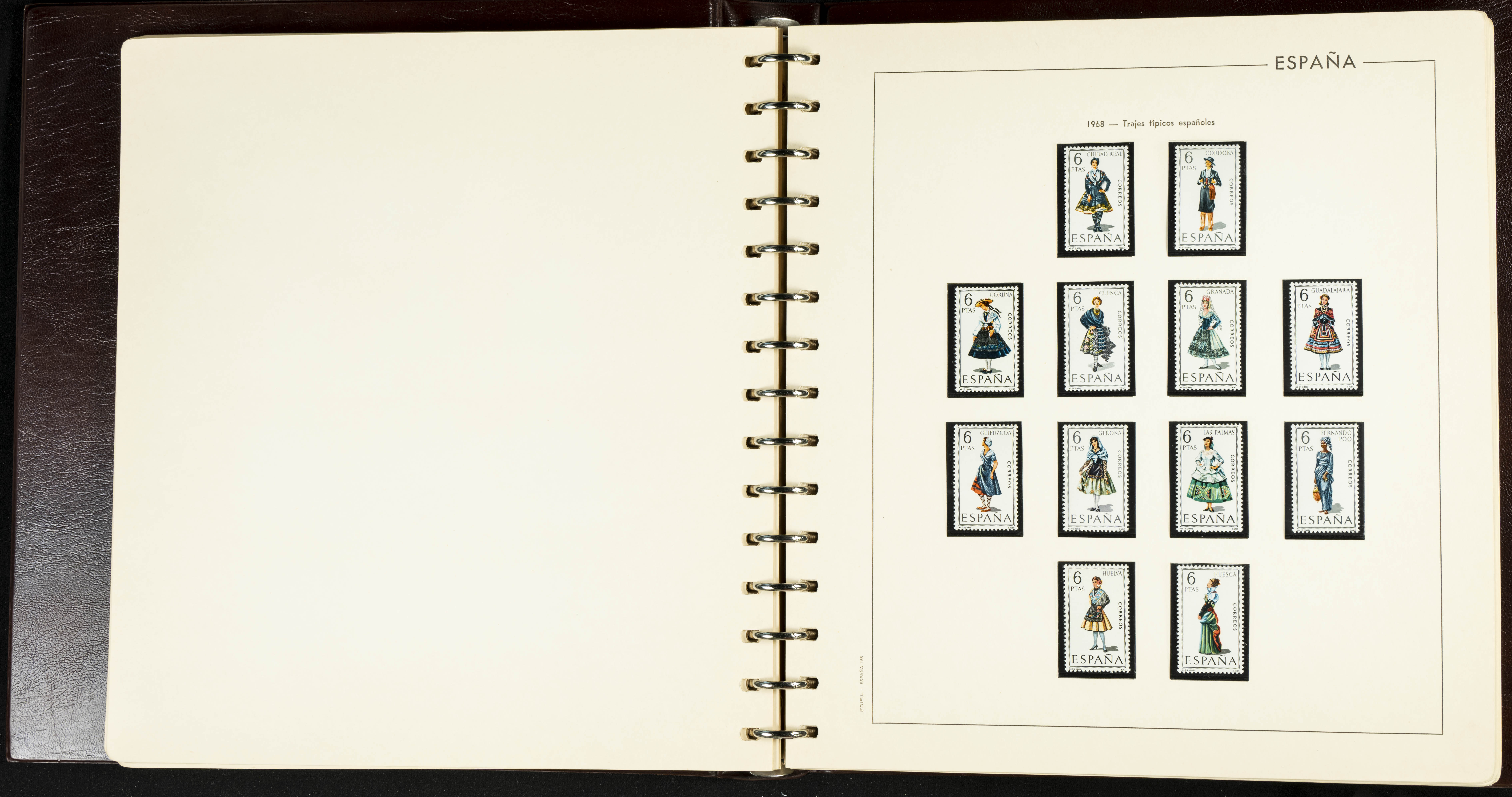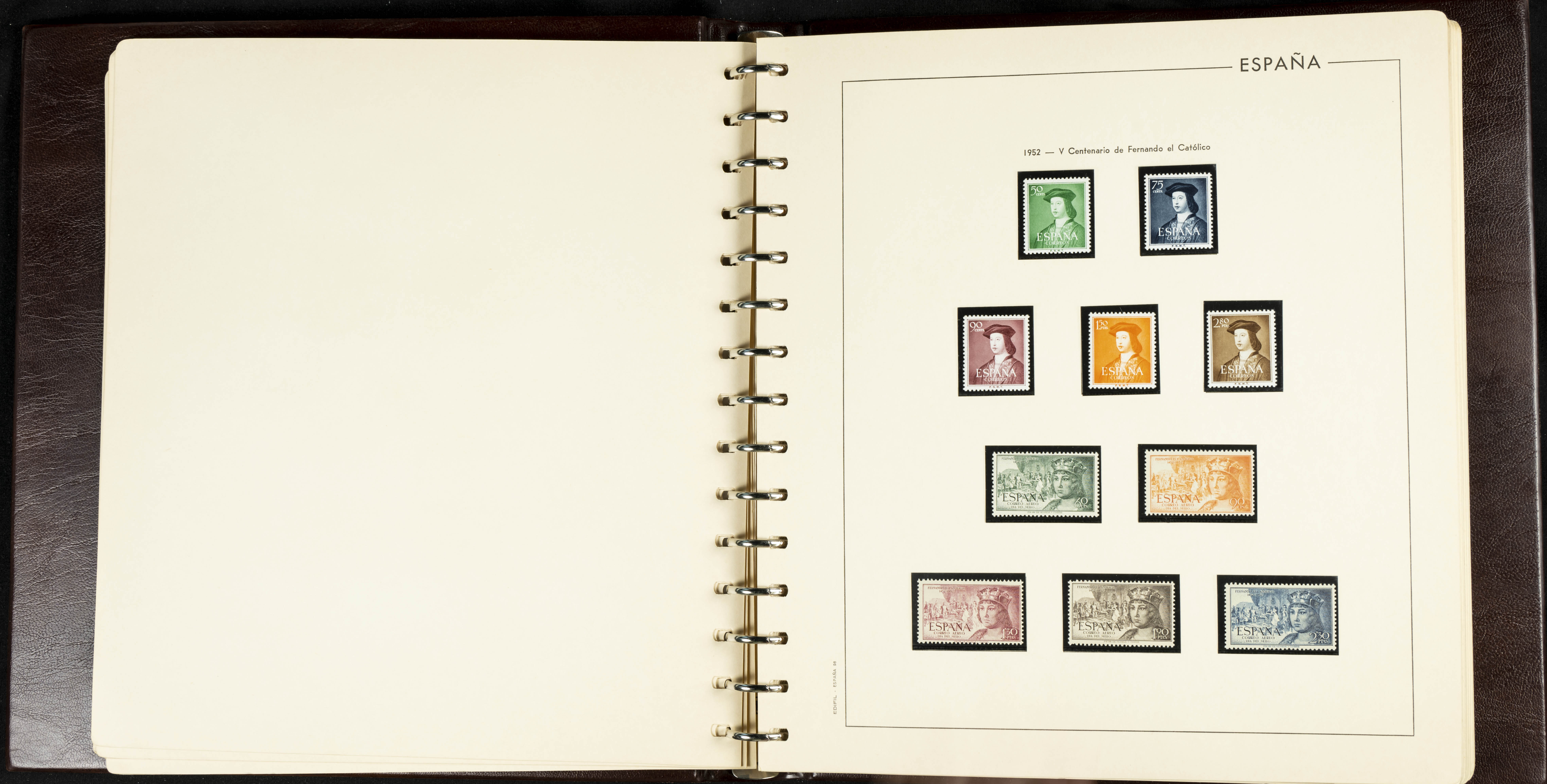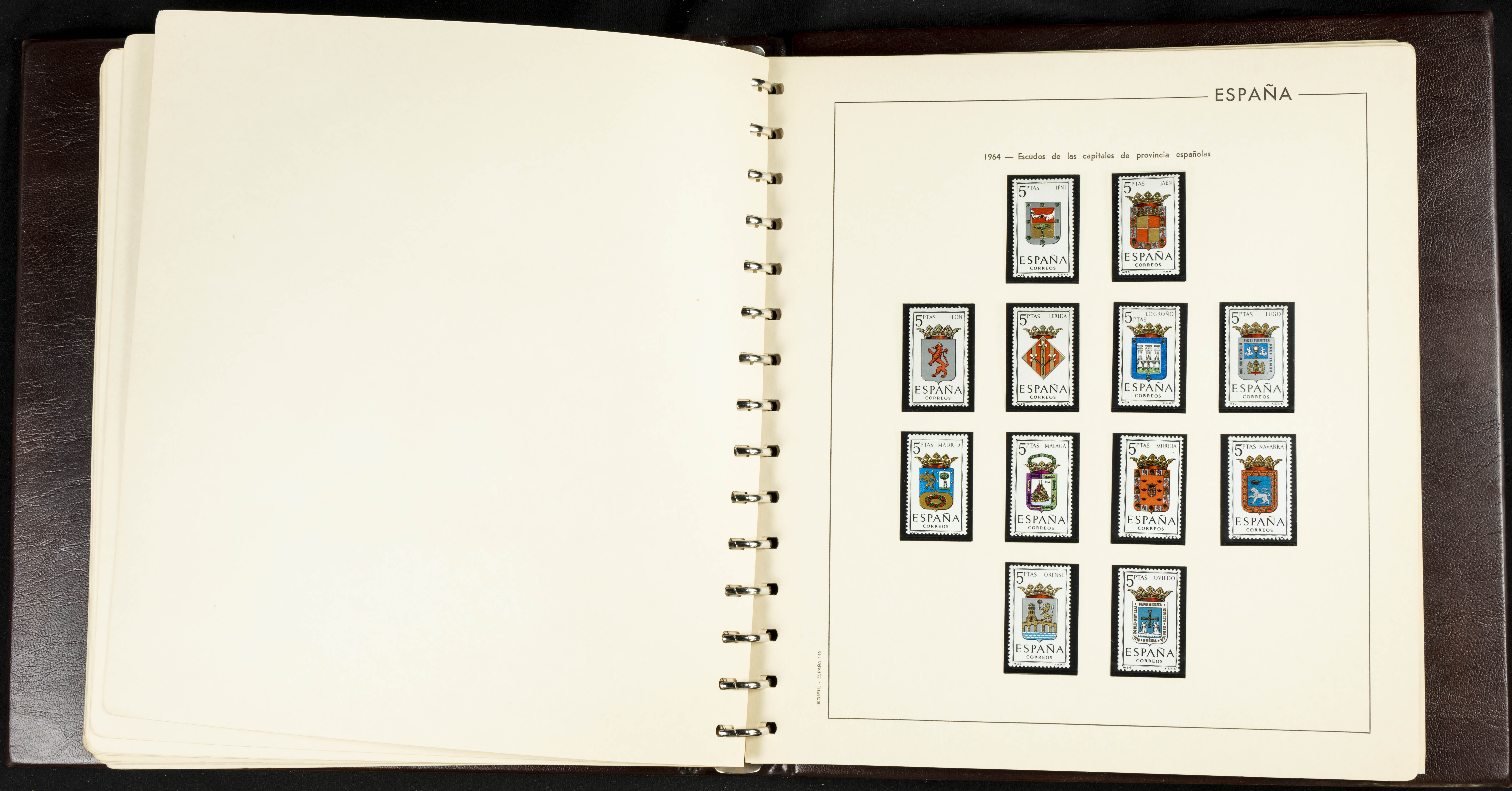 ★★(1950ca). Colección completa entre 1950 y 1975, en nuevo y sin fijasellos a falta de los Caudillos a Canarias con y sin número e incluyendo la 1ª y 2ª Tirada terrestres, Centenario, "Legazpi y Sorolla" (duplicado en usado) y juegos completos de Trajes y Escudos en bloques de cuatro. ALTO VALOR DE CATALOGO. A EXAMINAR.