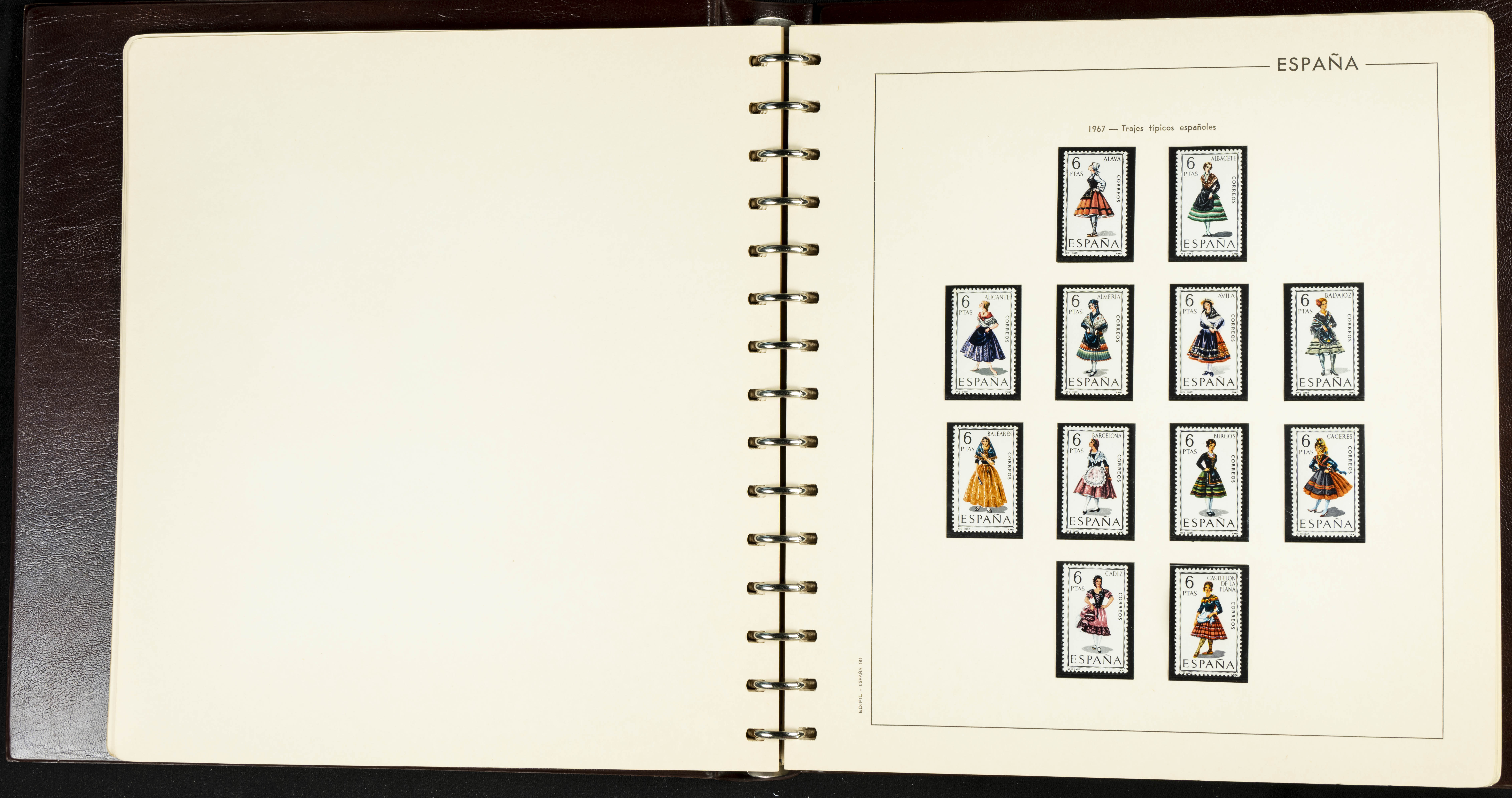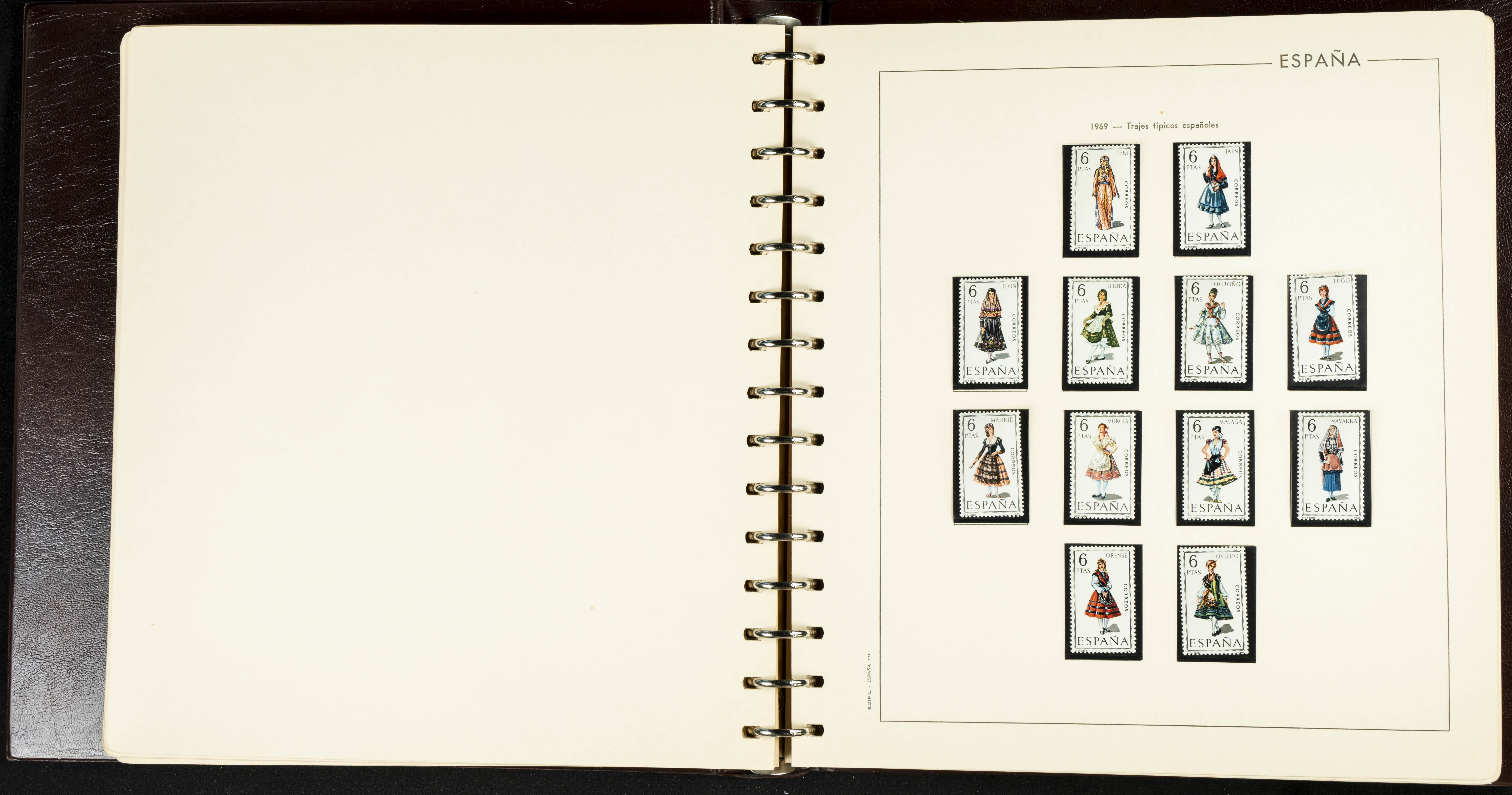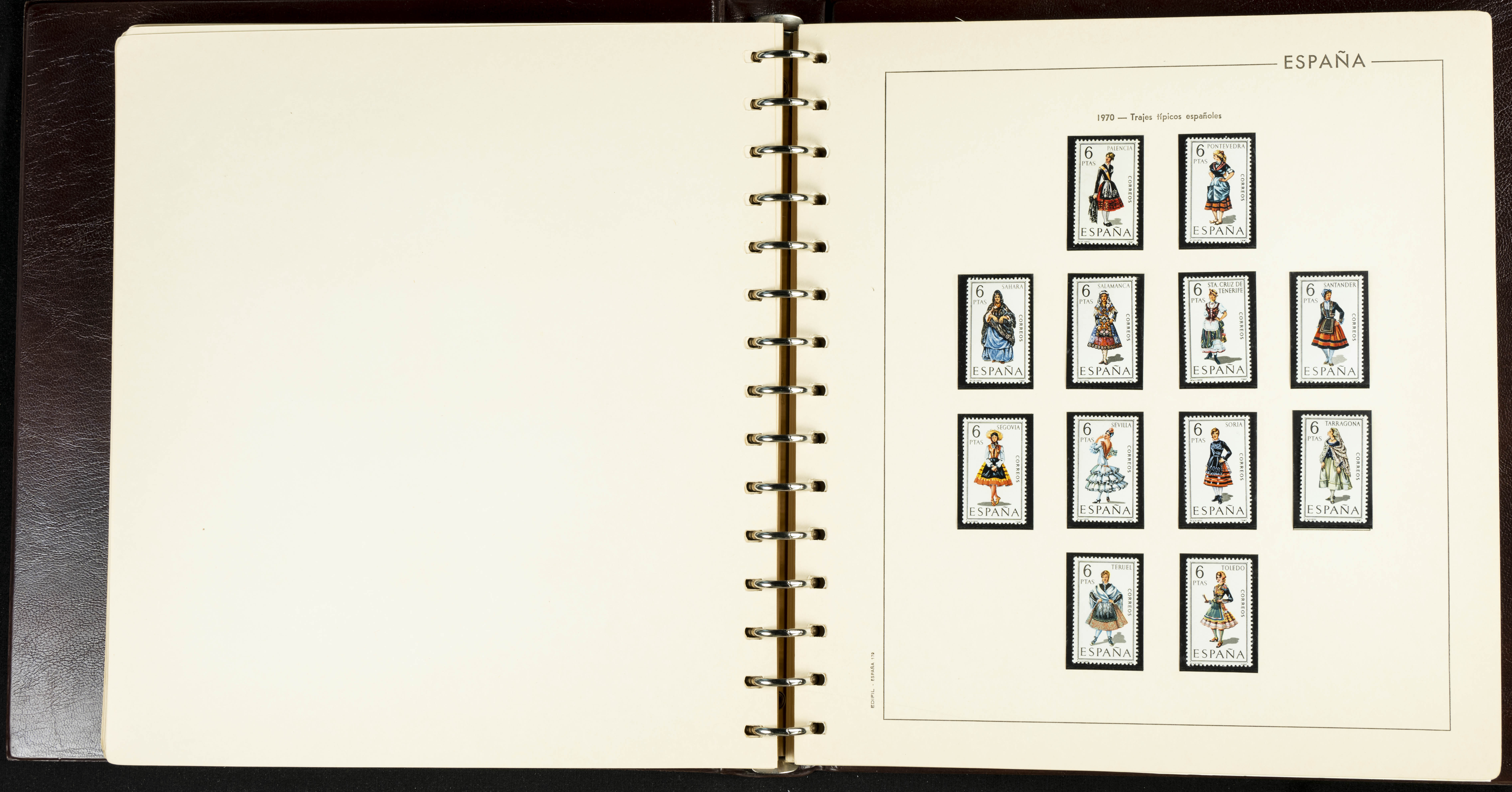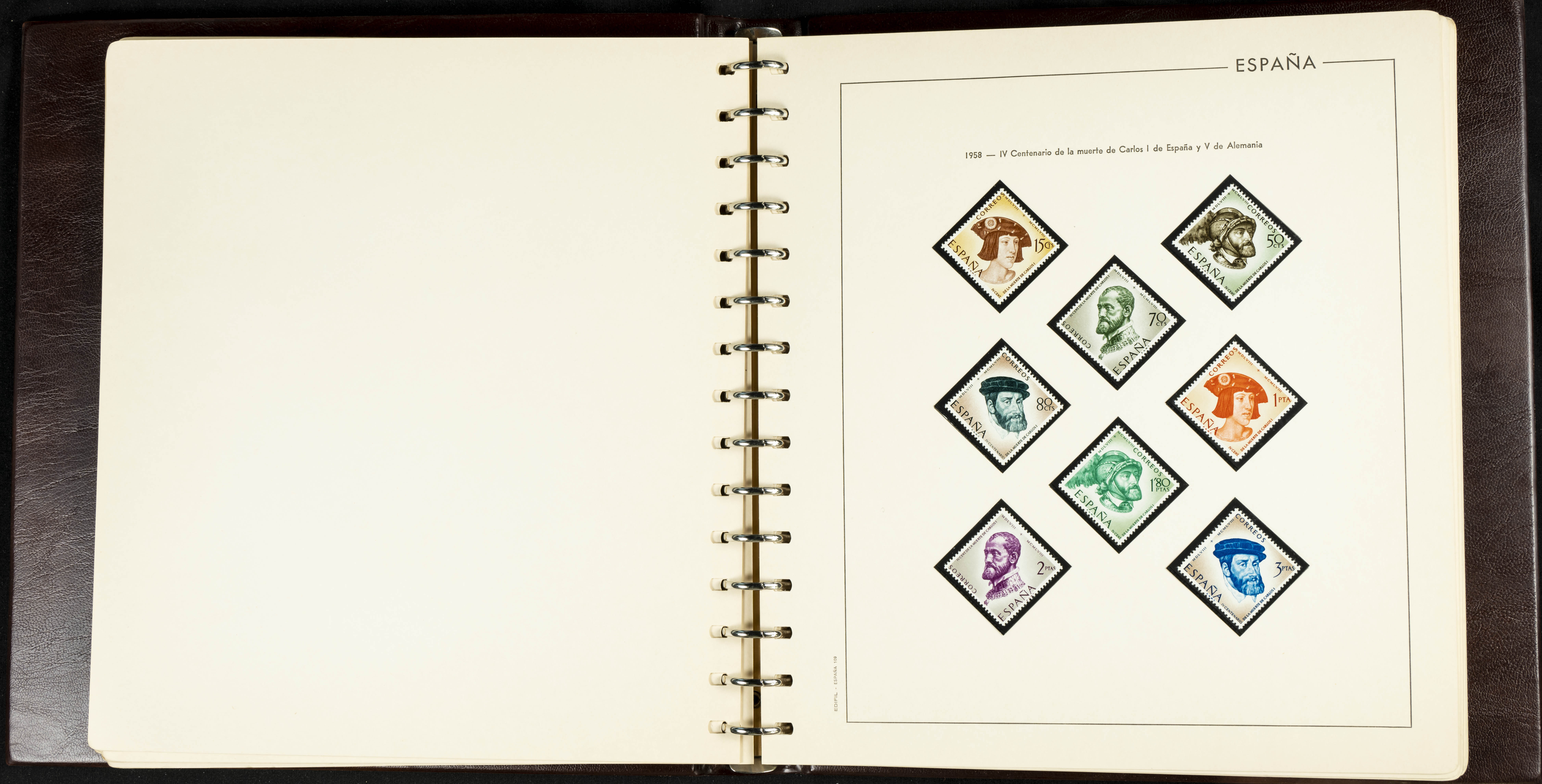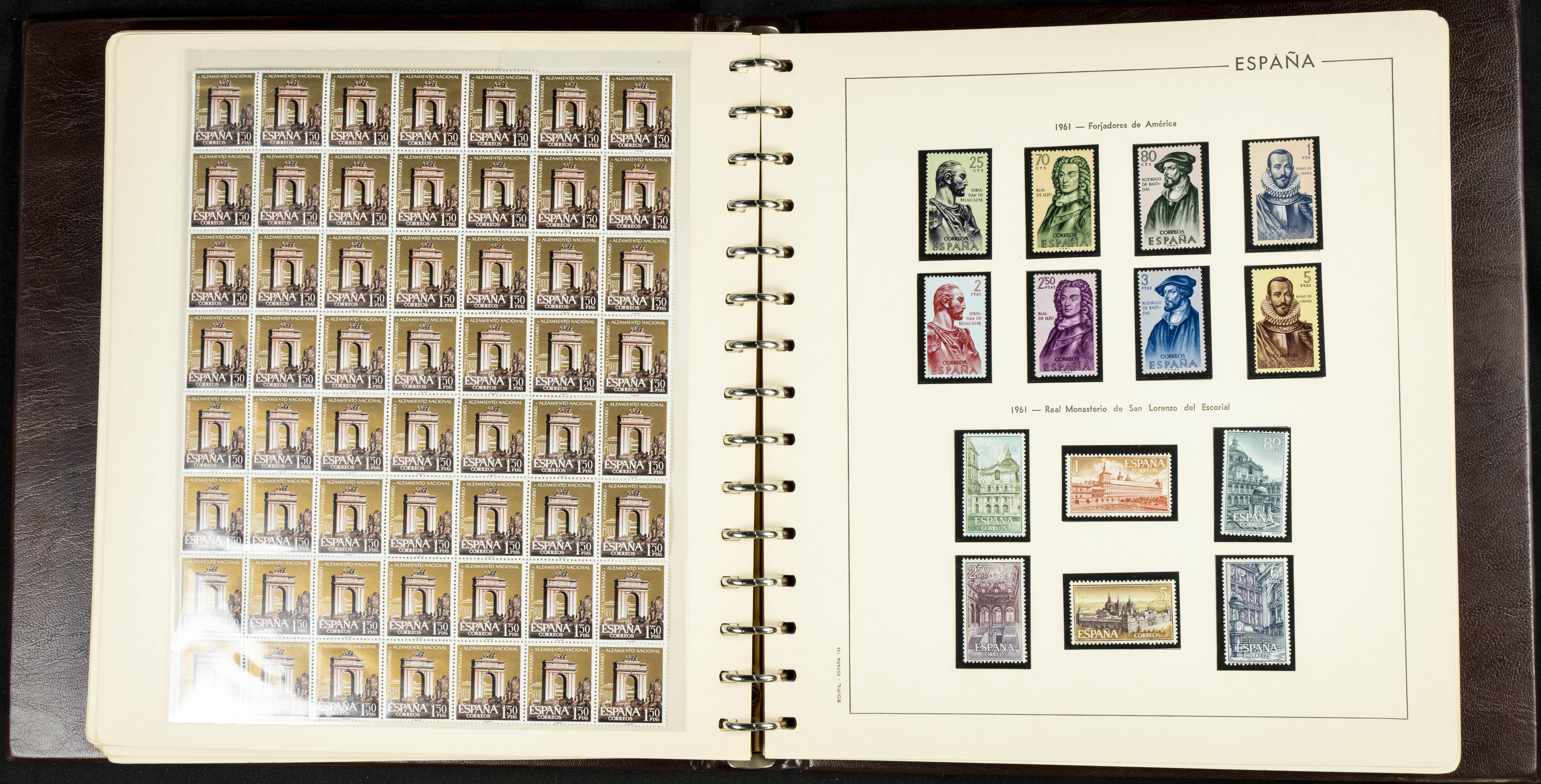★★(1950ca). Colección completa entre 1950 y 1975, en nuevo y sin fijasellos a falta de los Caudillos a Canarias con y sin número e incluyendo la 1ª y 2ª Tirada terrestres, Centenario, "Legazpi y Sorolla" (duplicado en usado) y juegos completos de Trajes y Escudos en bloques de cuatro. ALTO VALOR DE CATALOGO. A EXAMINAR.