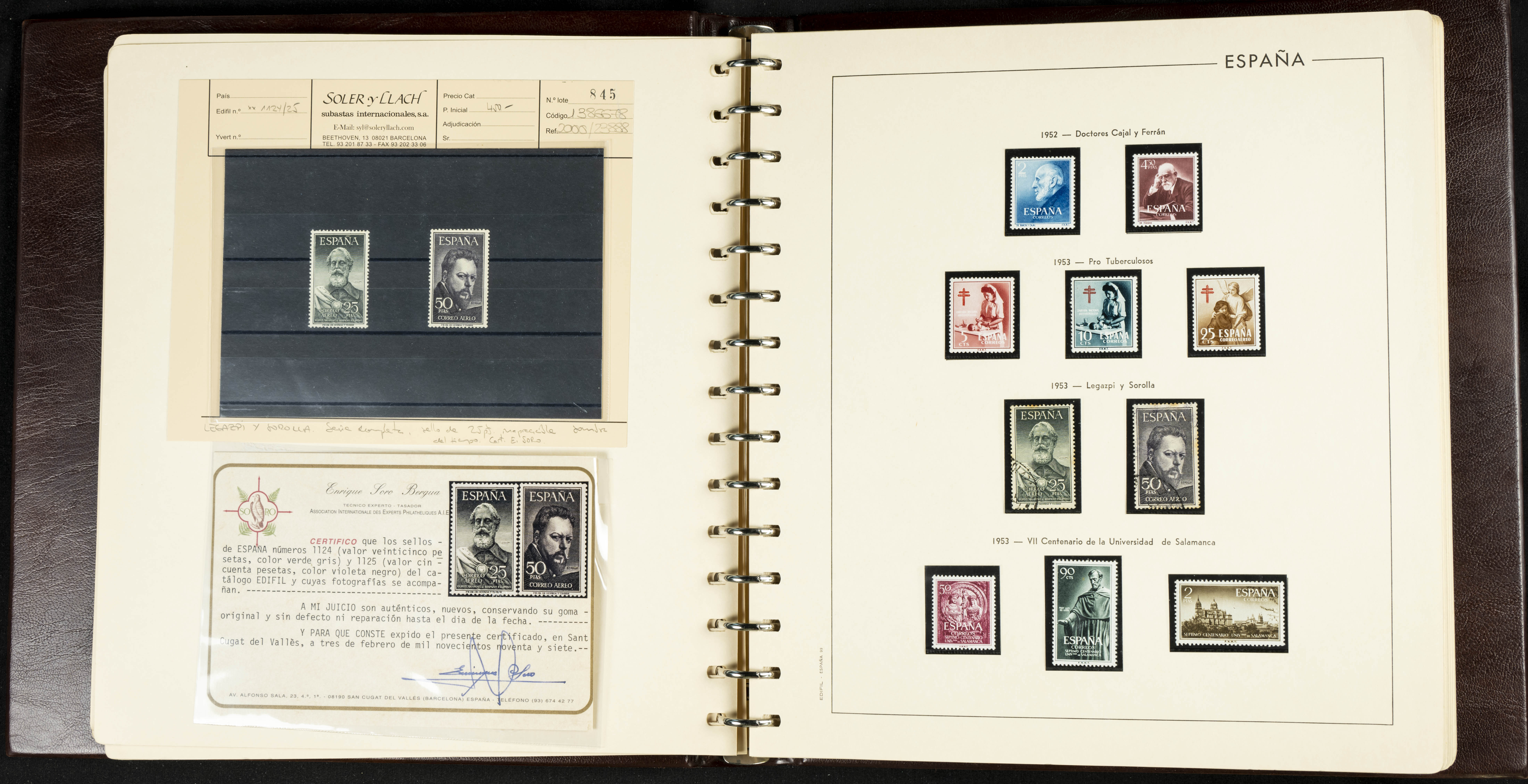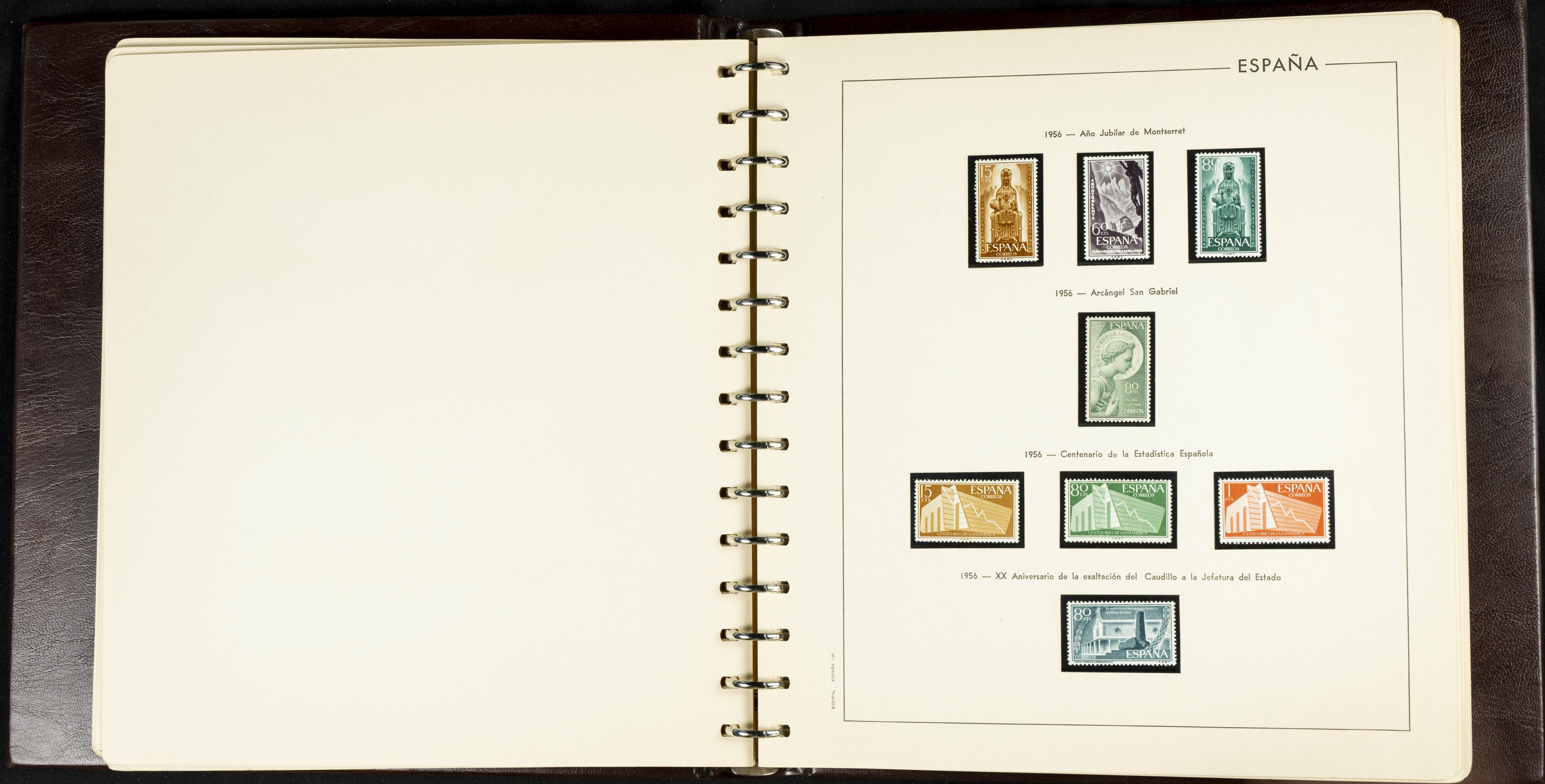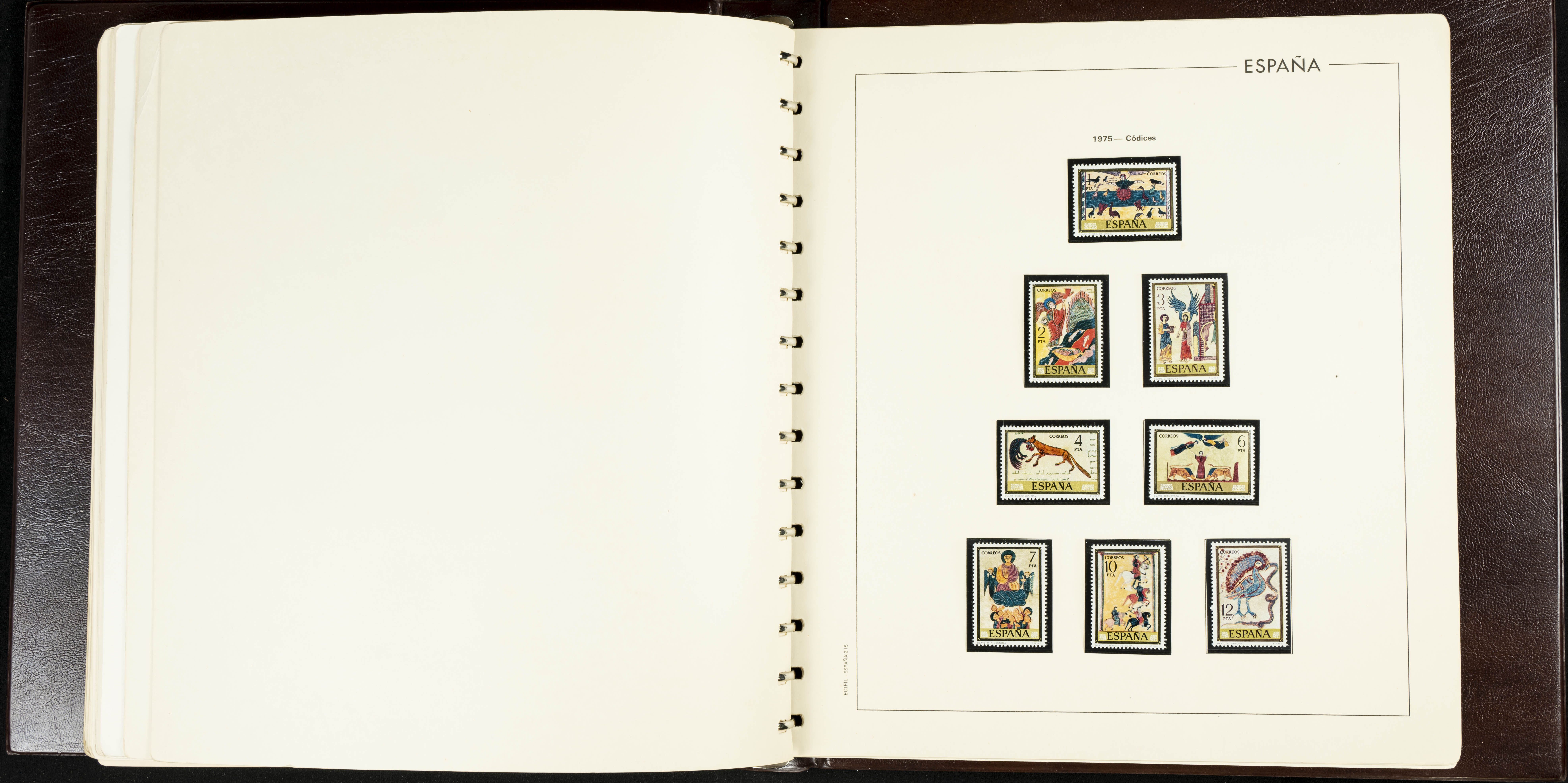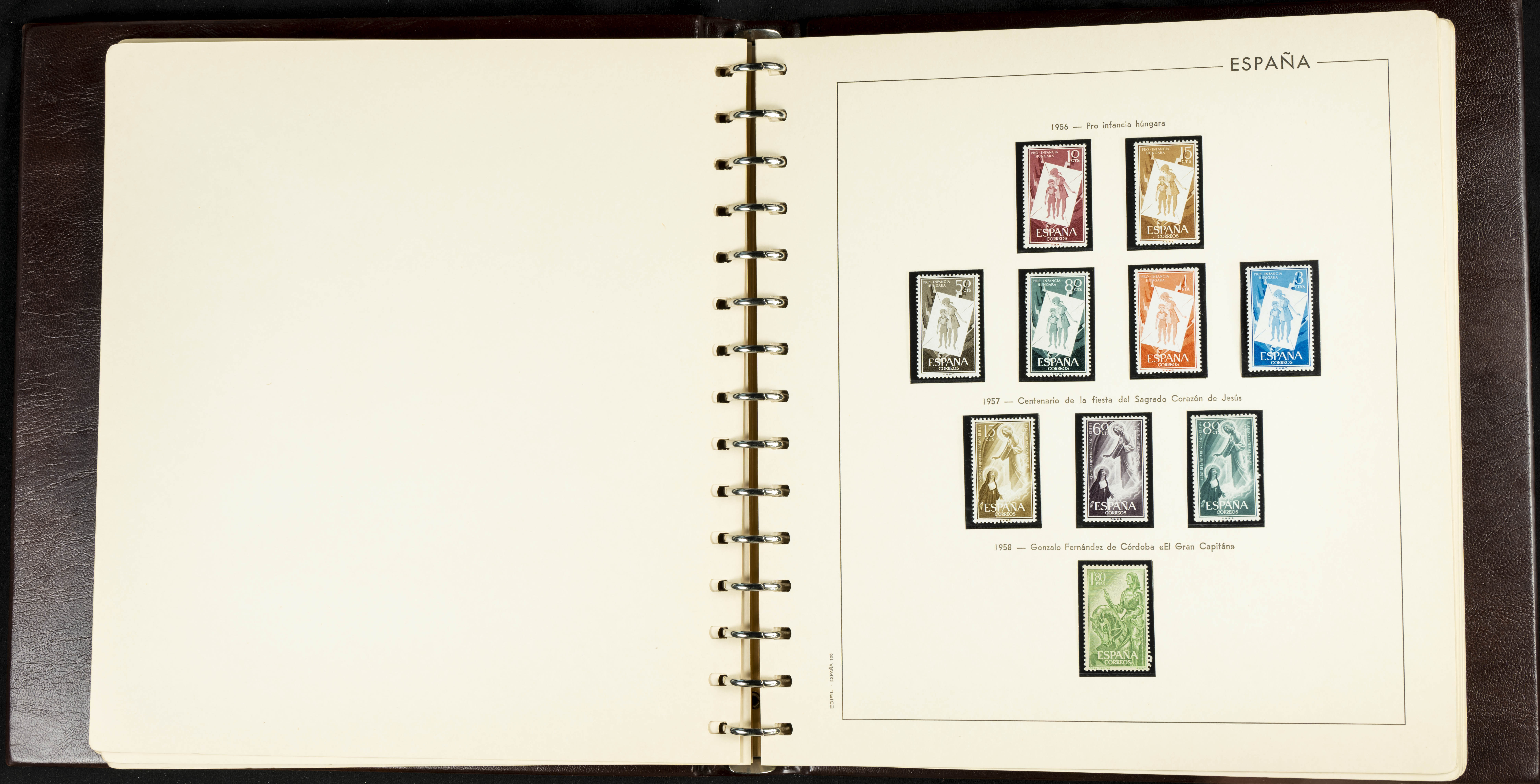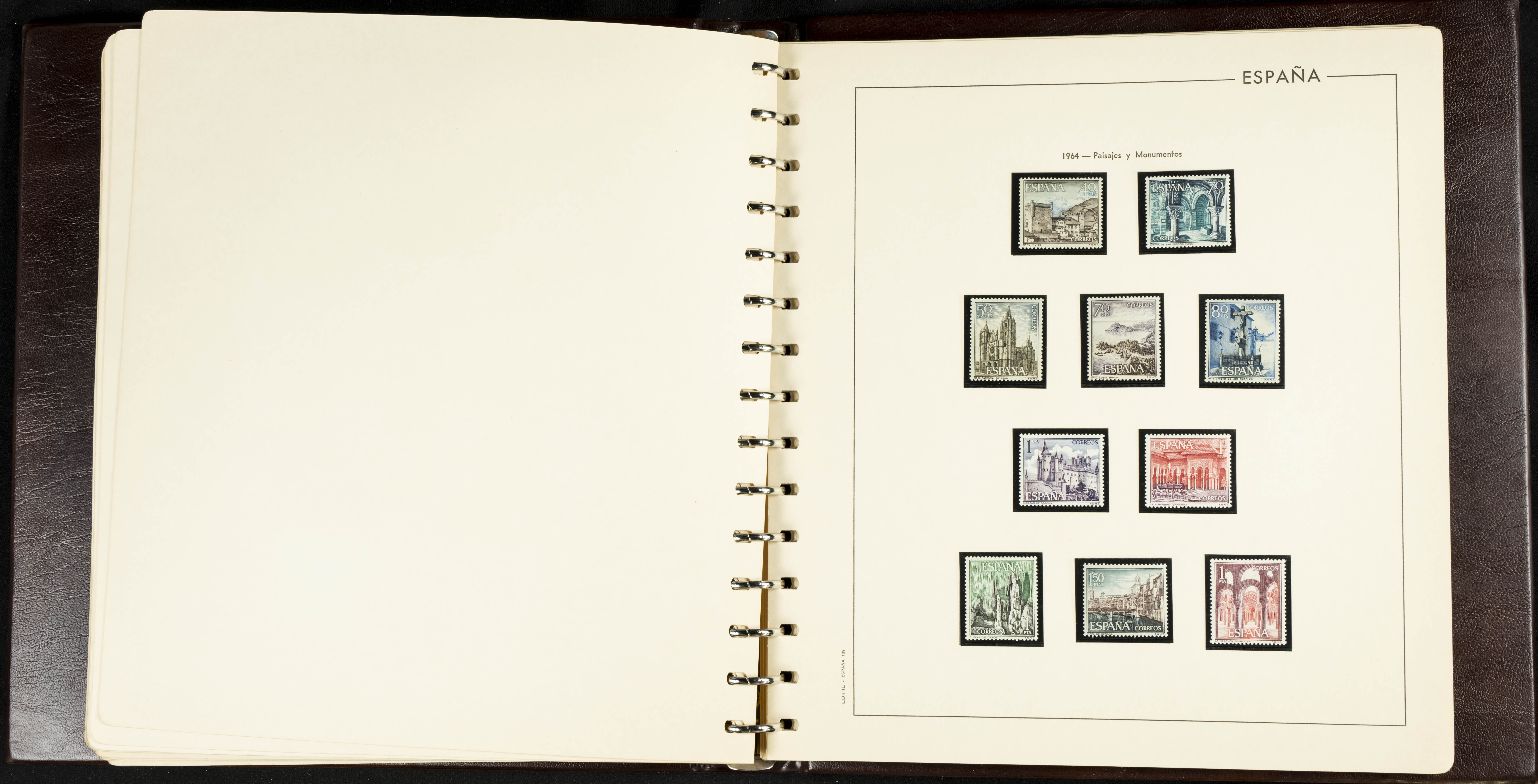 ★★(1950ca). Colección completa entre 1950 y 1975, en nuevo y sin fijasellos a falta de los Caudillos a Canarias con y sin número e incluyendo la 1ª y 2ª Tirada terrestres, Centenario, "Legazpi y Sorolla" (duplicado en usado) y juegos completos de Trajes y Escudos en bloques de cuatro. ALTO VALOR DE CATALOGO. A EXAMINAR.