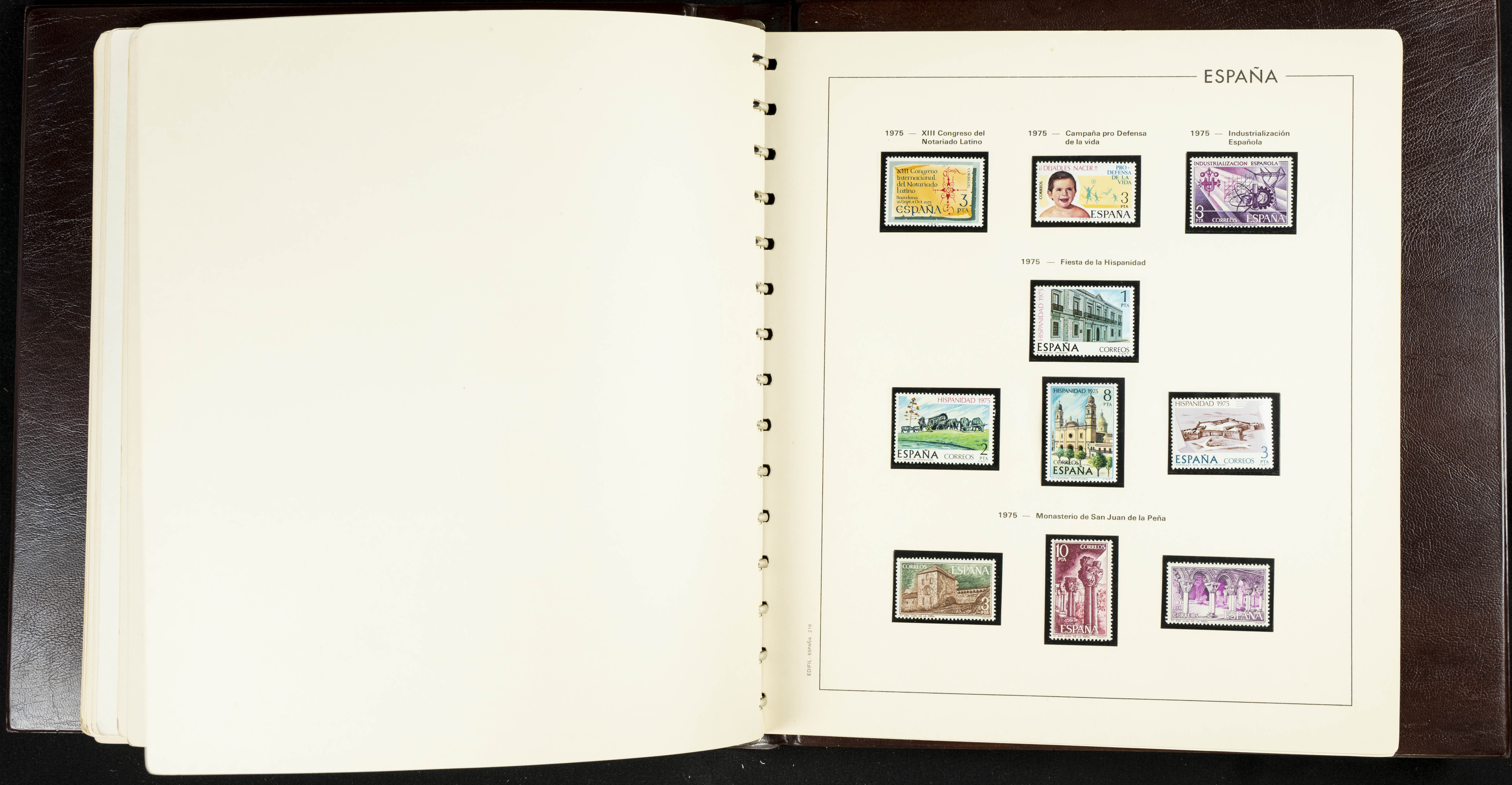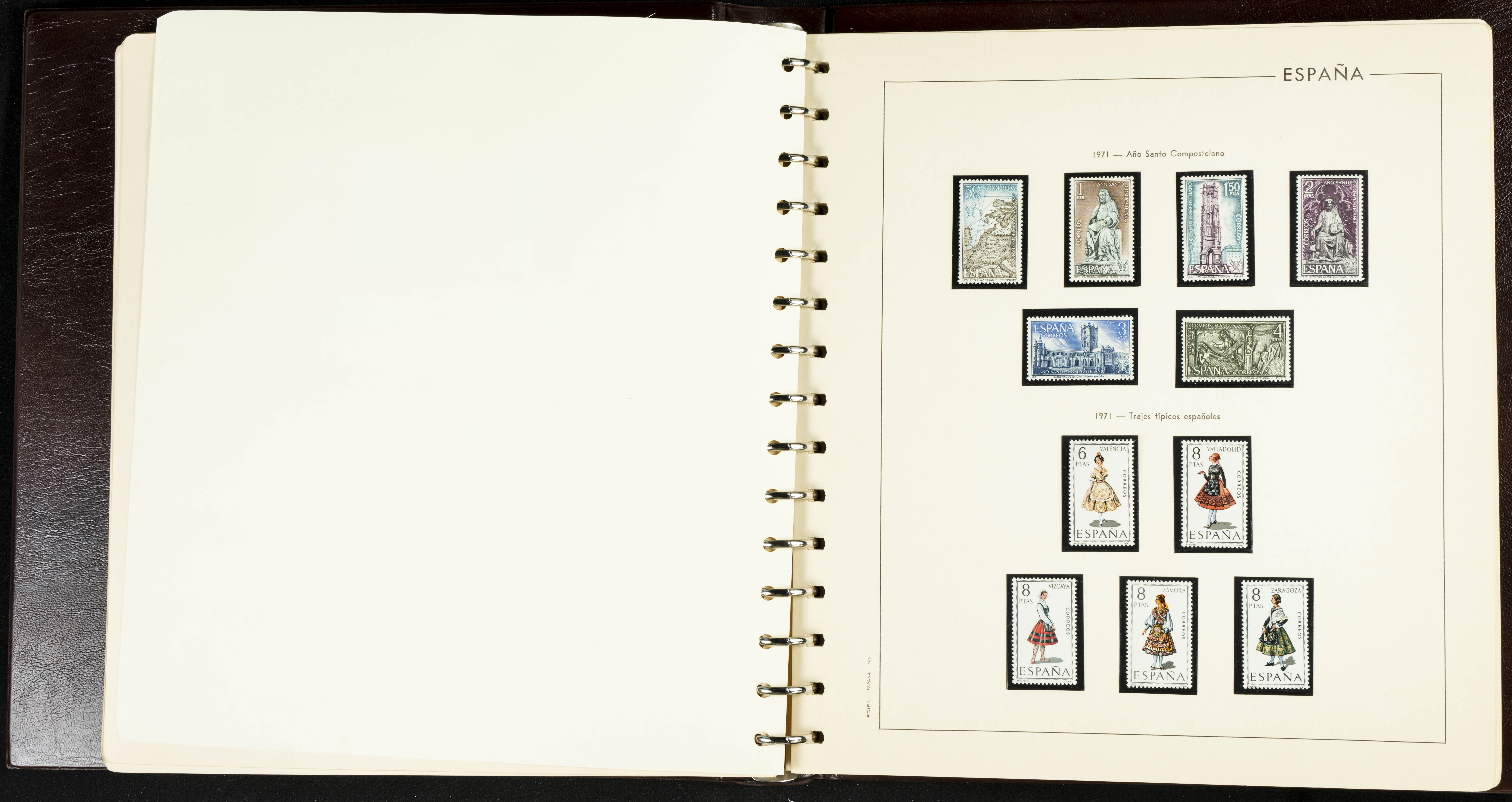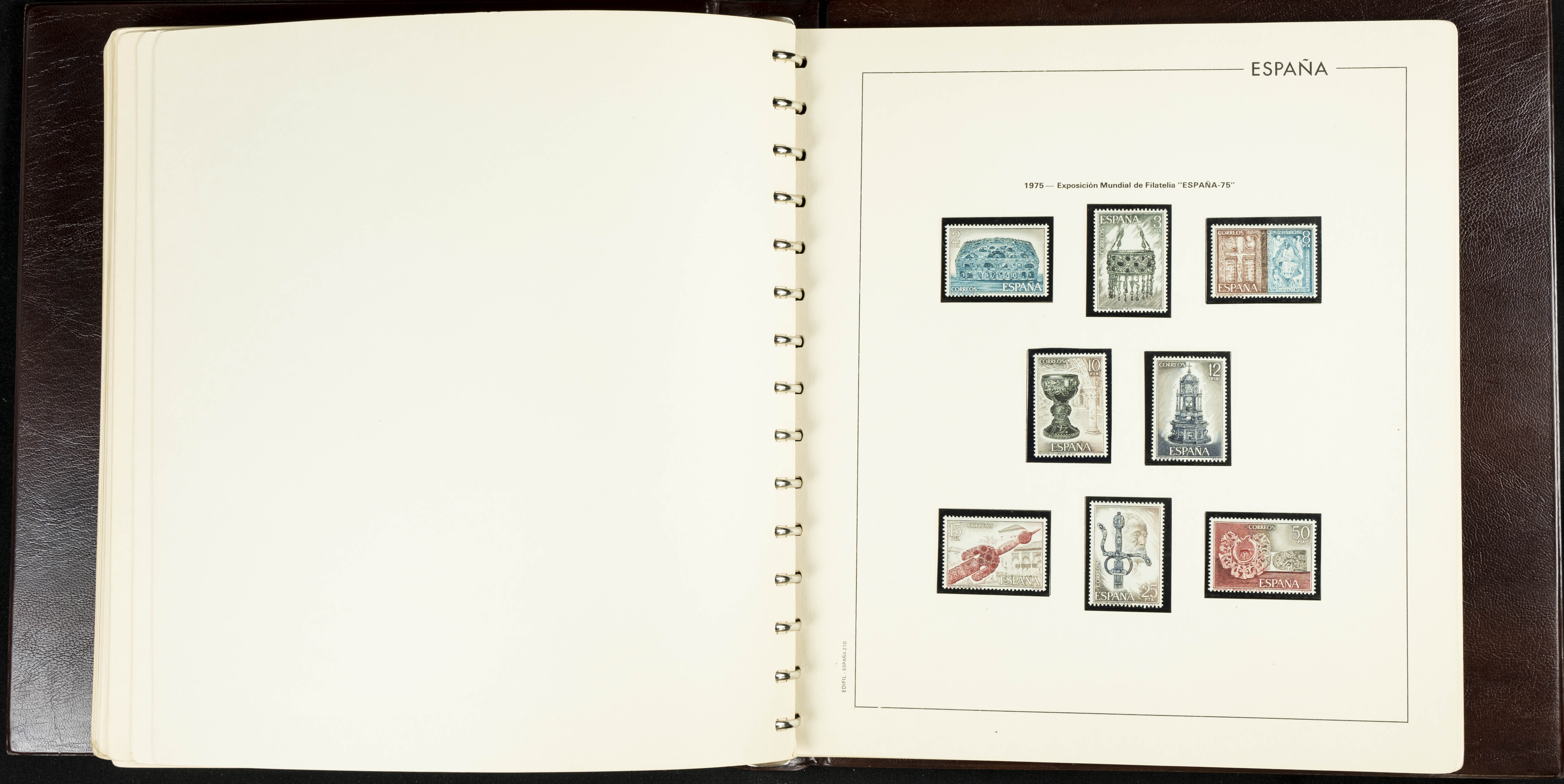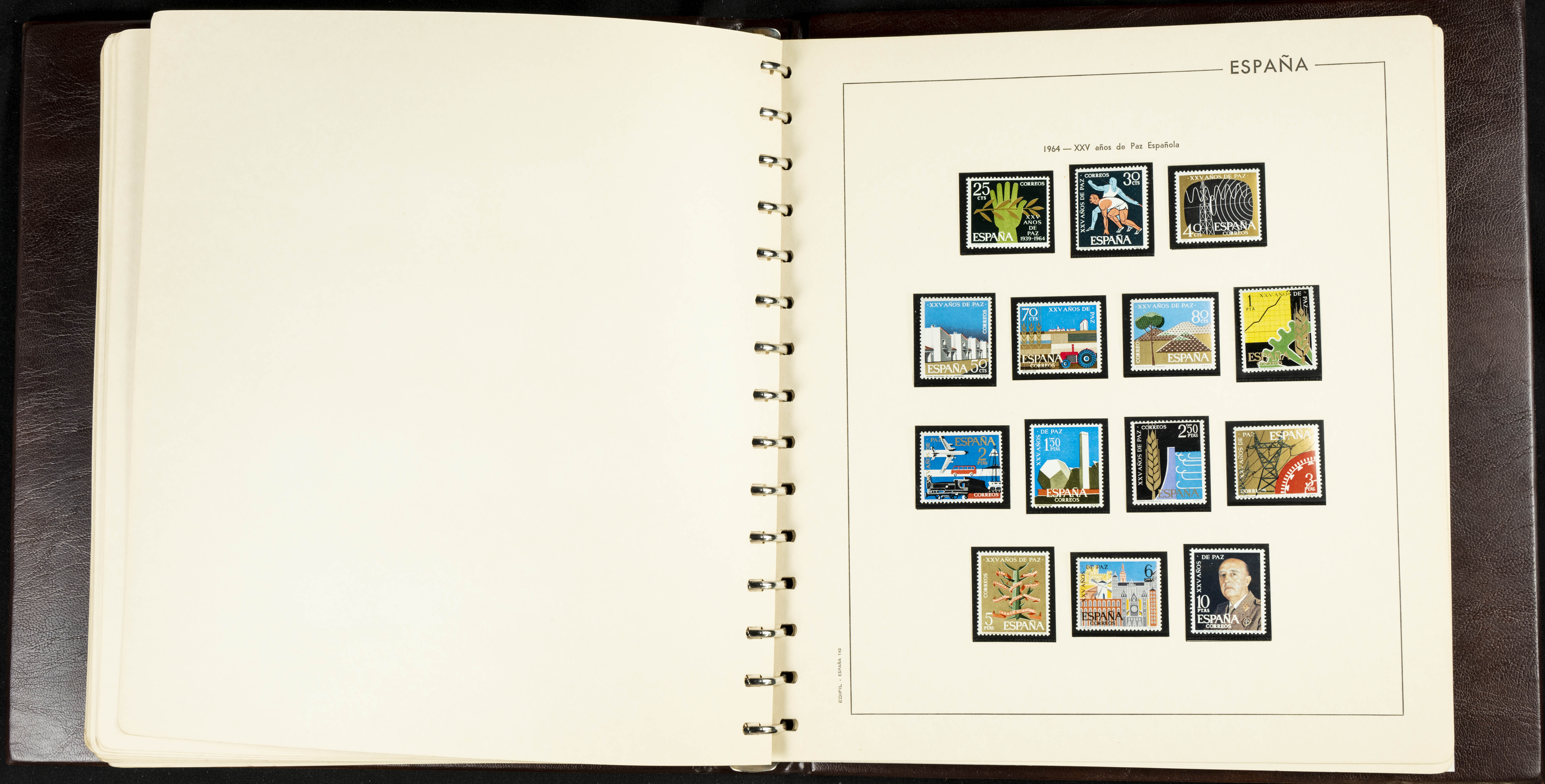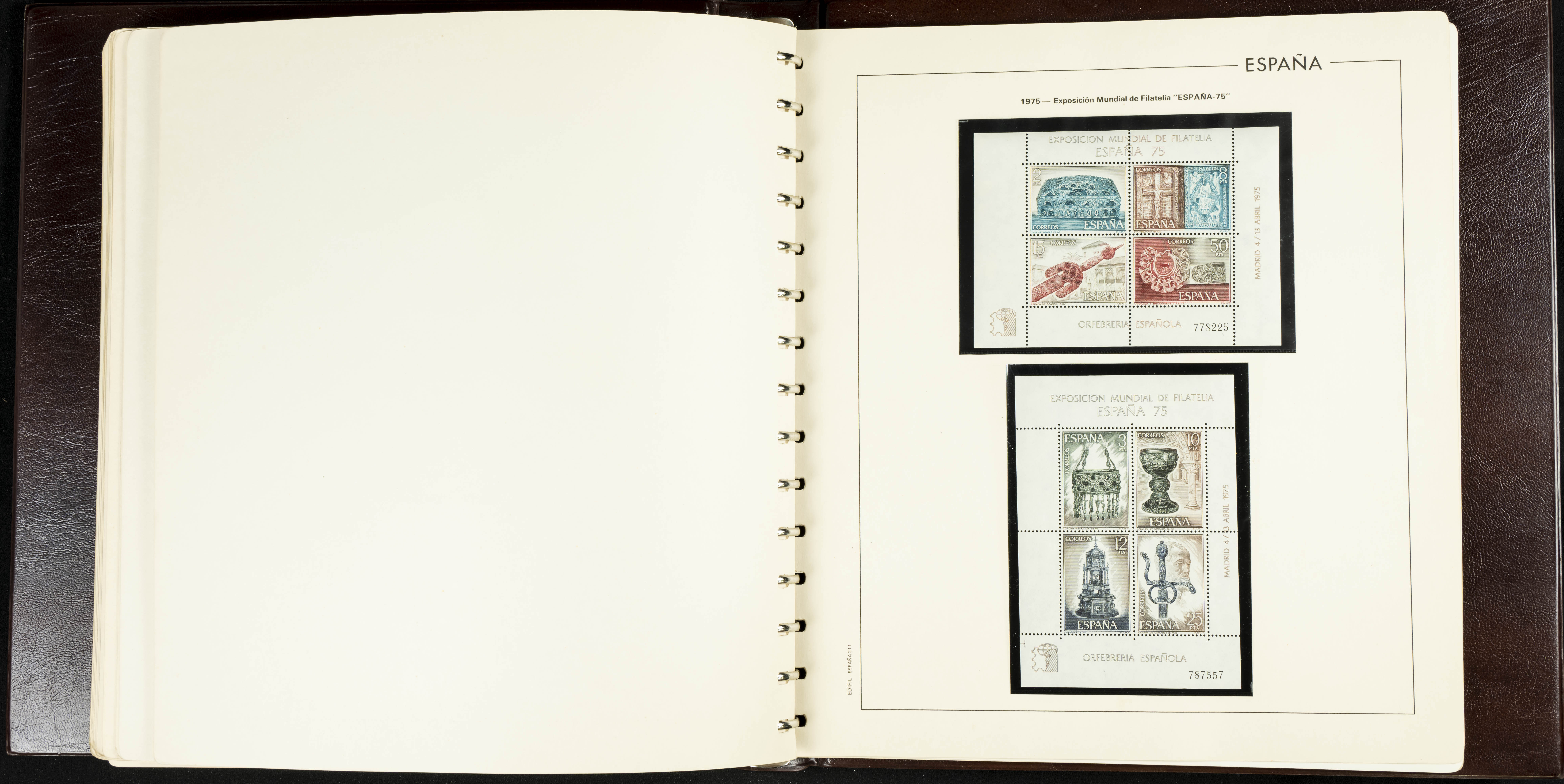 ★★(1950ca). Colección completa entre 1950 y 1975, en nuevo y sin fijasellos a falta de los Caudillos a Canarias con y sin número e incluyendo la 1ª y 2ª Tirada terrestres, Centenario, "Legazpi y Sorolla" (duplicado en usado) y juegos completos de Trajes y Escudos en bloques de cuatro. ALTO VALOR DE CATALOGO. A EXAMINAR.