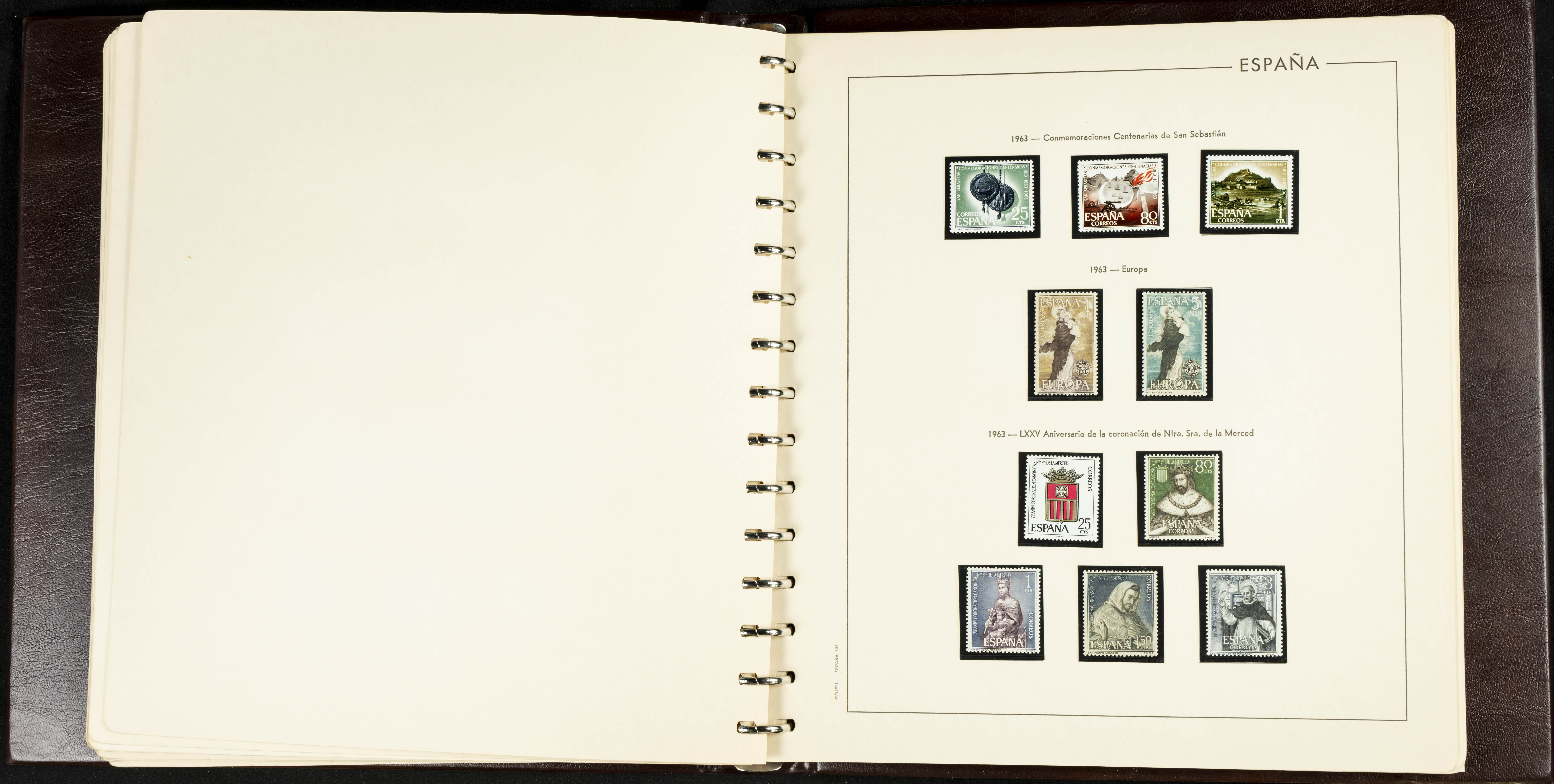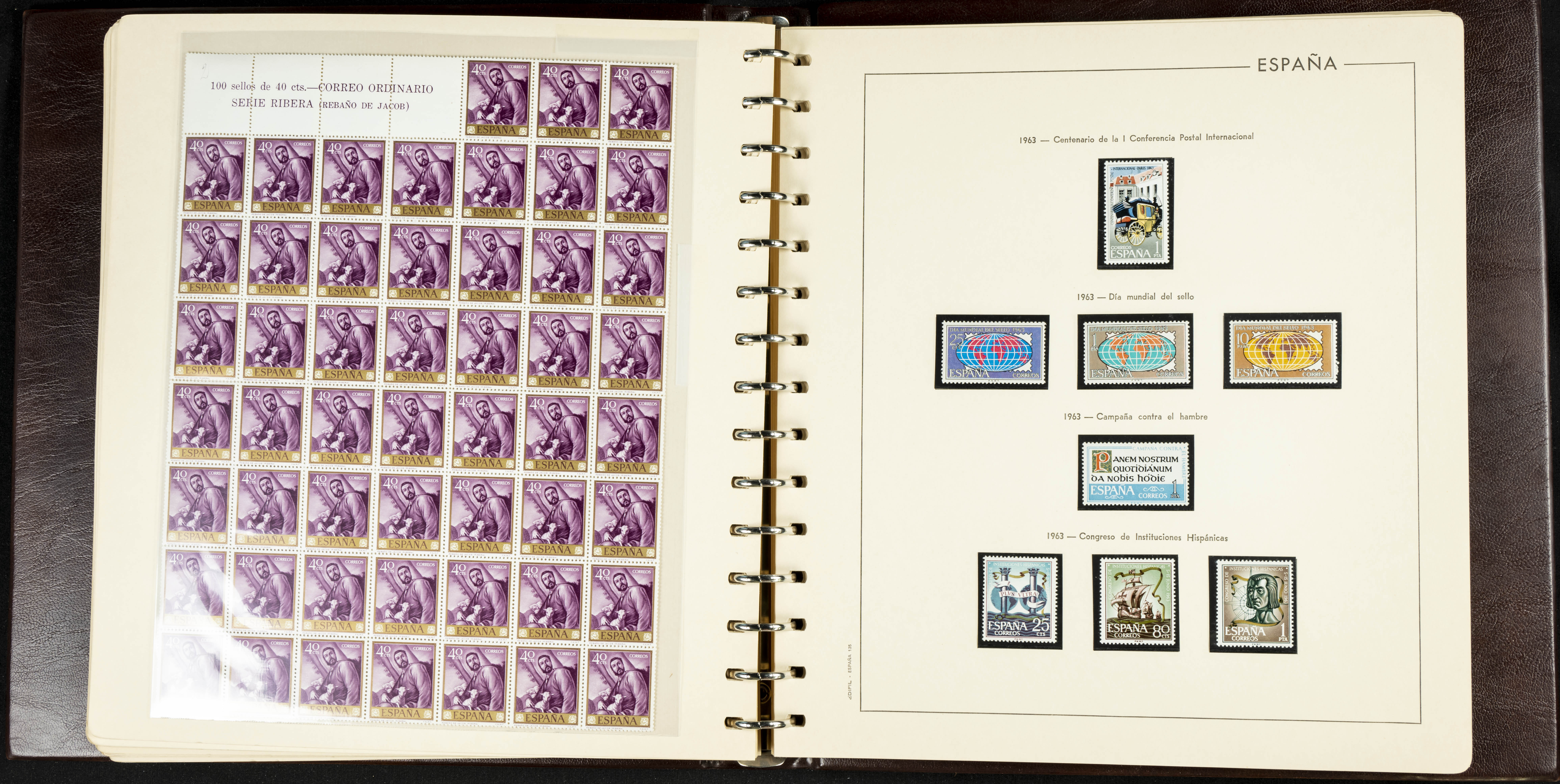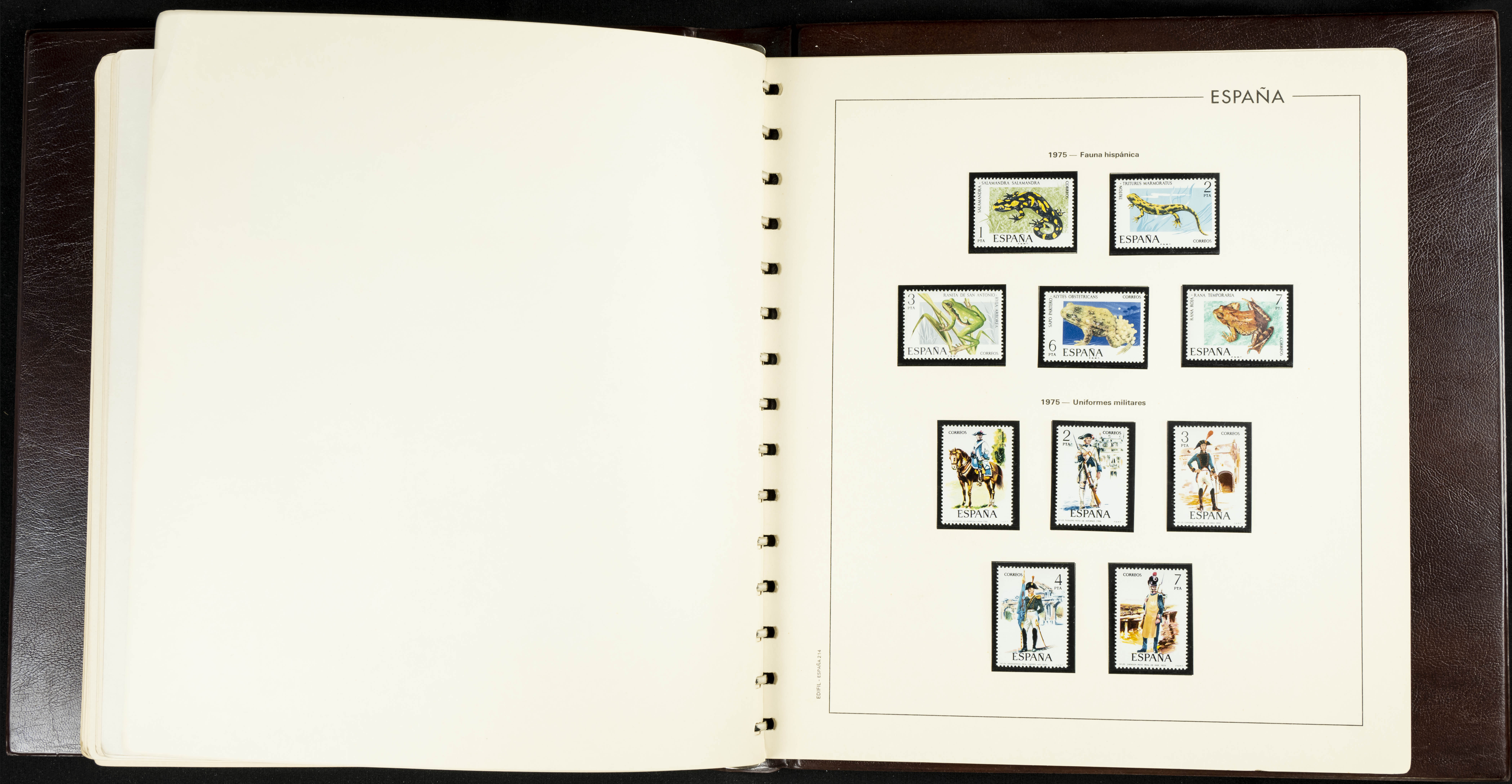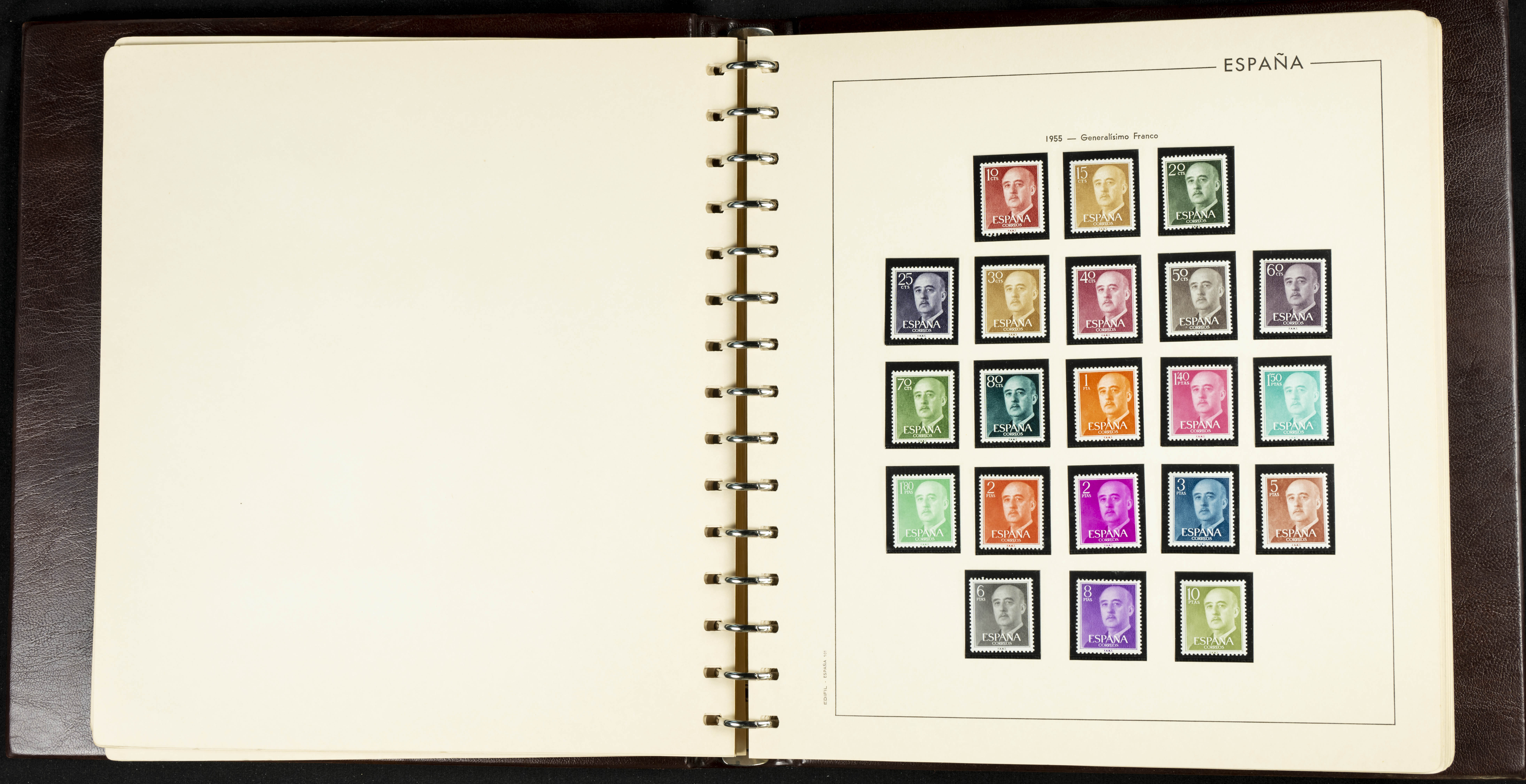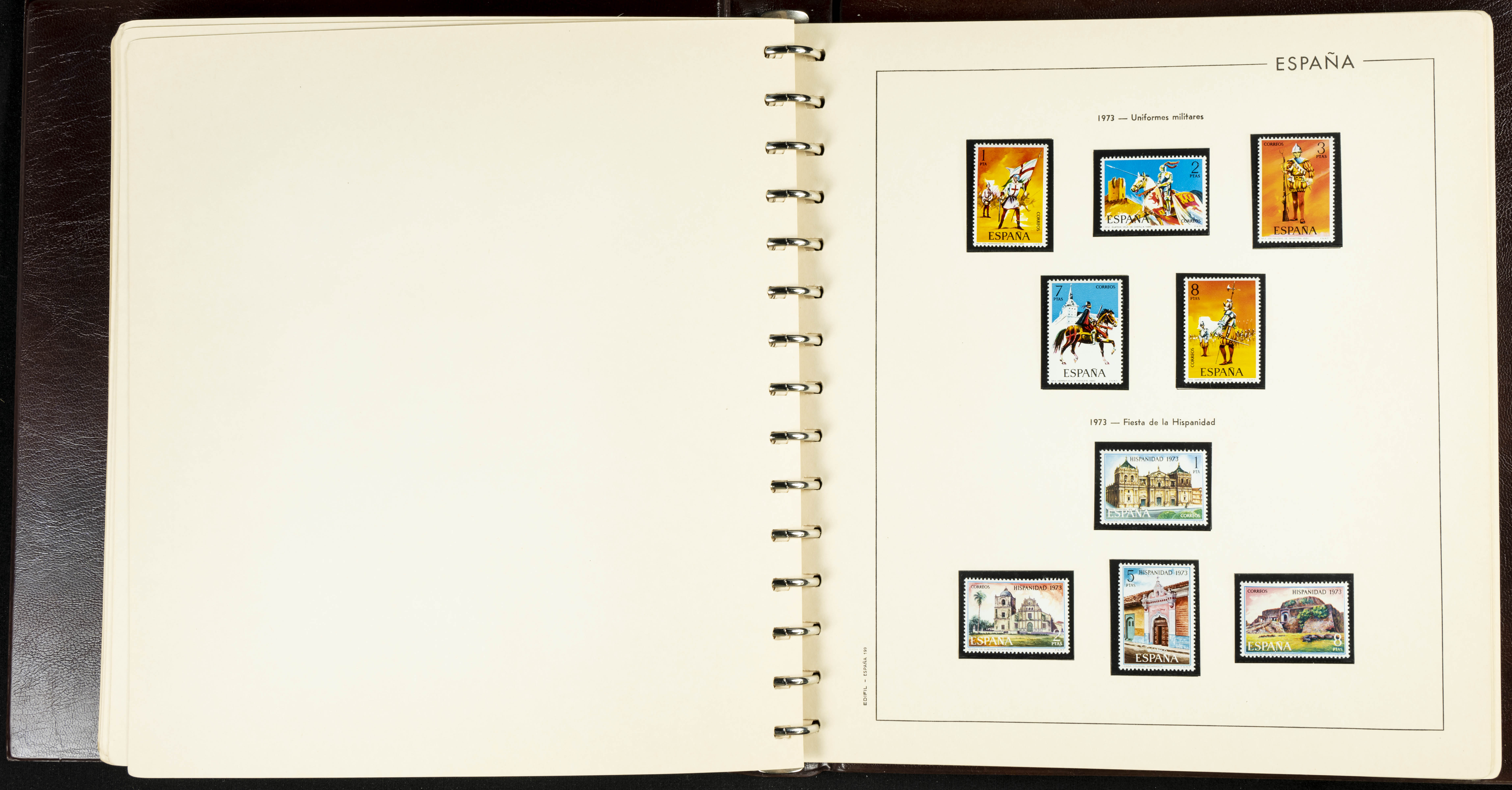 ★★(1950ca). Colección completa entre 1950 y 1975, en nuevo y sin fijasellos a falta de los Caudillos a Canarias con y sin número e incluyendo la 1ª y 2ª Tirada terrestres, Centenario, "Legazpi y Sorolla" (duplicado en usado) y juegos completos de Trajes y Escudos en bloques de cuatro. ALTO VALOR DE CATALOGO. A EXAMINAR.