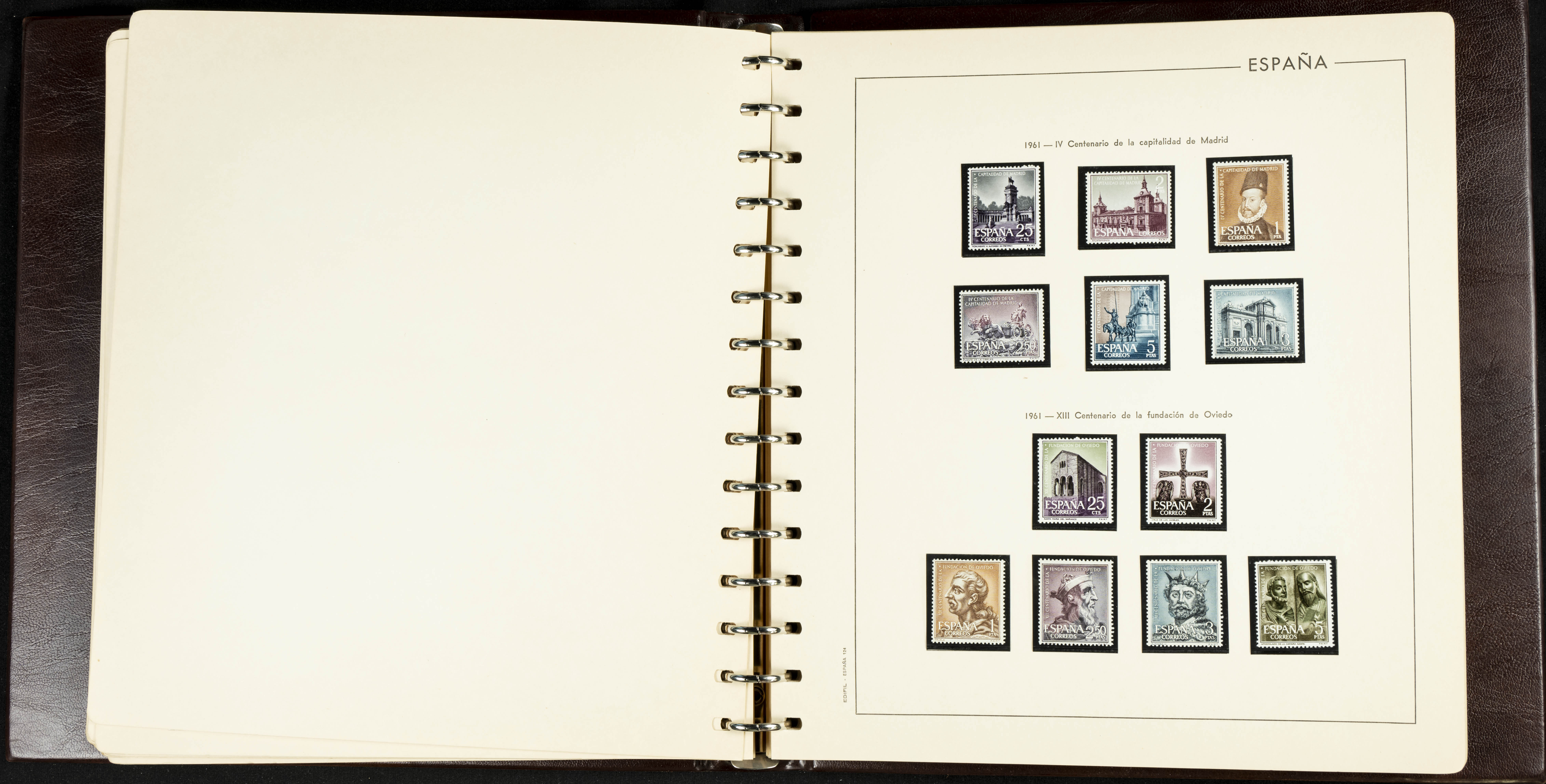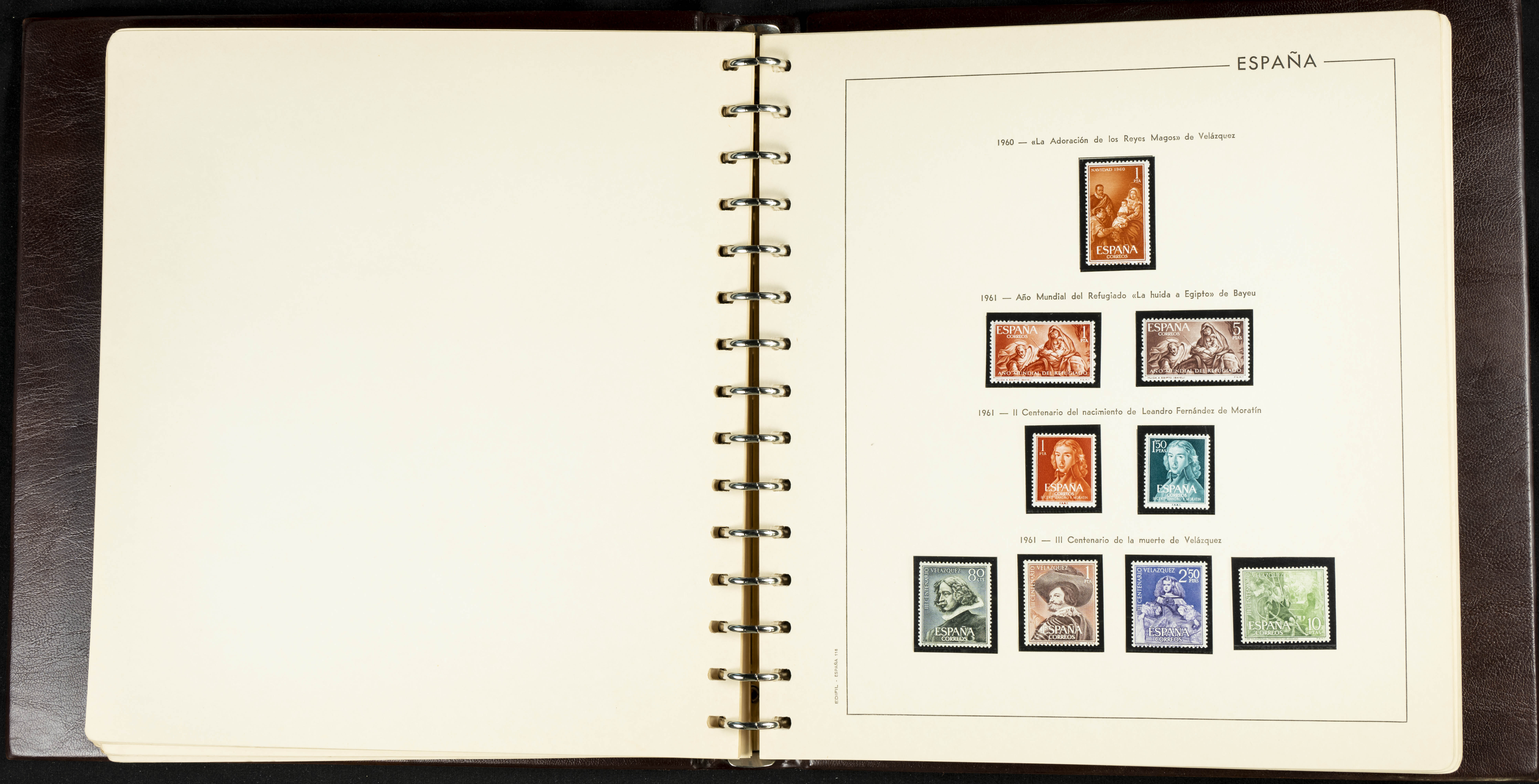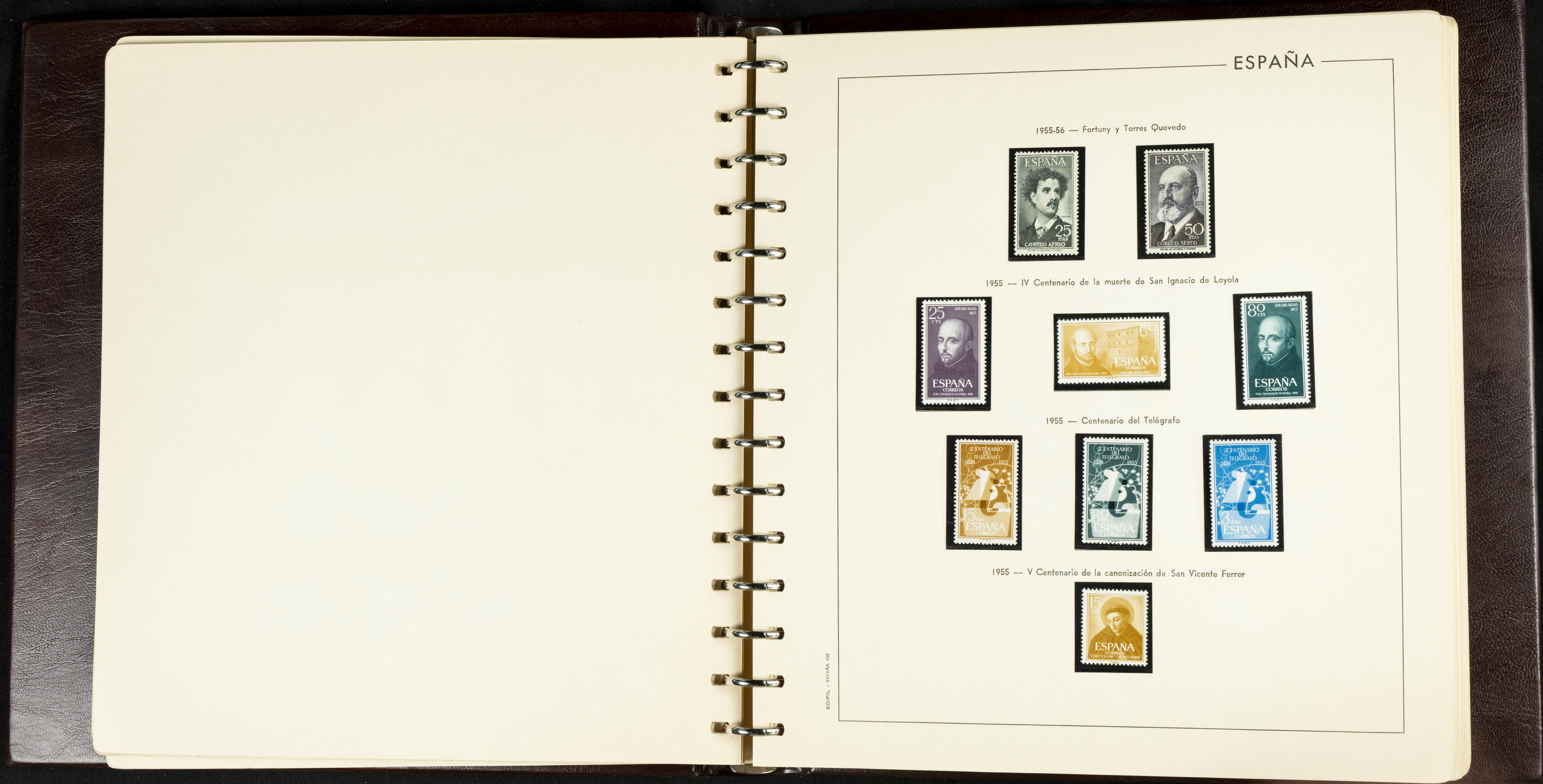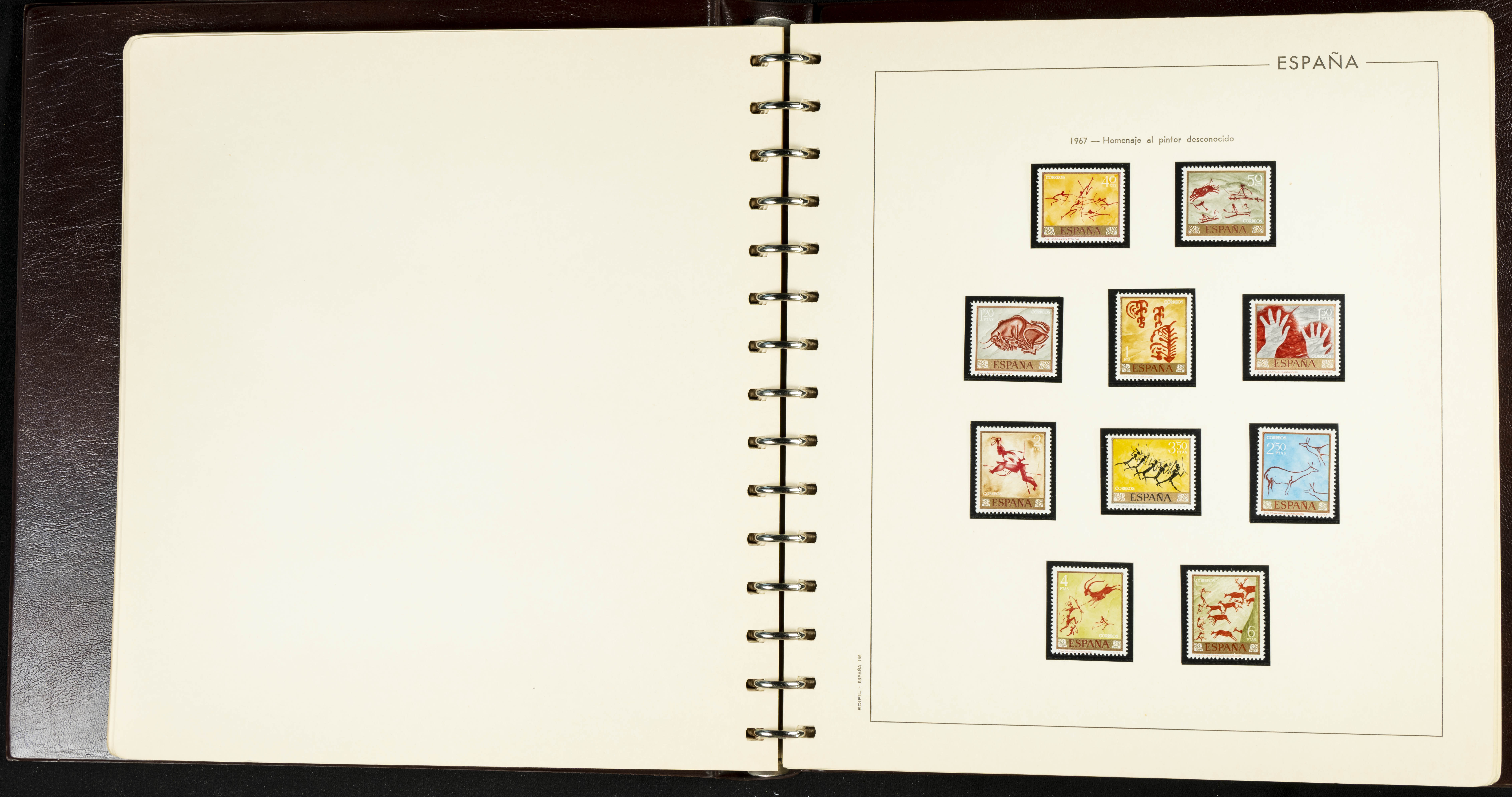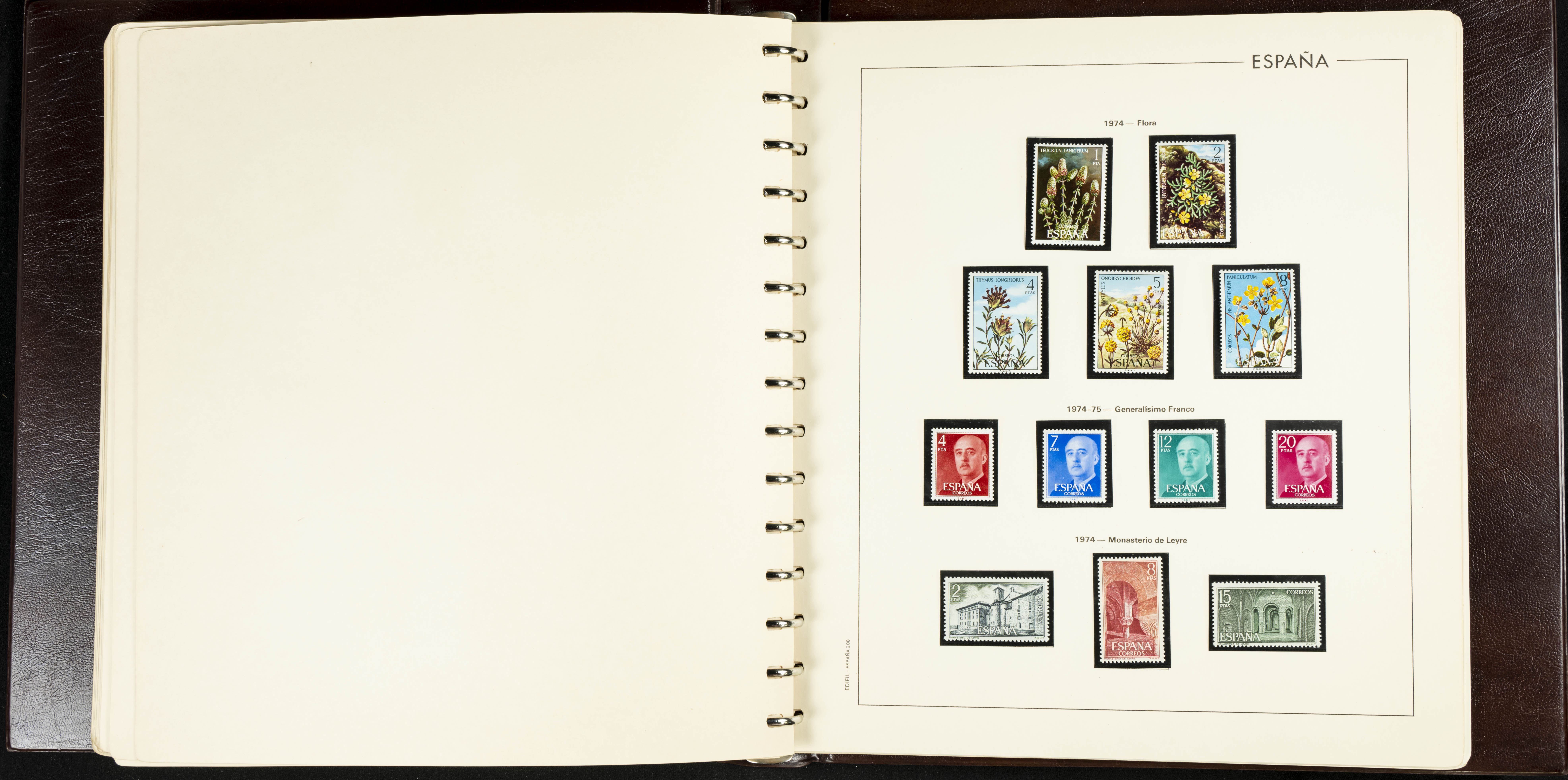 ★★(1950ca). Colección completa entre 1950 y 1975, en nuevo y sin fijasellos a falta de los Caudillos a Canarias con y sin número e incluyendo la 1ª y 2ª Tirada terrestres, Centenario, "Legazpi y Sorolla" (duplicado en usado) y juegos completos de Trajes y Escudos en bloques de cuatro. ALTO VALOR DE CATALOGO. A EXAMINAR.